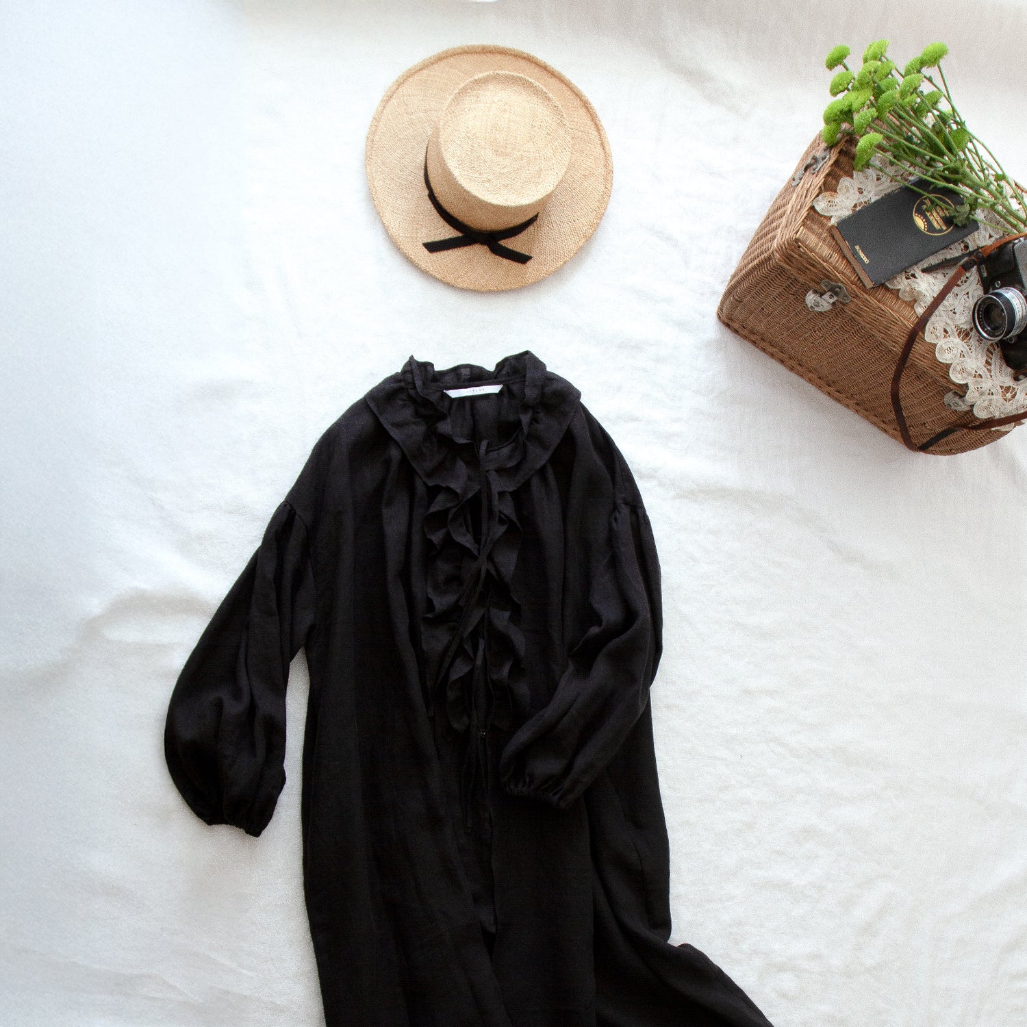 フリルカラーリネンワンピース/ブラック