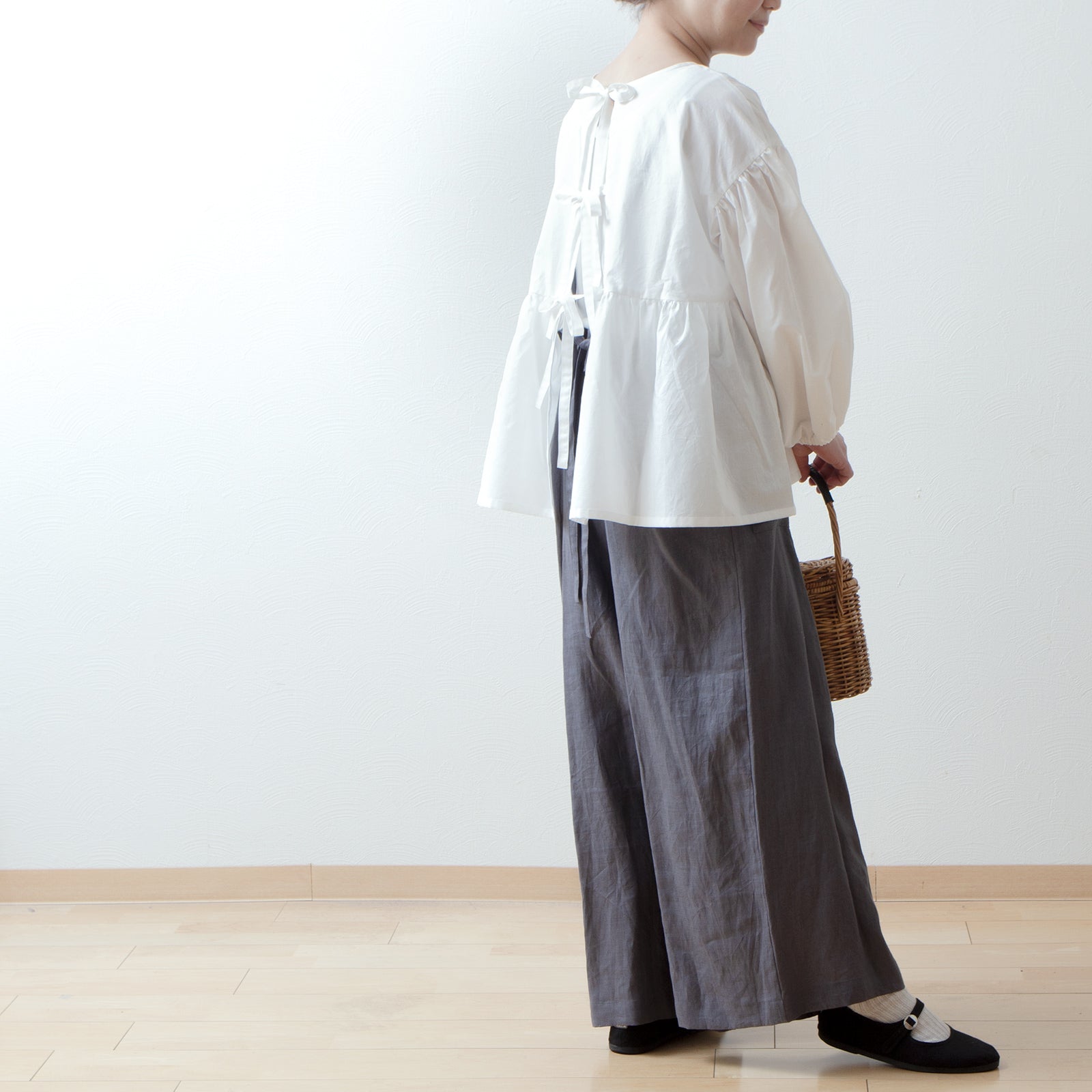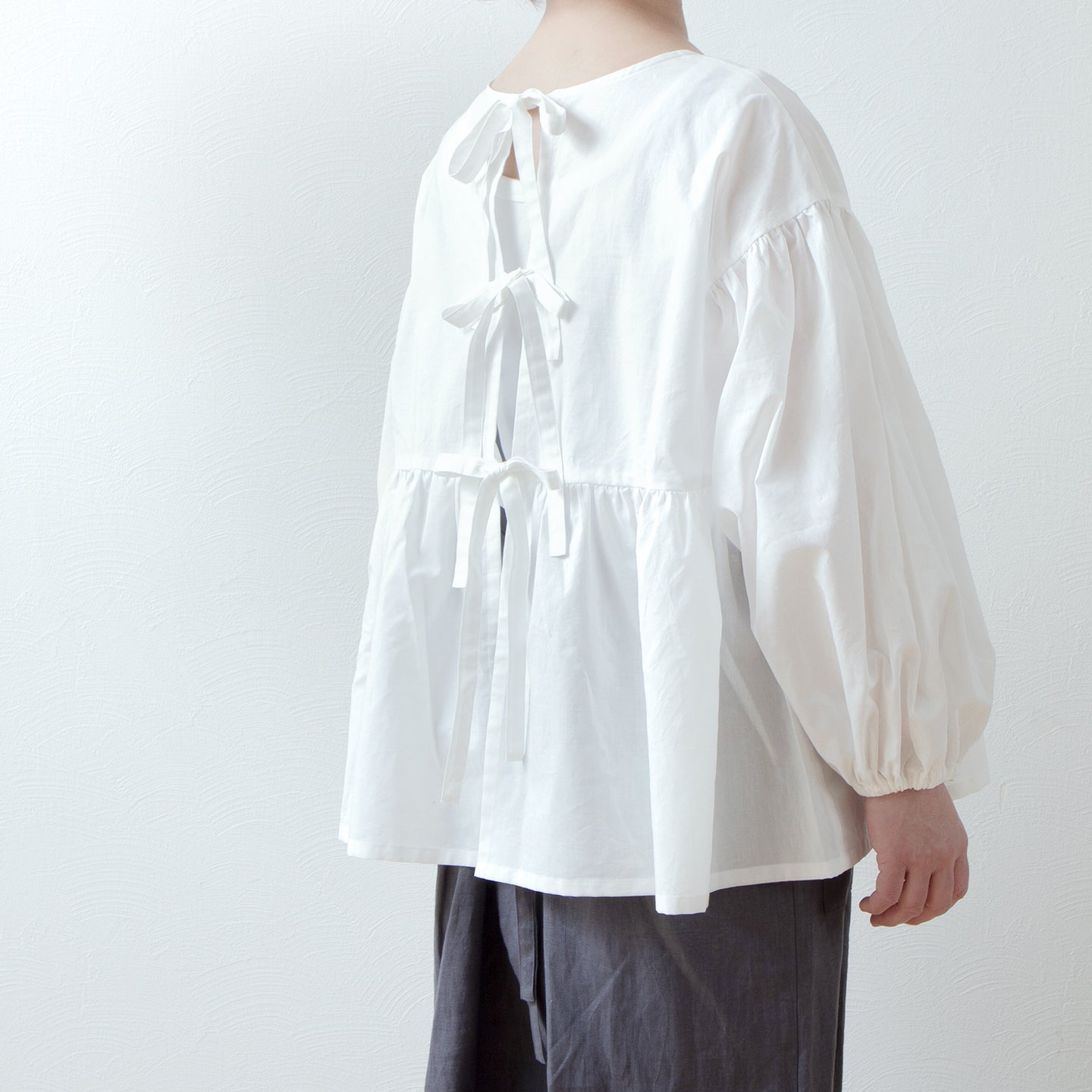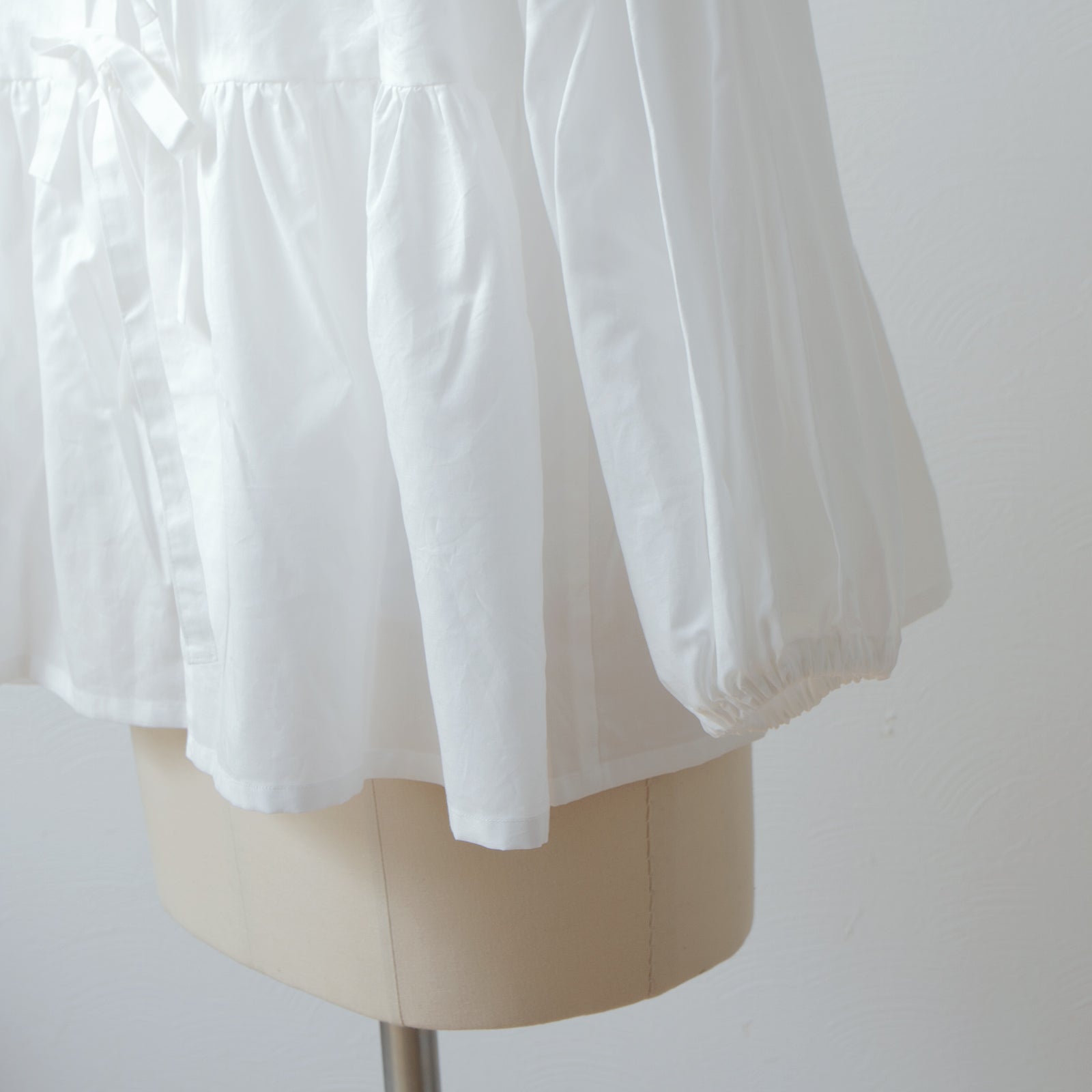 袖付けにも施したギャザーと、袖口とのダブルギャザーがボリュームのある袖に◎ 袖口はのラフなゴム仕様は、たくし上げることで6分袖にアレンジもできます。
