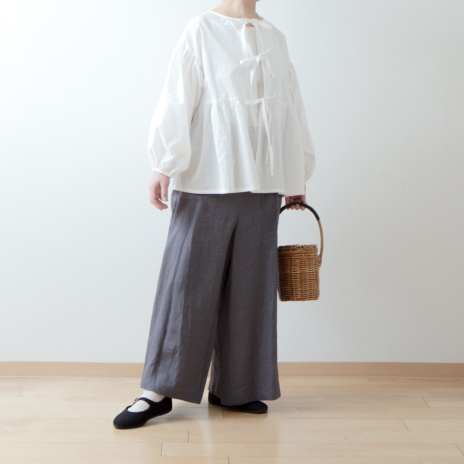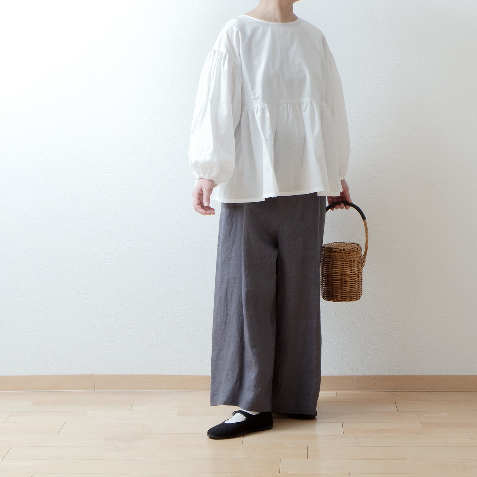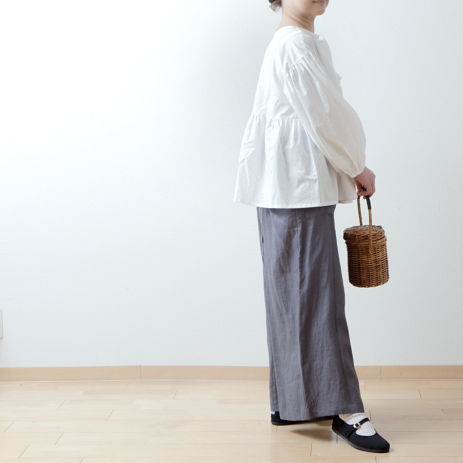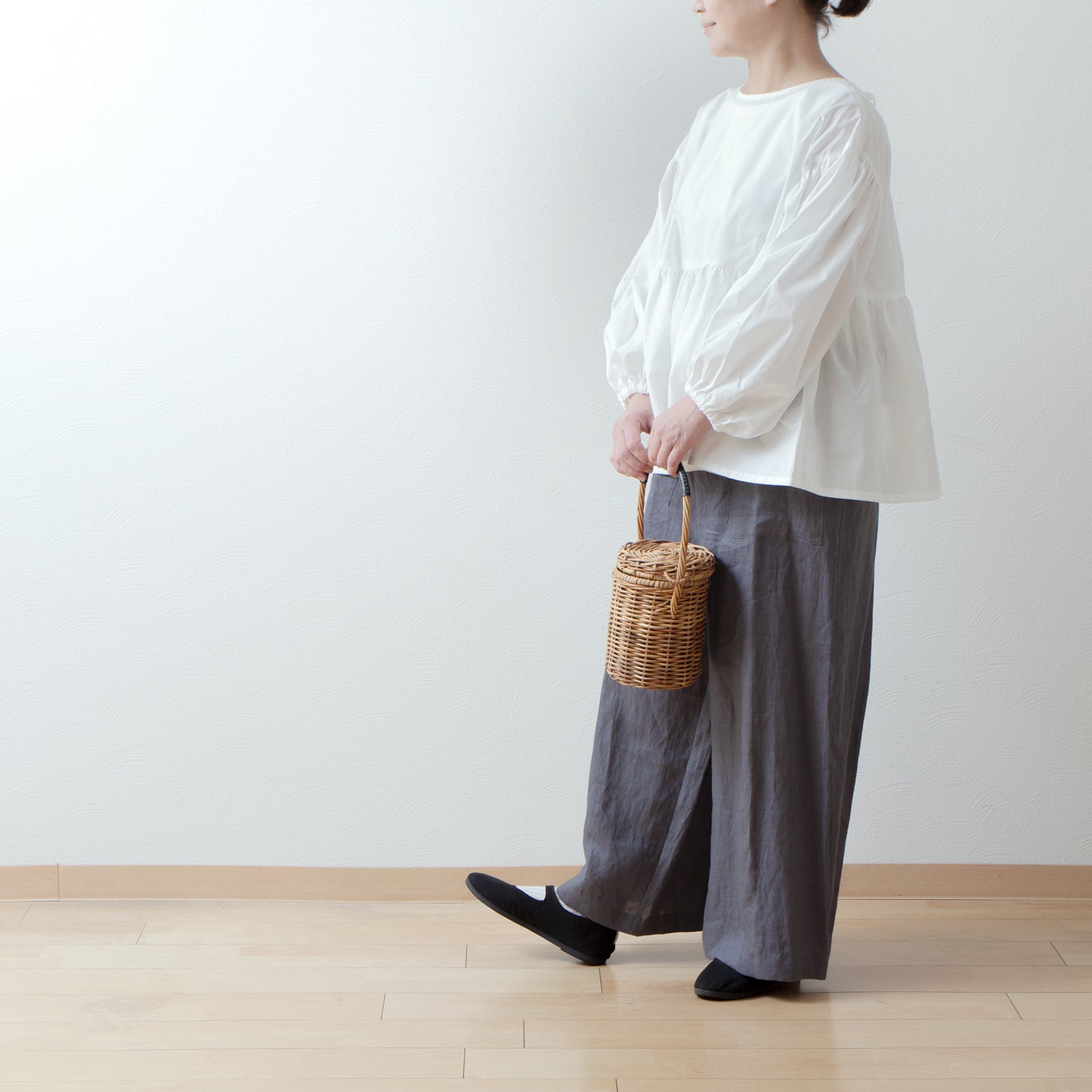 袖付けにも施したギャザーと、袖口とのダブルギャザーがボリュームのある袖に◎ 袖口はのラフなゴム仕様は、たくし上げることで6分袖にアレンジもできます。