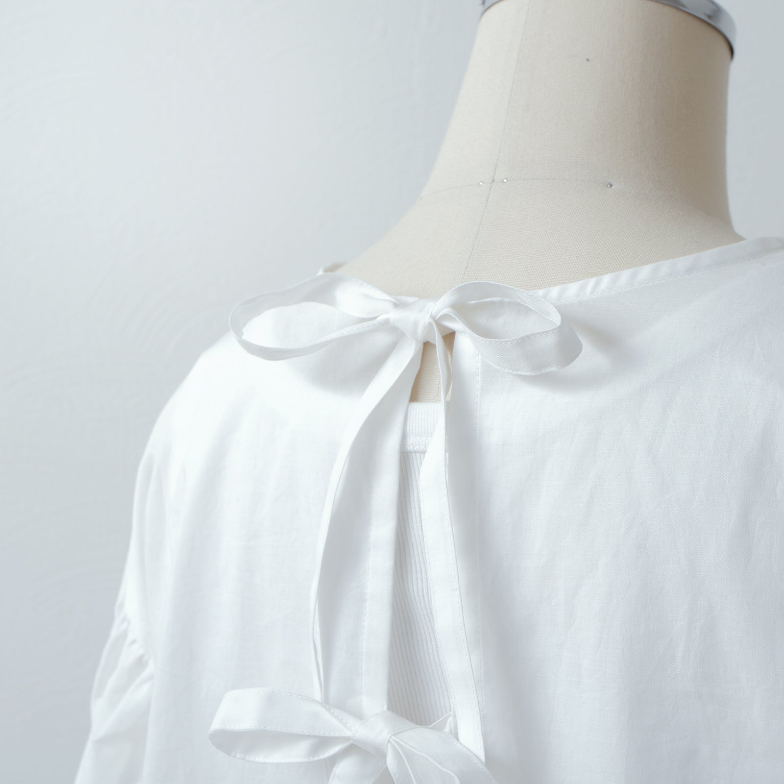 バックのリボンタイで留めることができ、またポイントにもなっています。