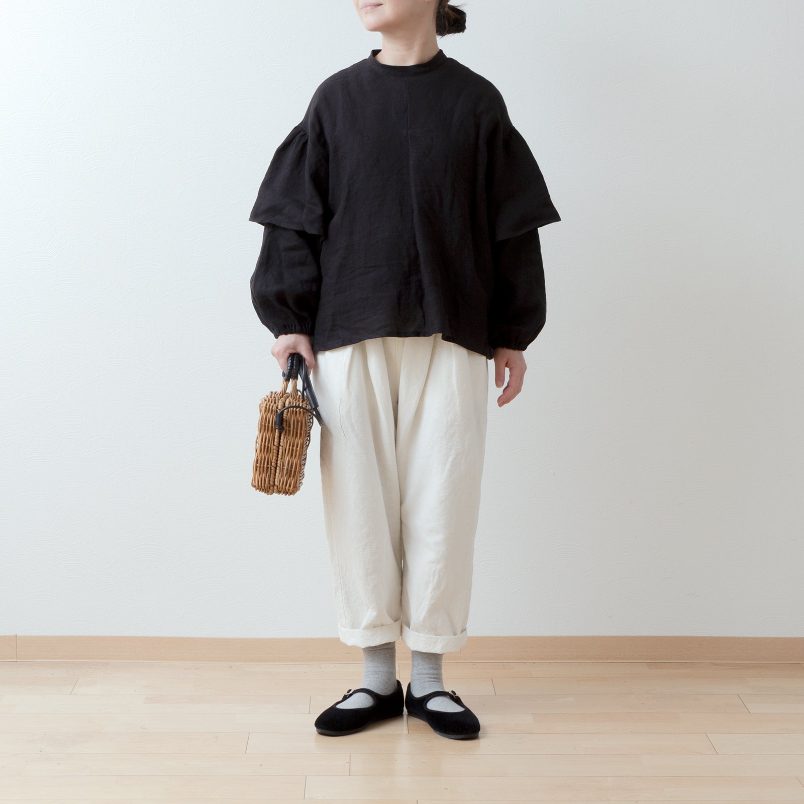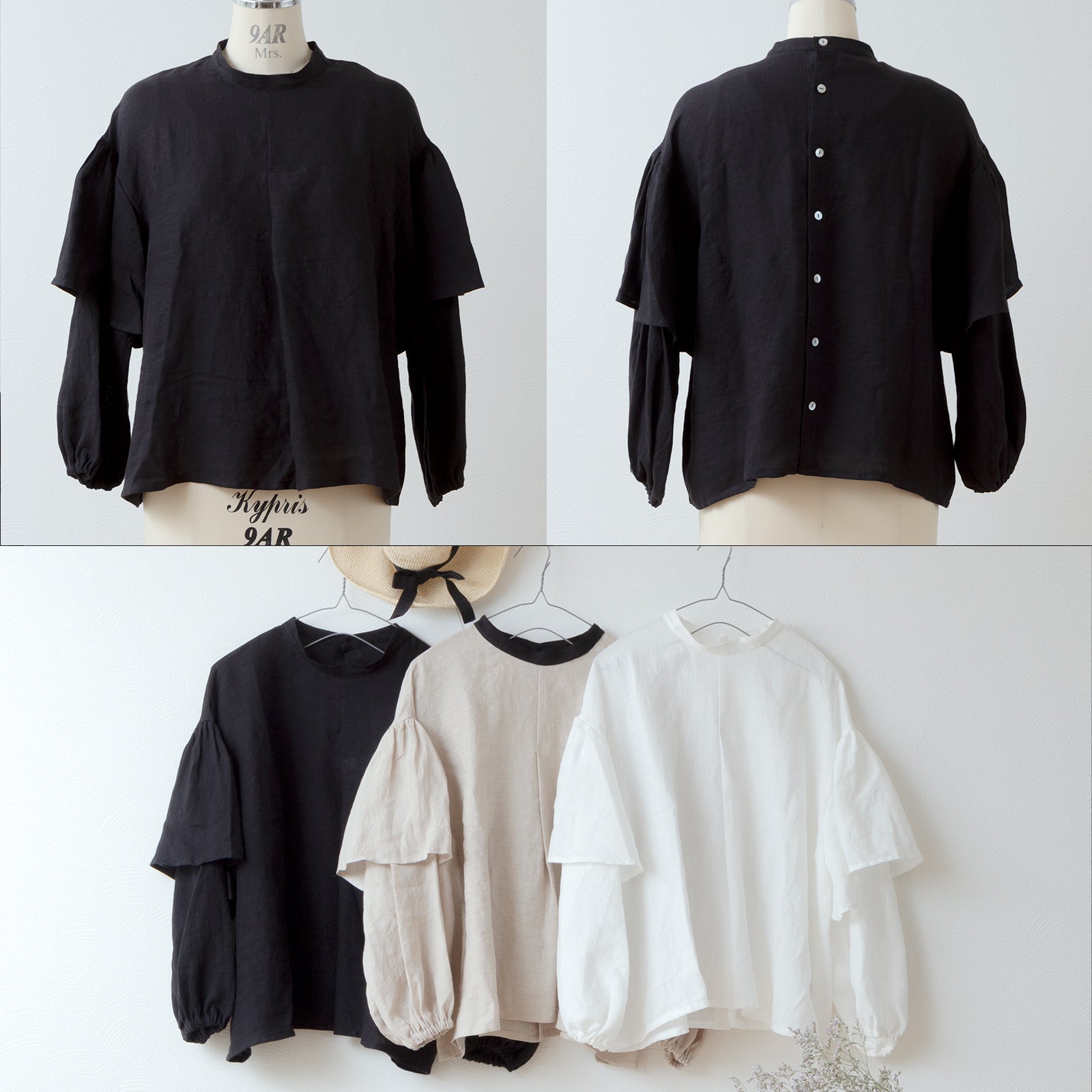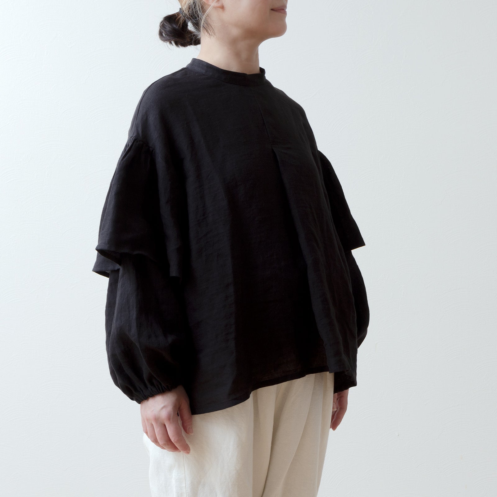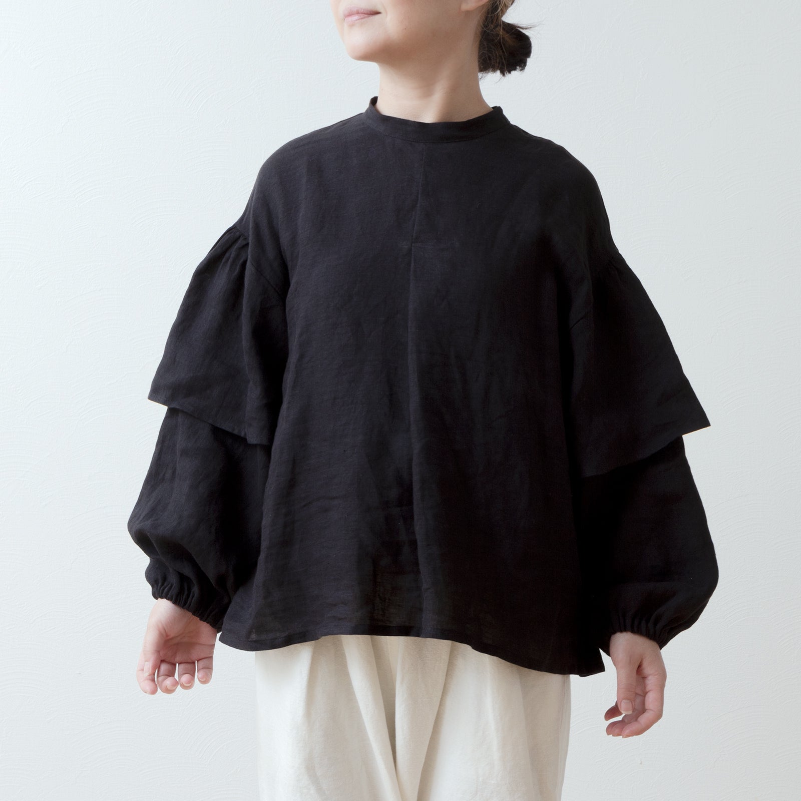 ダブルスリーブリネンブラウス/ブラック
