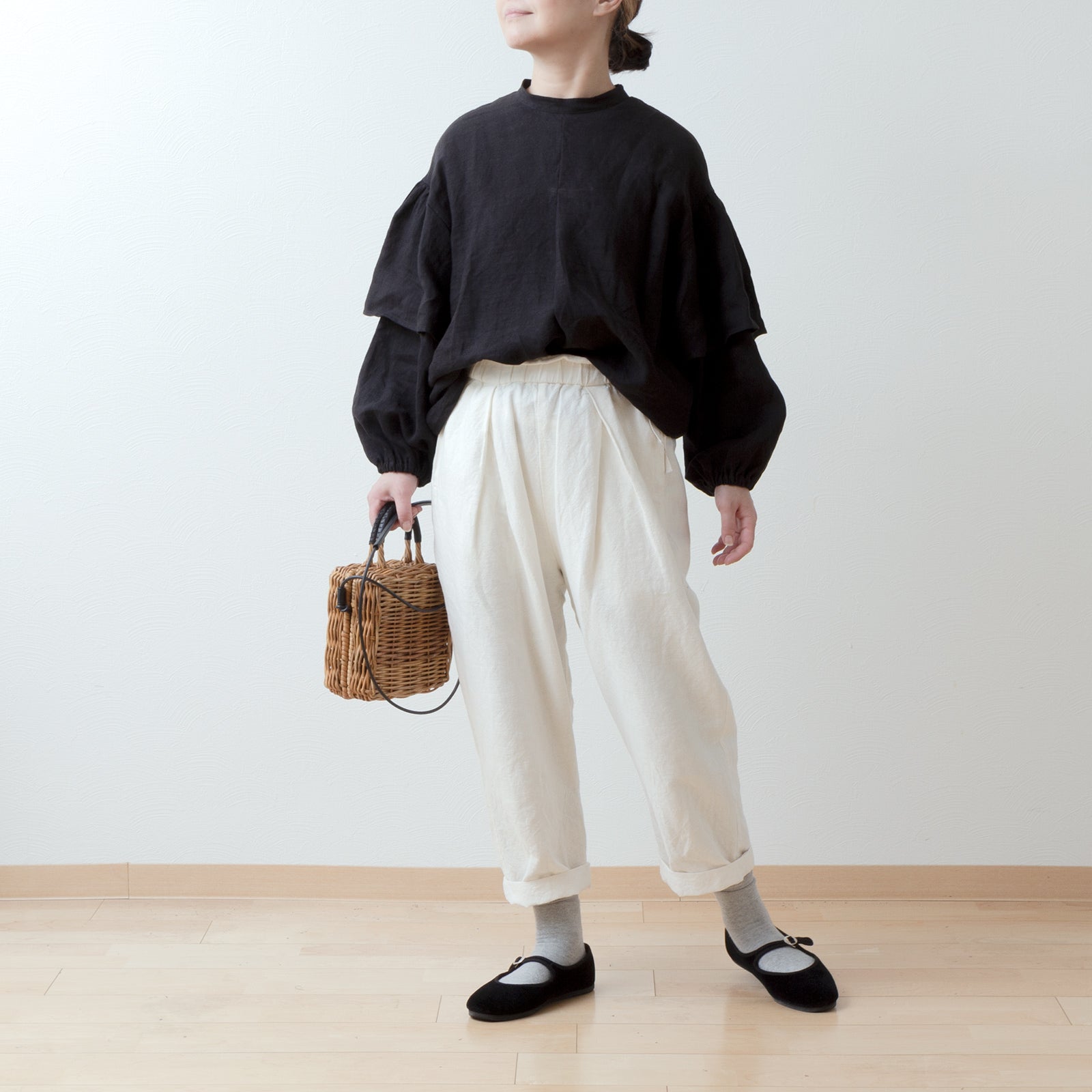 裾をウエストインすると、ブラウスのボリュームがより感じられかわいいバランスに。