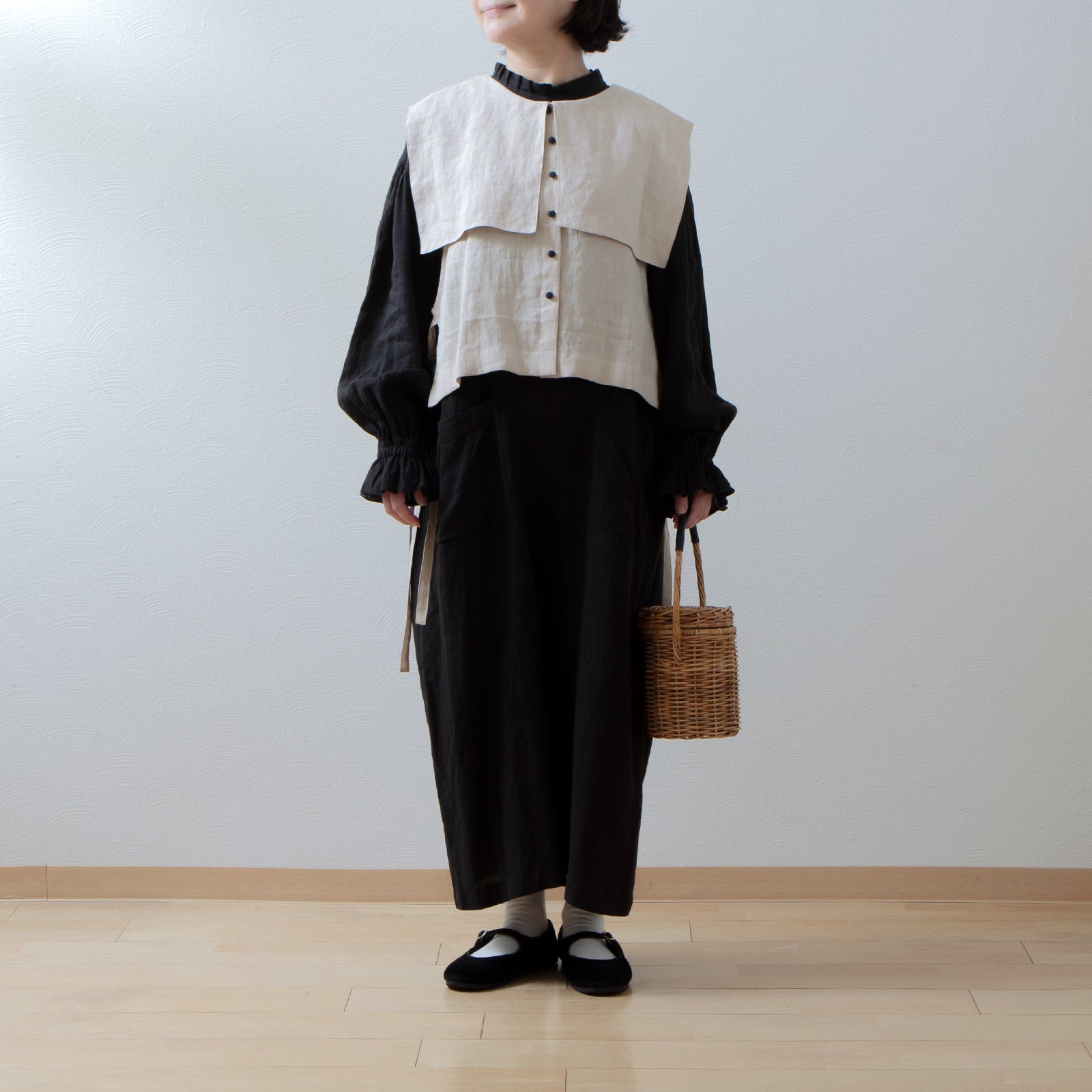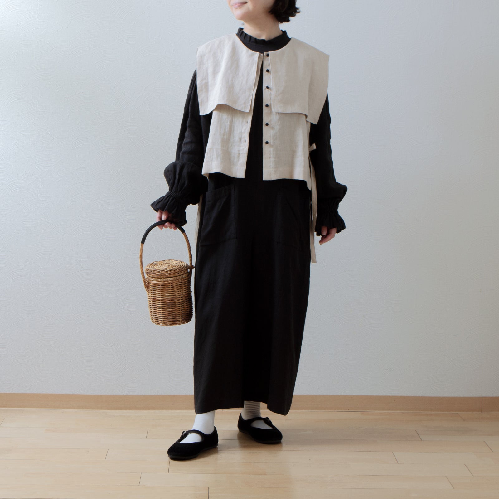 ・タックフリル衿ギャザーロングスリーブリネンオールインワン/ブラック
