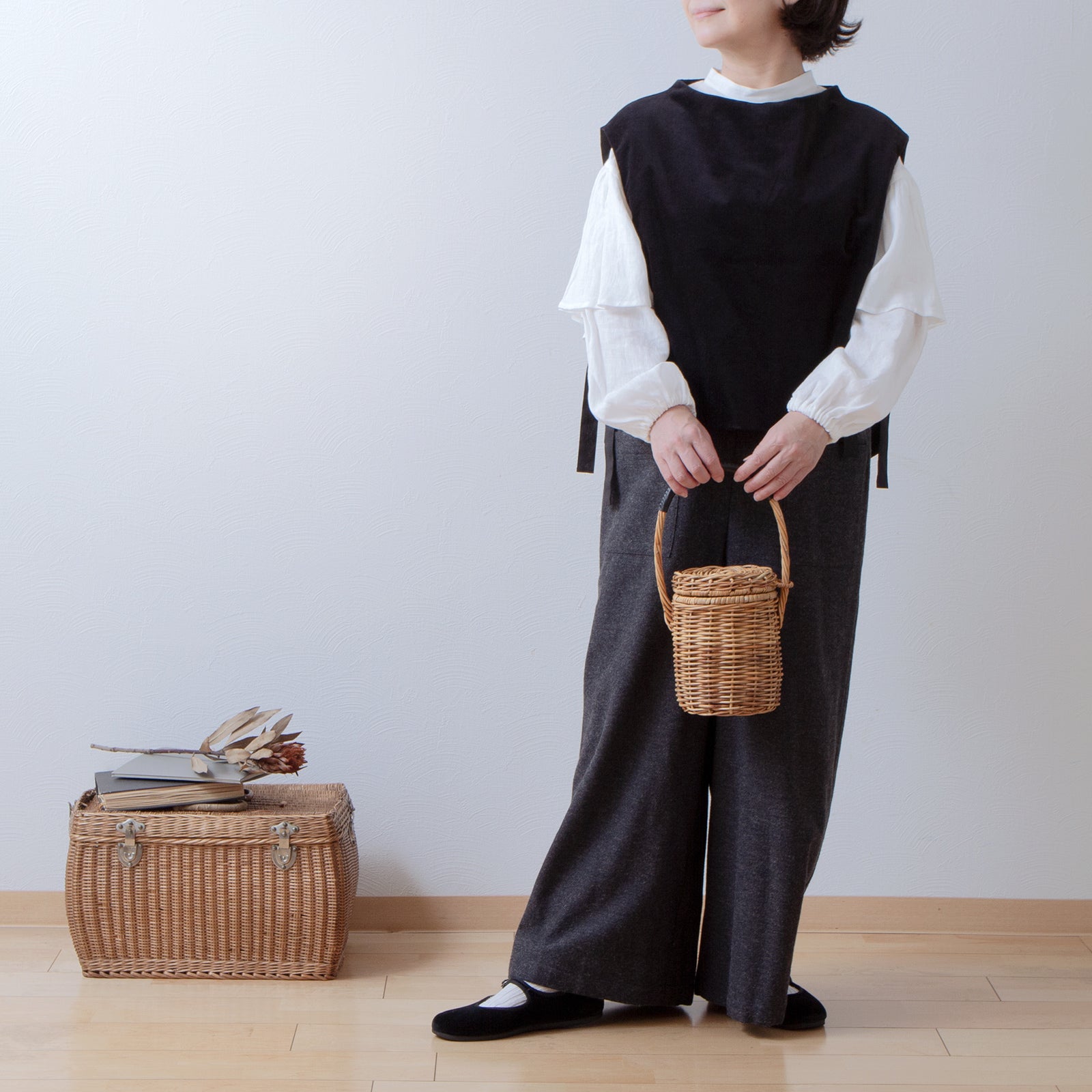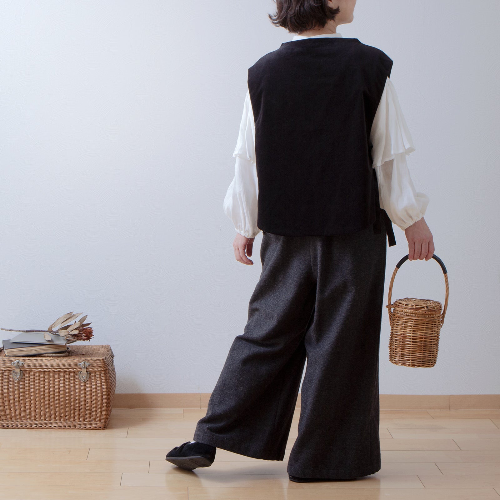 冬のカシュクールサロペットワイドパンツ-ウールヘリンボ-ン/チャコール