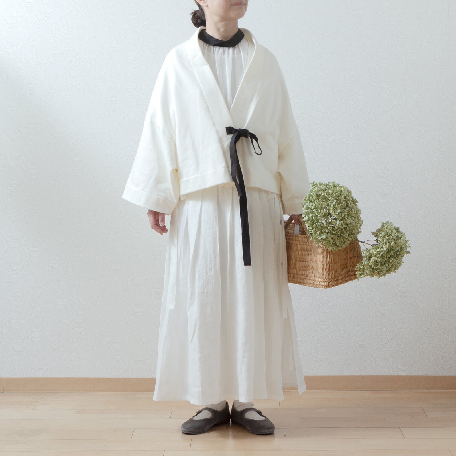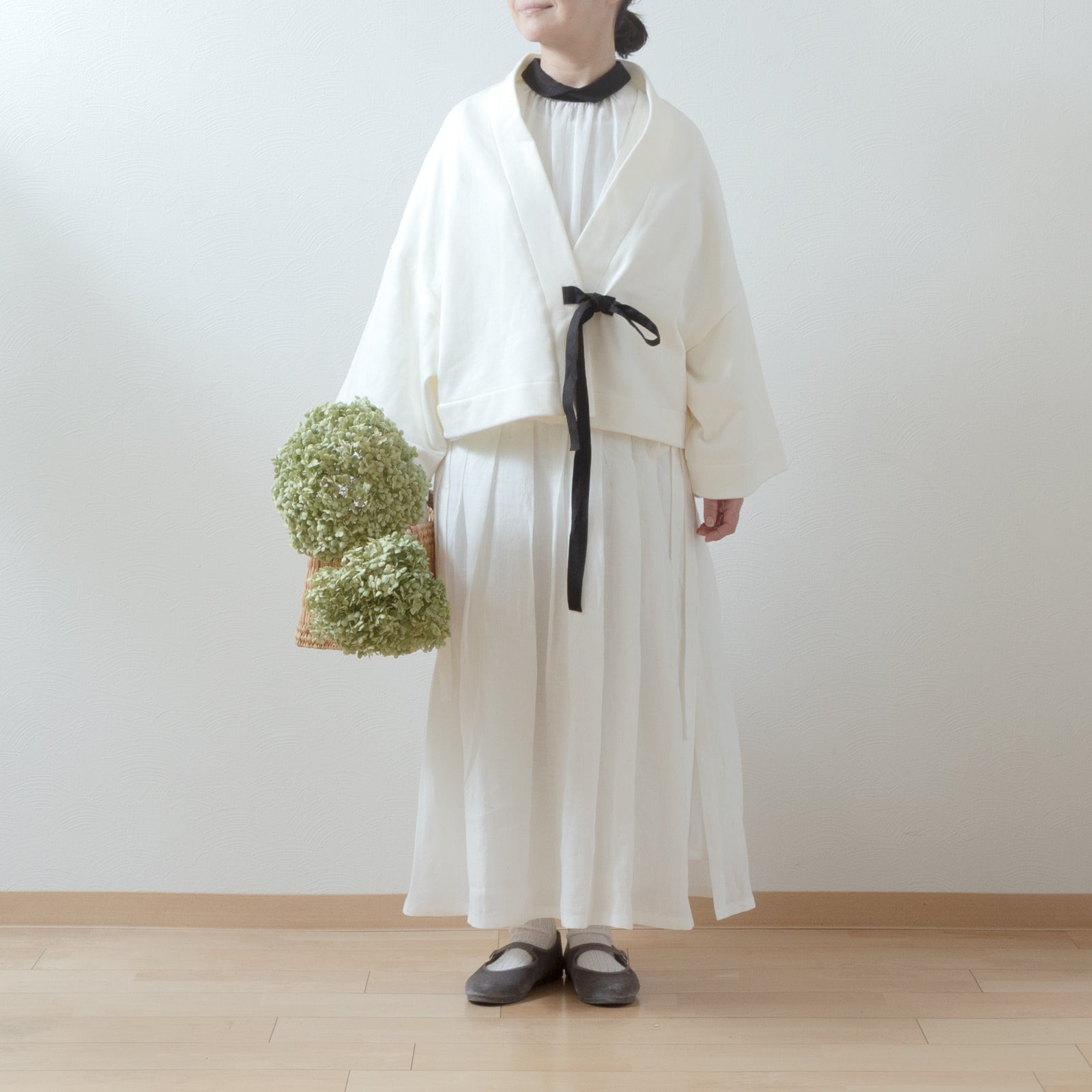 棉質羊毛半披肩開襟衫,搭配緞帶/米色