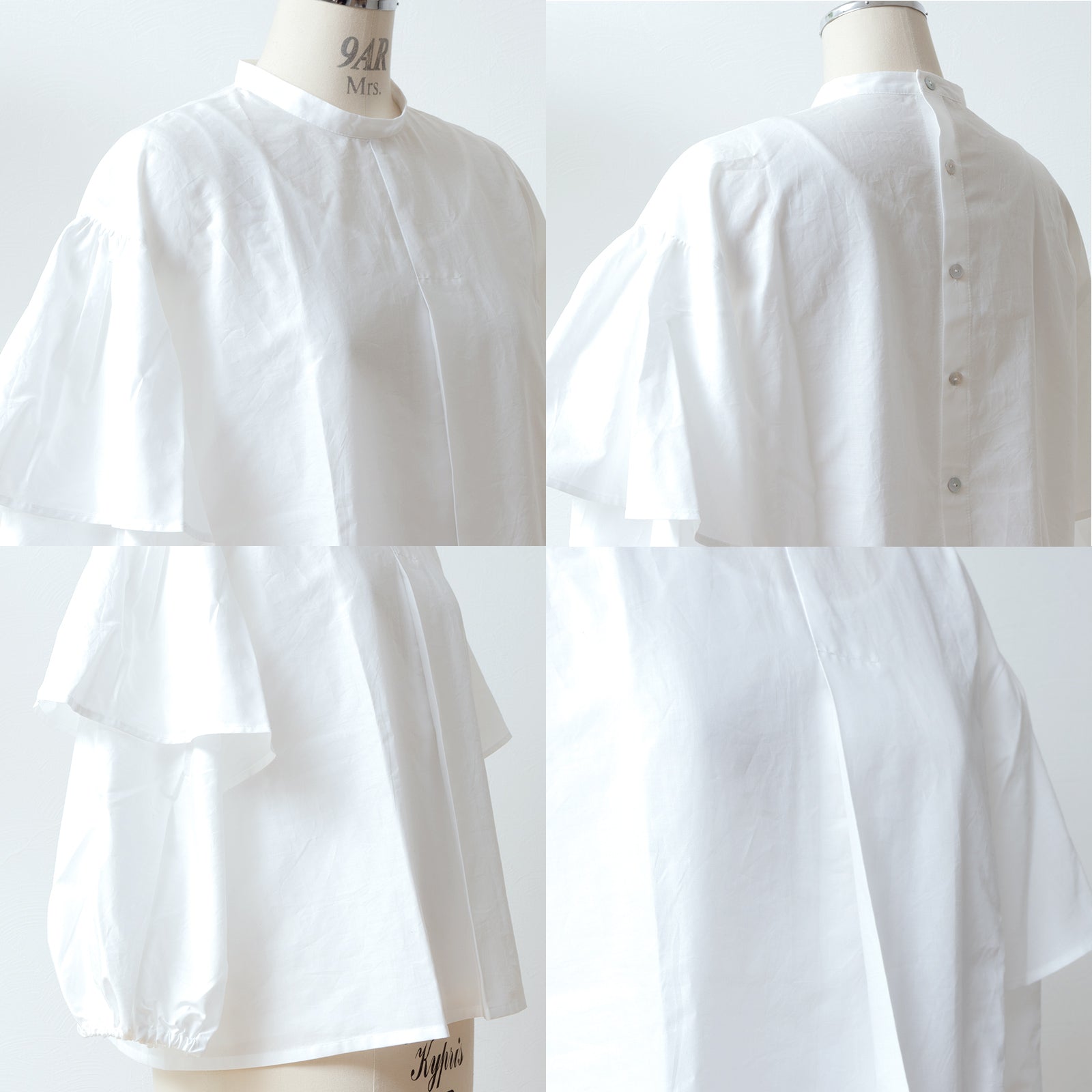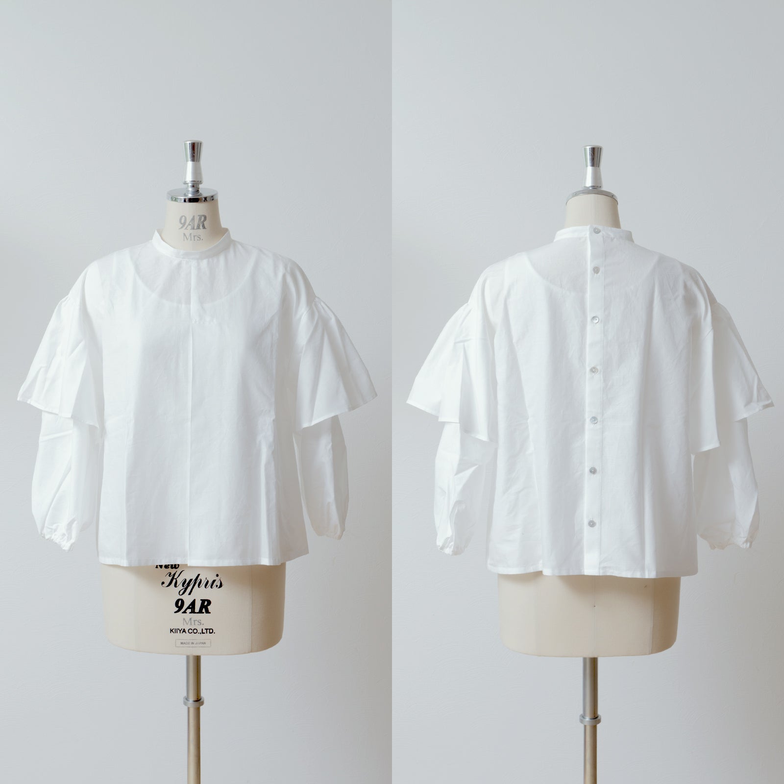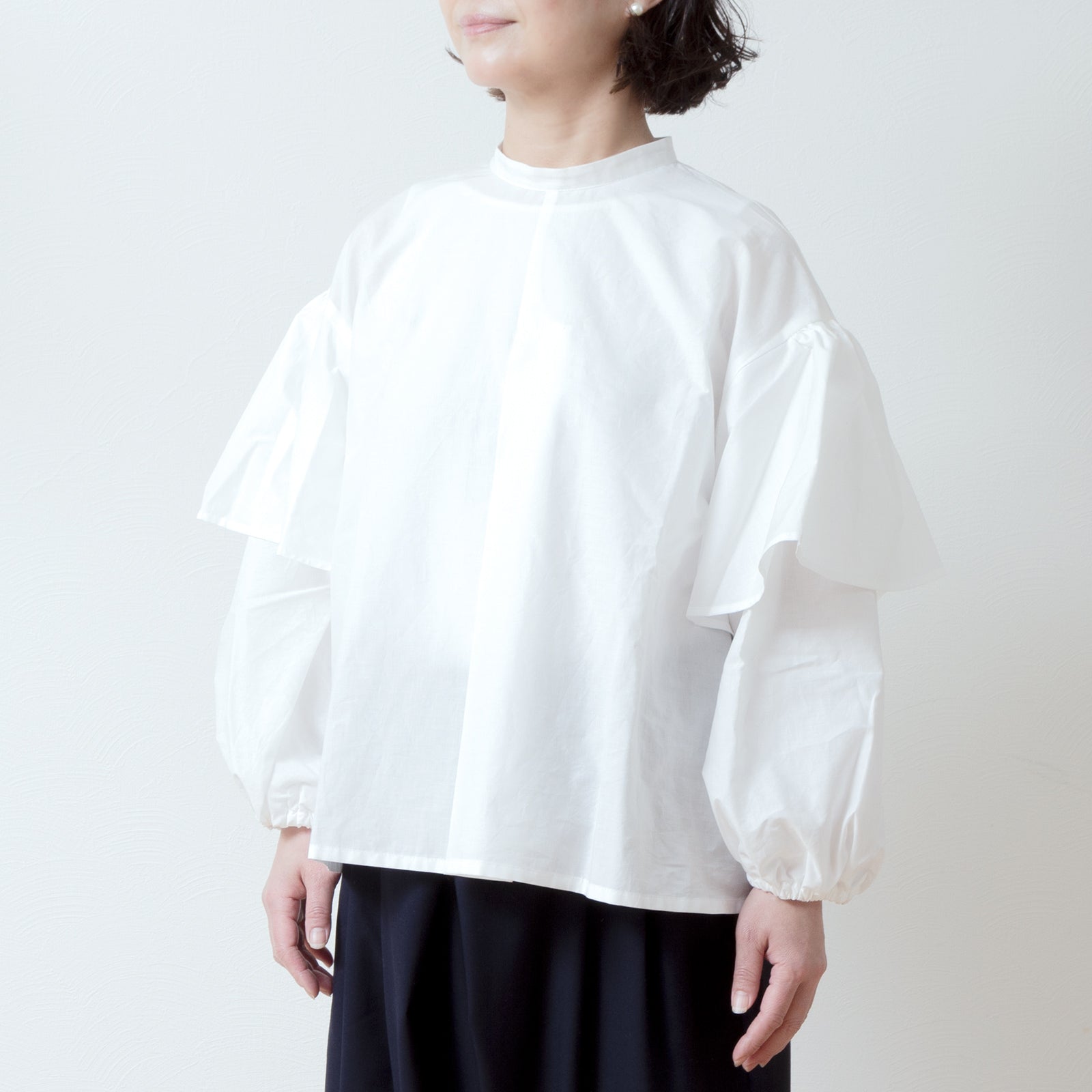 可愛又成熟的亞麻襯衫,雙層袖子是其亮點。 前面的厚褶邊也是一大亮點。