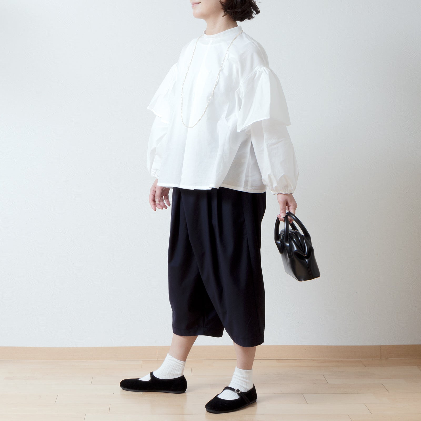 褶皺喇叭袖給人一種輕鬆的感覺,袖口採用粗糙的鬆緊帶製成。 可依溫度調整袖長至6/8,還可享受更寬鬆的袖子。