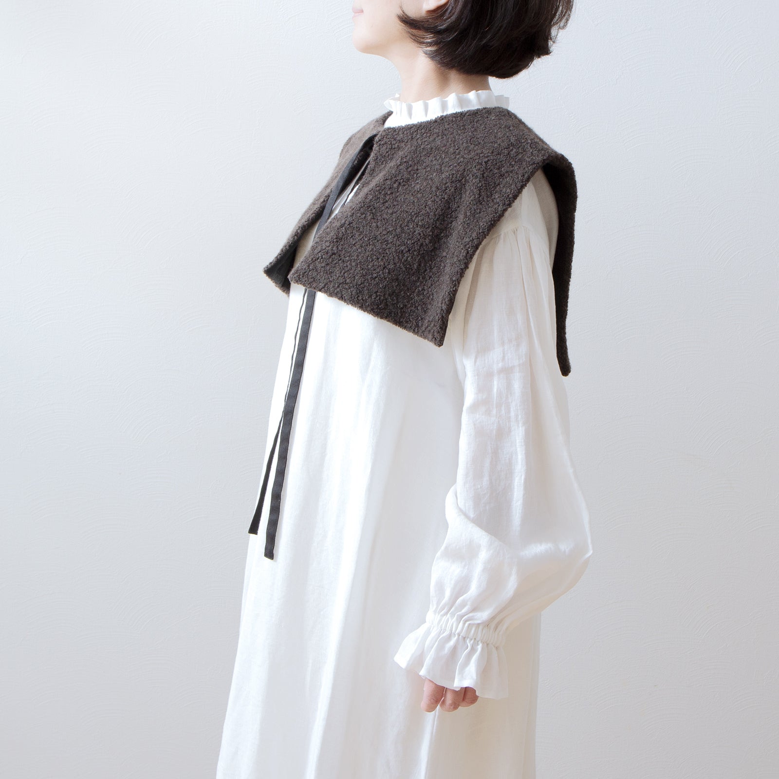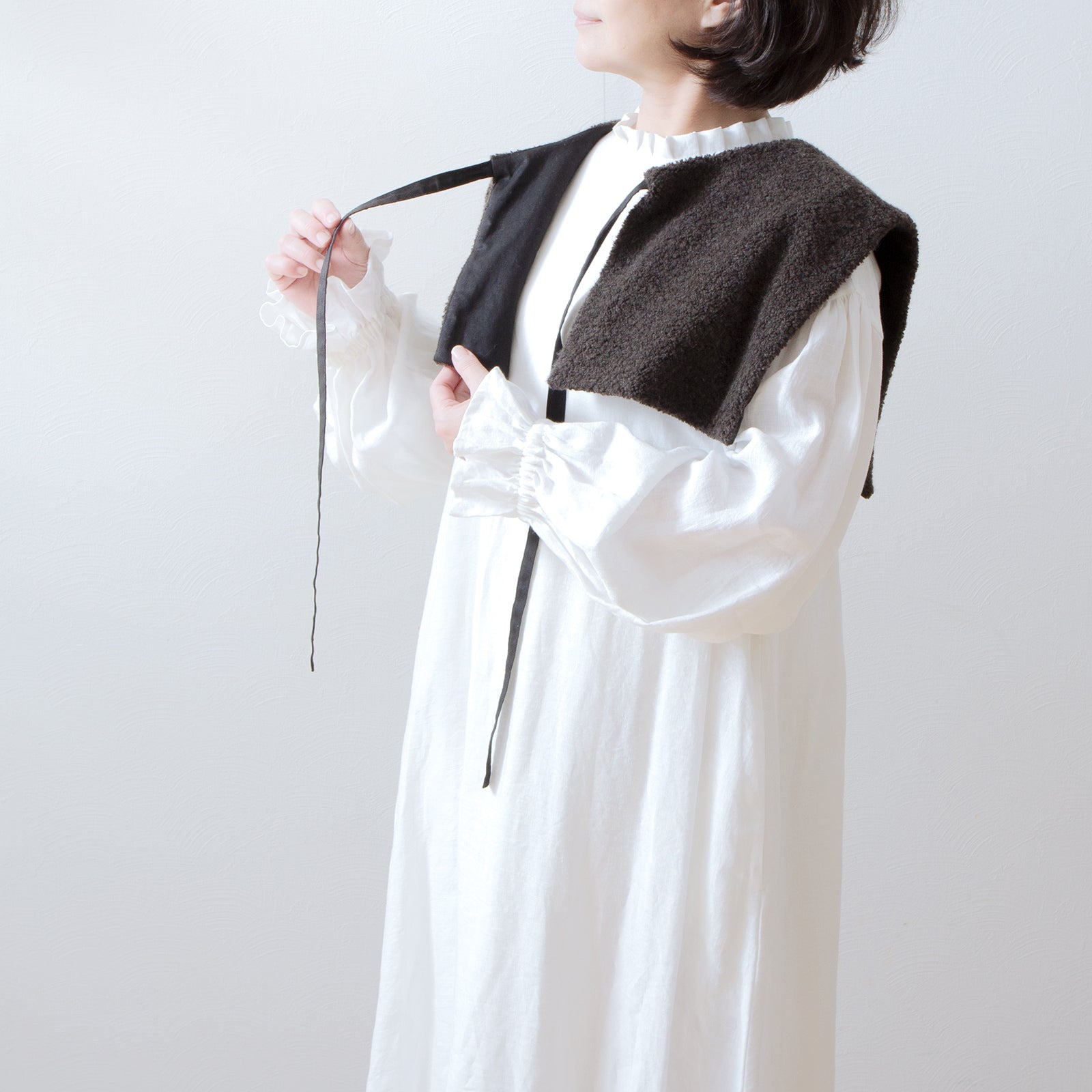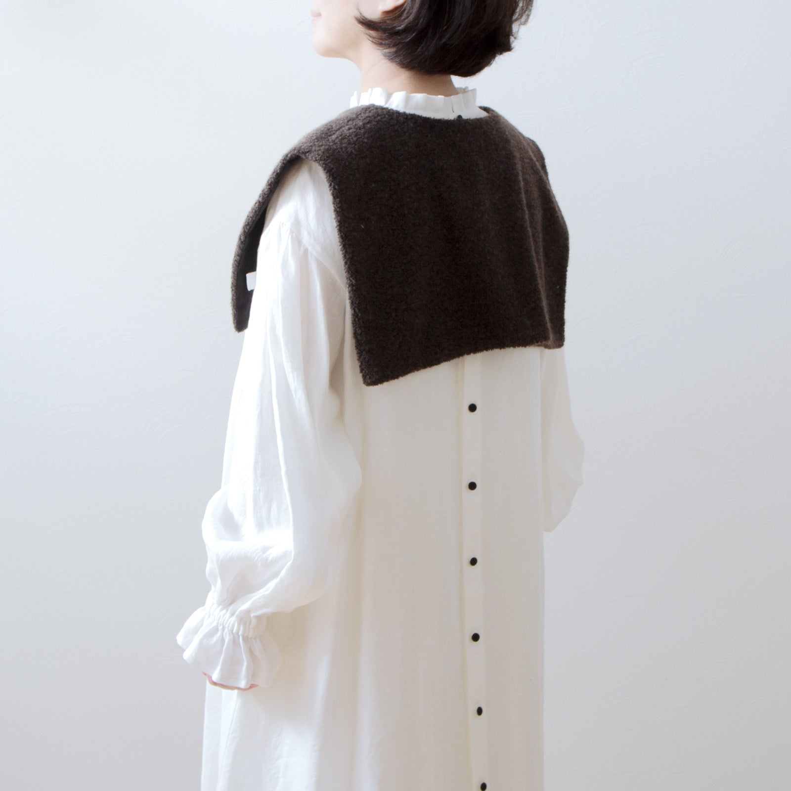 當您將褶皺荷葉邊領連身裙穿在內層時,領子和袖口就會成為華麗的點綴。