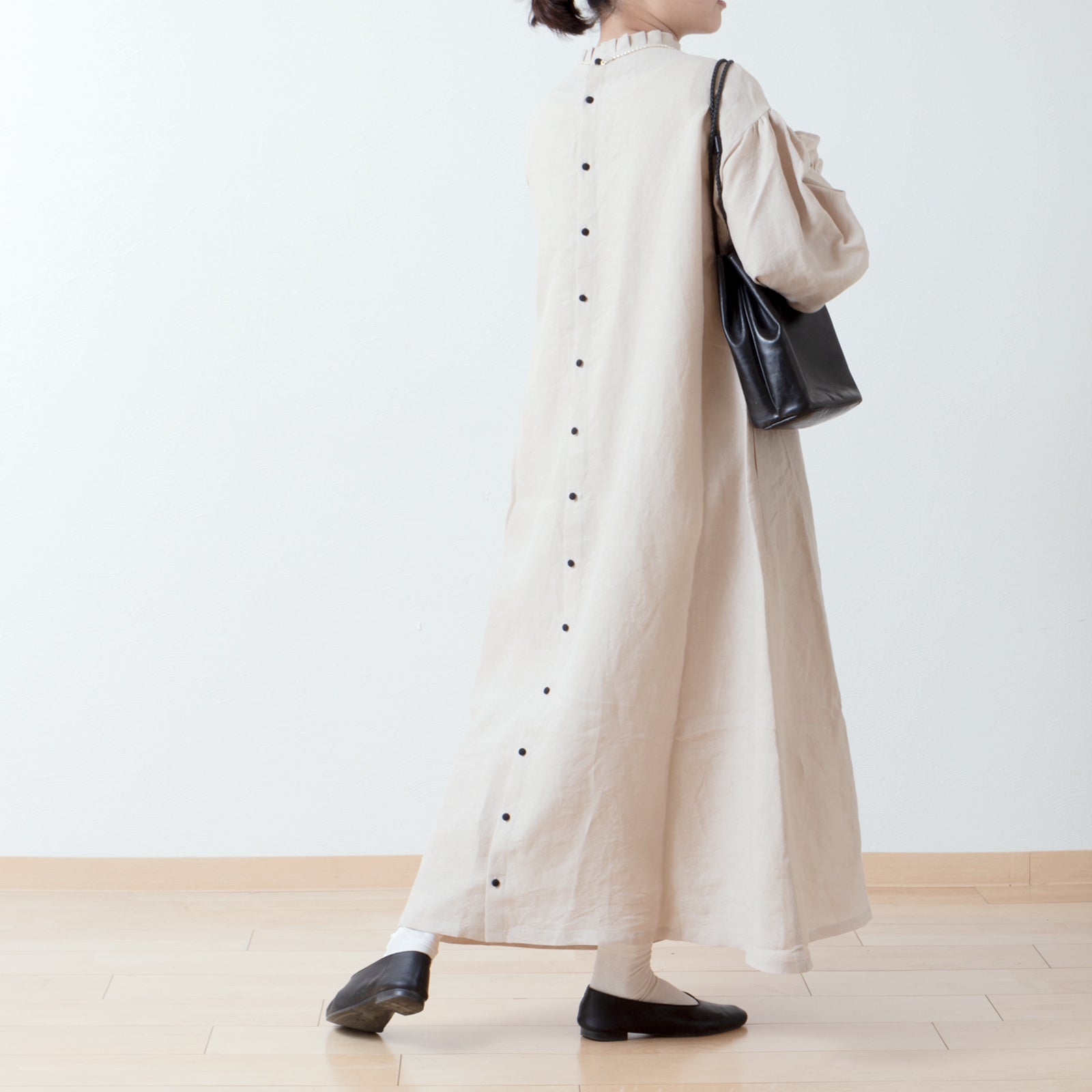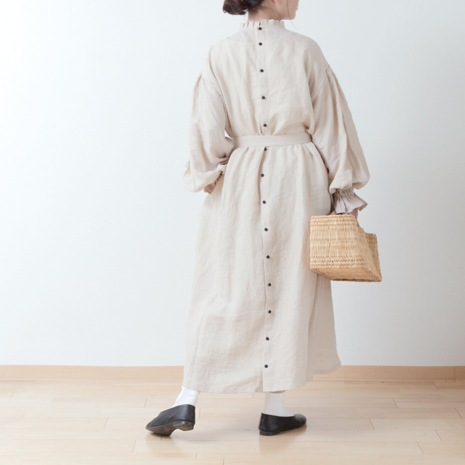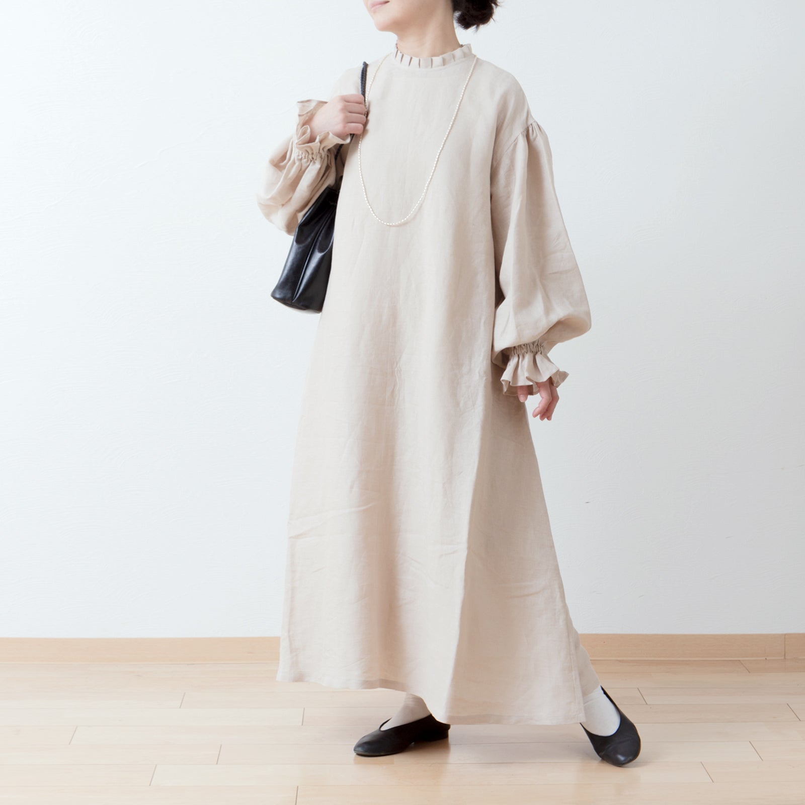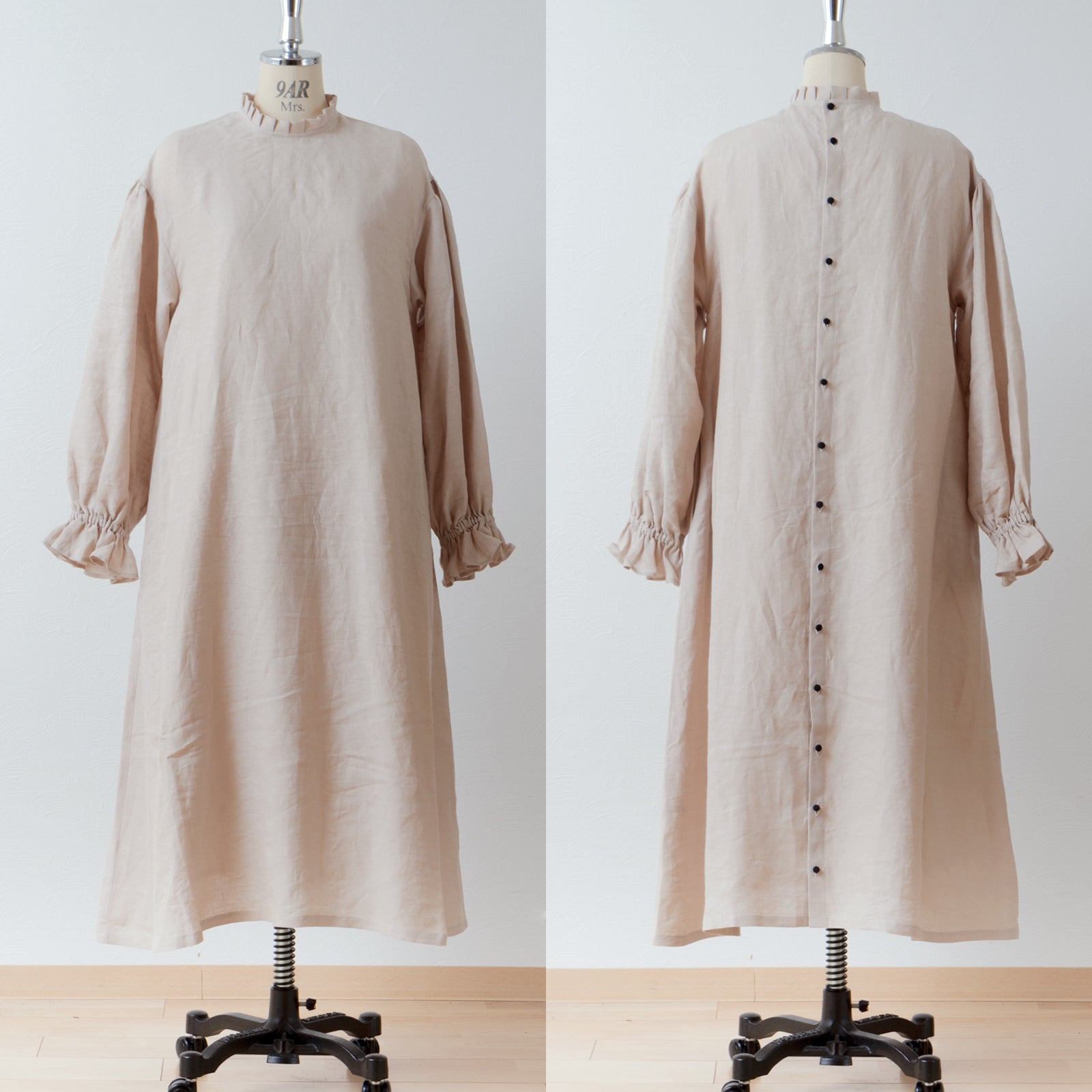 優雅的褶邊領 *NaturiLa 雜誌推薦* 後蓋紐曼扣褶袖 A 字形亞麻連身裙/米色