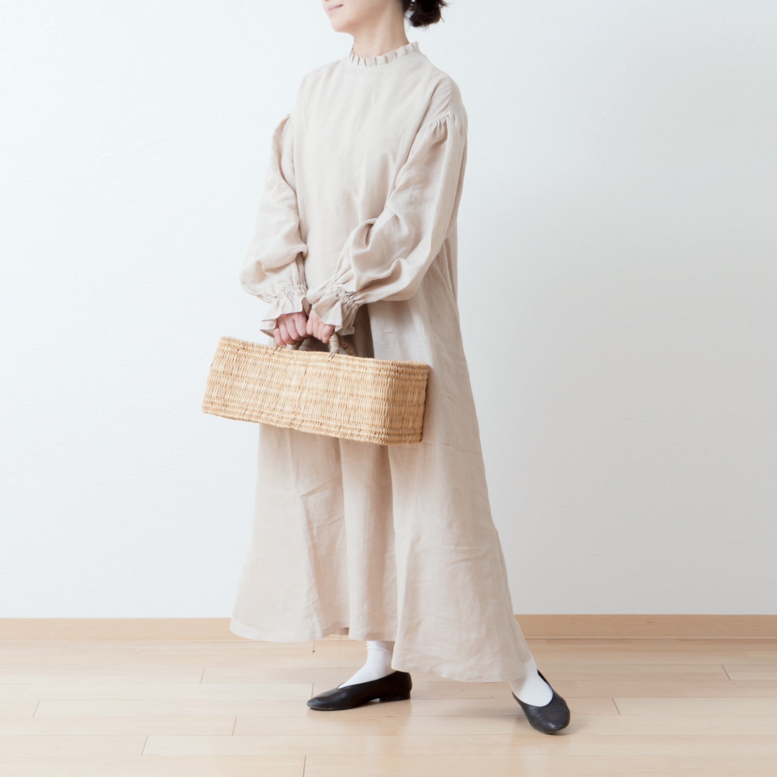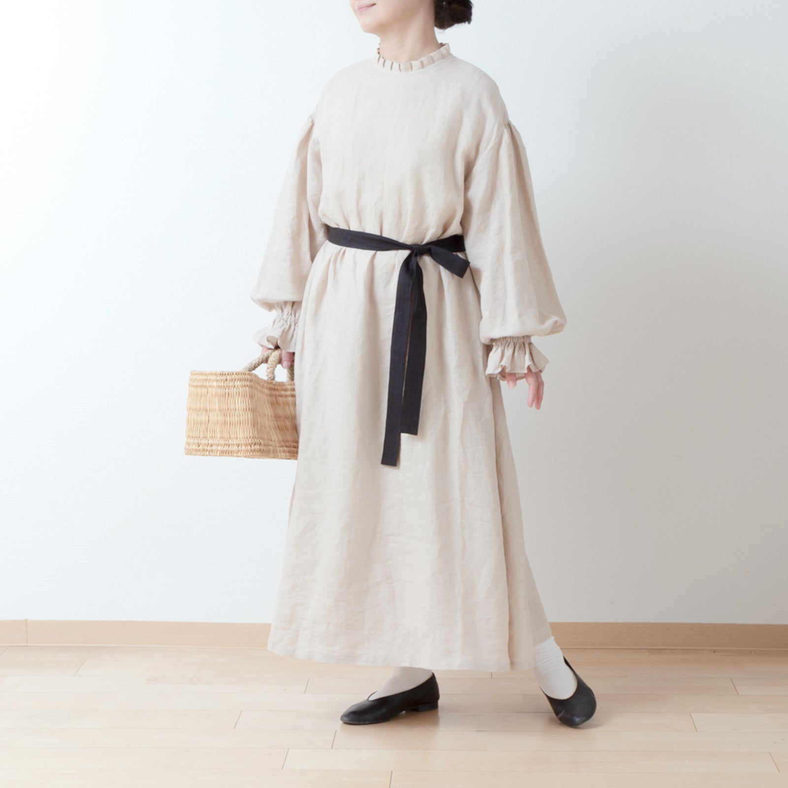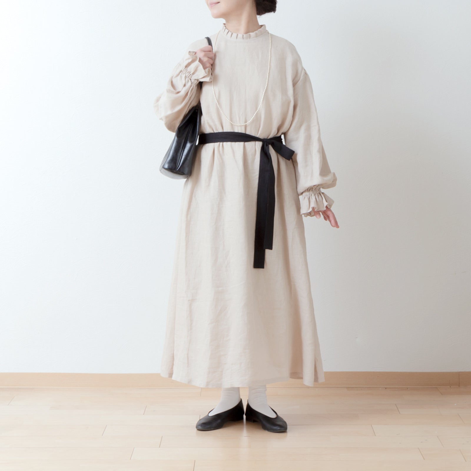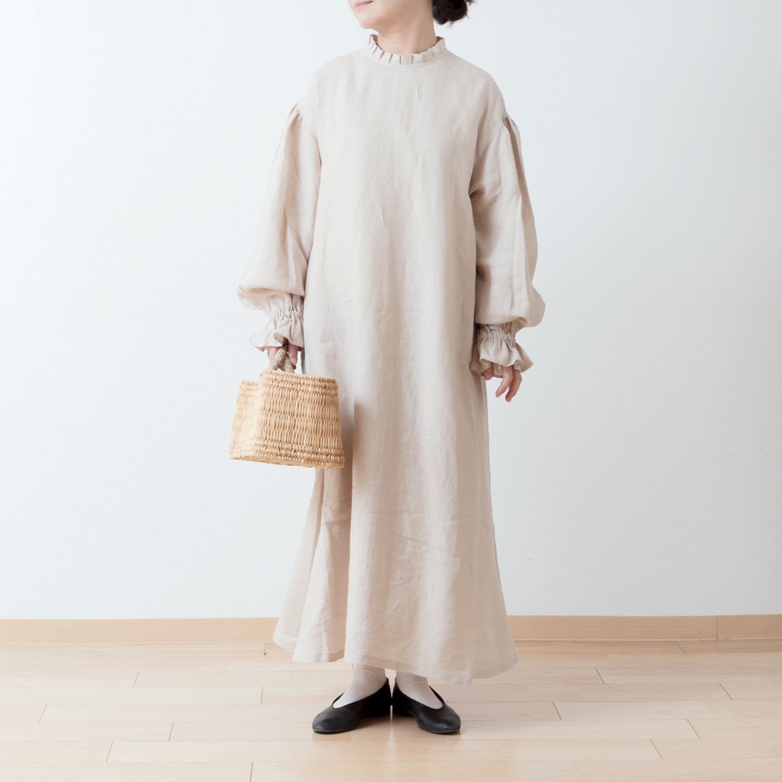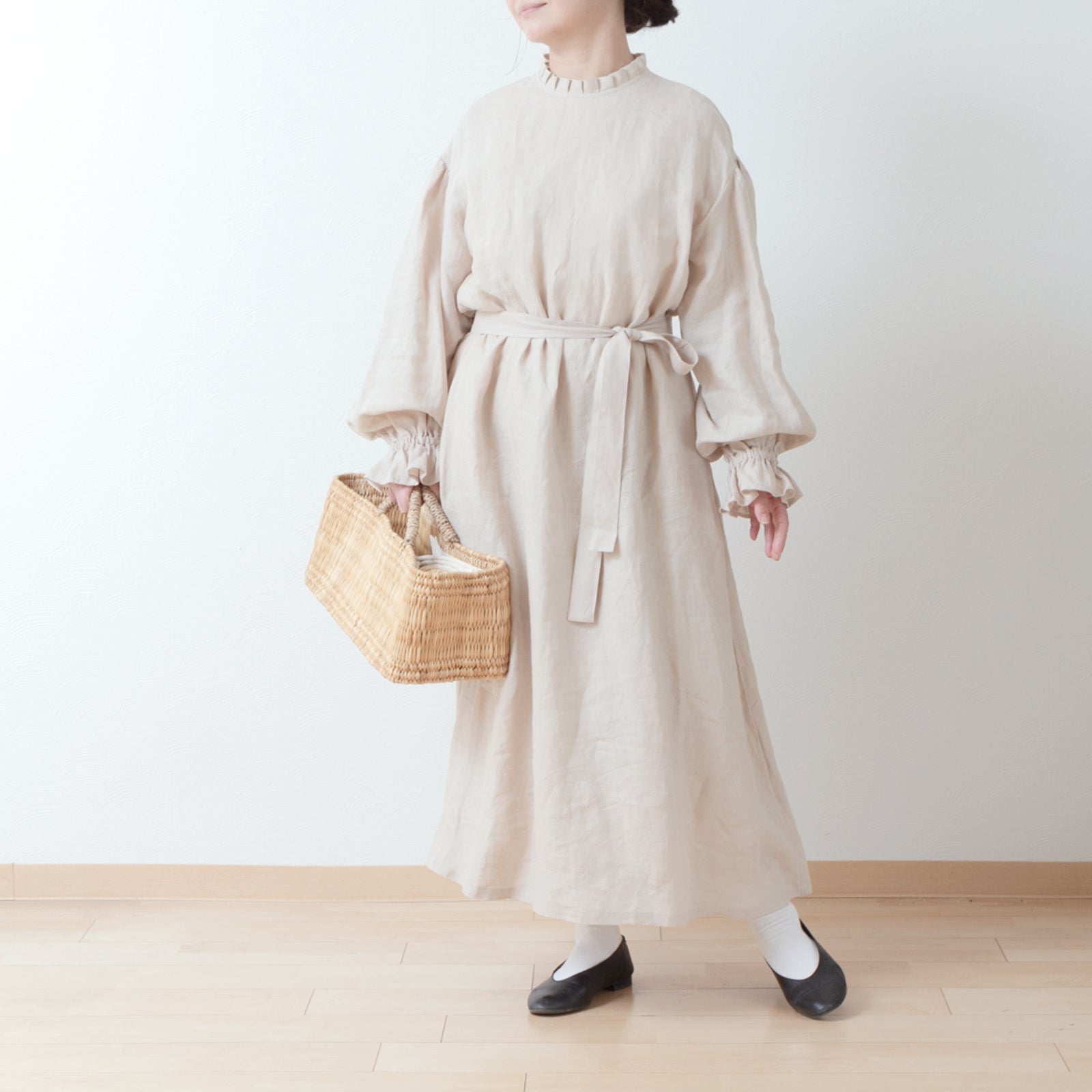 優雅的褶邊領 *NaturiLa 雜誌推薦* 後蓋紐曼扣褶袖 A 字形亞麻連身裙/米色