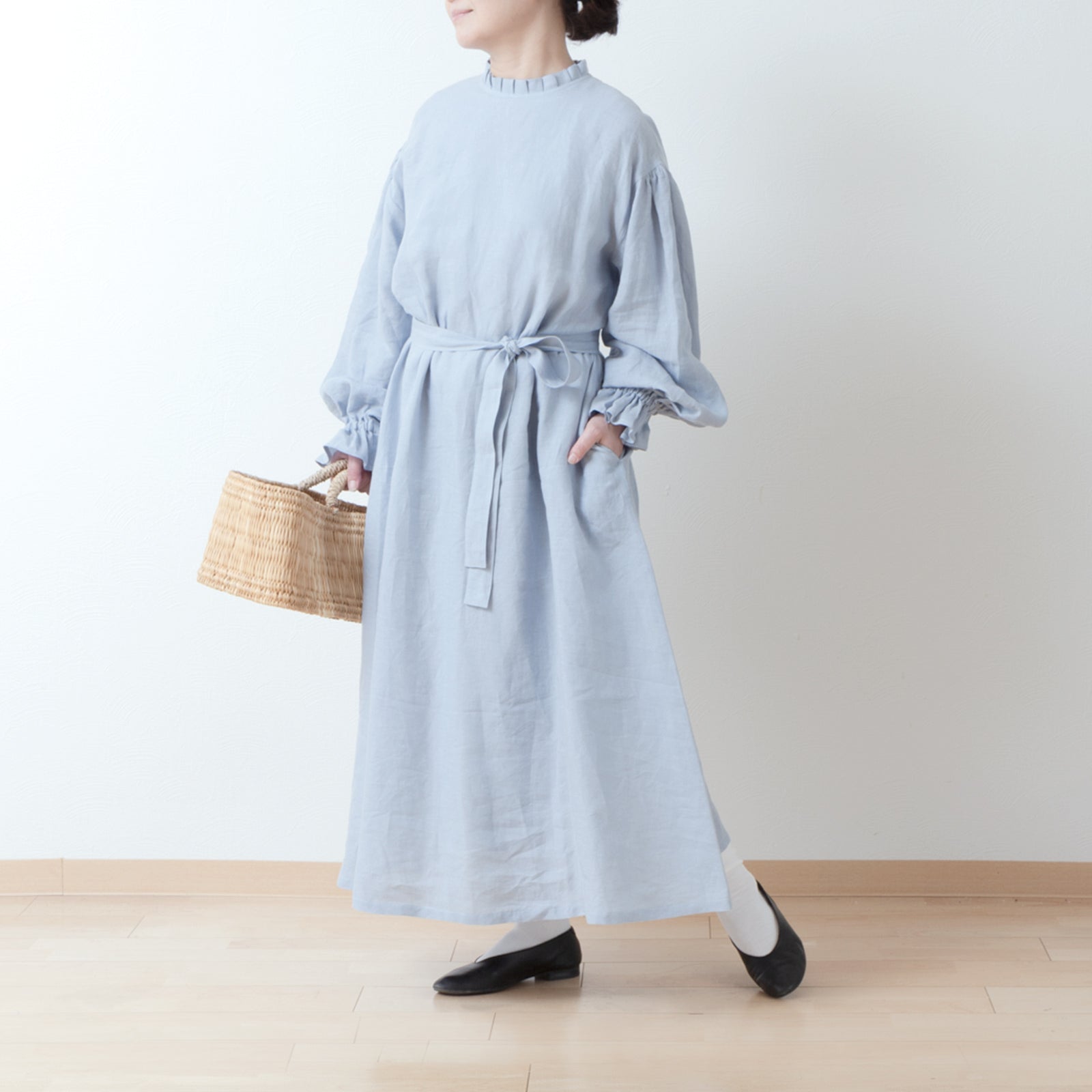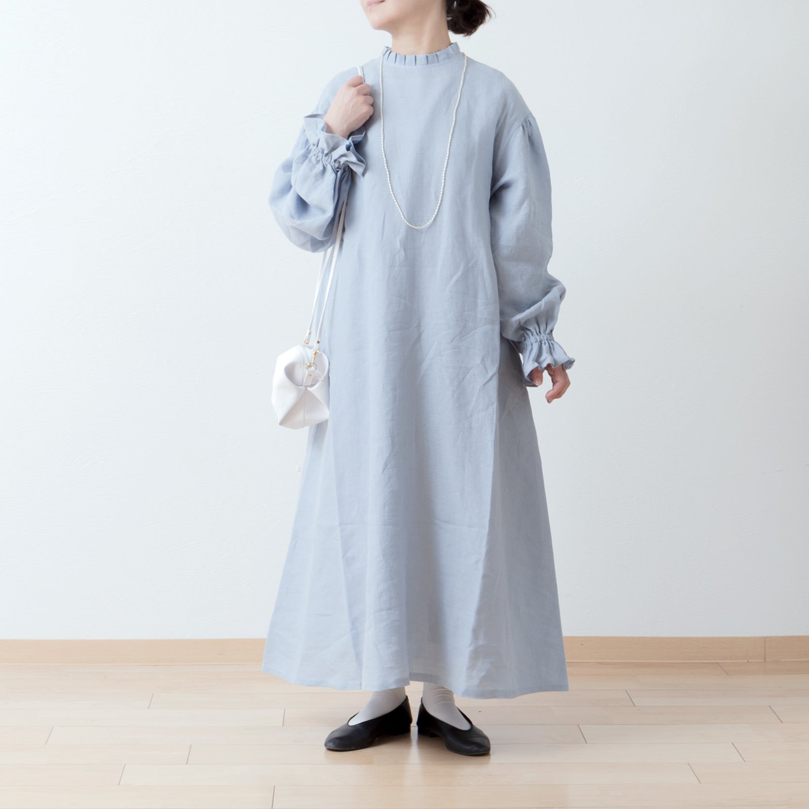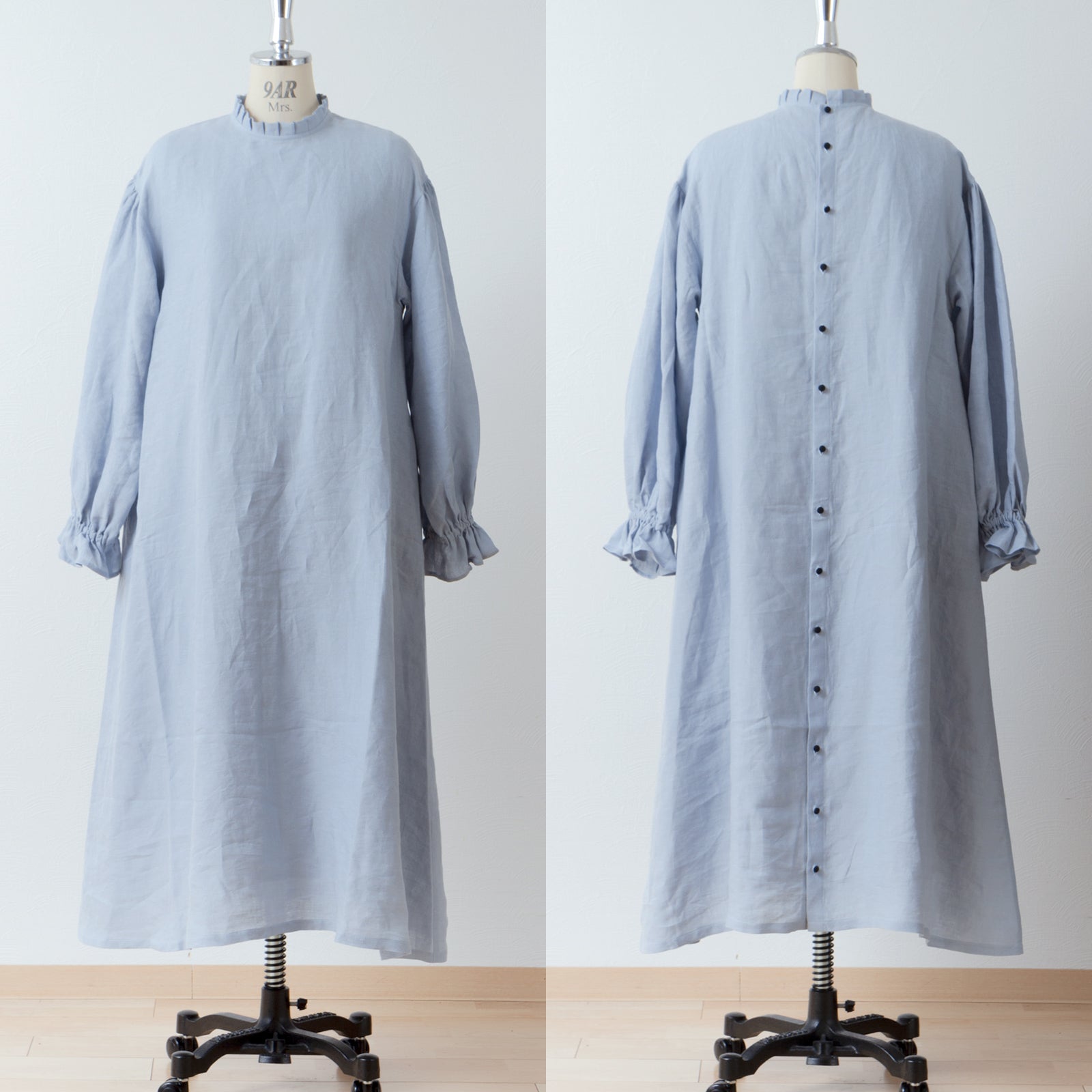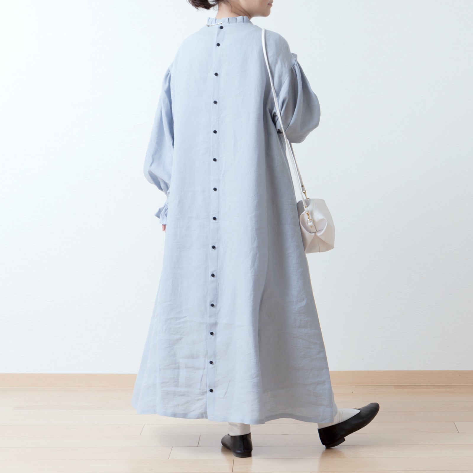 優雅的褶邊領 *非常適合儀式* 背扣褶袖 A 字形亞麻連身裙/淡藍色