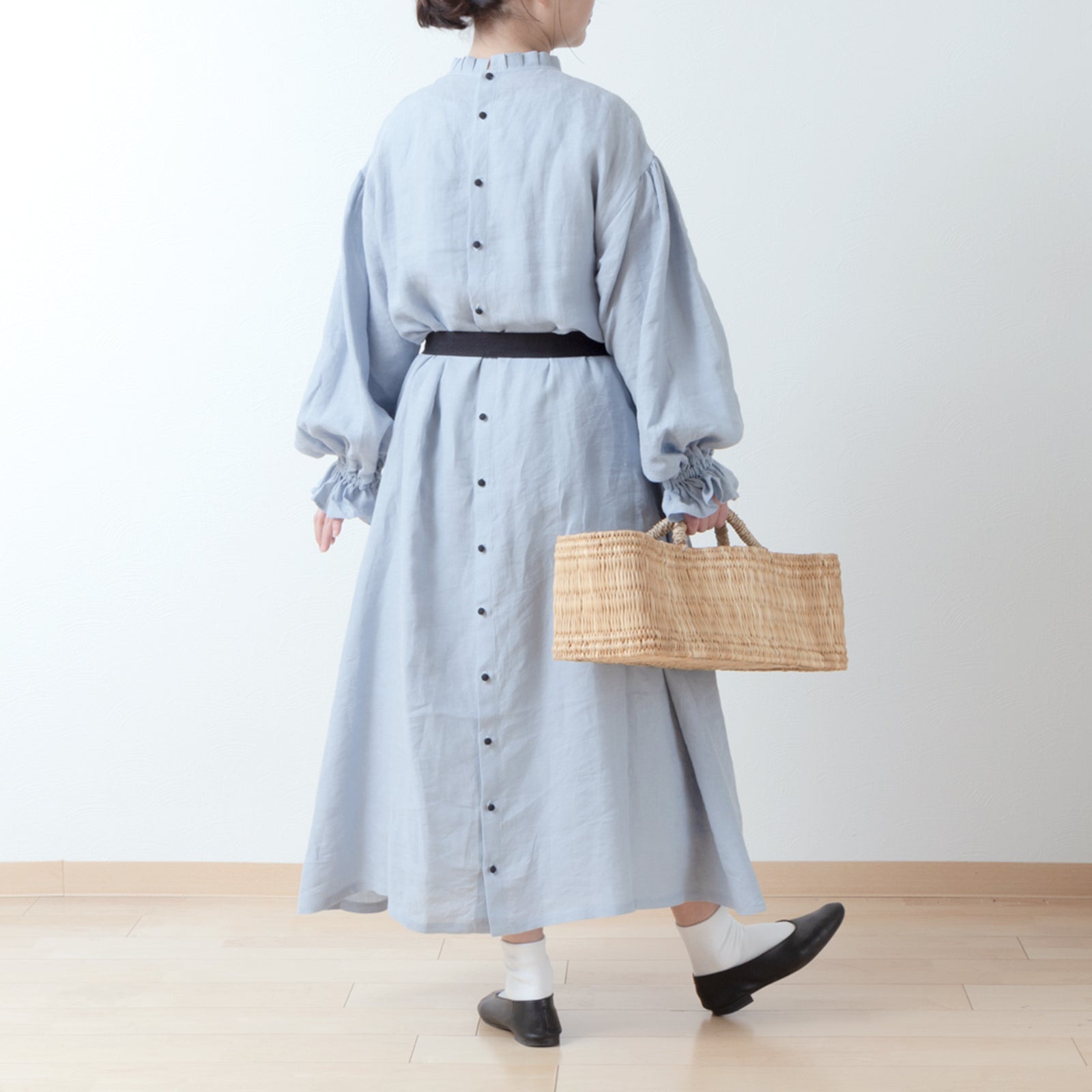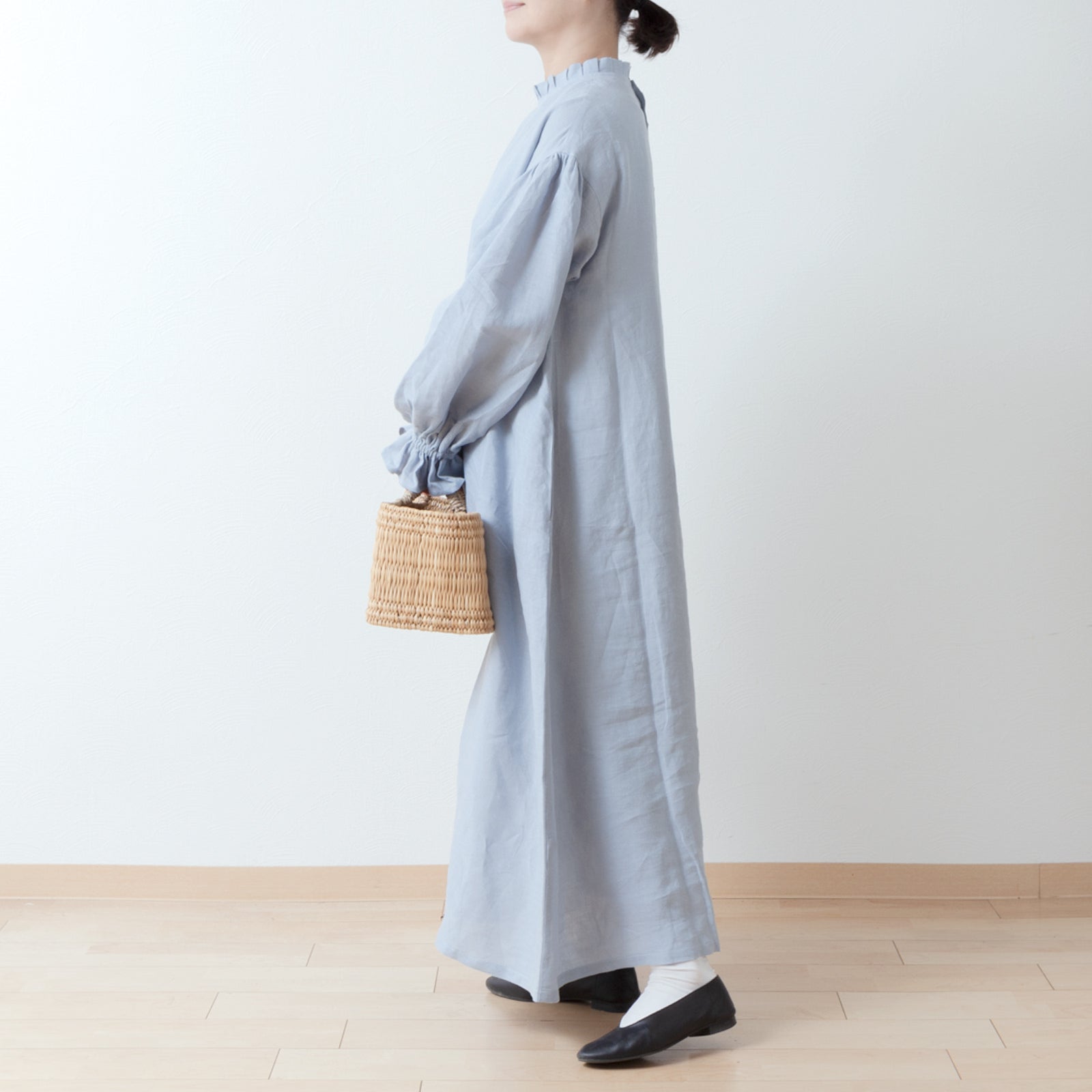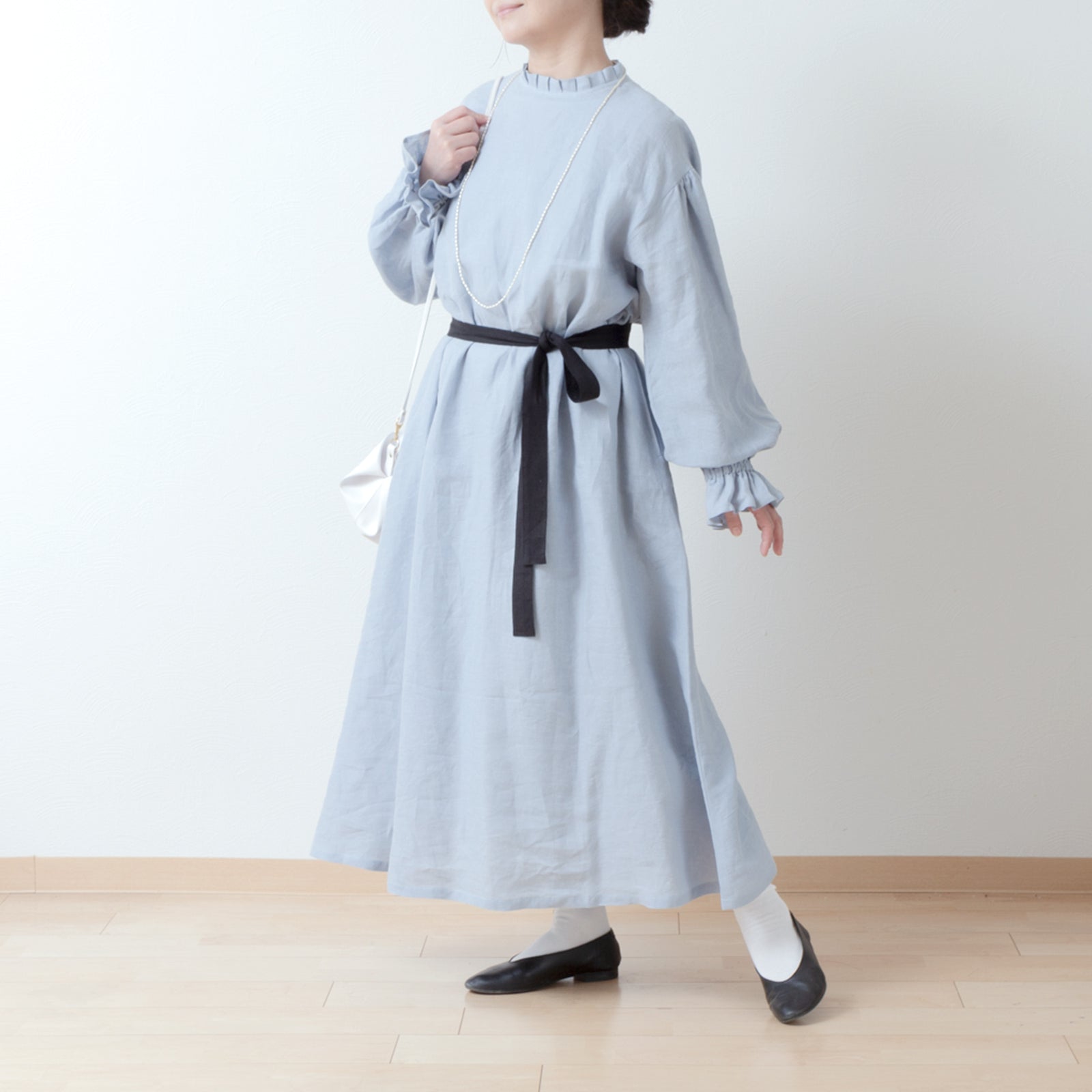 優雅的褶邊領 *非常適合儀式* 背扣褶袖 A 字形亞麻連身裙/淡藍色