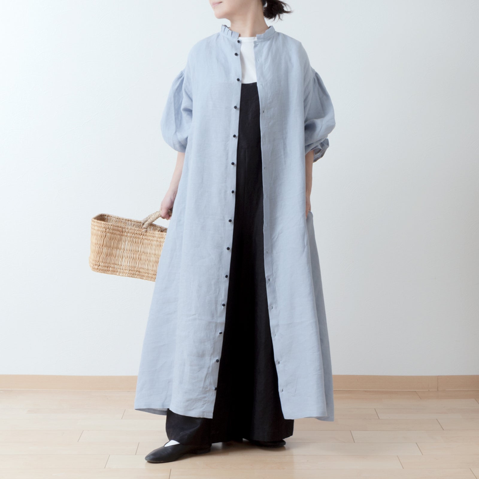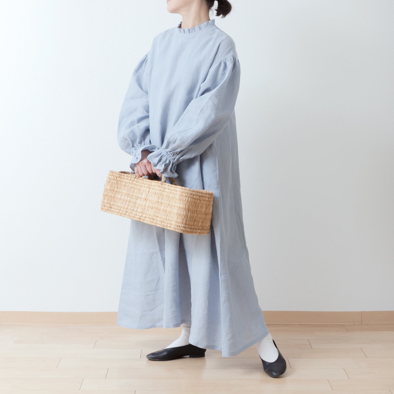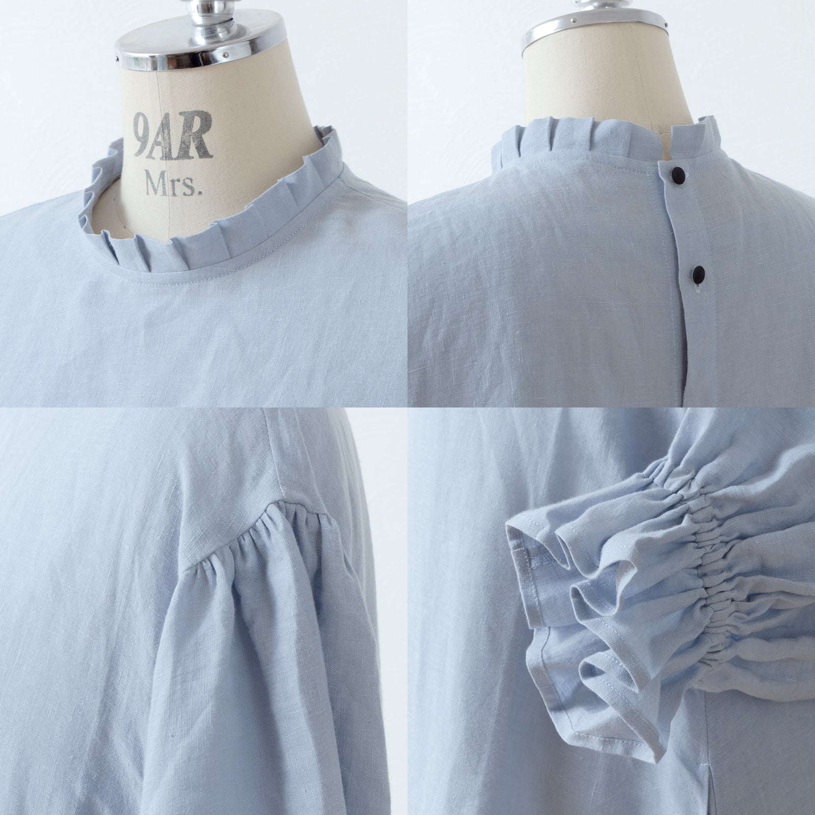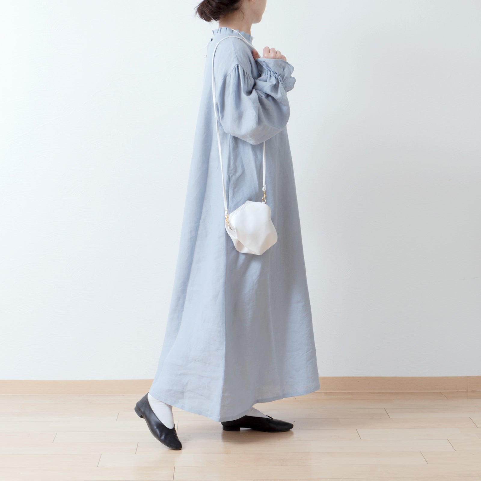 優雅的褶邊領 *非常適合儀式* 背扣褶袖 A 字形亞麻連身裙/淡藍色