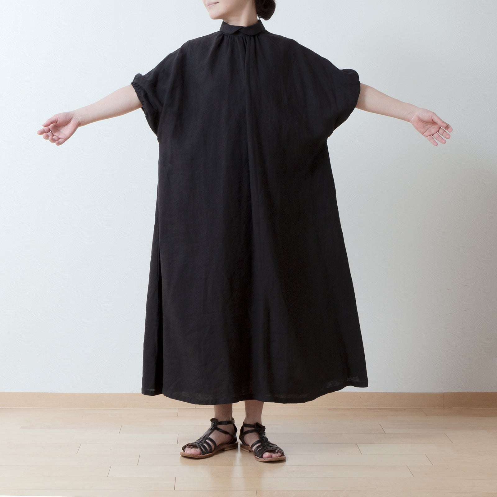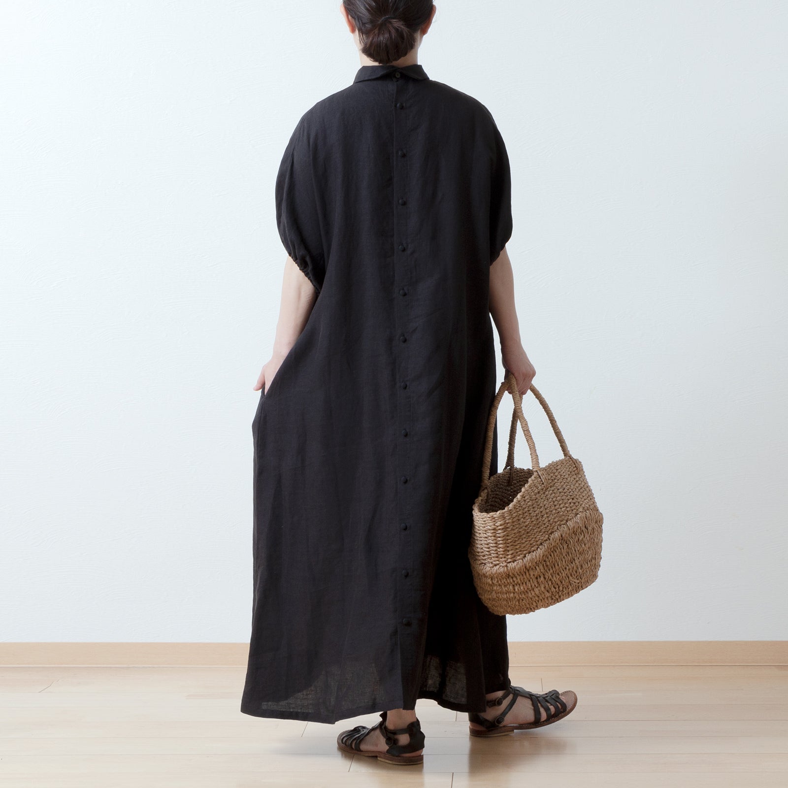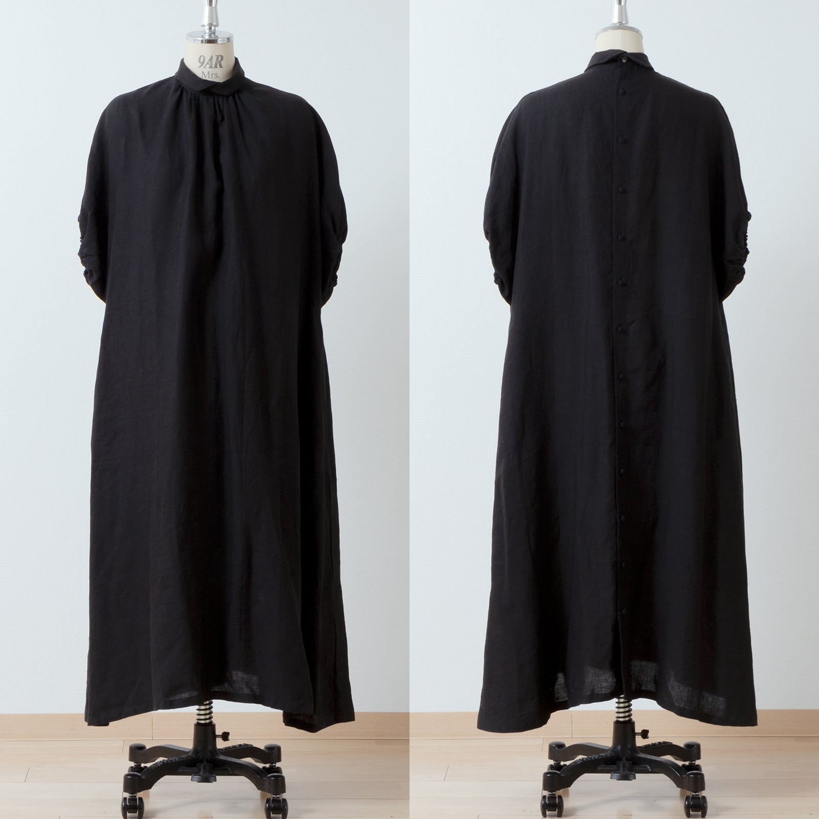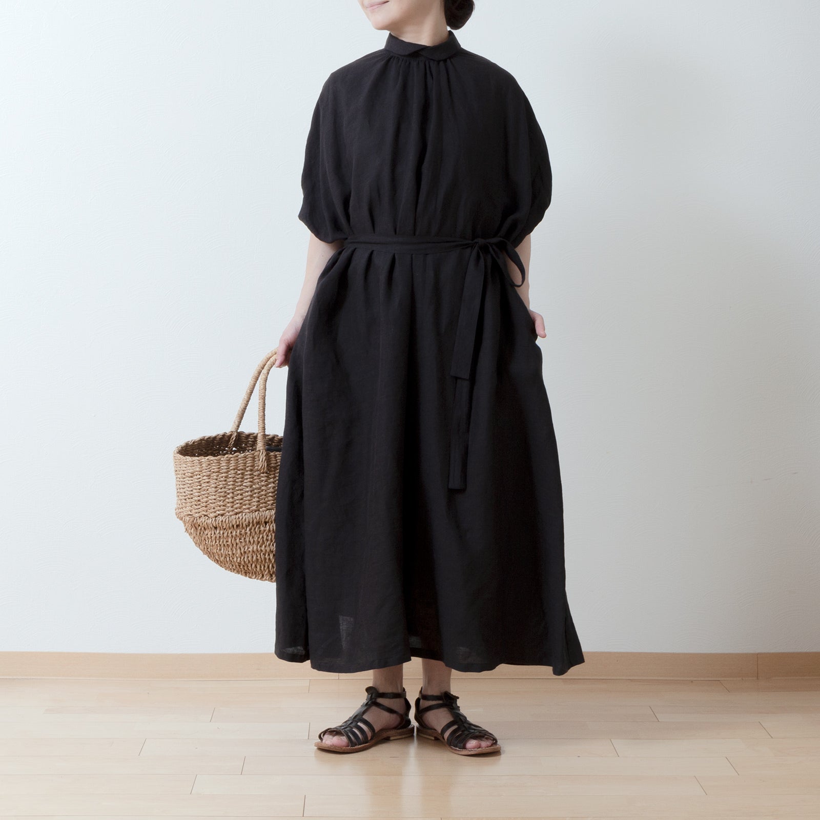 可愛成熟的蓬鬆五分袖法式亞麻A字連身裙,背面有紐帶/黑色