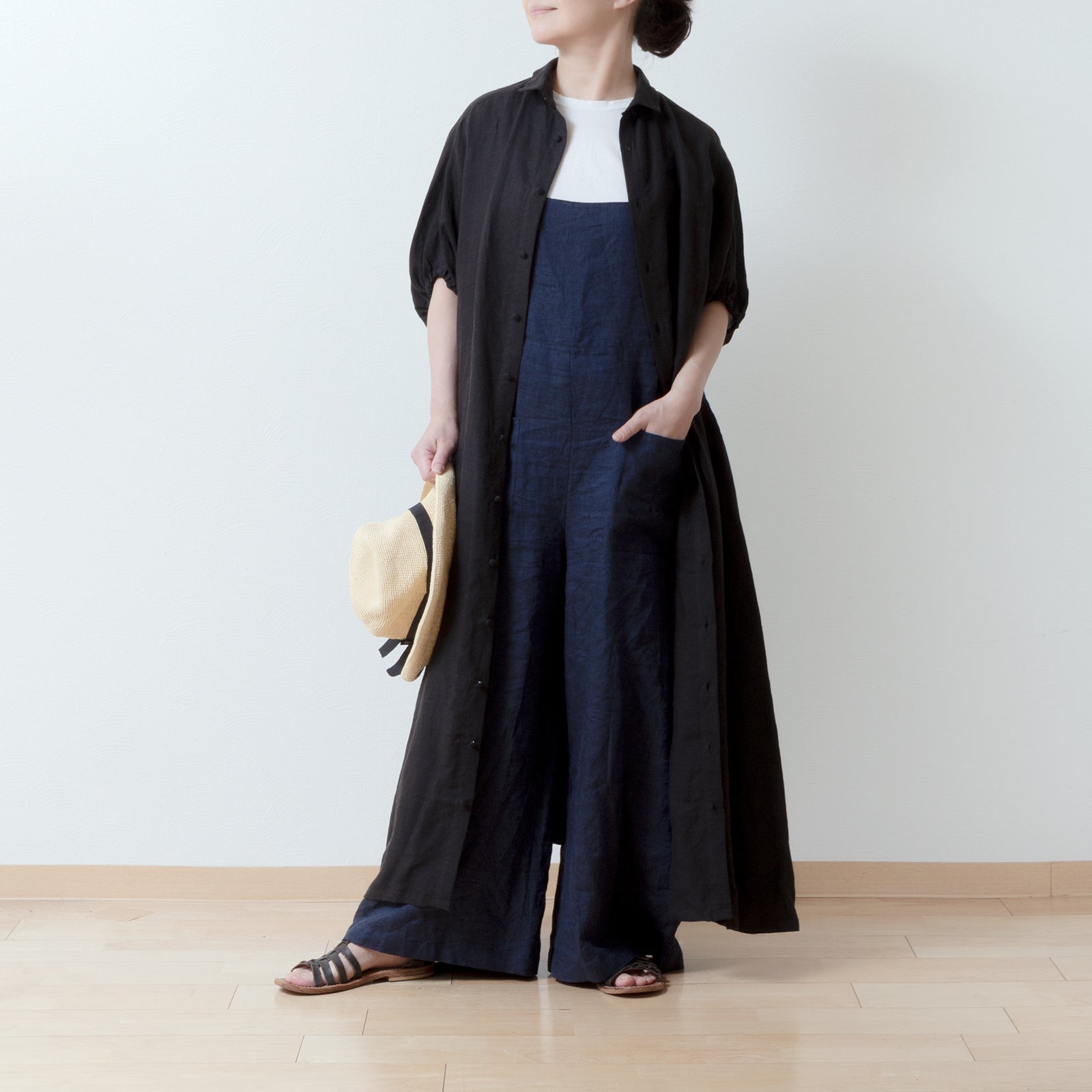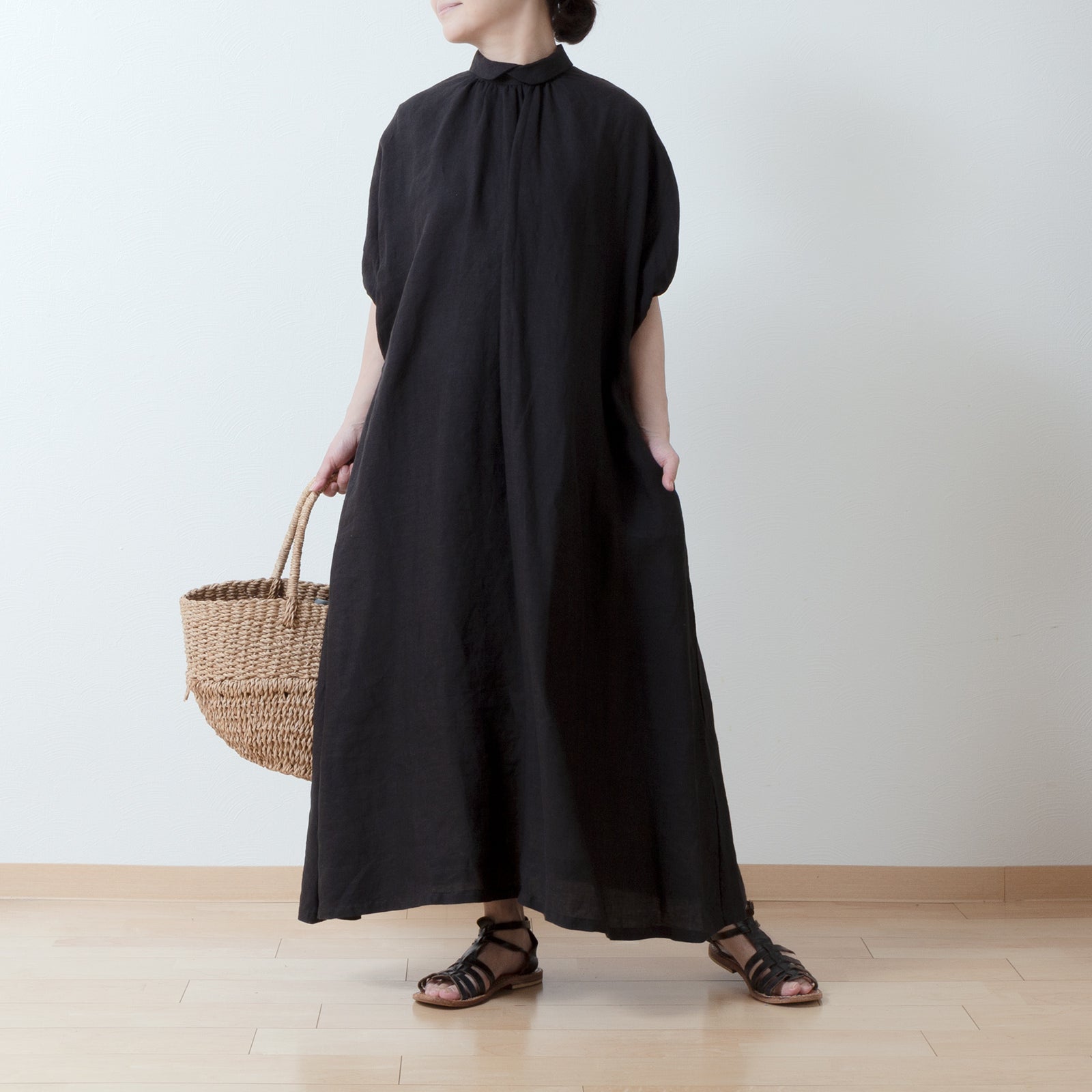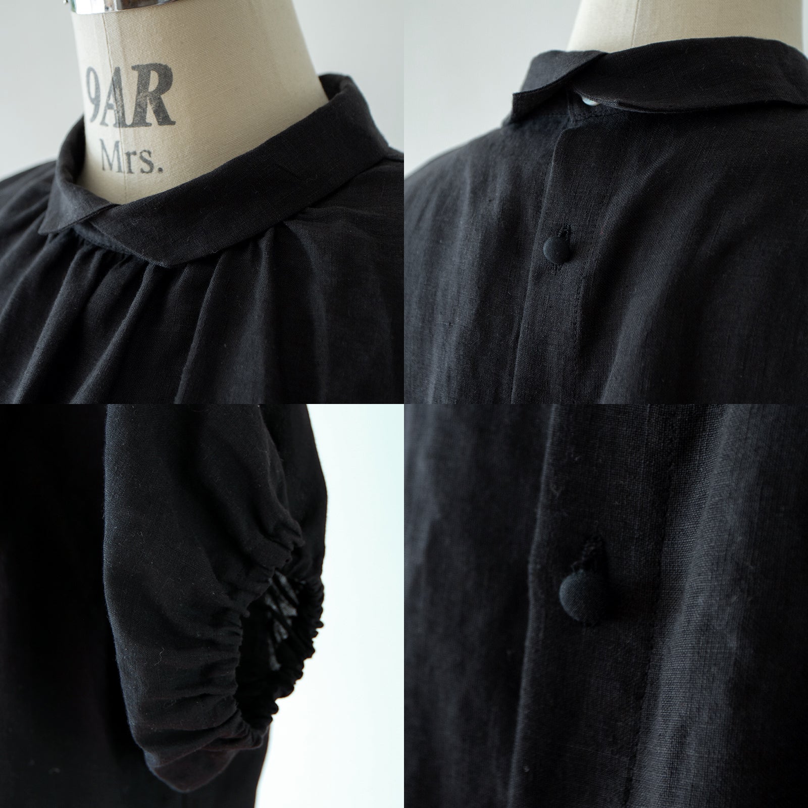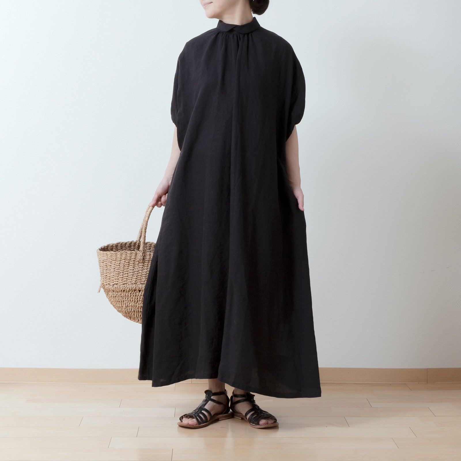 可愛成熟的蓬鬆五分袖法式亞麻A字連身裙,背面有紐帶/黑色