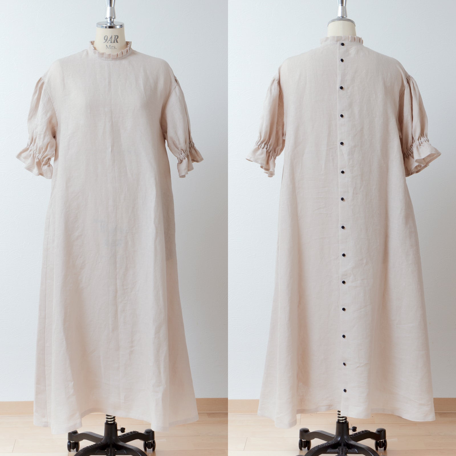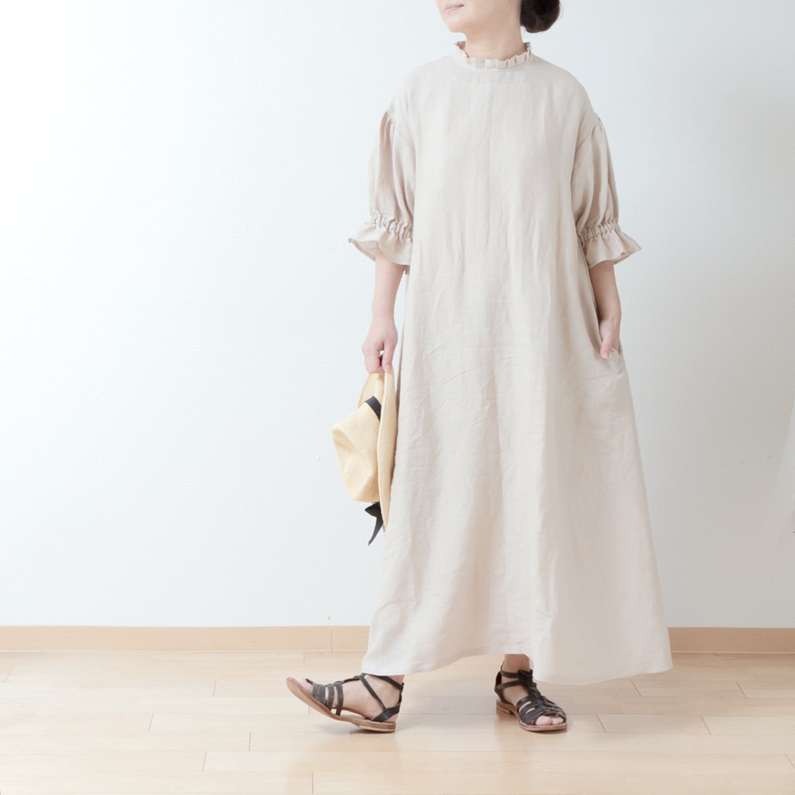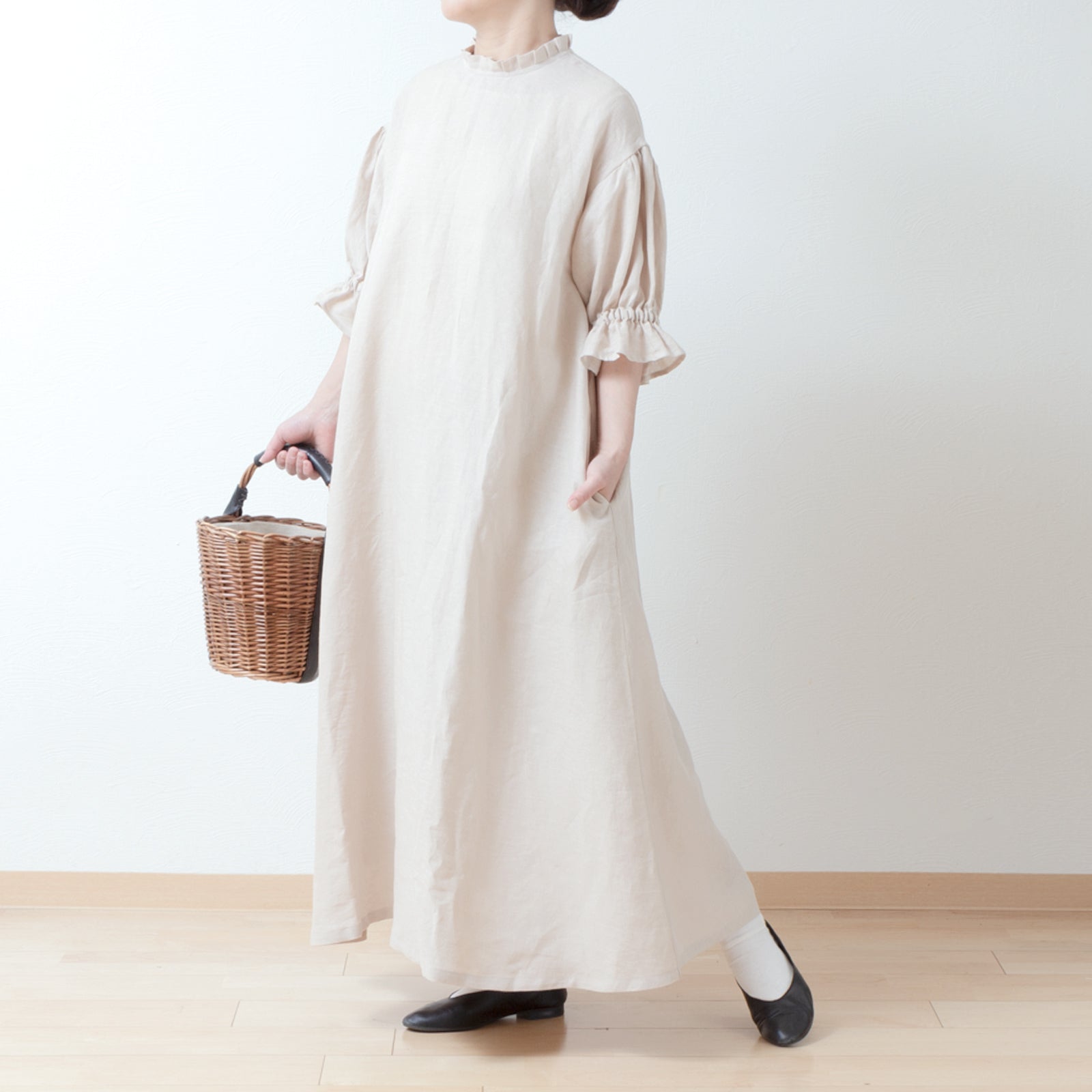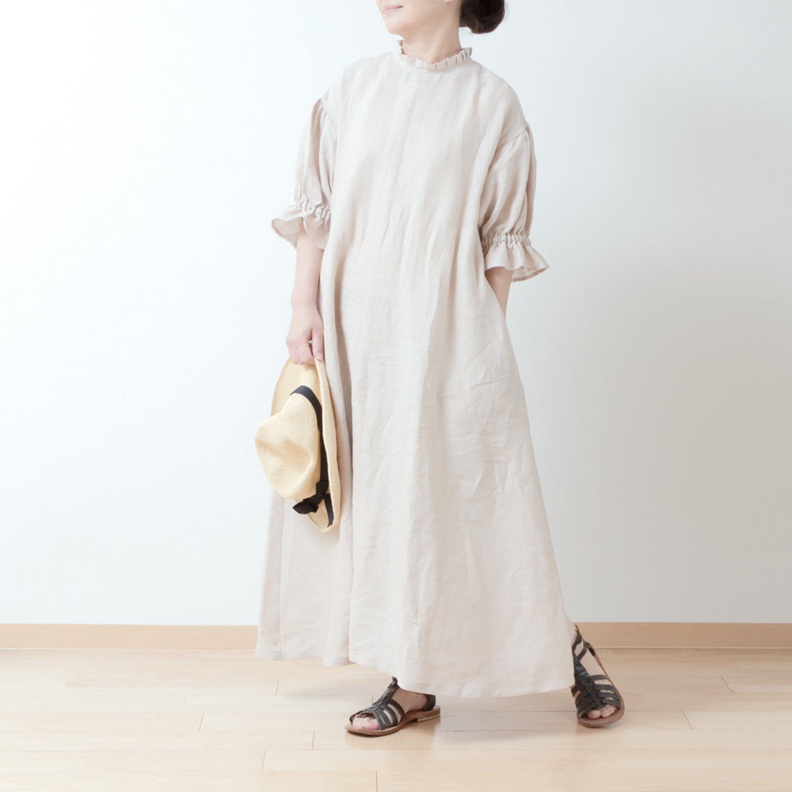 優雅的褶邊領 *非常適合儀式* 背扣褶皺袖 A 字亞麻連身裙 5/8 袖/米色
