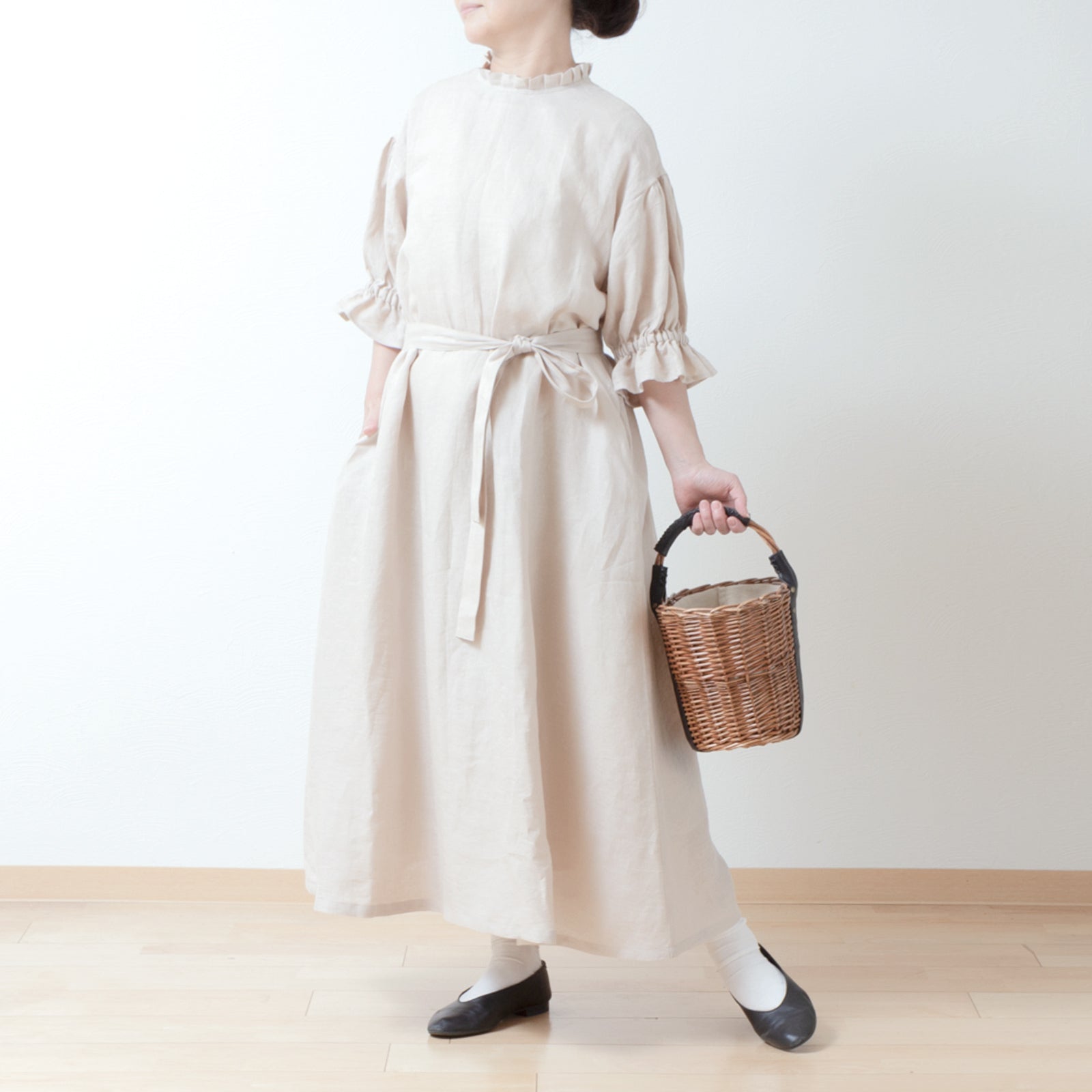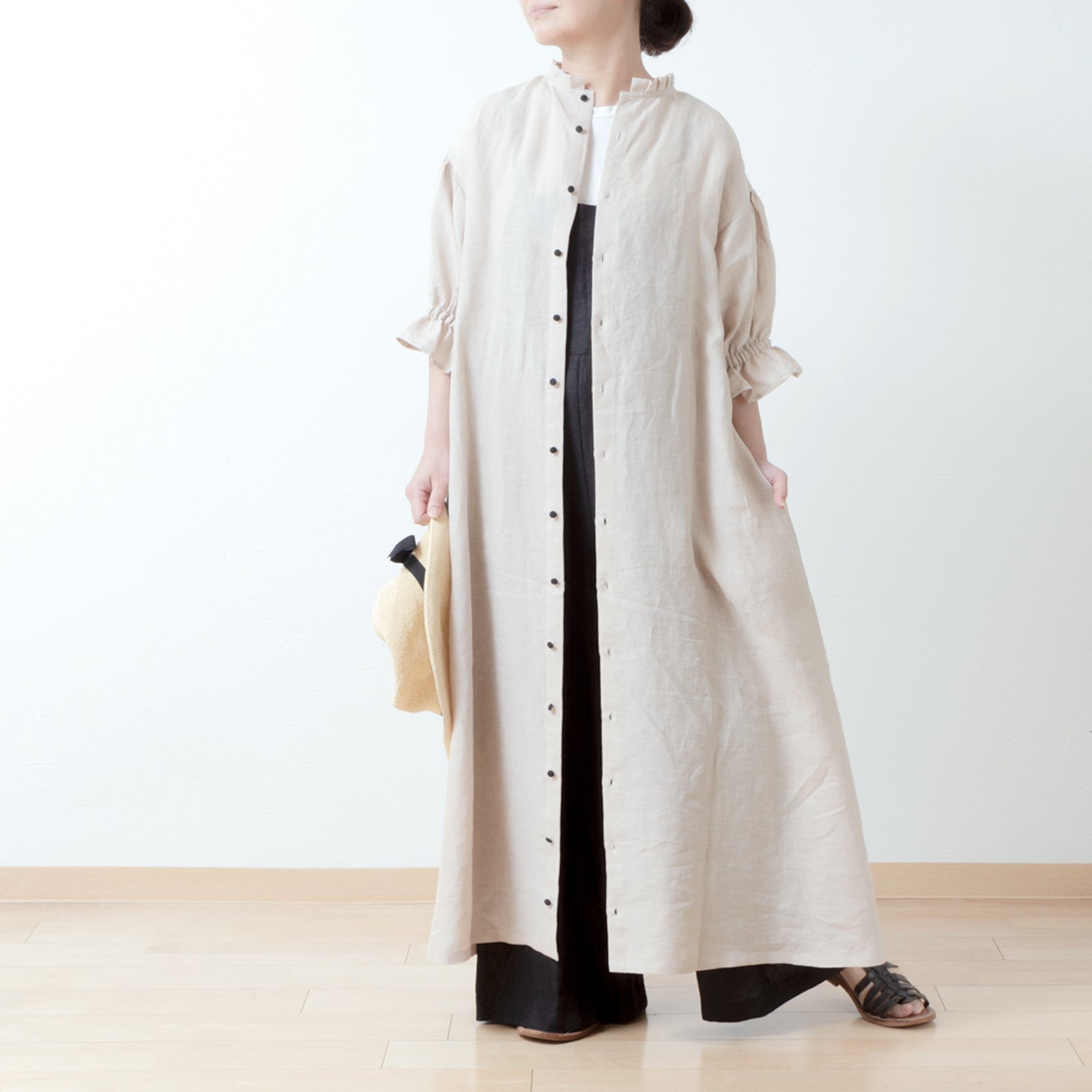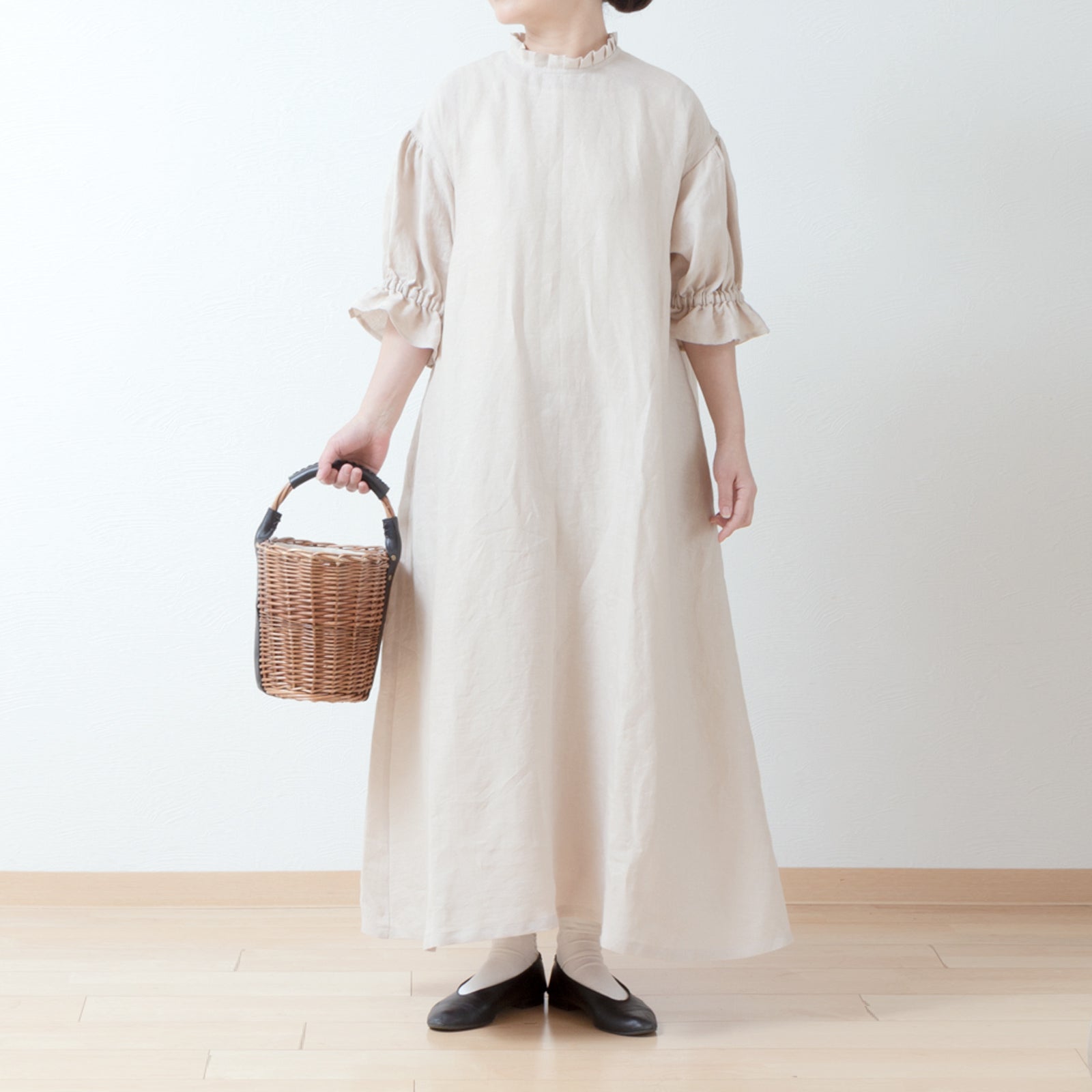 優雅的褶邊領 *非常適合儀式* 背扣褶皺袖 A 字亞麻連身裙 5/8 袖/米色