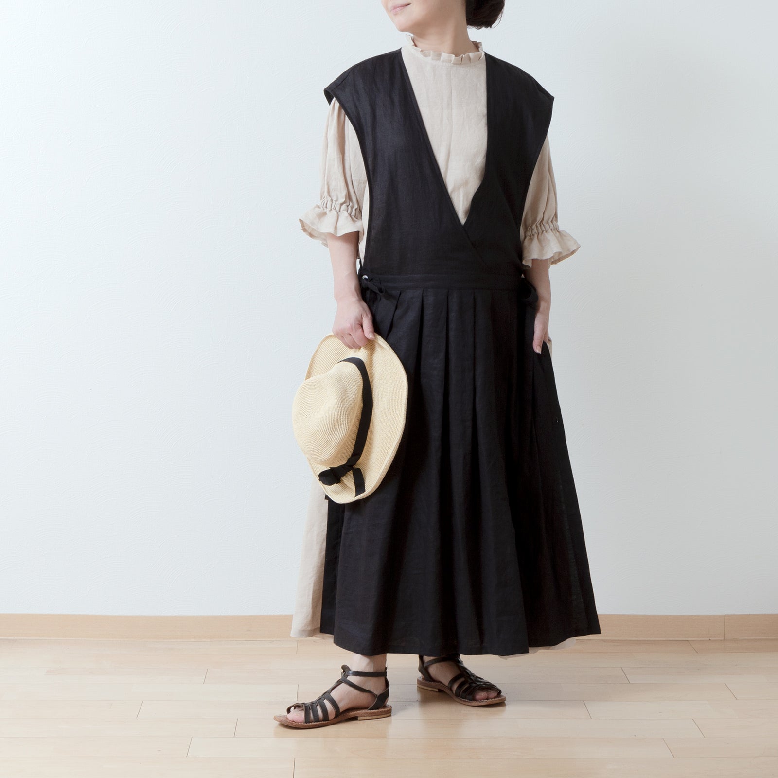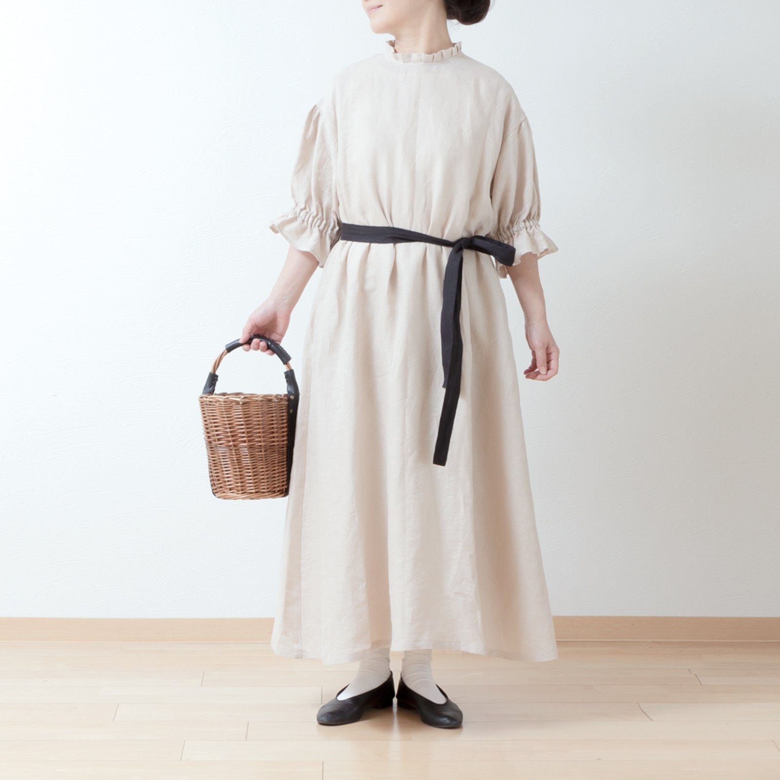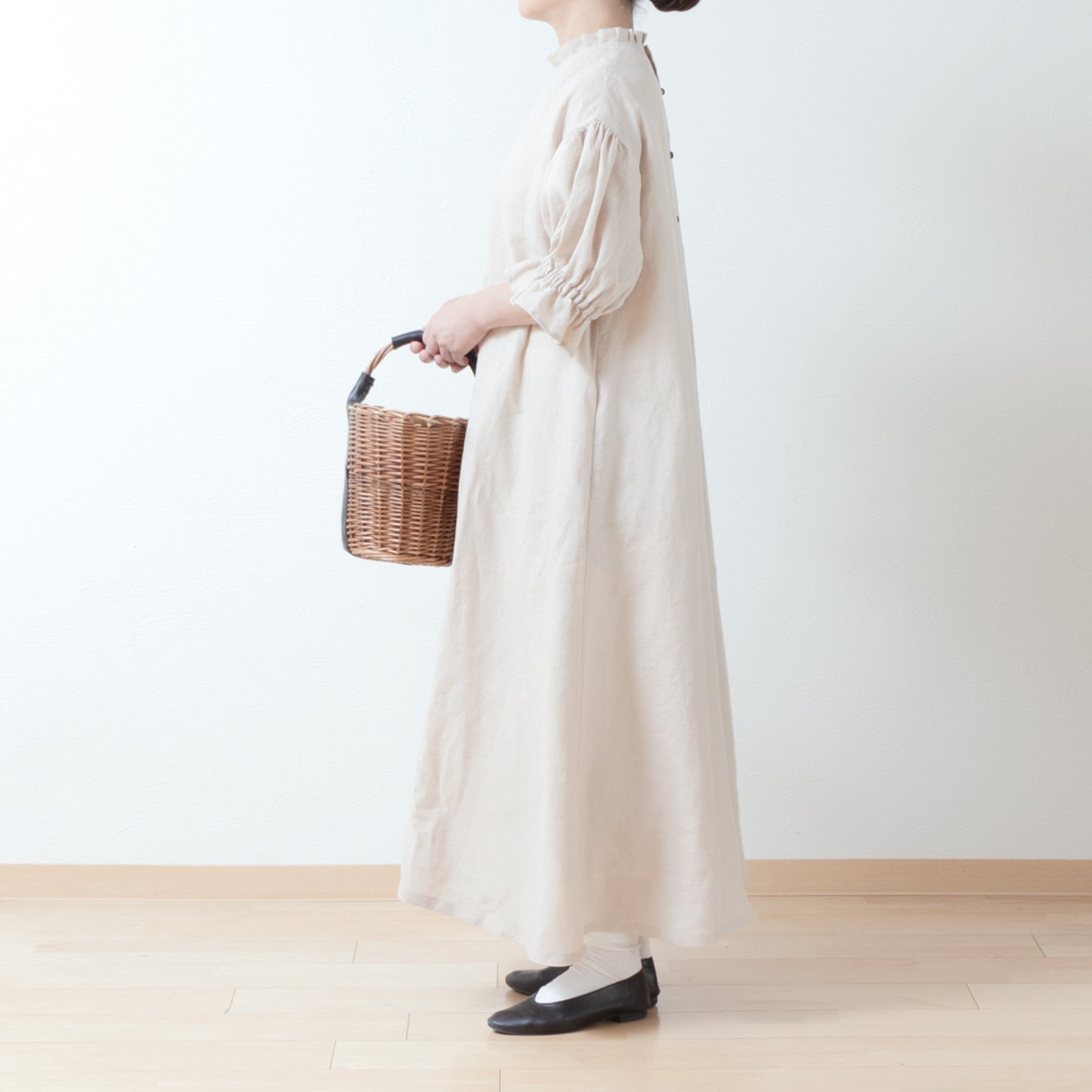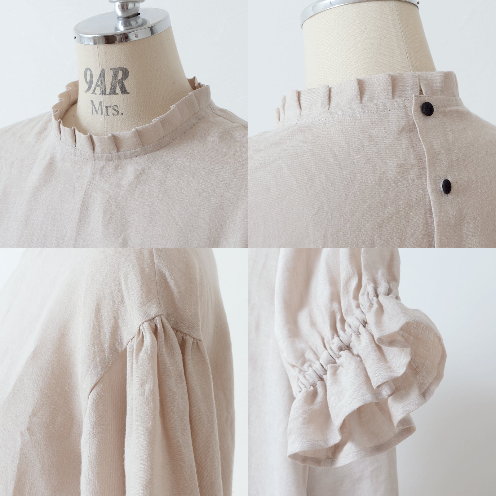 優雅的褶邊領 *非常適合儀式* 背扣褶皺袖 A 字亞麻連身裙 5/8 袖/米色