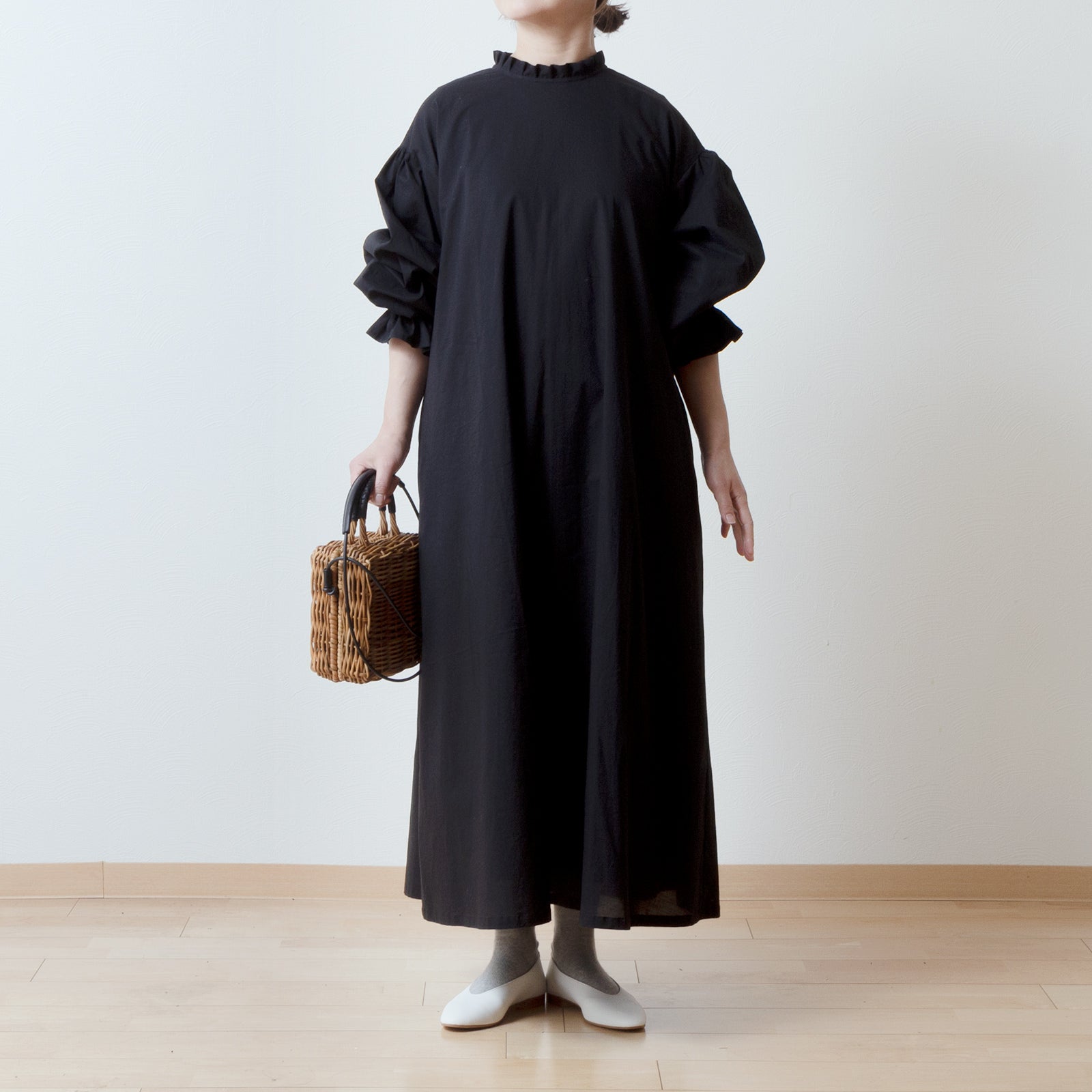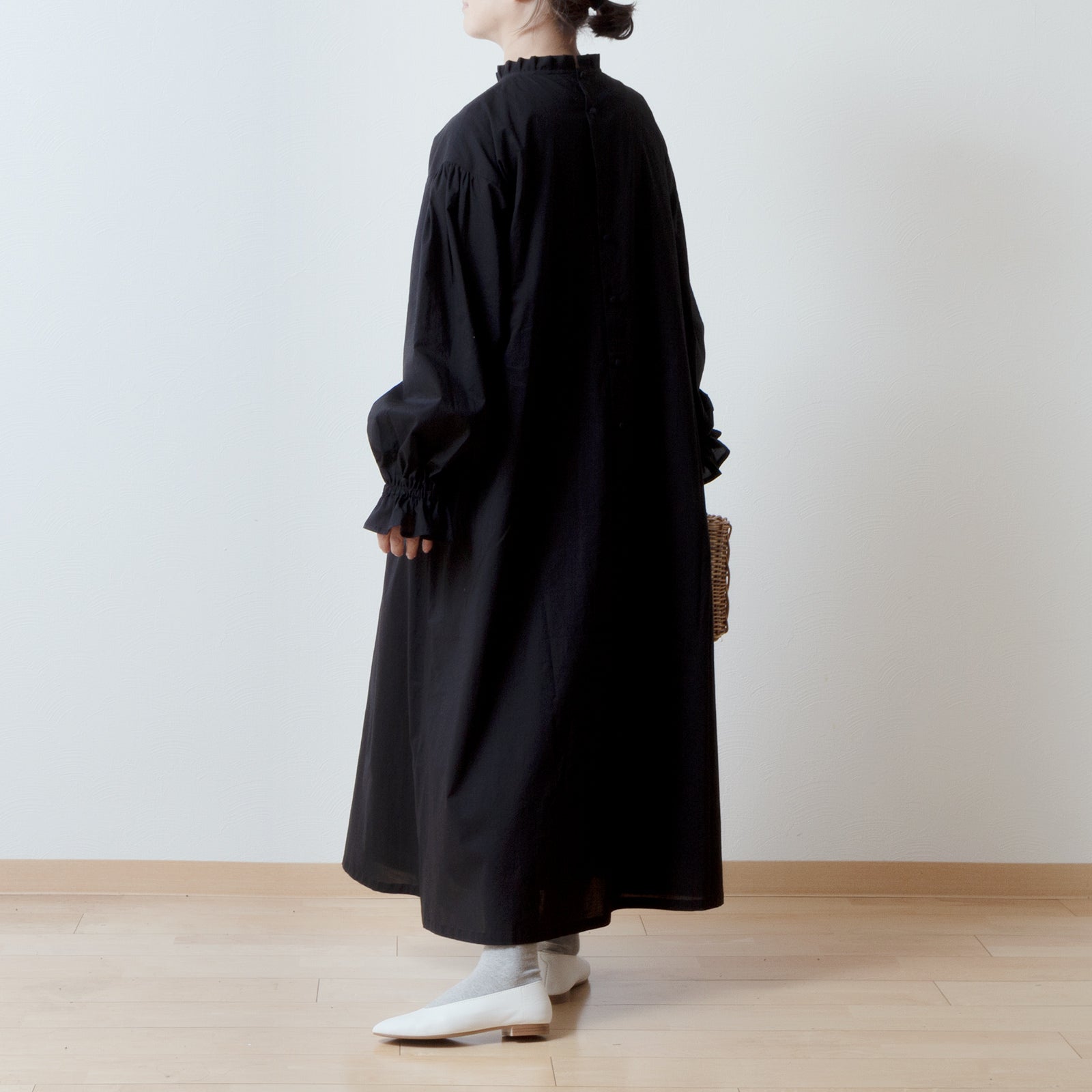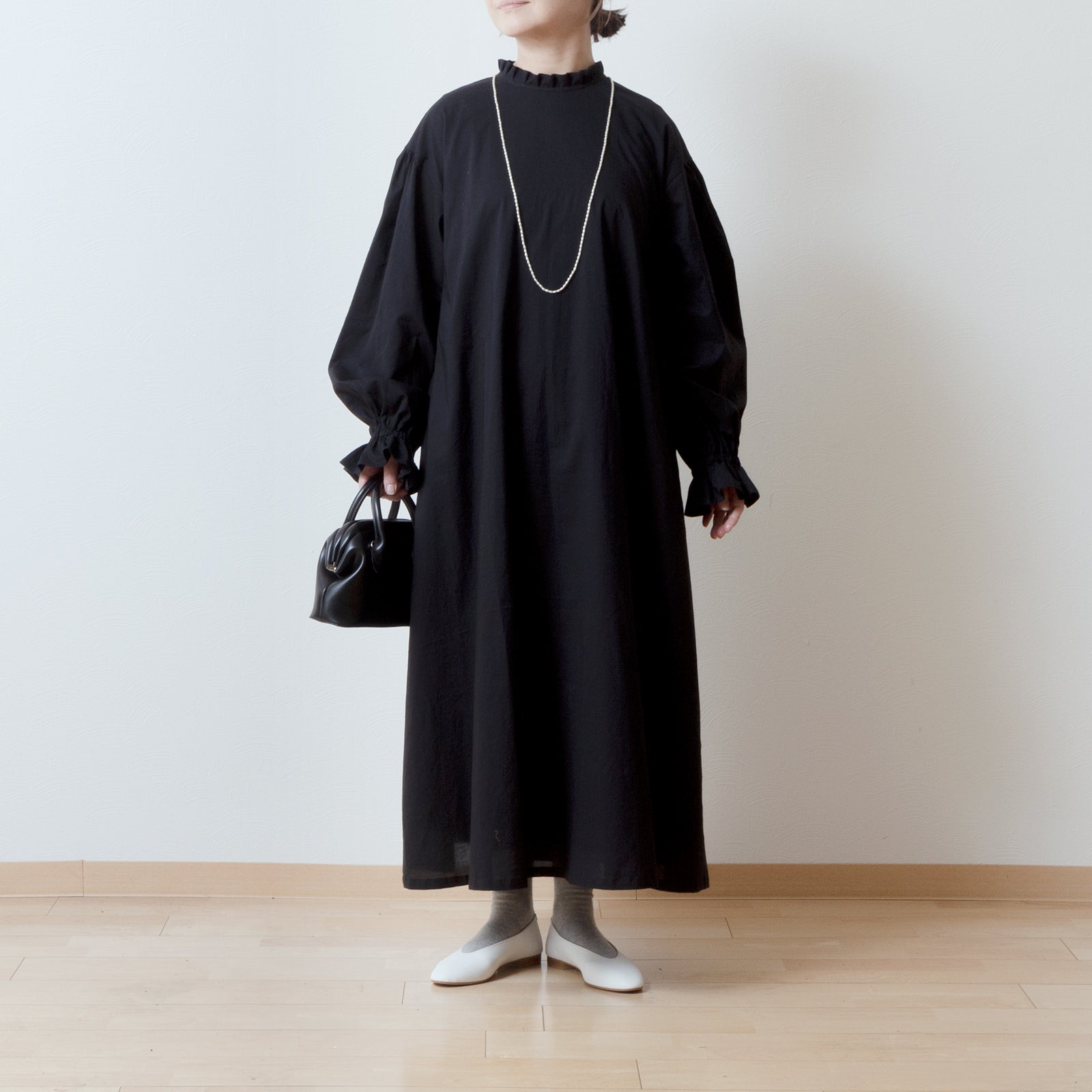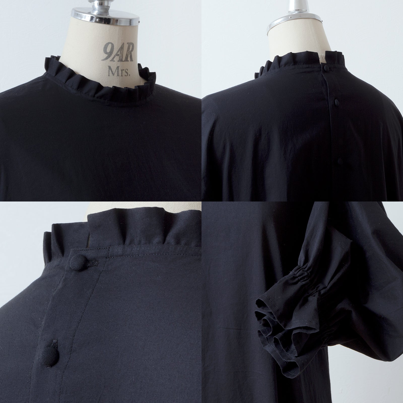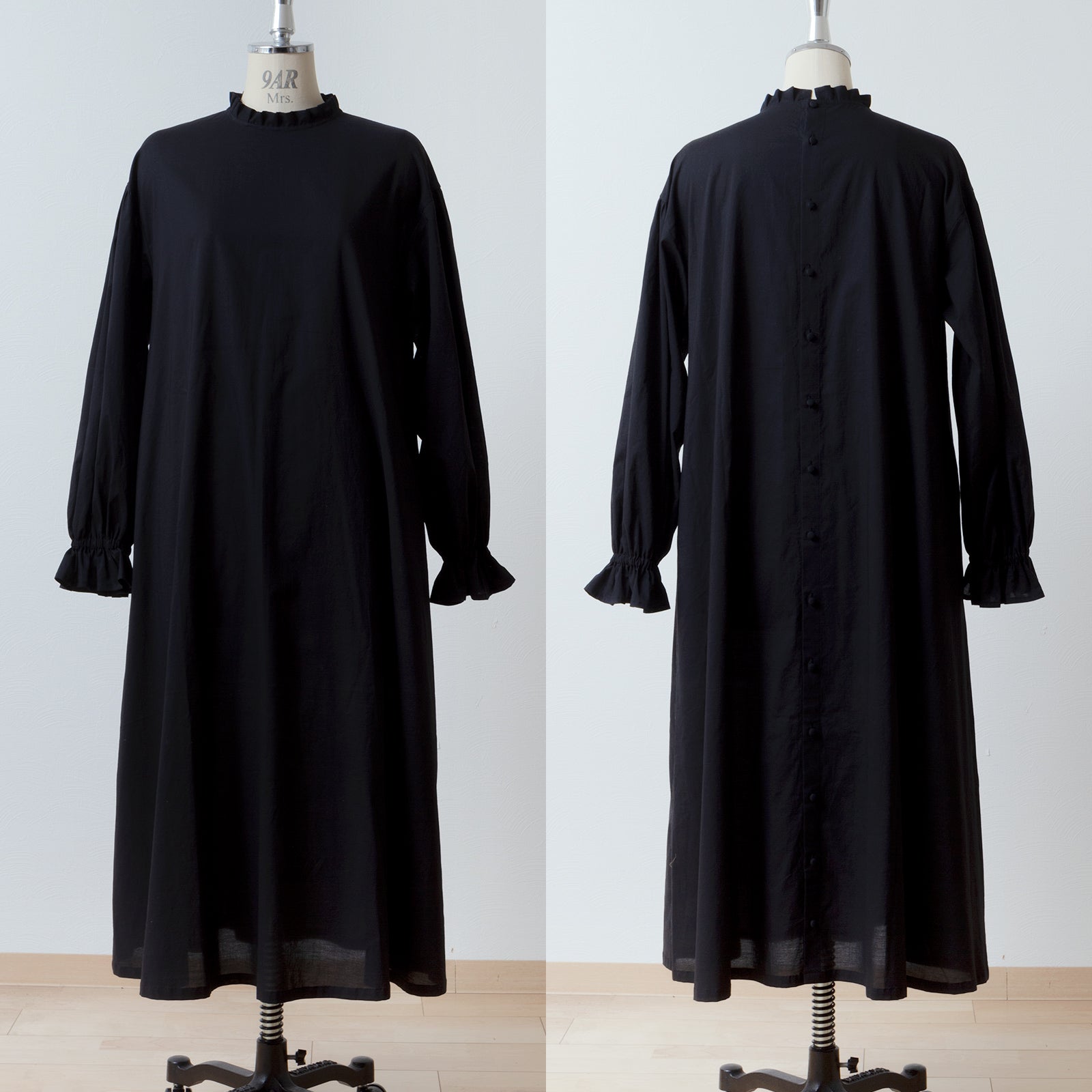 優雅的褶邊領 *非常適合儀式* 背扣褶皺袖 A 字型棉質連身裙/黑色