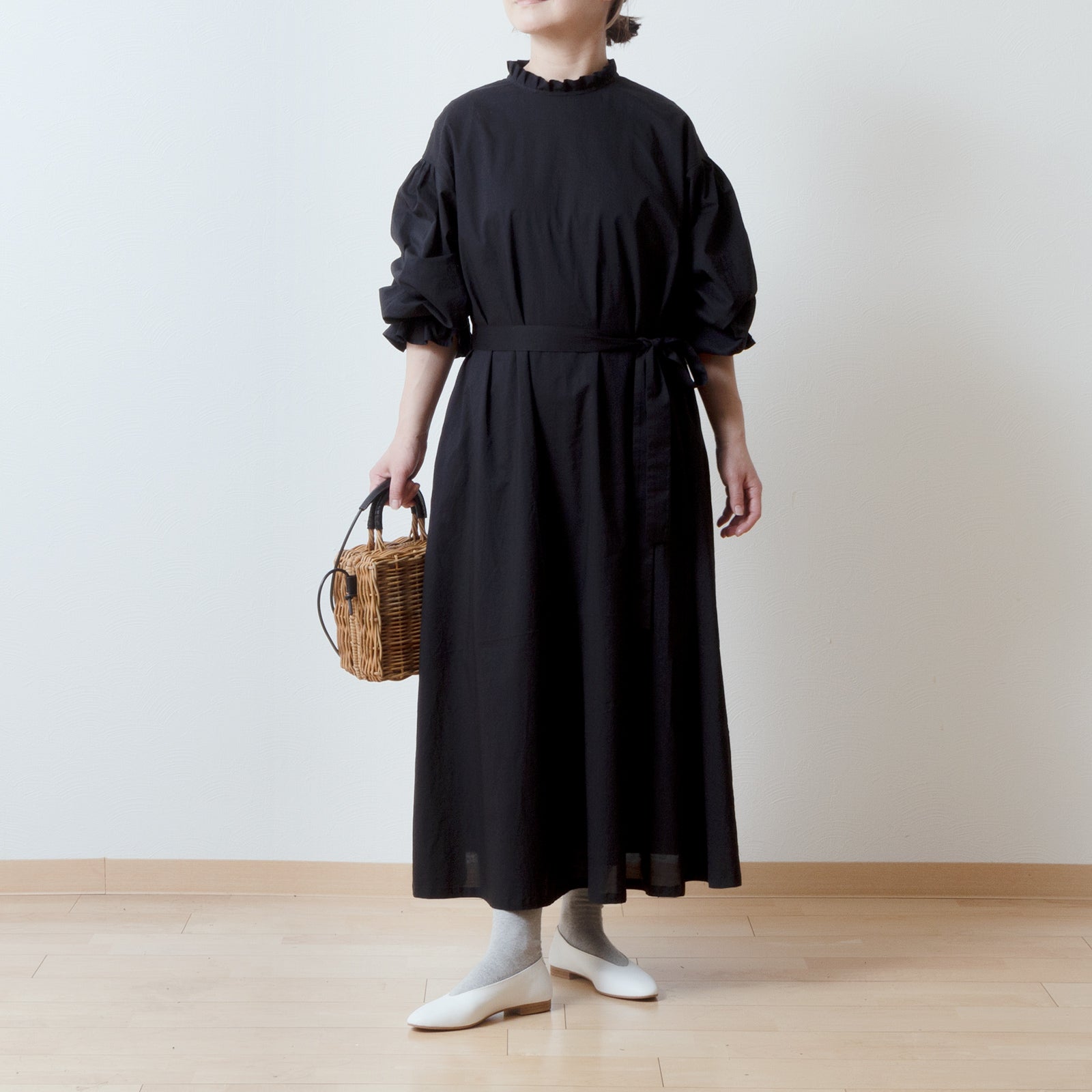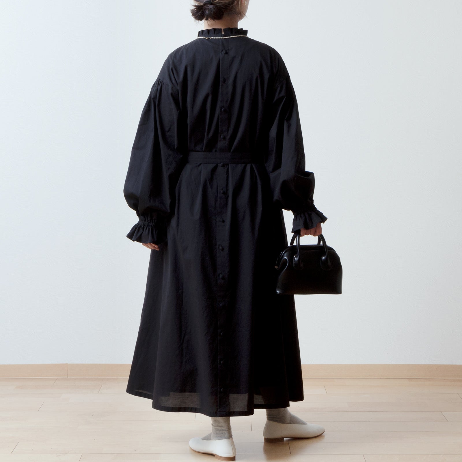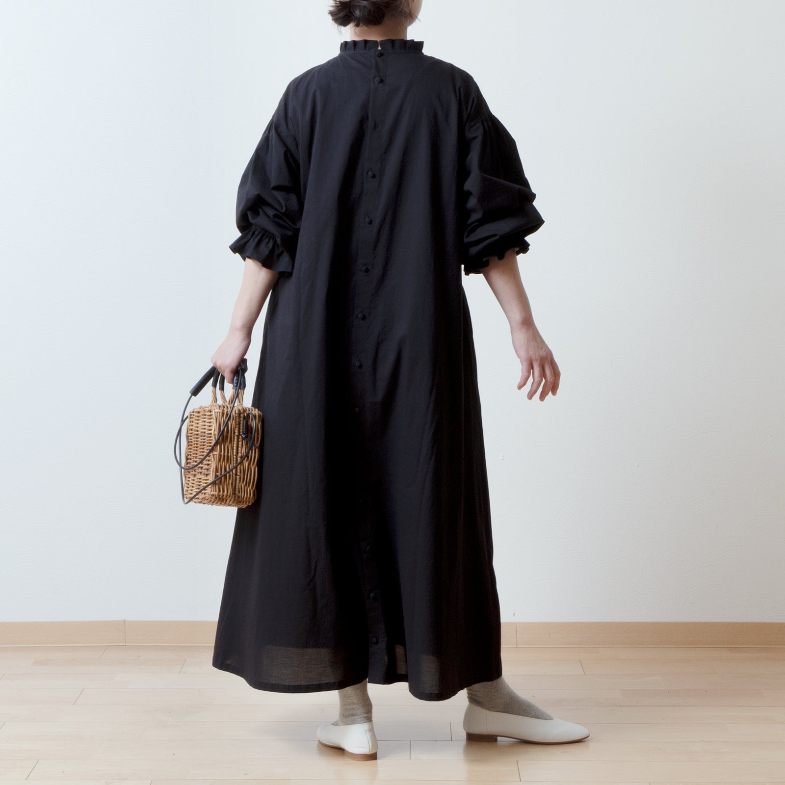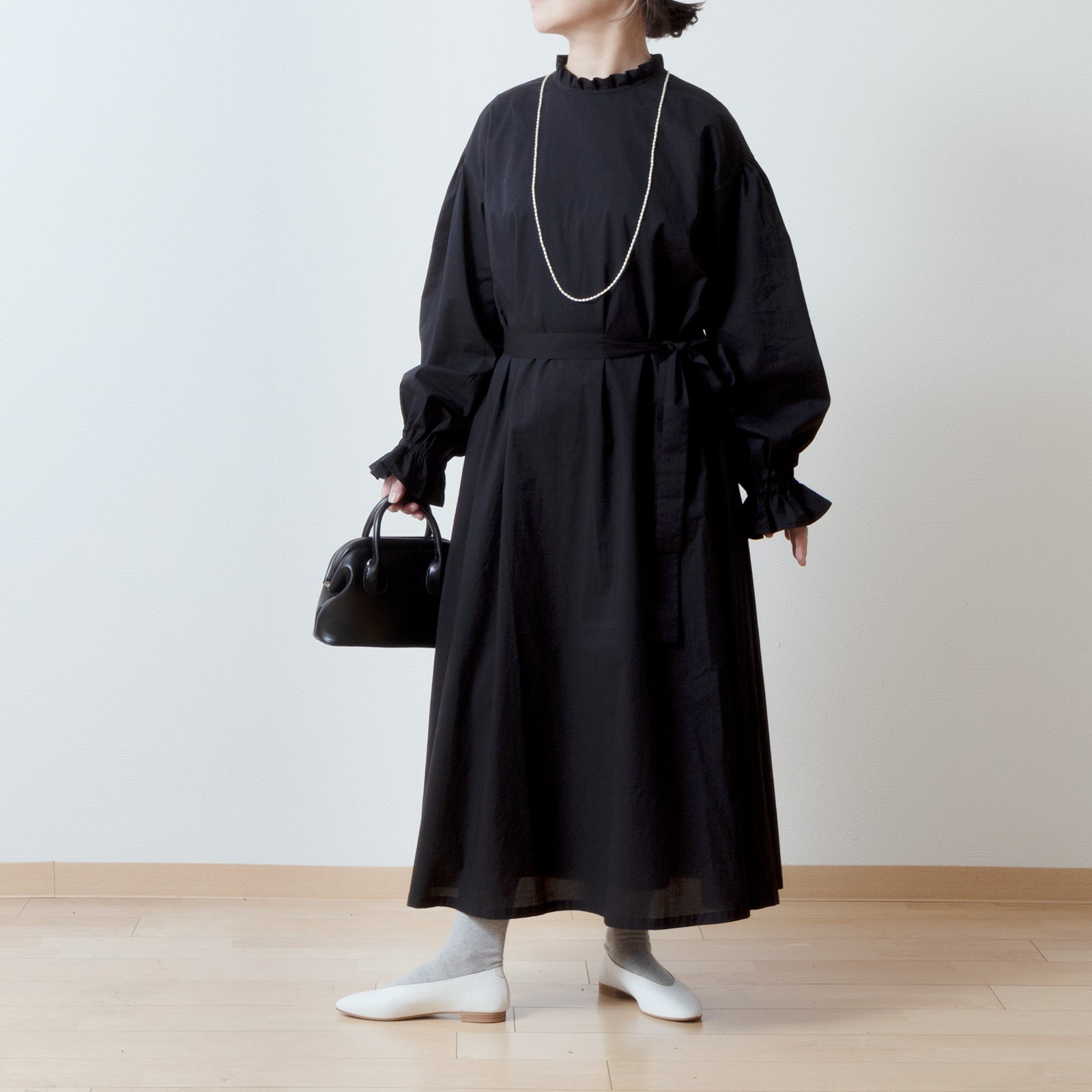 優雅的褶邊領 *非常適合儀式* 背扣褶皺袖 A 字型棉質連身裙/黑色
