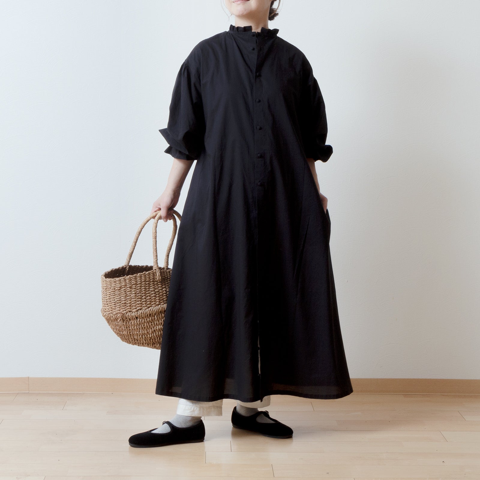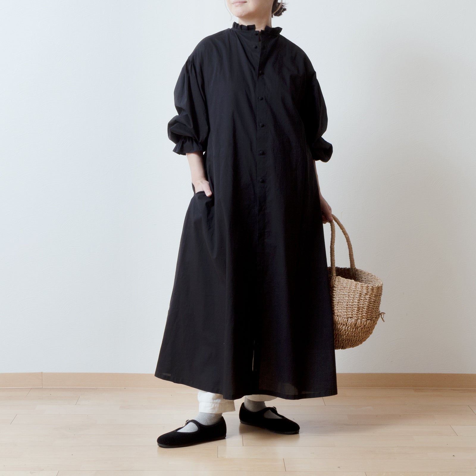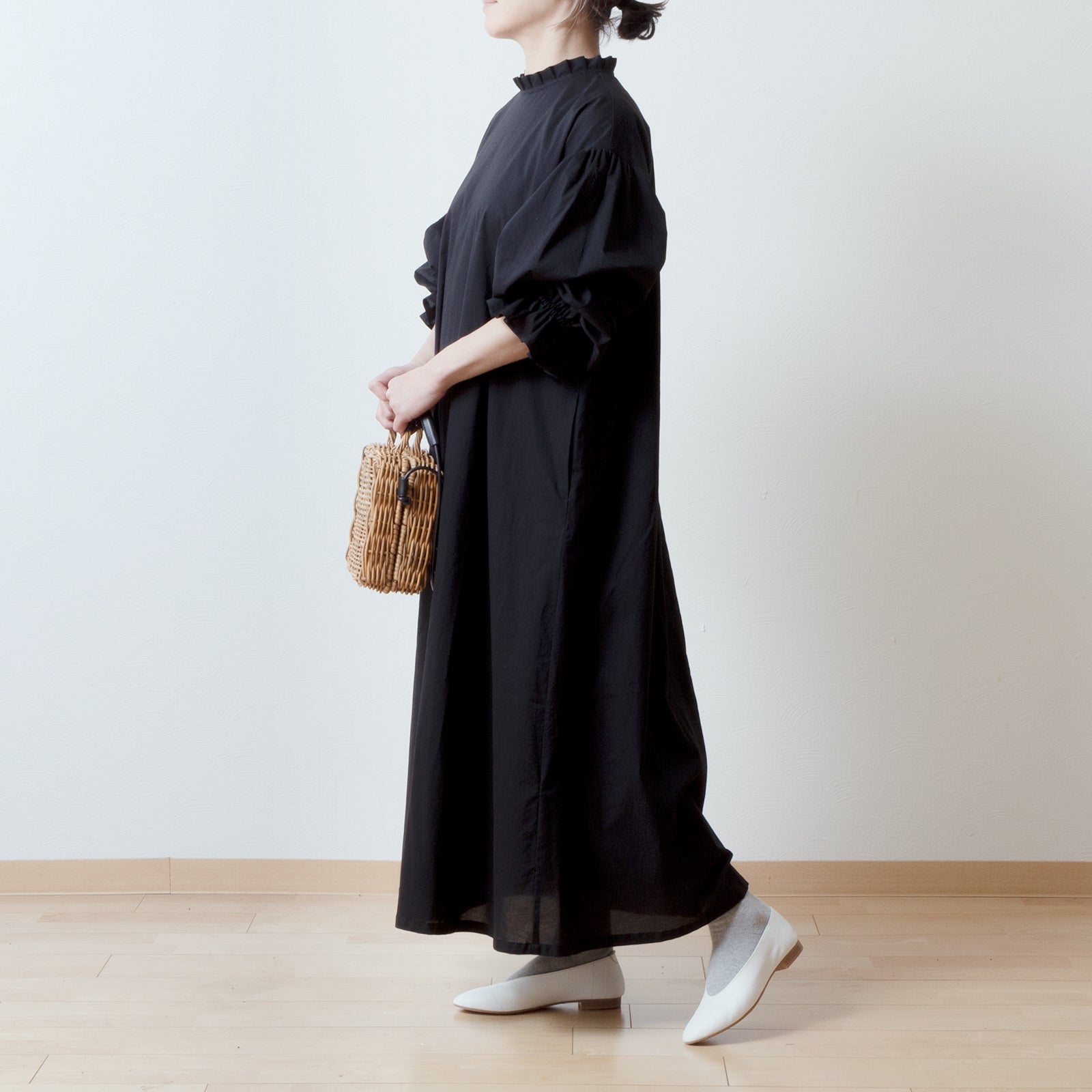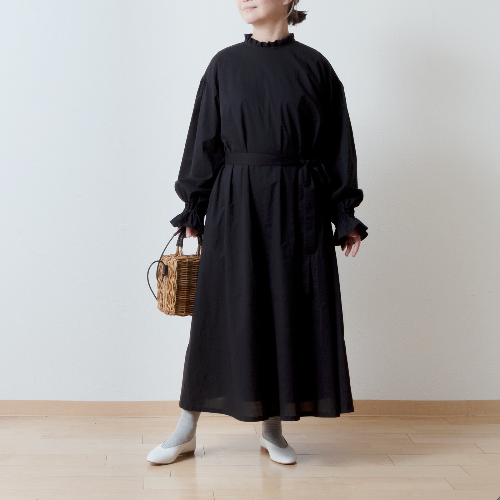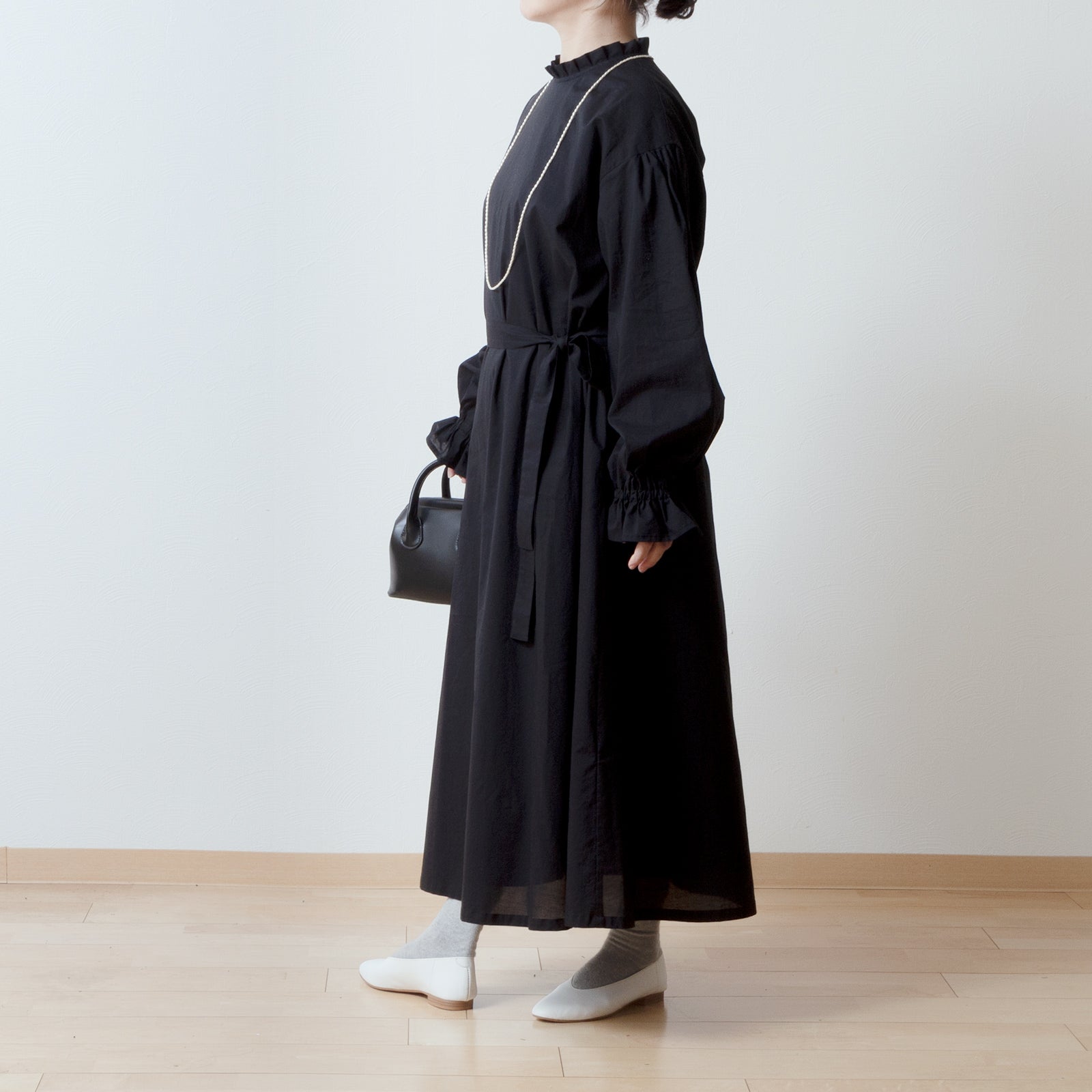 優雅的褶邊領 *非常適合儀式* 背扣褶皺袖 A 字型棉質連身裙/黑色