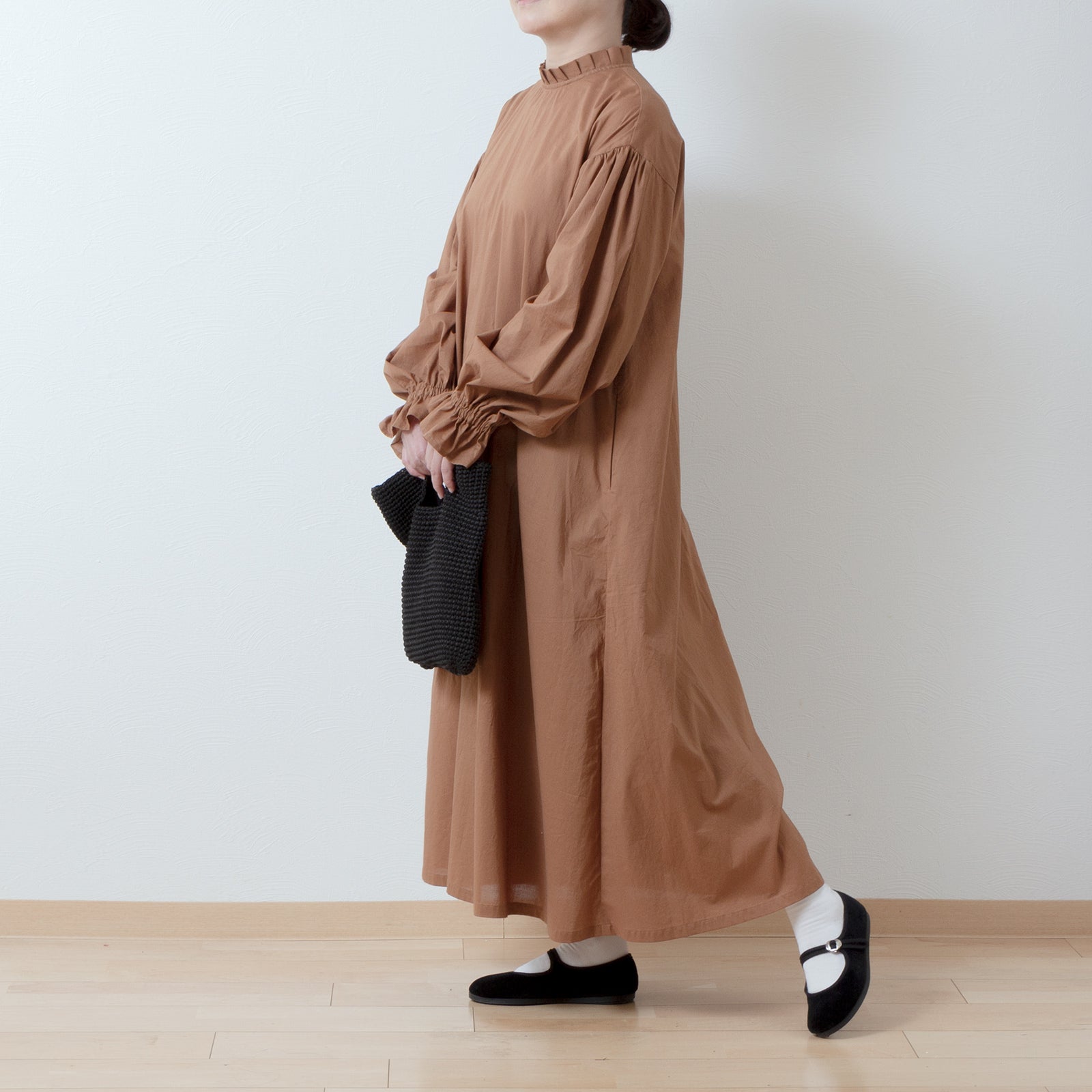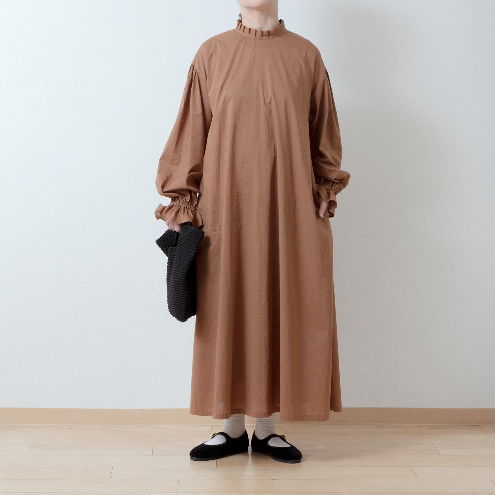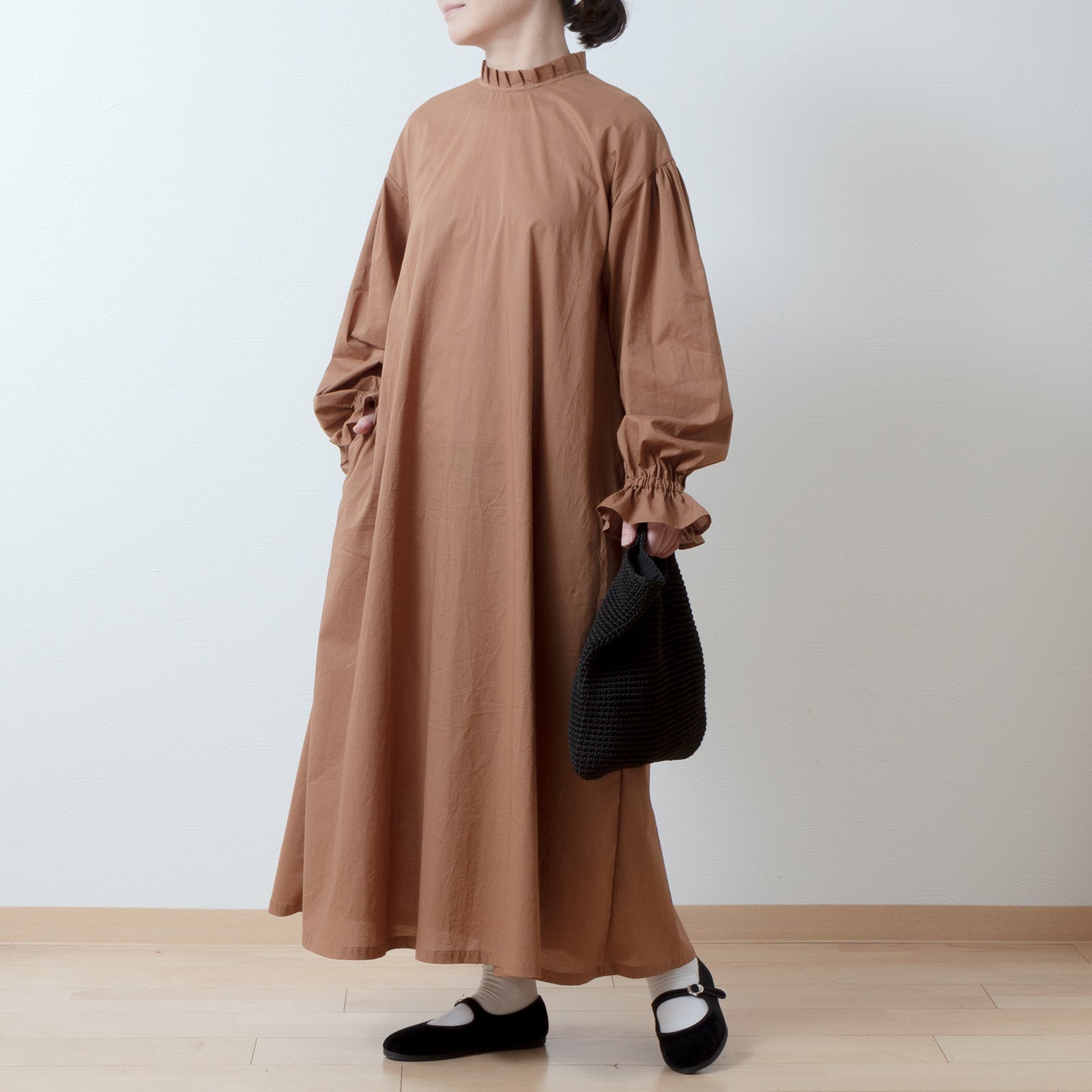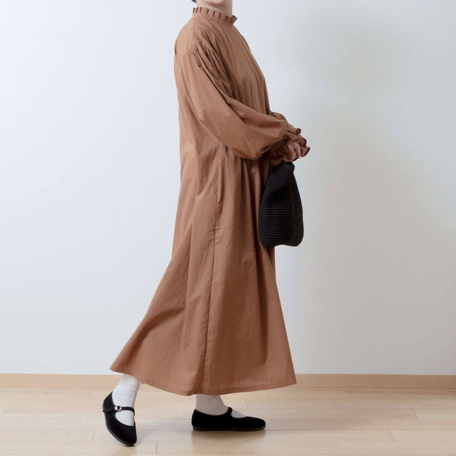 優雅的褶邊領 *非常適合儀式* 背扣褶皺袖 A 字形棉質連身裙/駝色