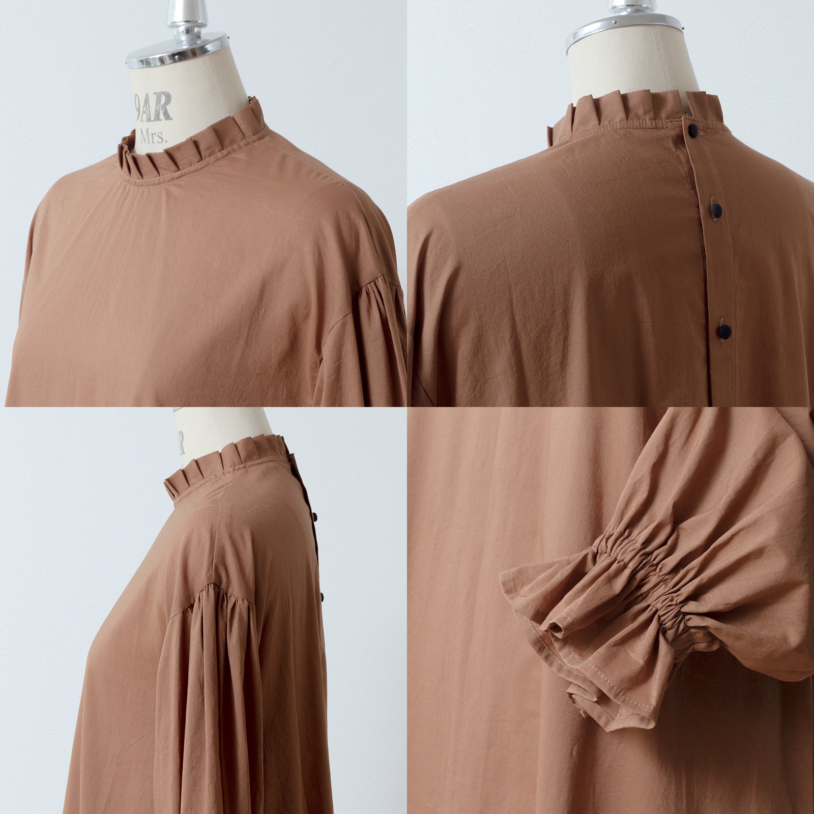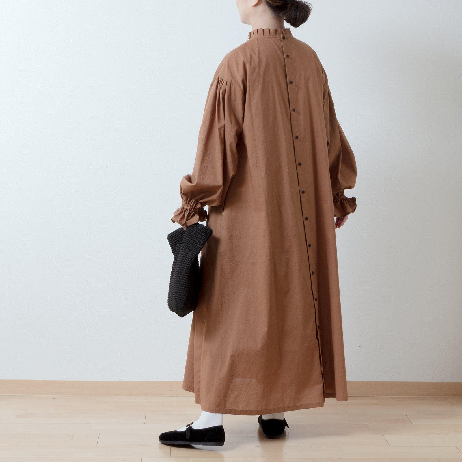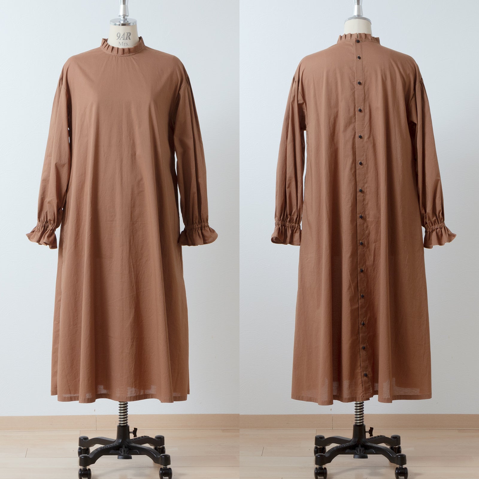 優雅的褶邊領 *非常適合儀式* 背扣褶皺袖 A 字形棉質連身裙/駝色
