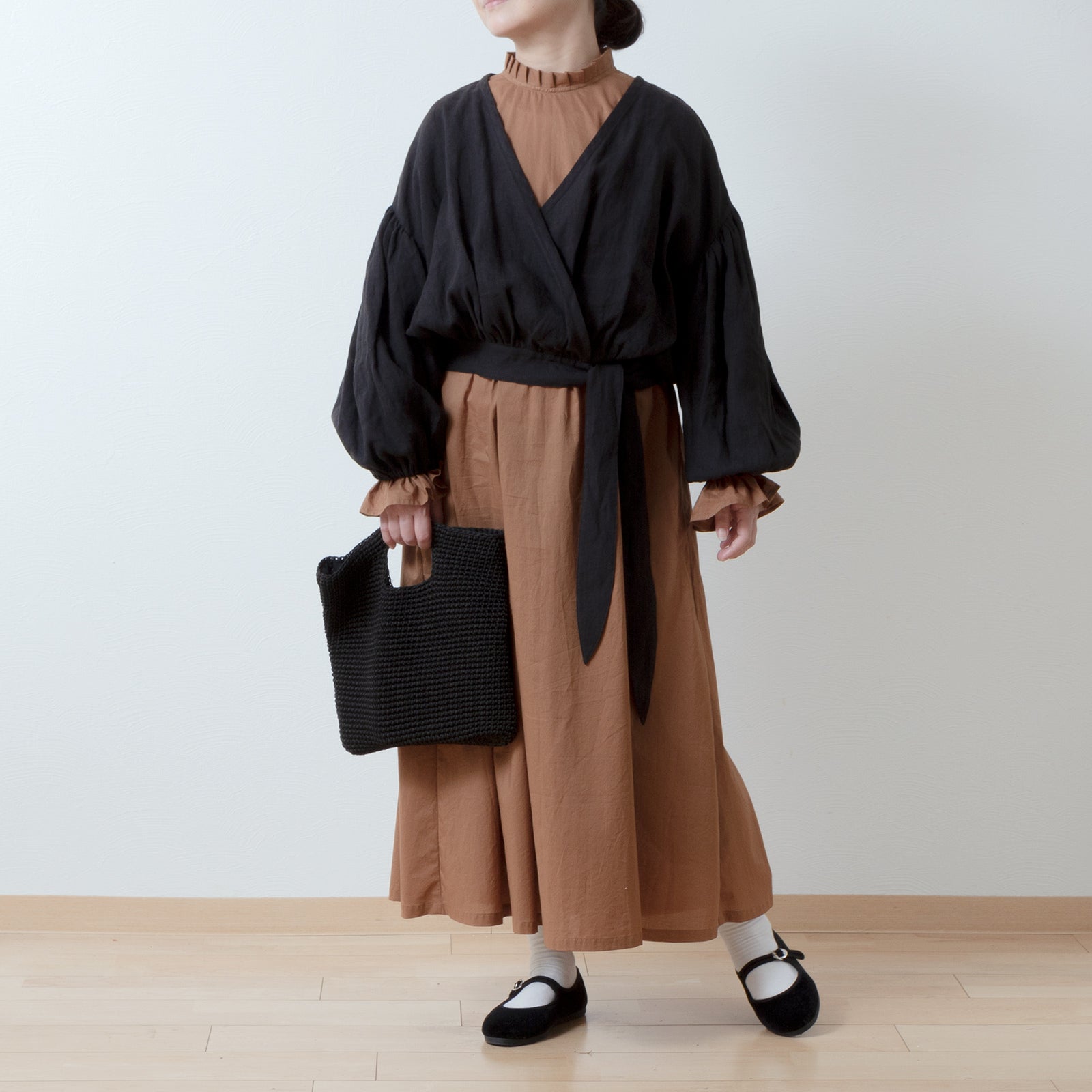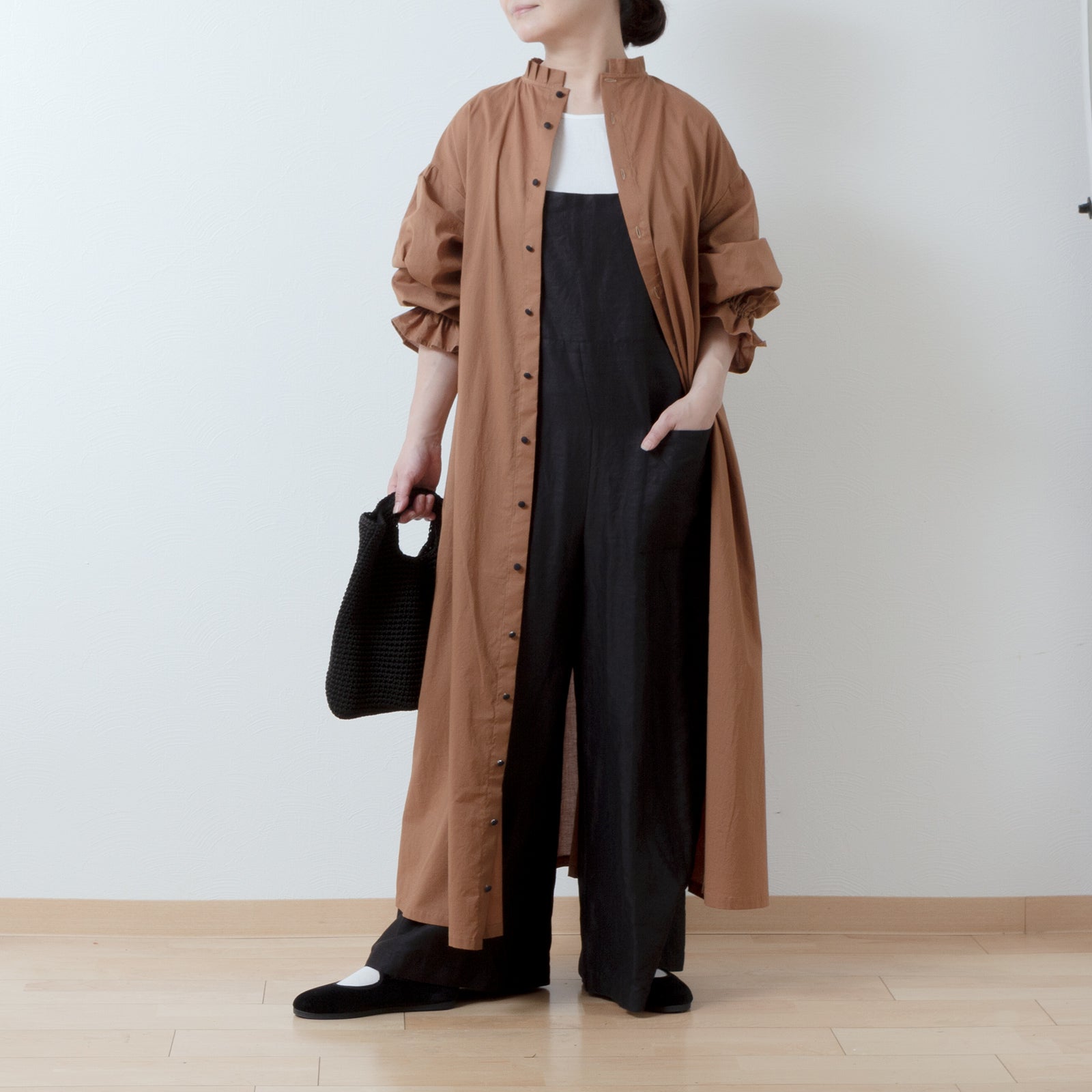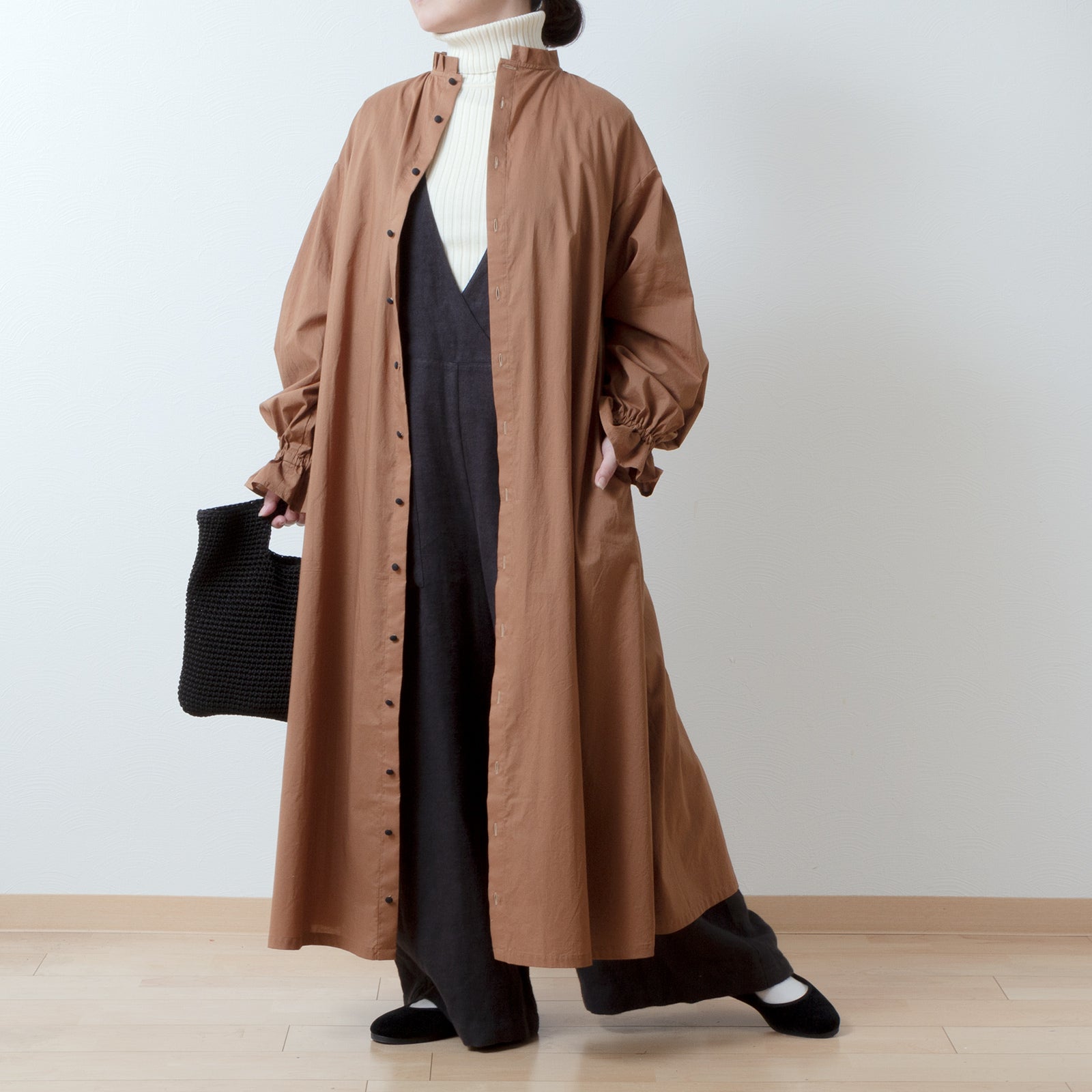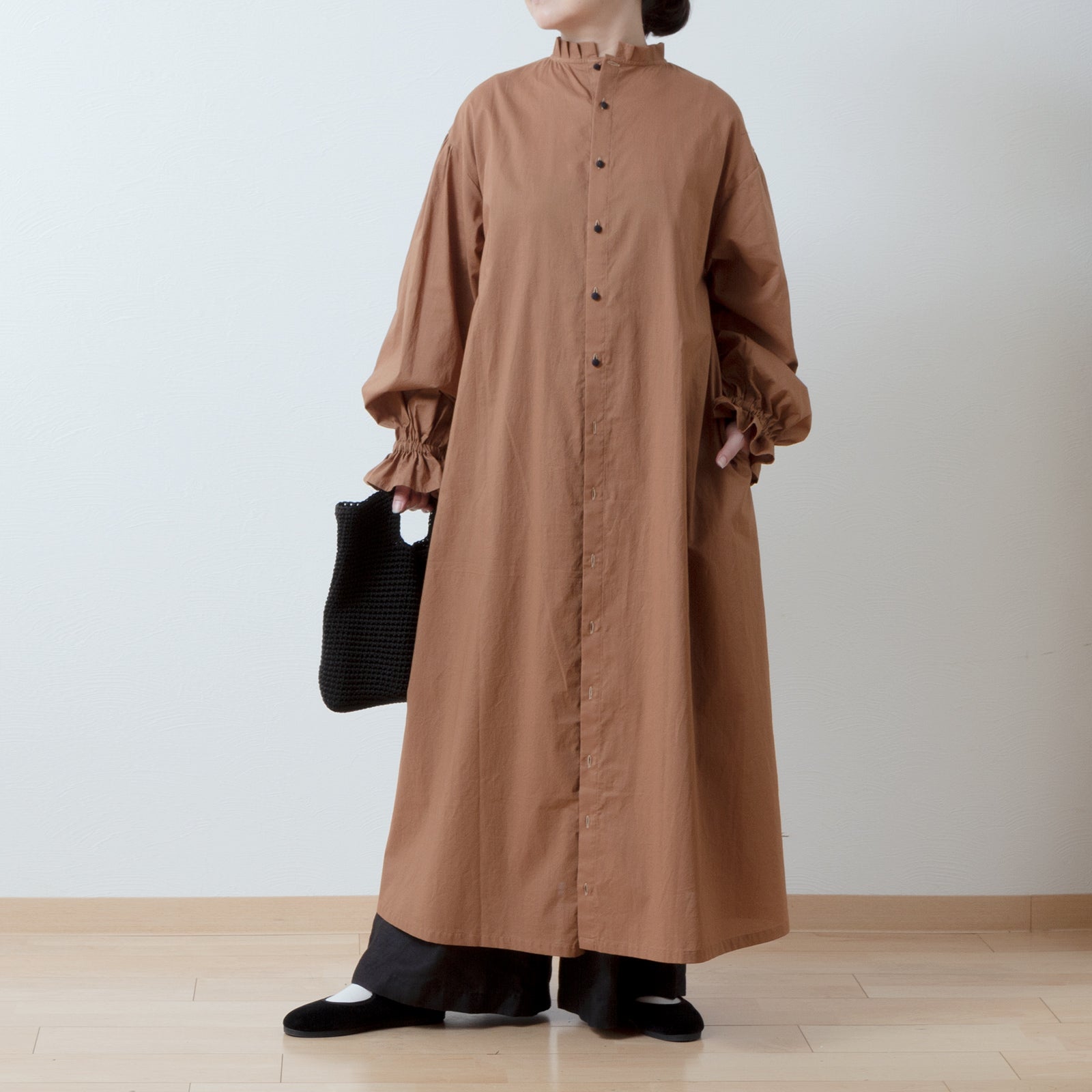優雅的褶邊領 *非常適合儀式* 背扣褶皺袖 A 字形棉質連身裙/駝色
