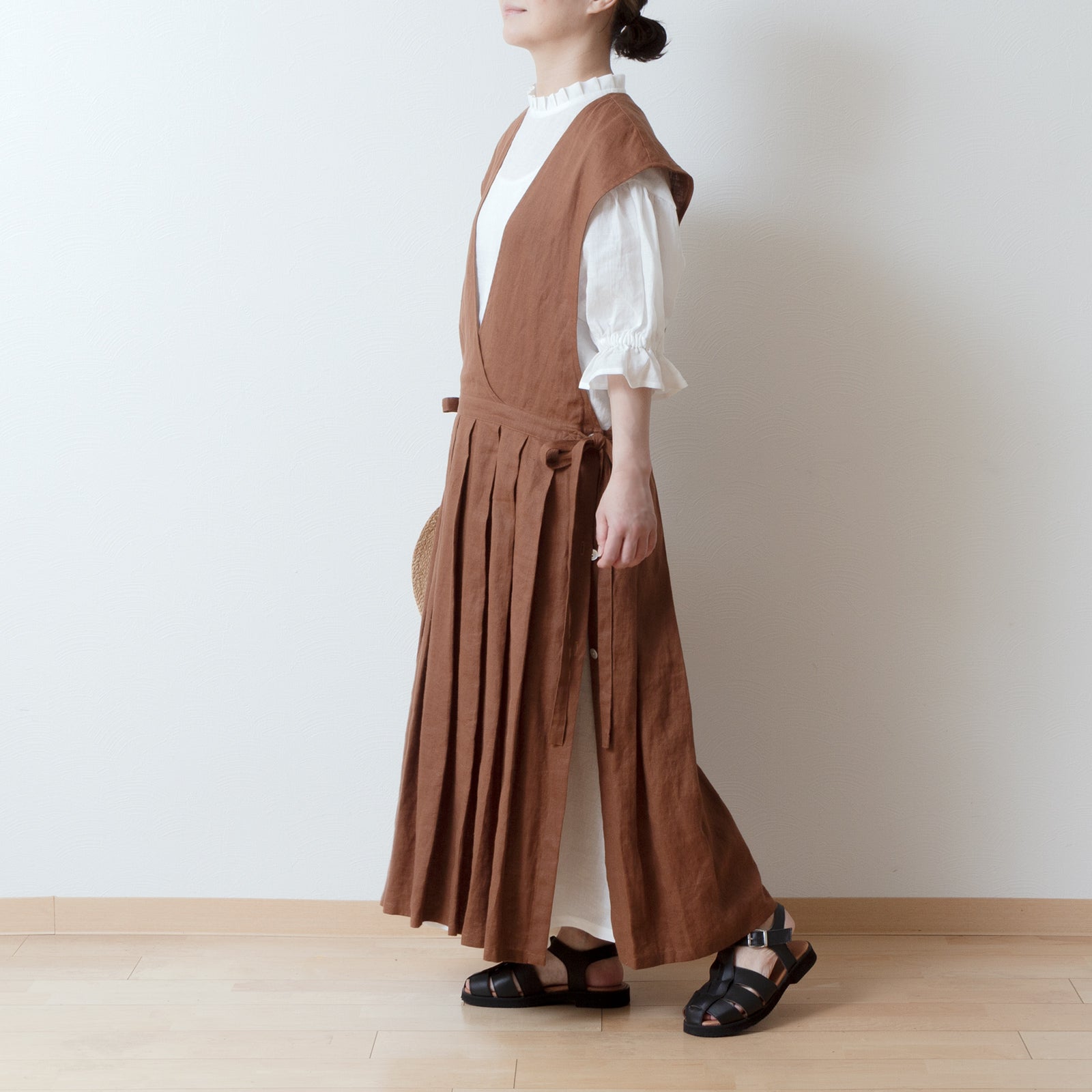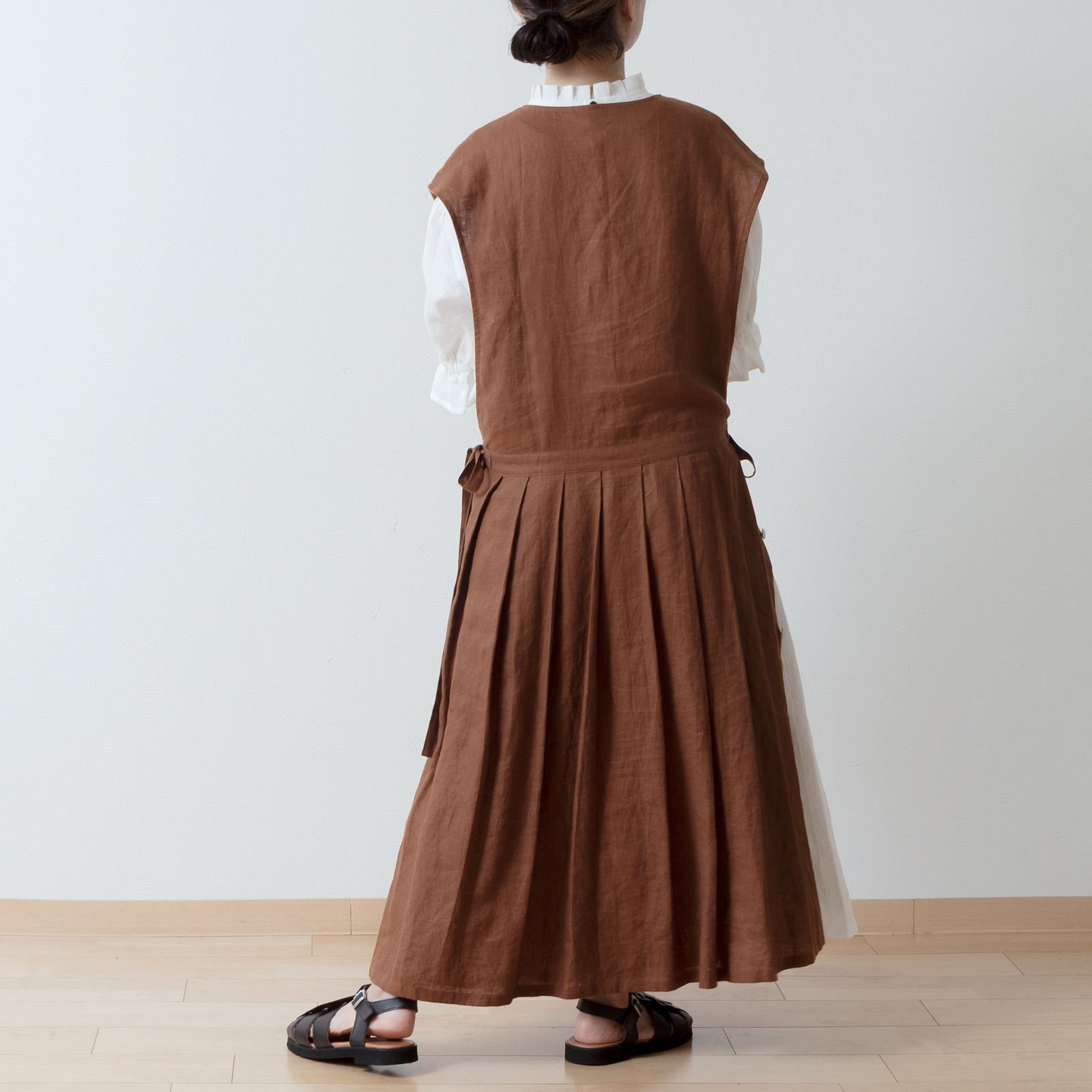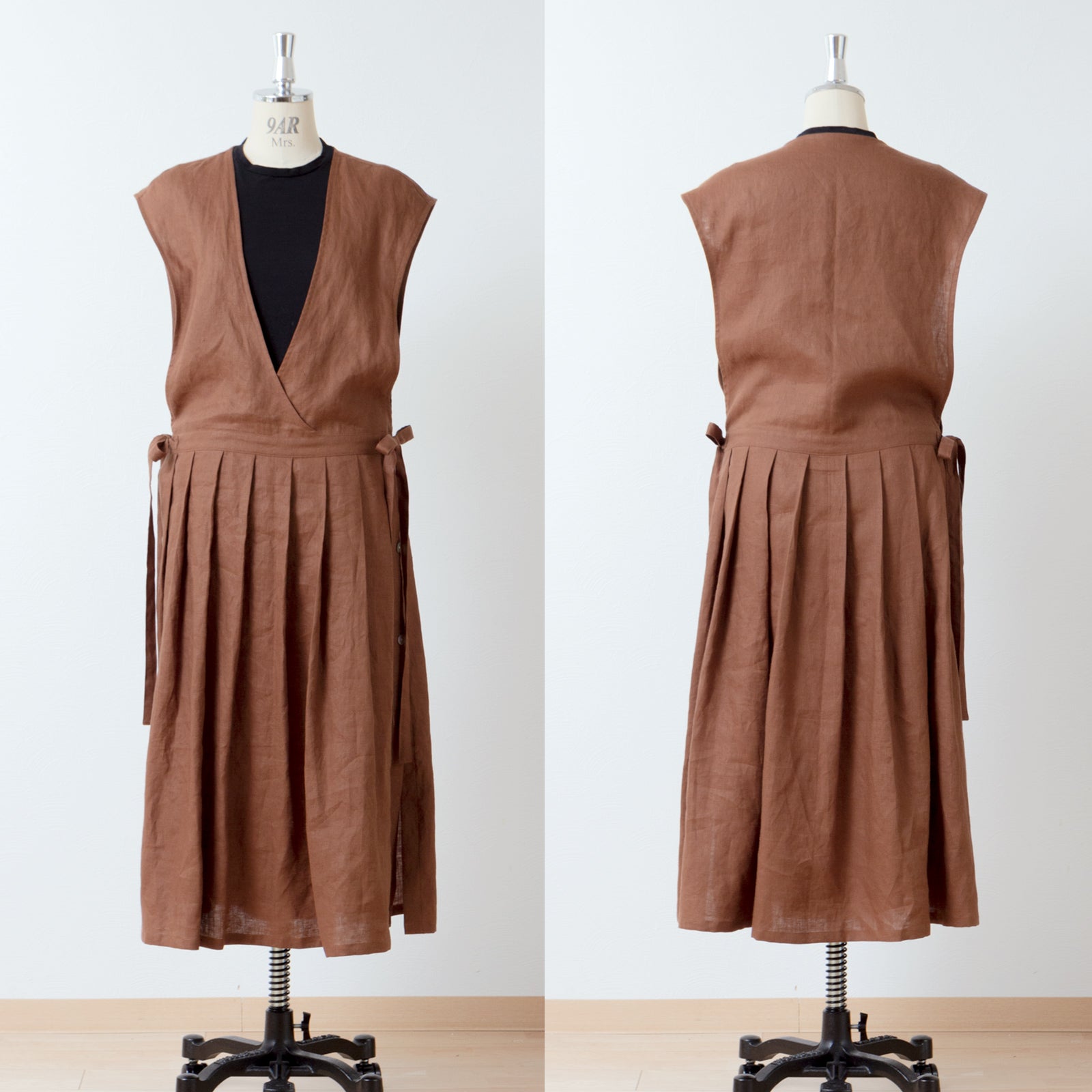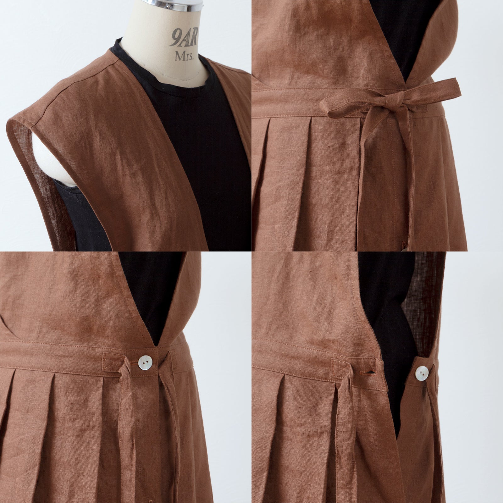 精緻的少女側開圍裙式連身裙 - 法國亞麻/磚棕色
