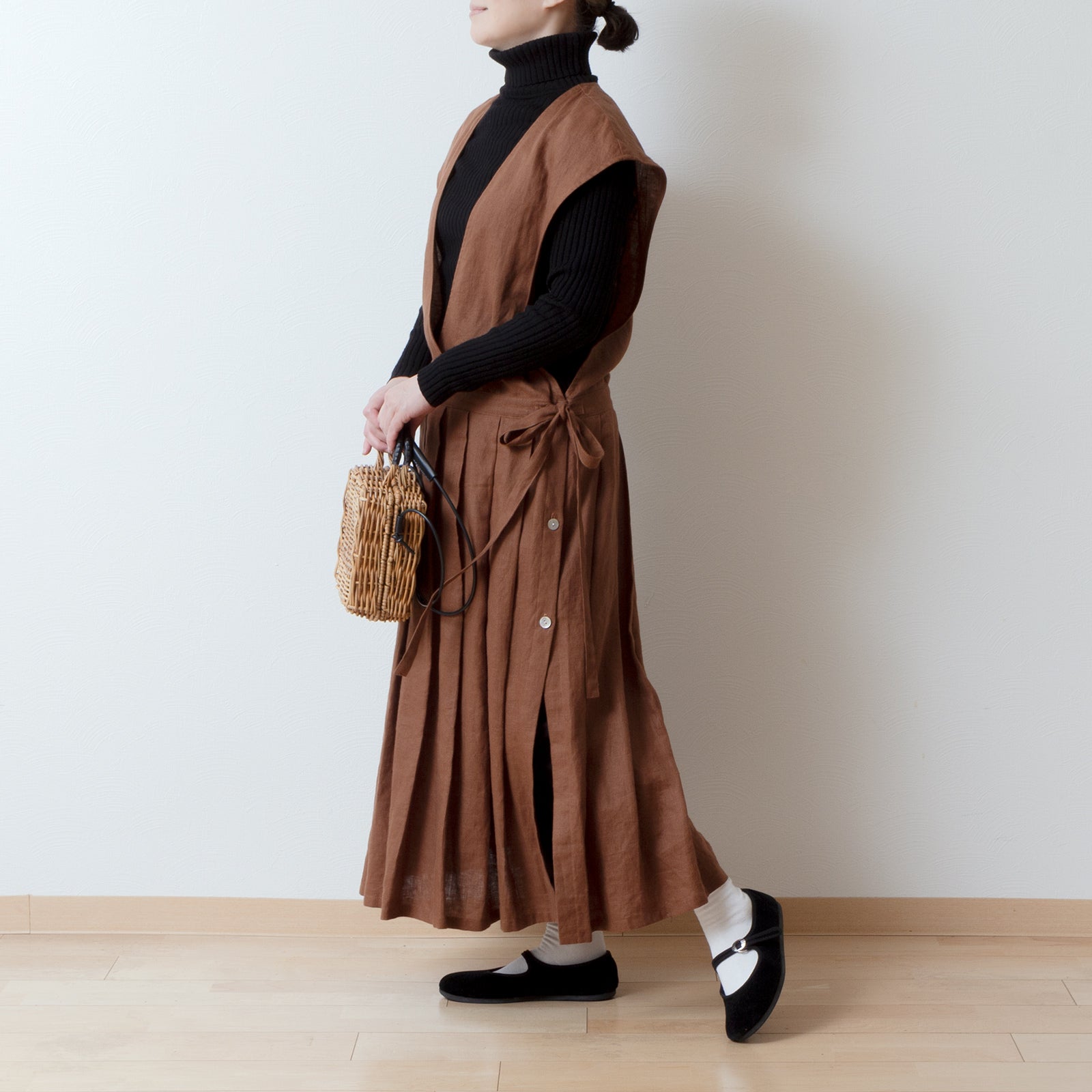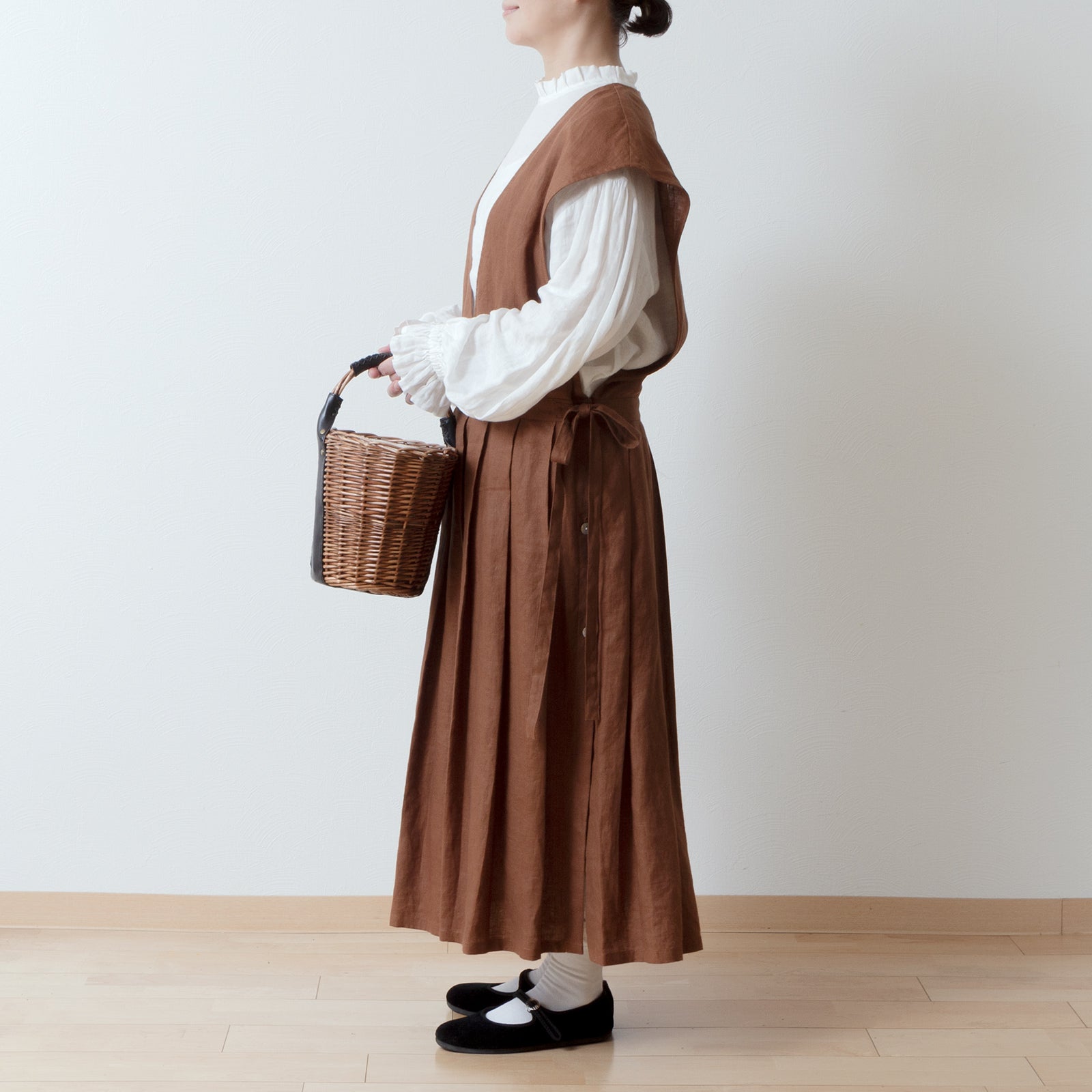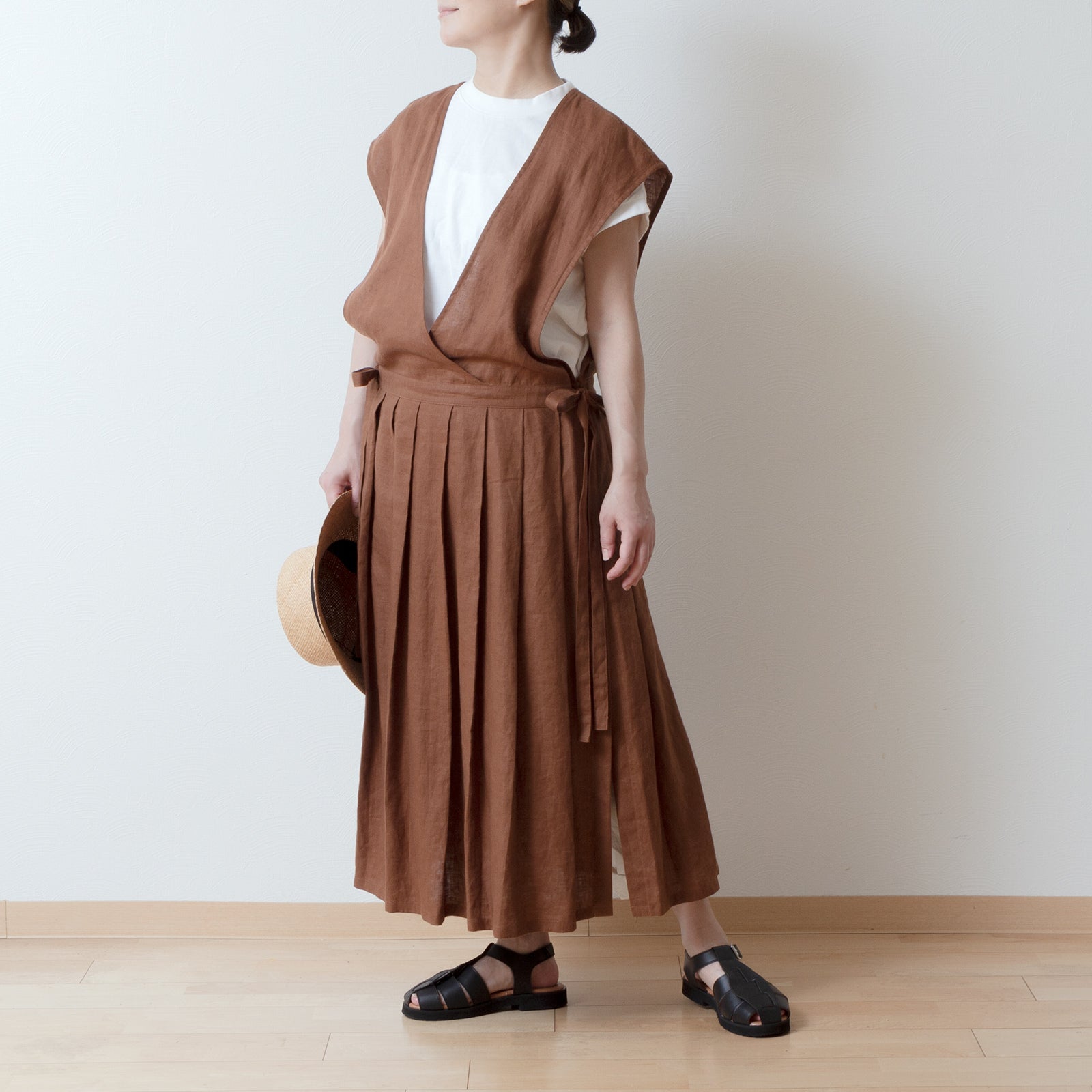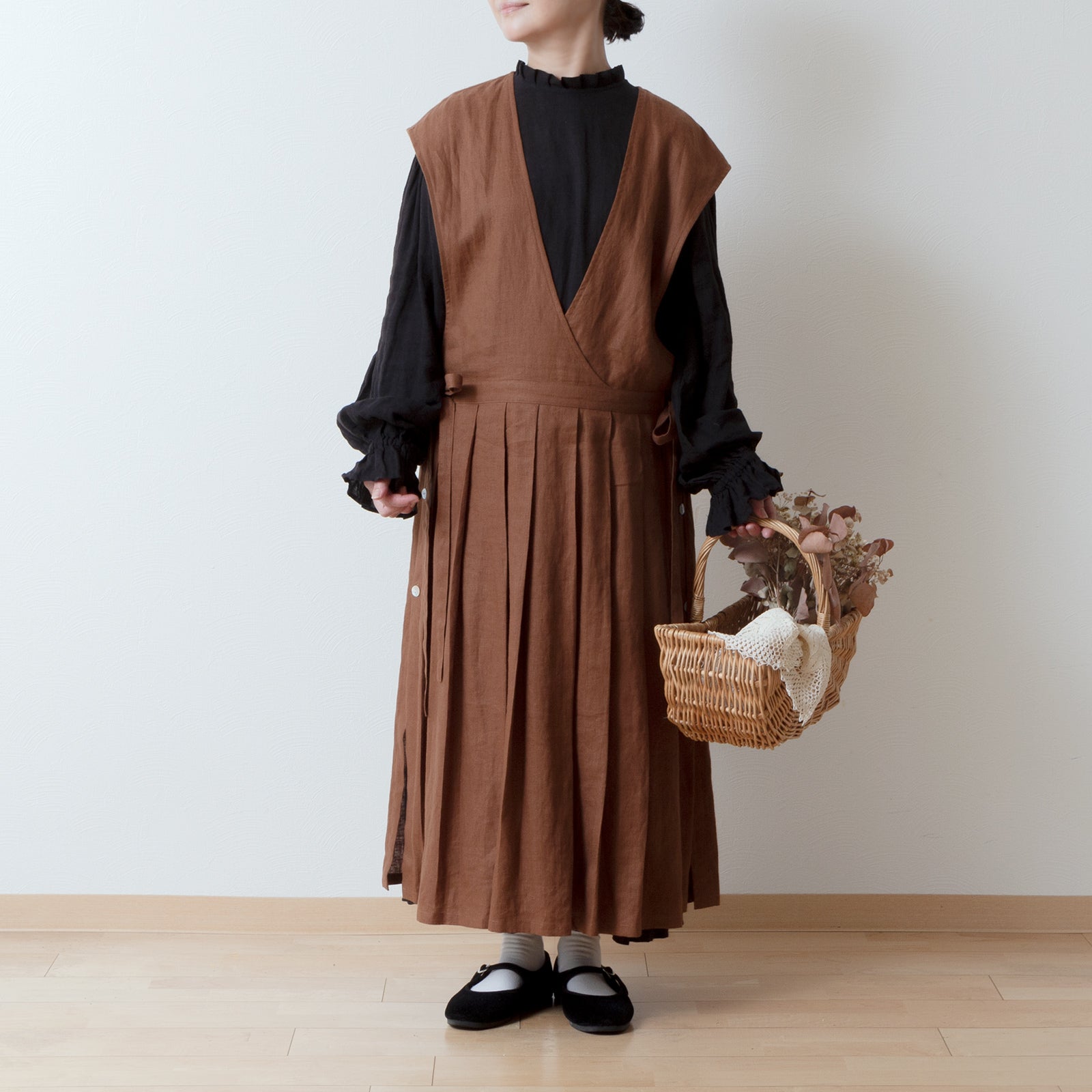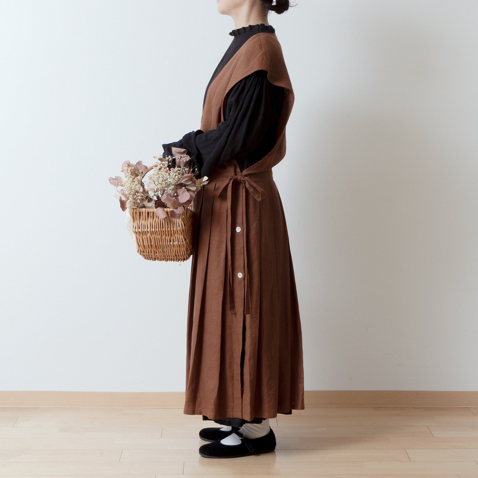 精緻的少女側開圍裙式連身裙 - 法國亞麻/磚棕色