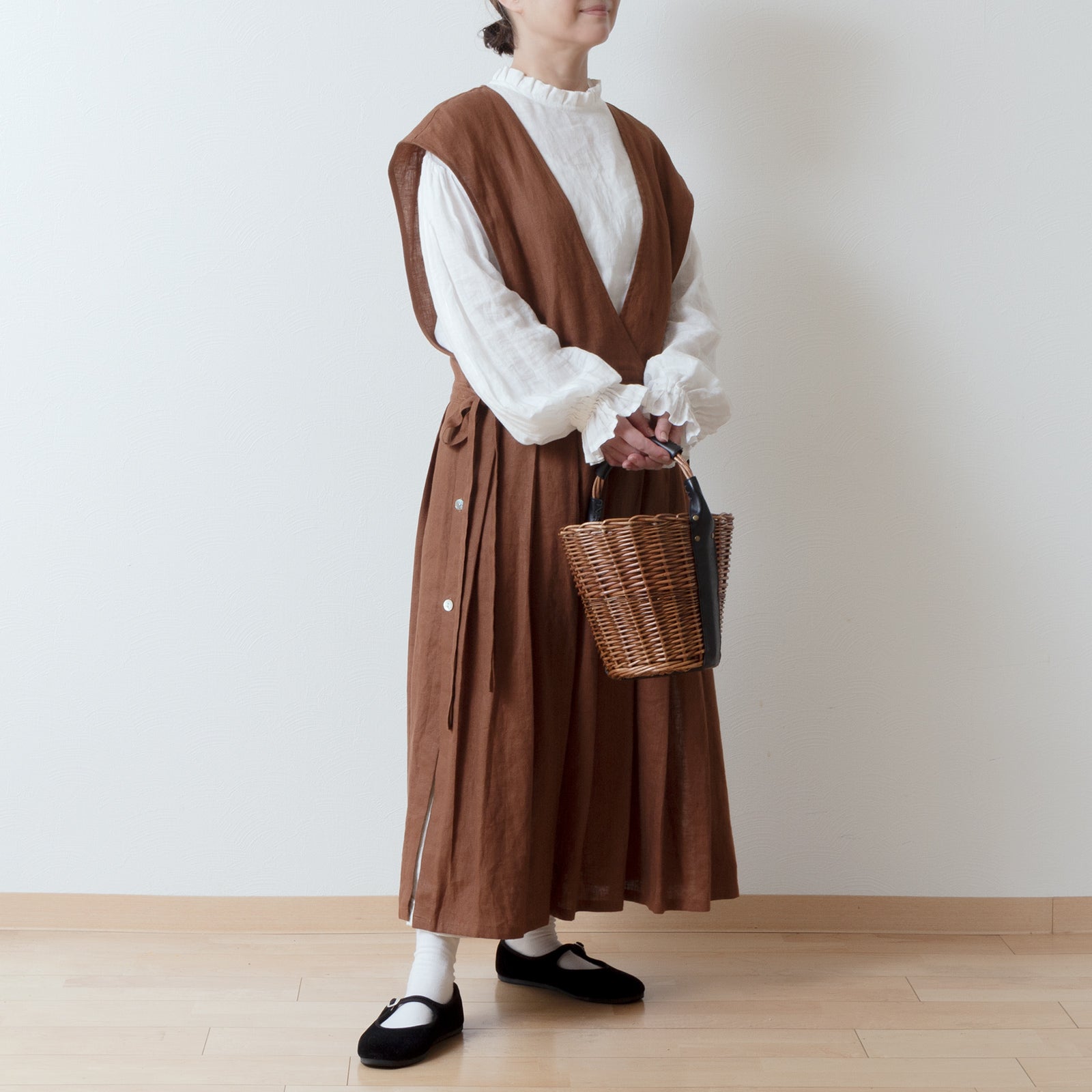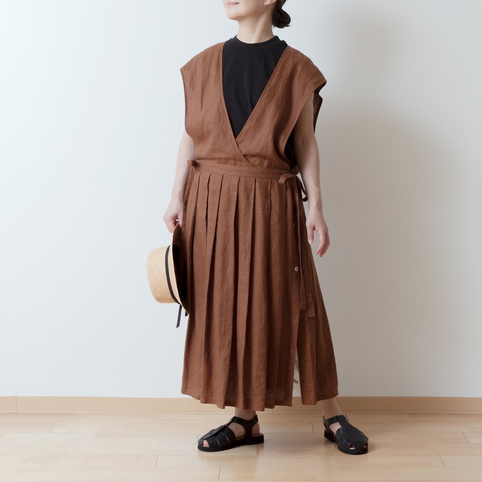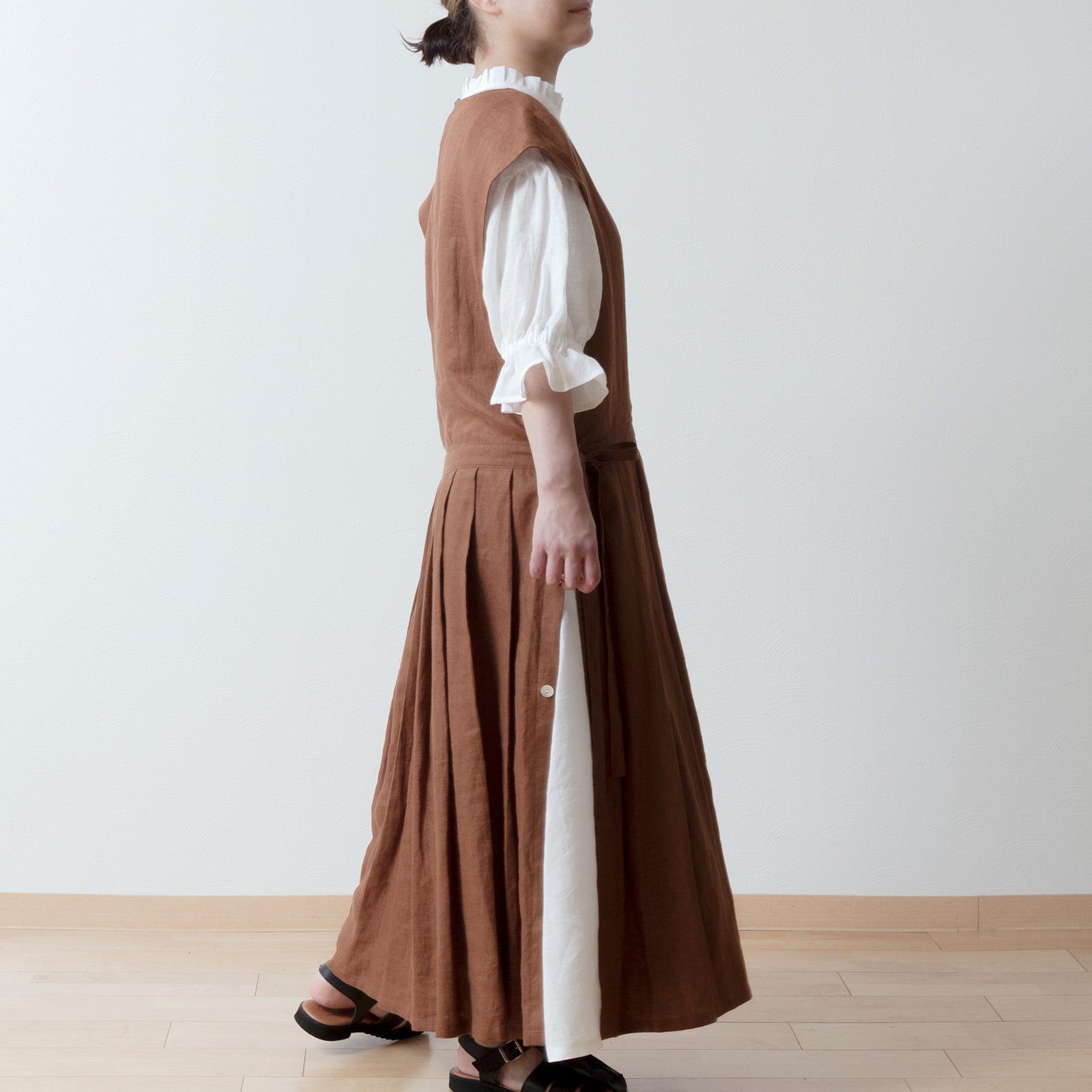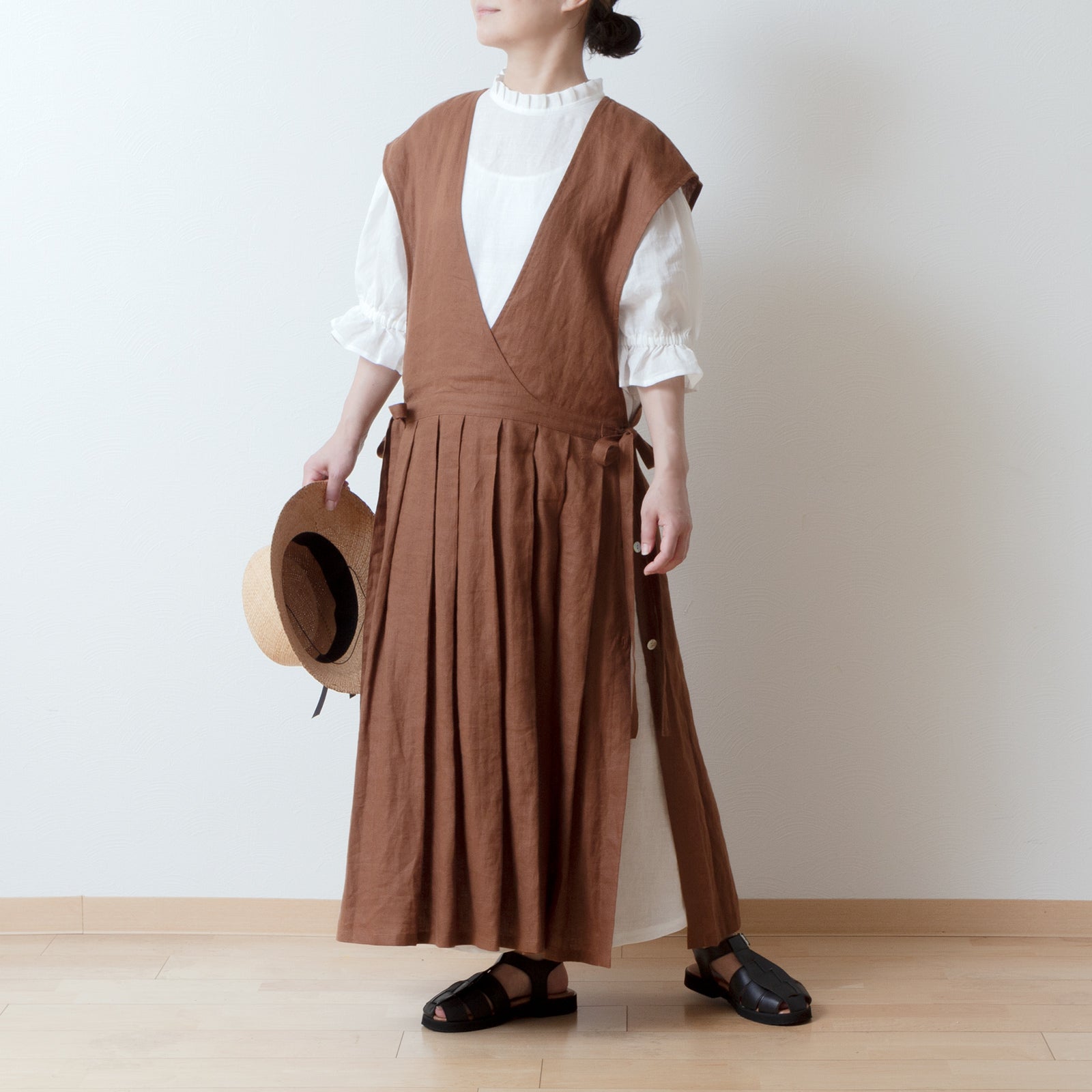 精緻的少女側開圍裙式連身裙 - 法國亞麻/磚棕色
