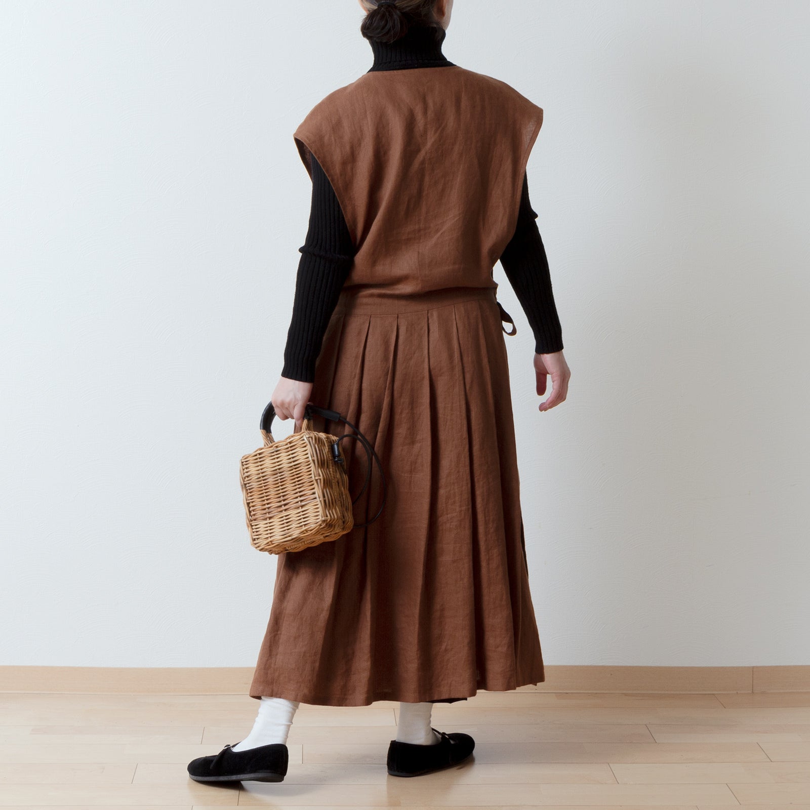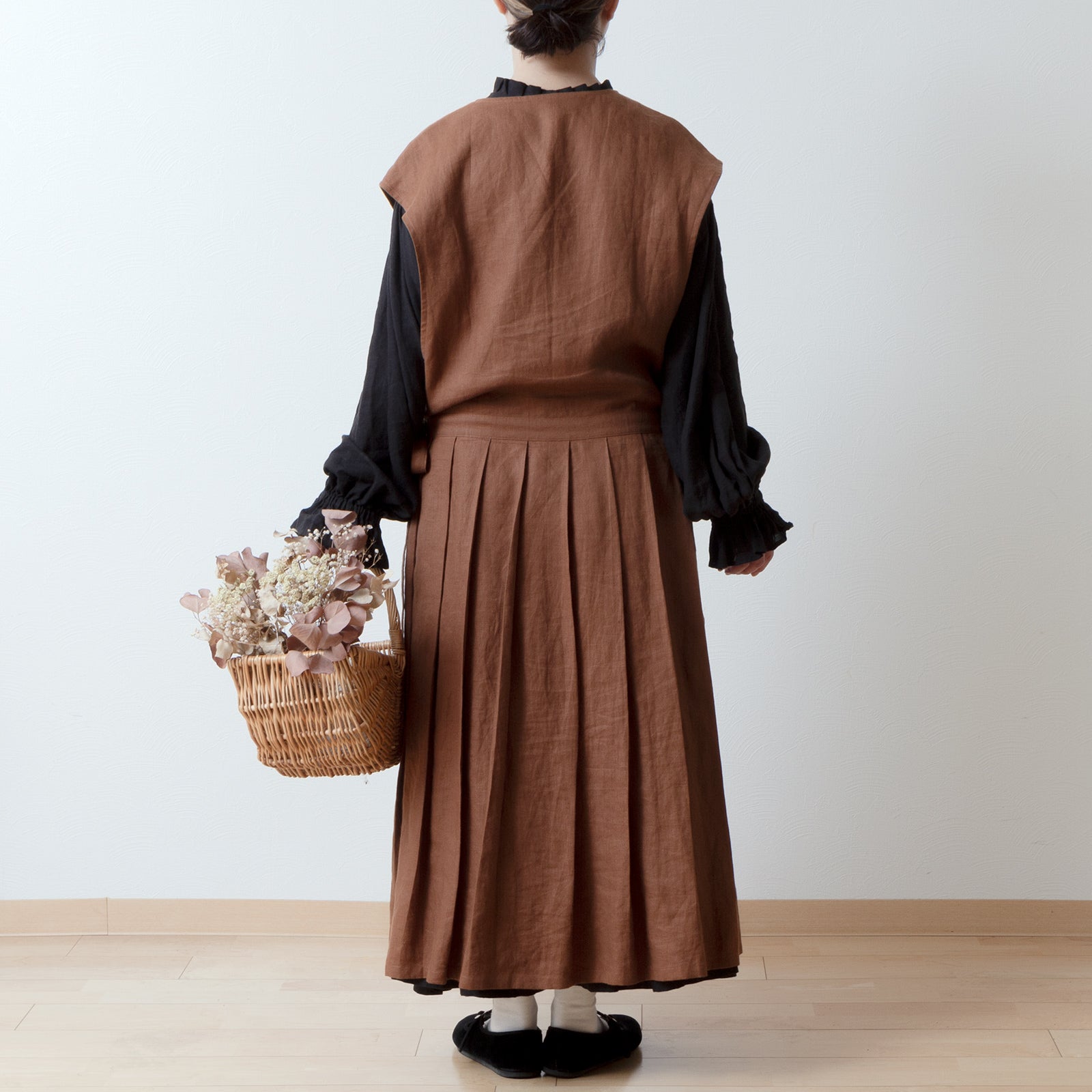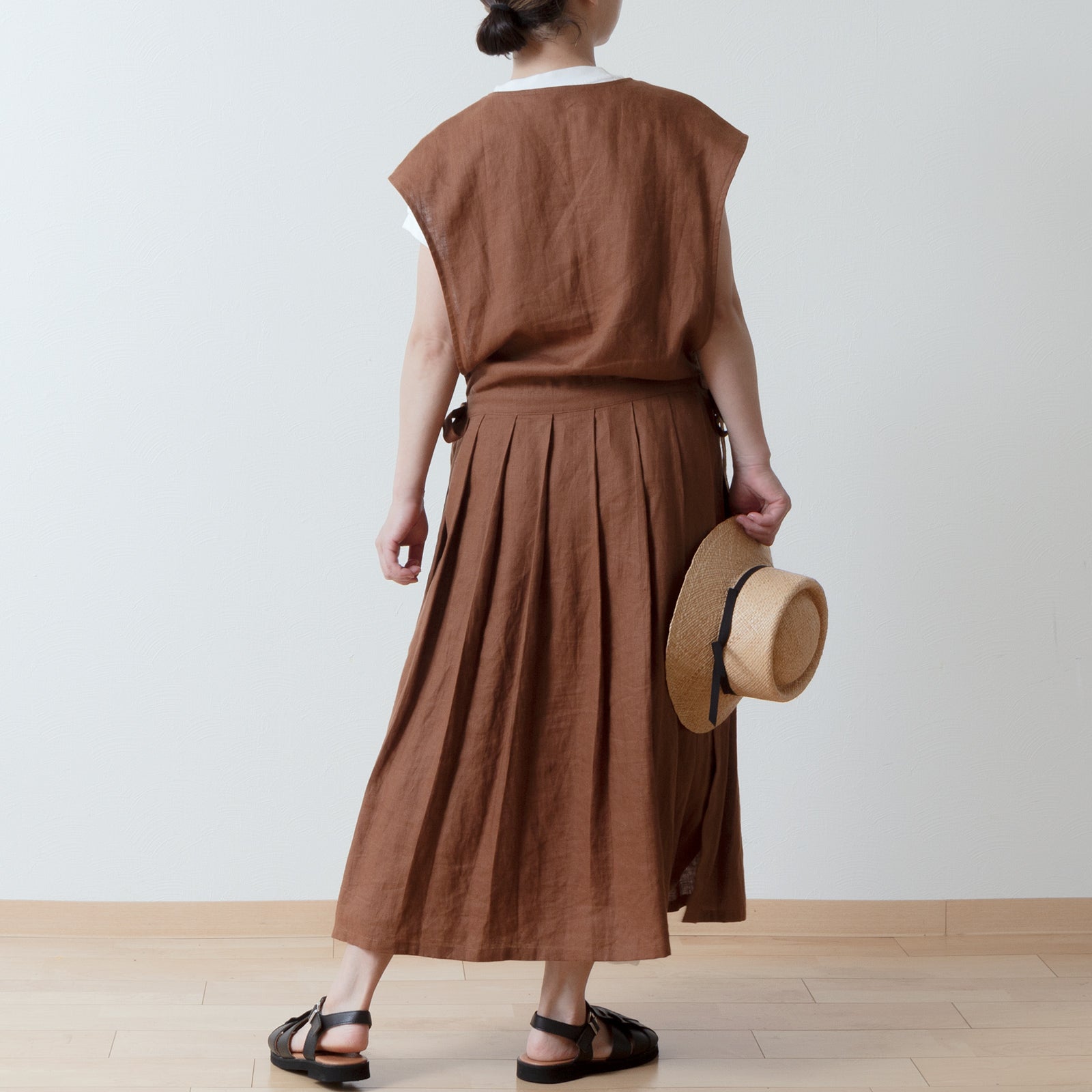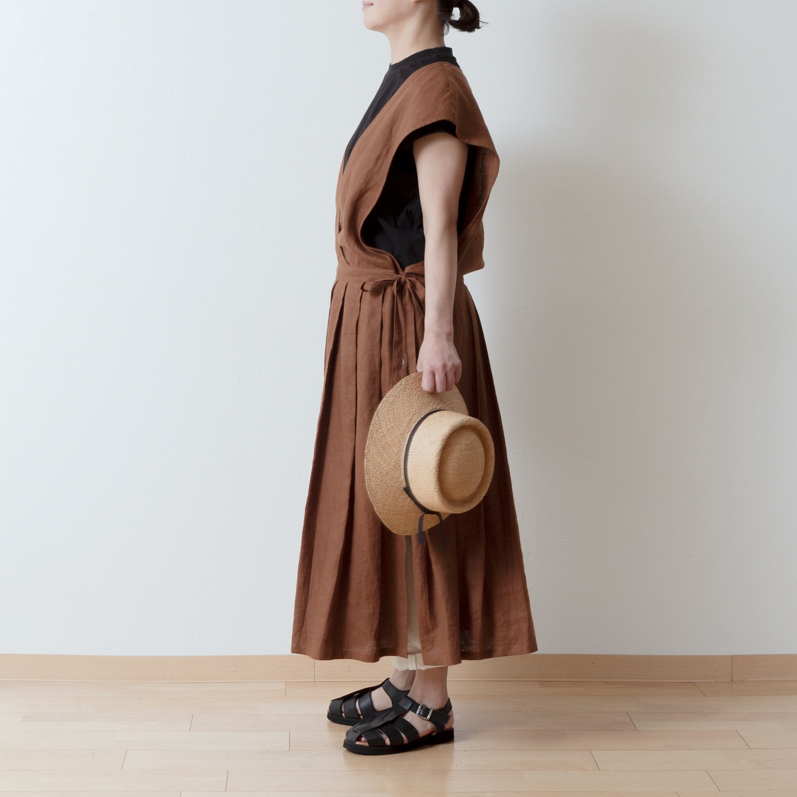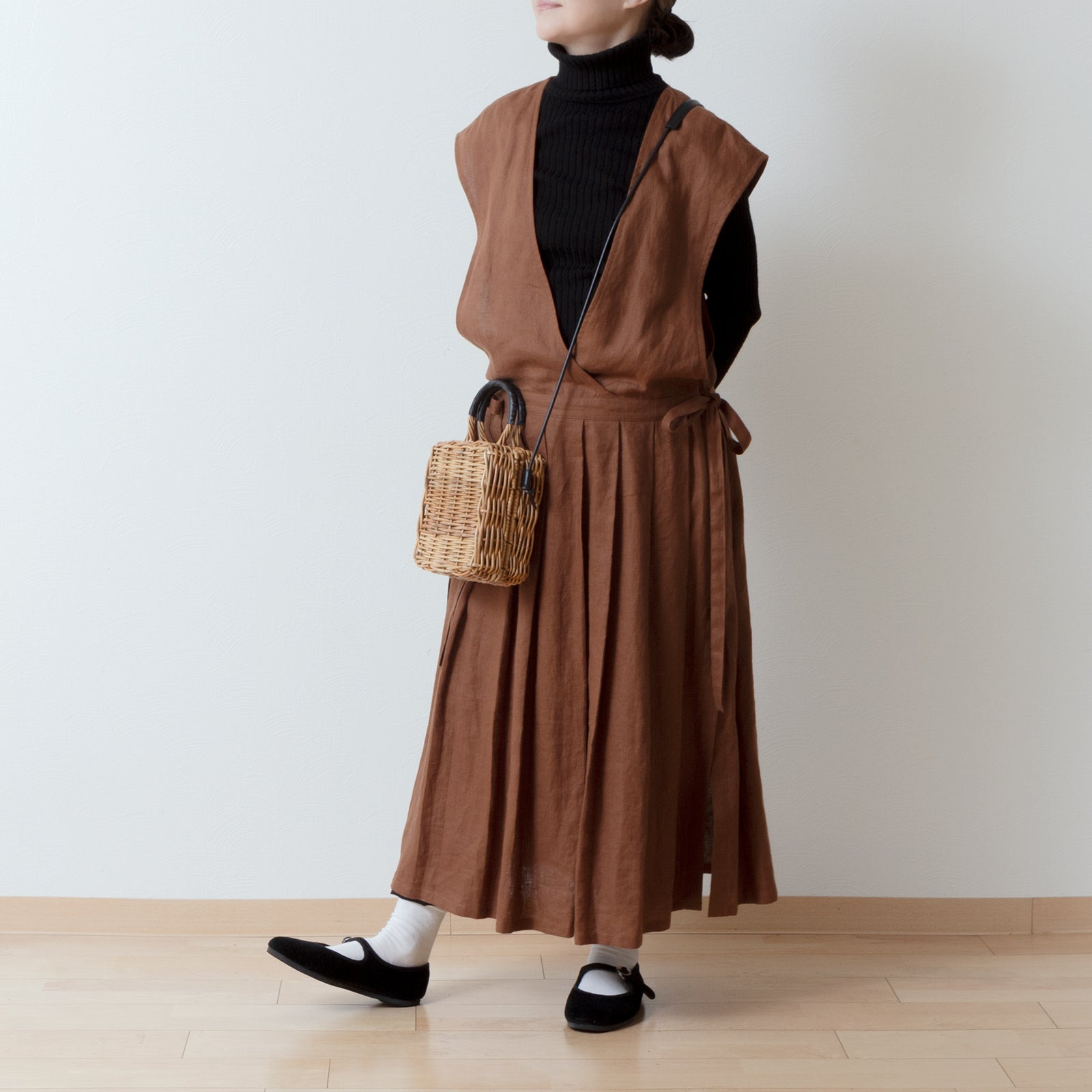精緻的少女側開圍裙式連身裙 - 法國亞麻/磚棕色