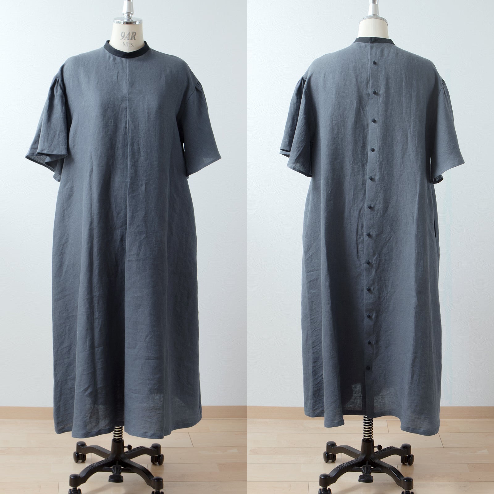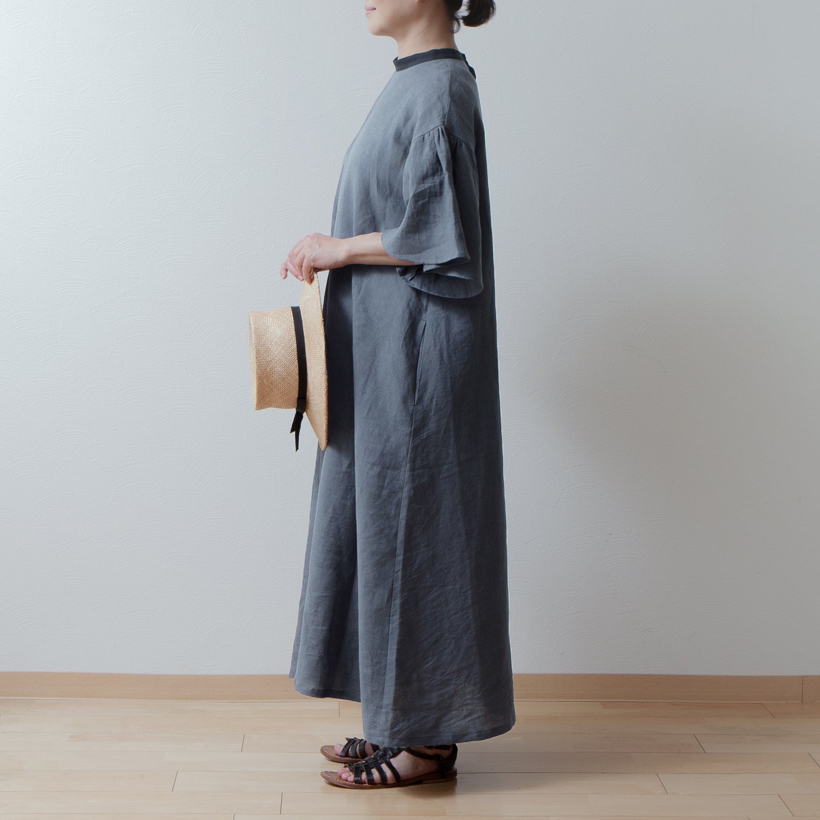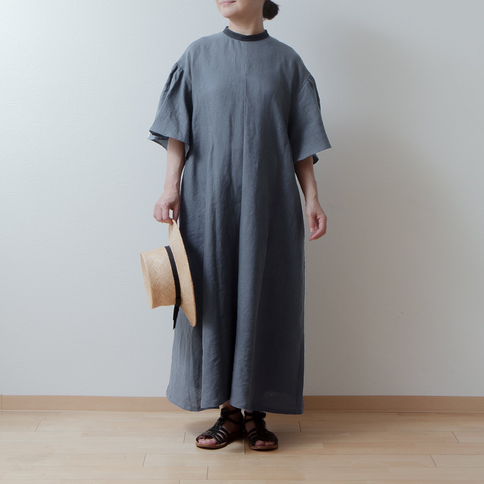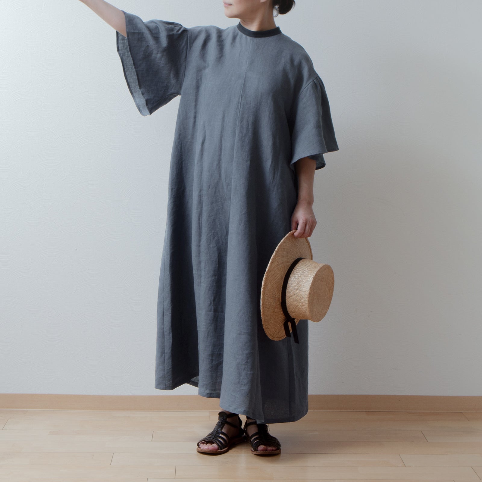 喇叭形半袖A字亞麻洋裝/灰色