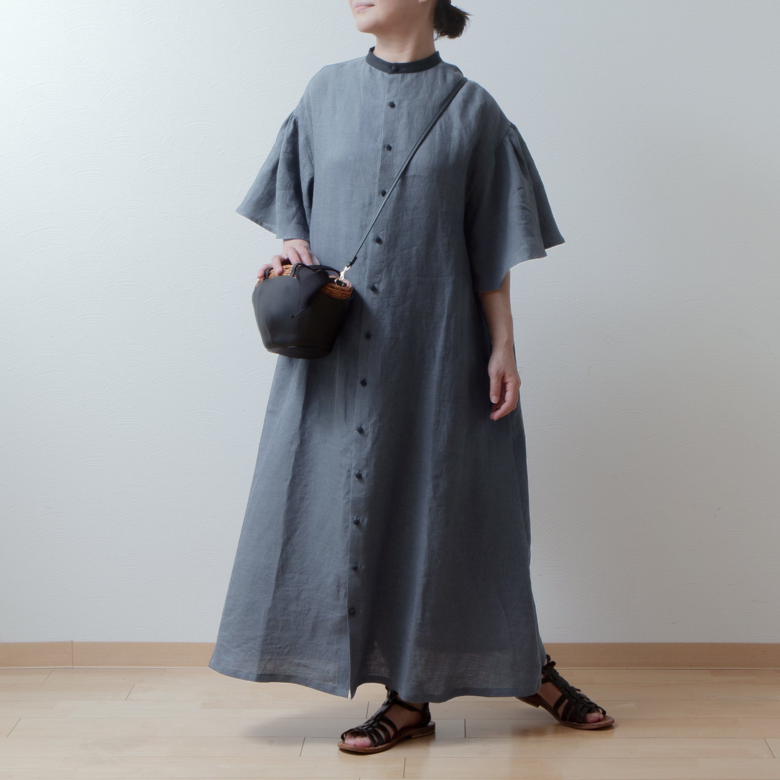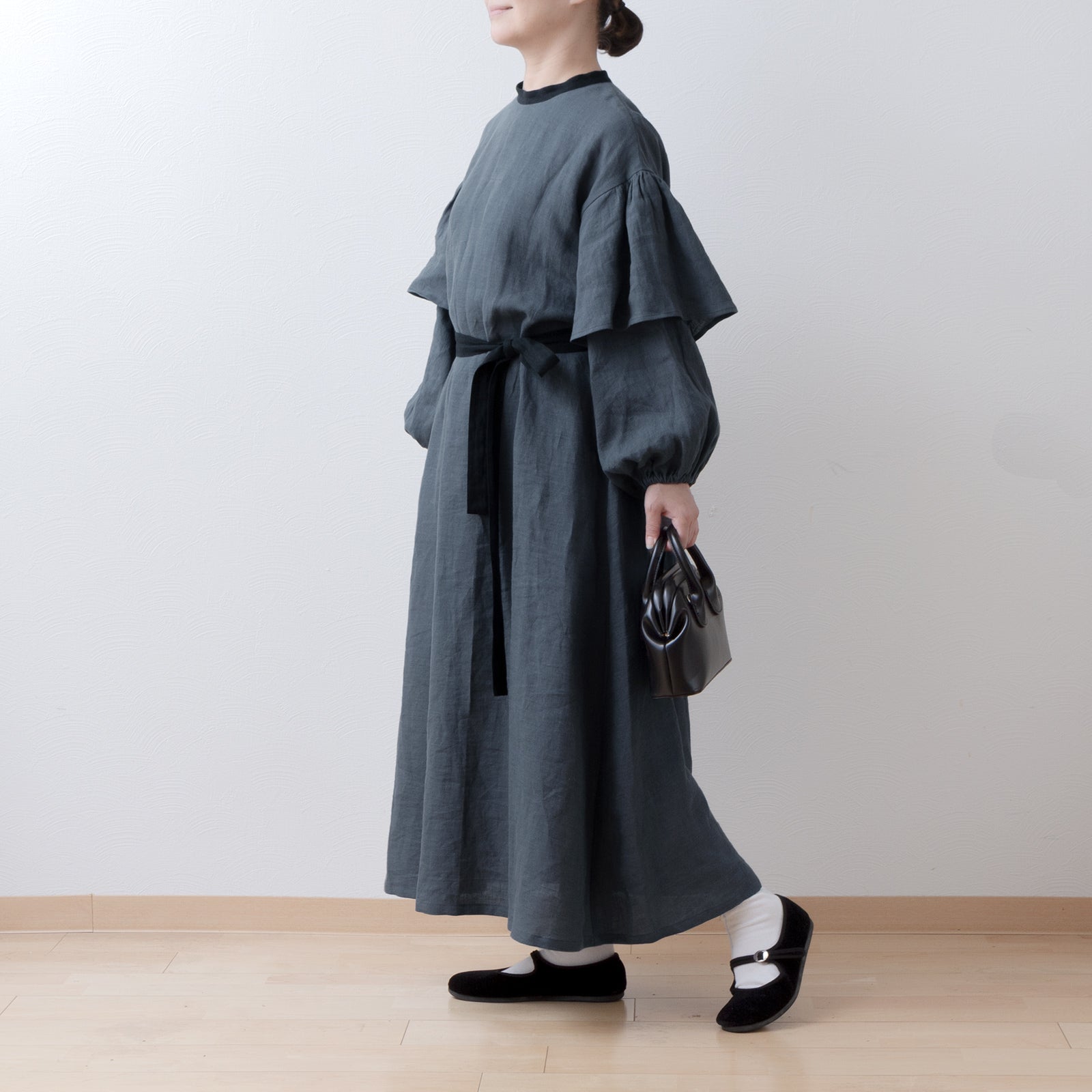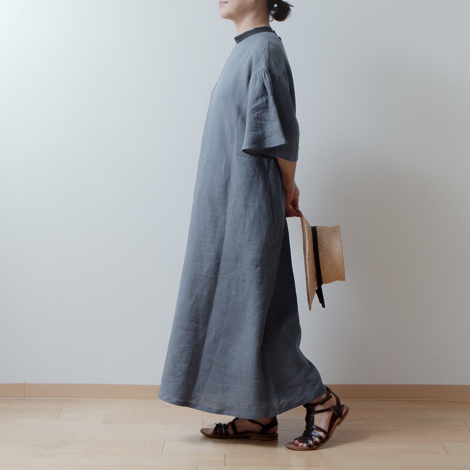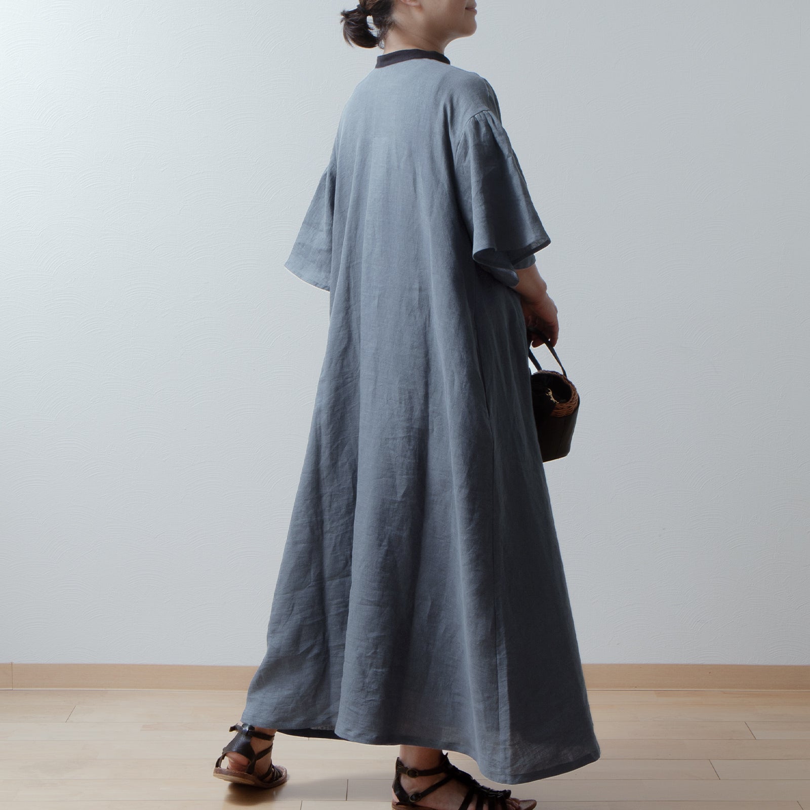 喇叭形半袖A字亞麻洋裝/灰色