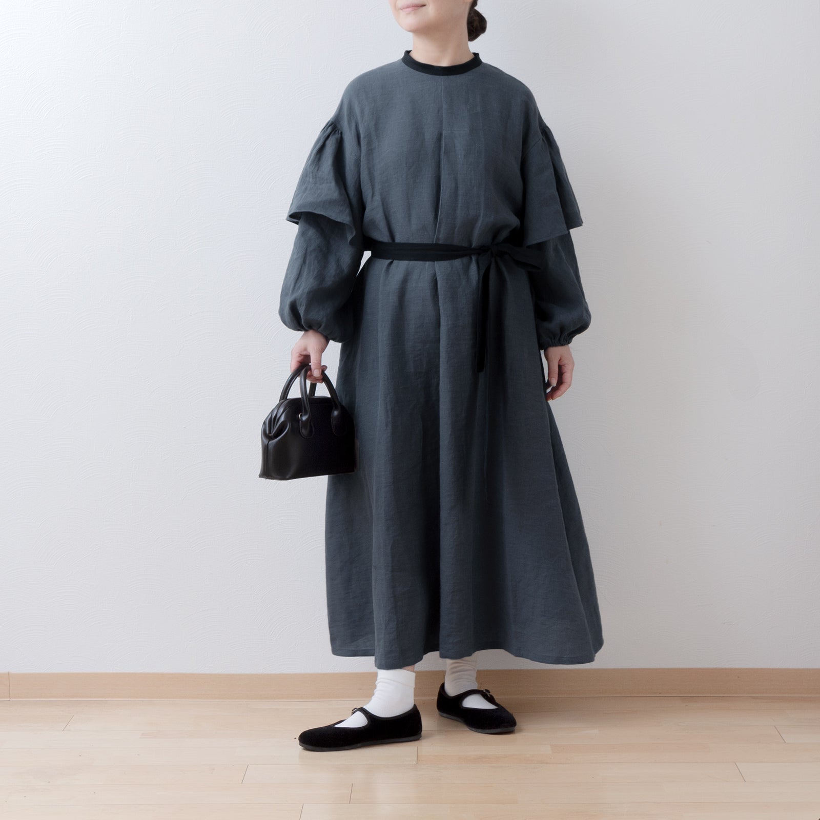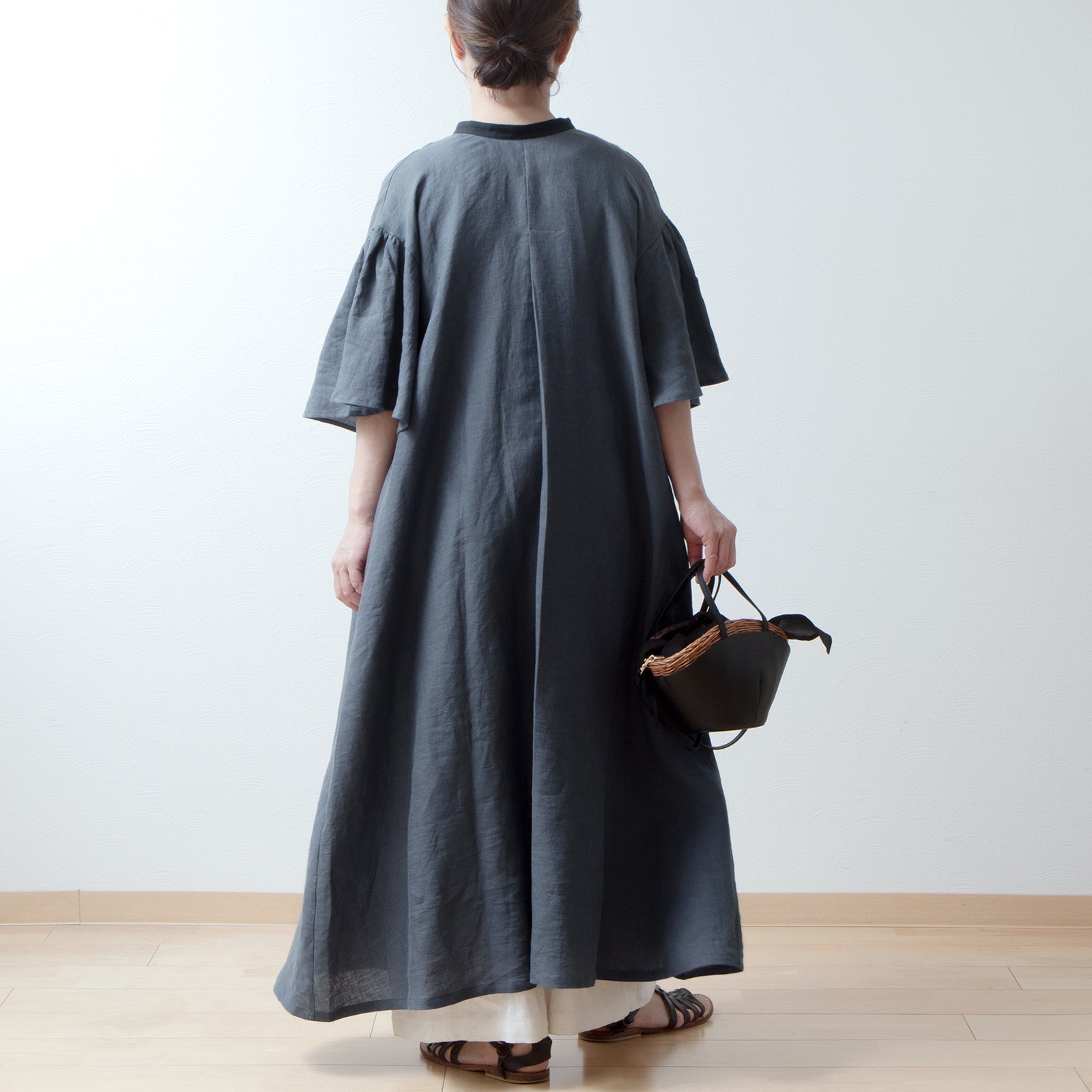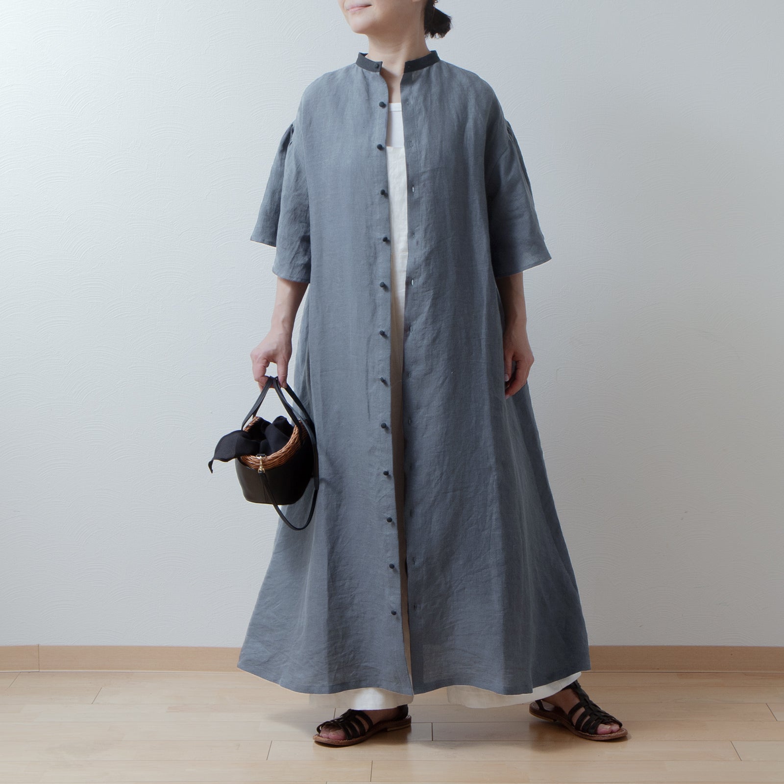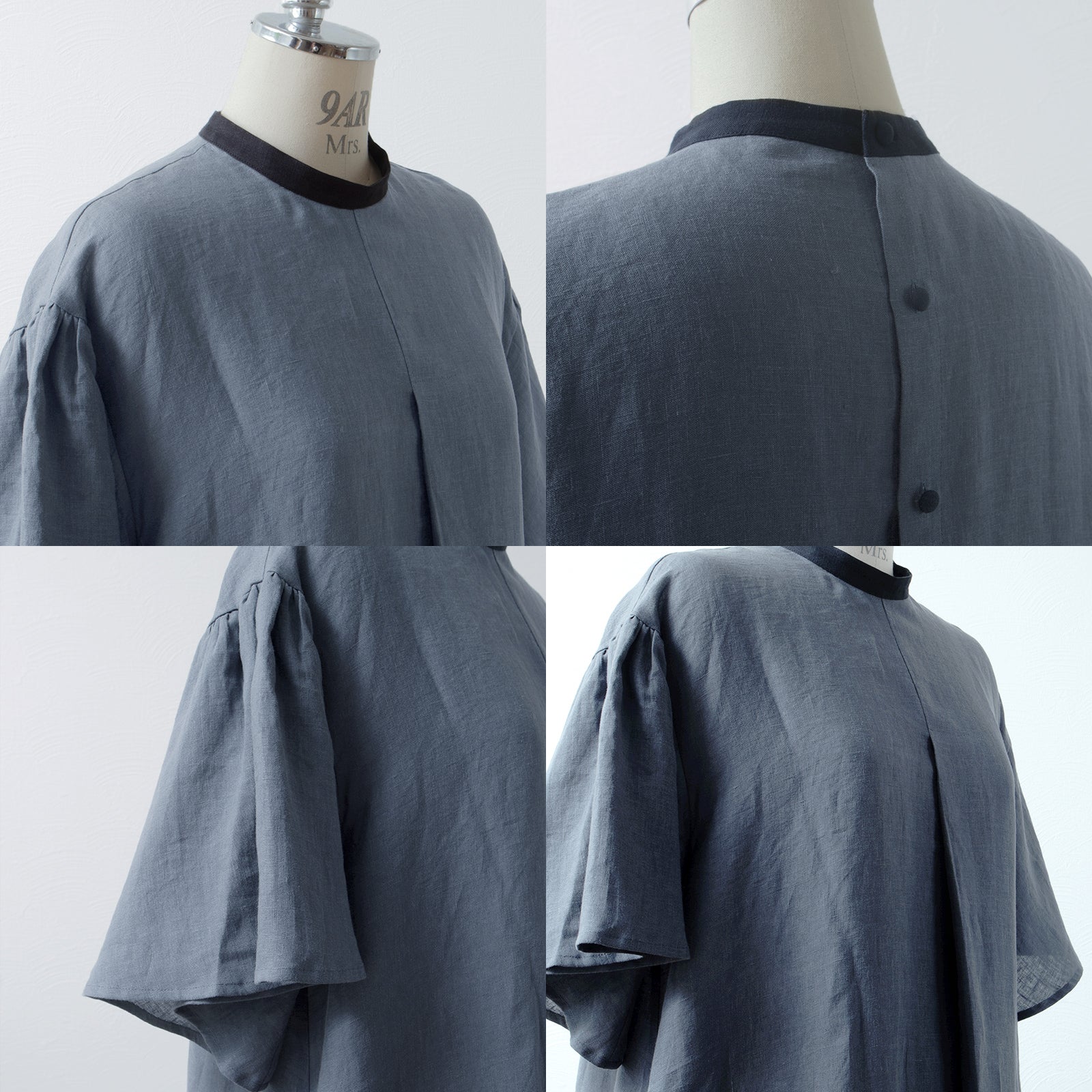喇叭形半袖A字亞麻洋裝/灰色