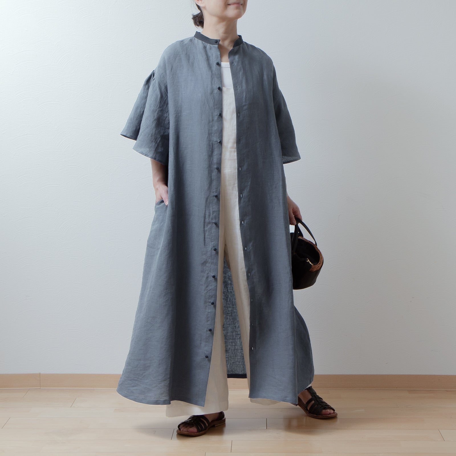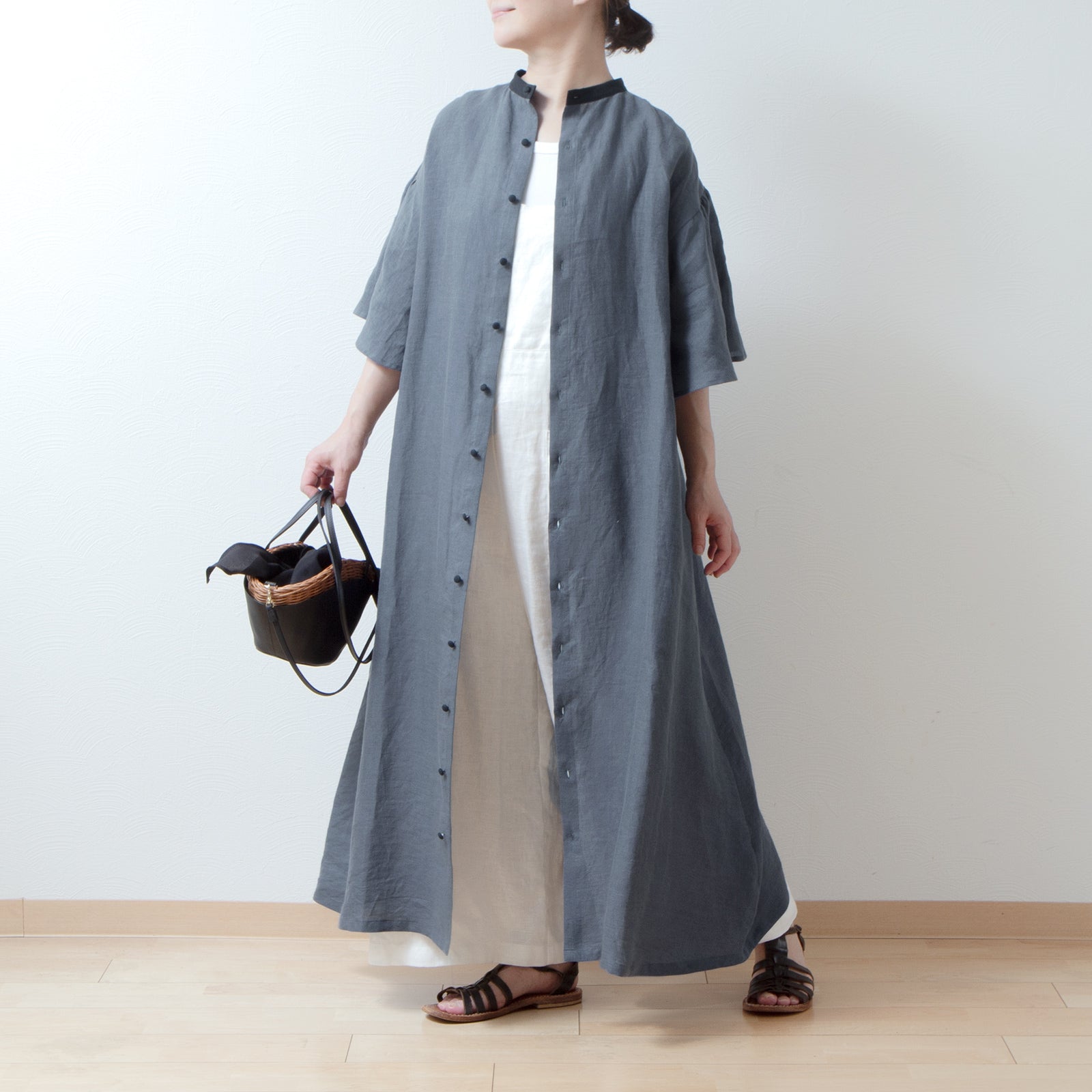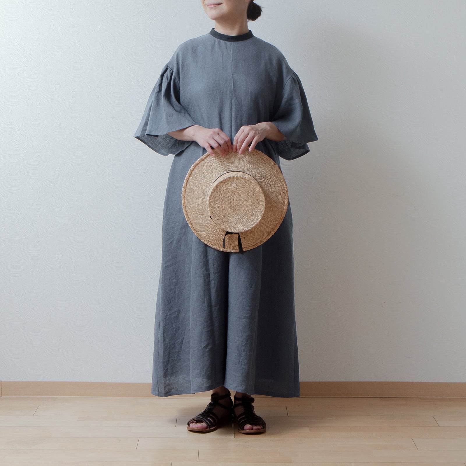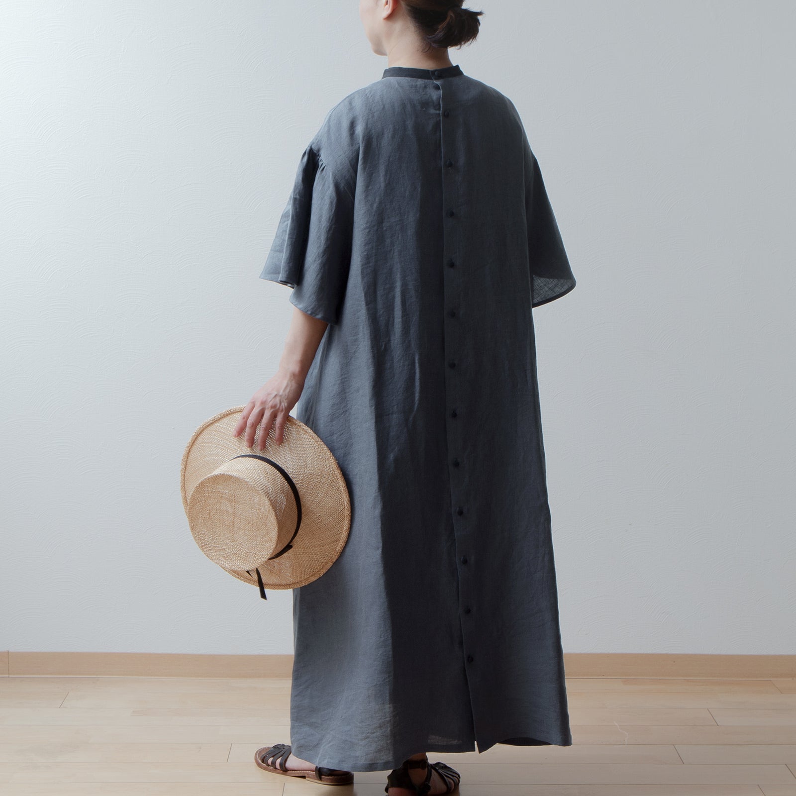 喇叭形半袖A字亞麻洋裝/灰色
