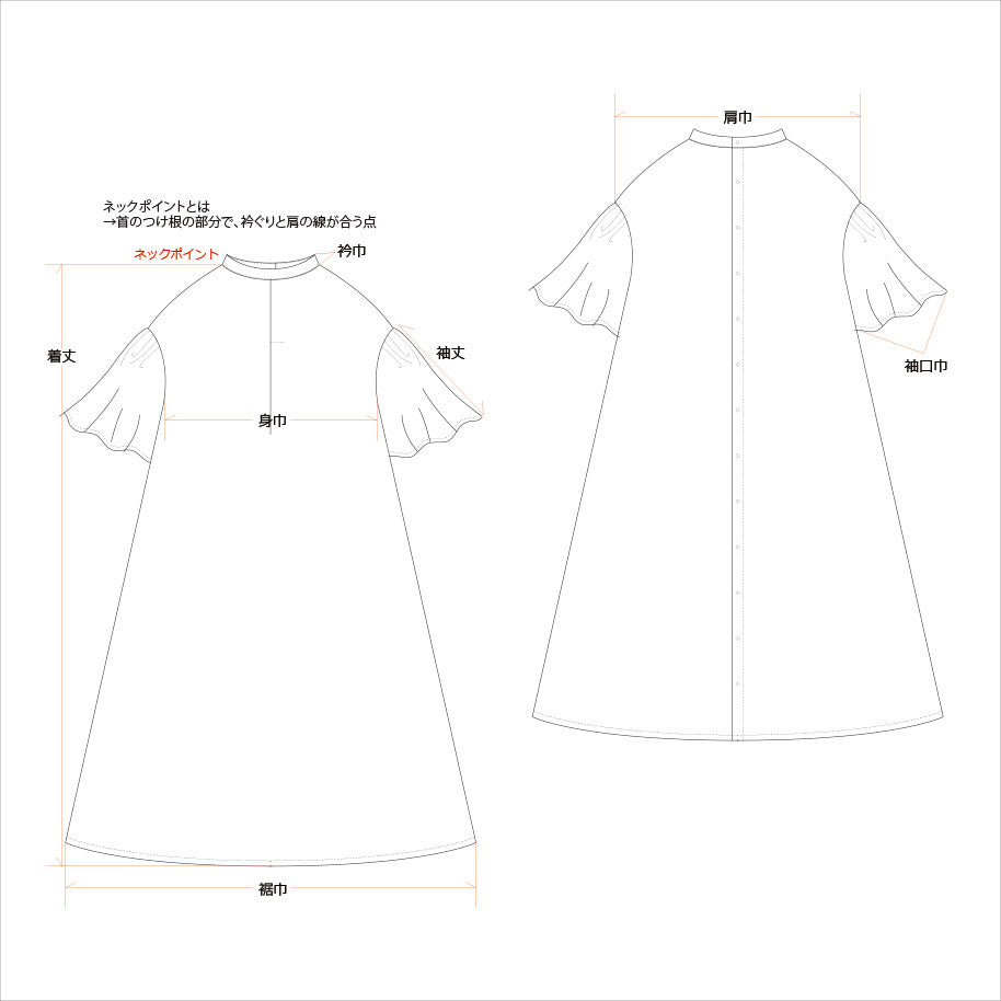 這款可愛而成熟的 A 字型連身裙具有寬大的喇叭形半袖。