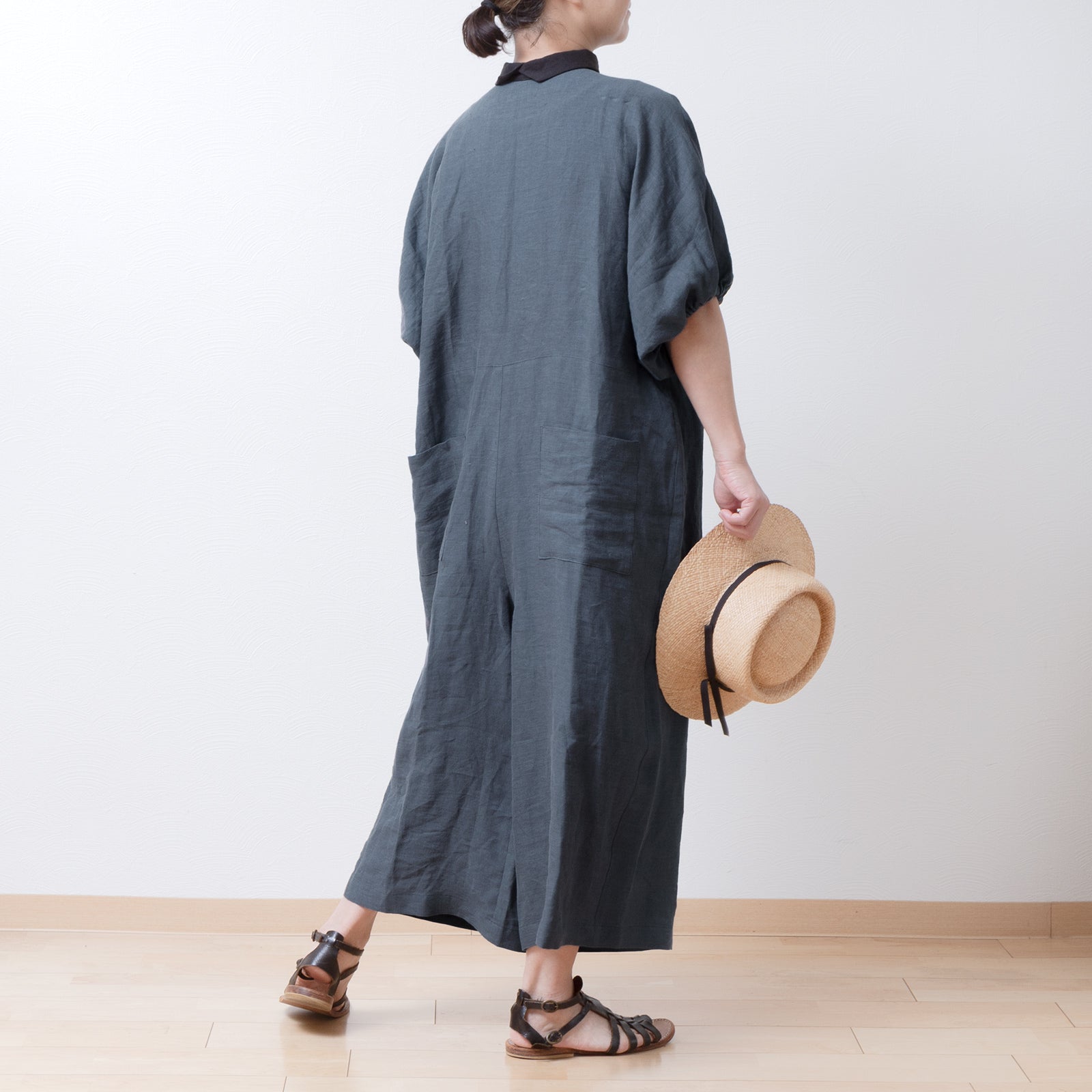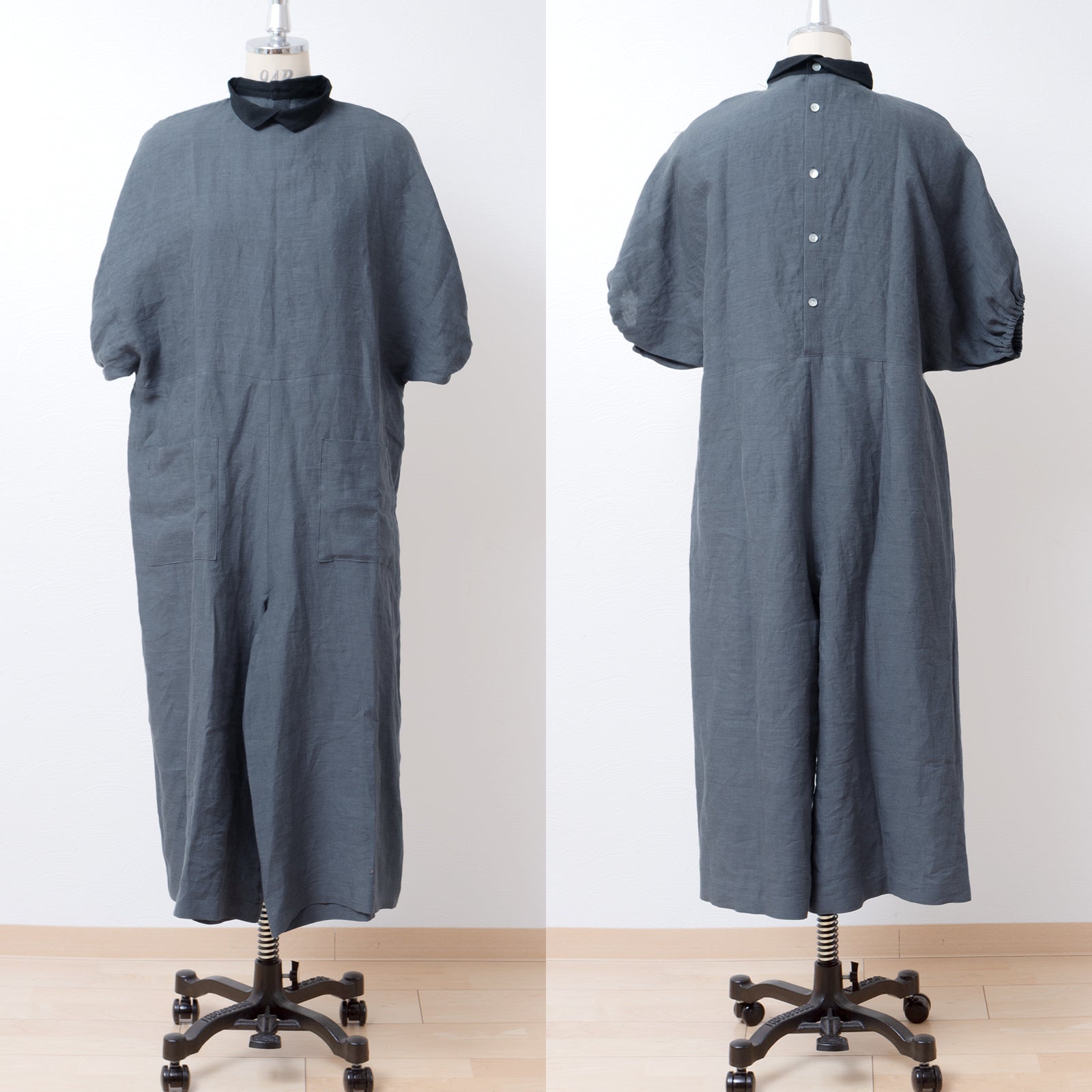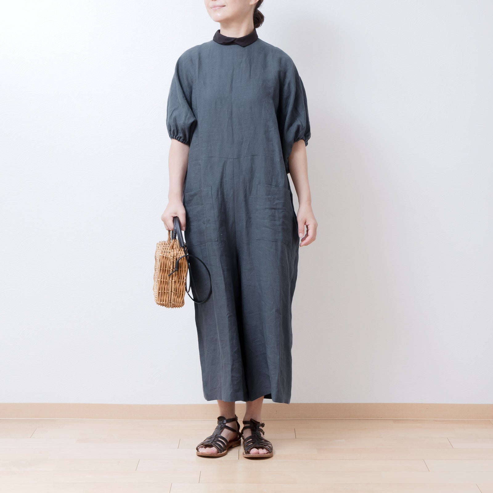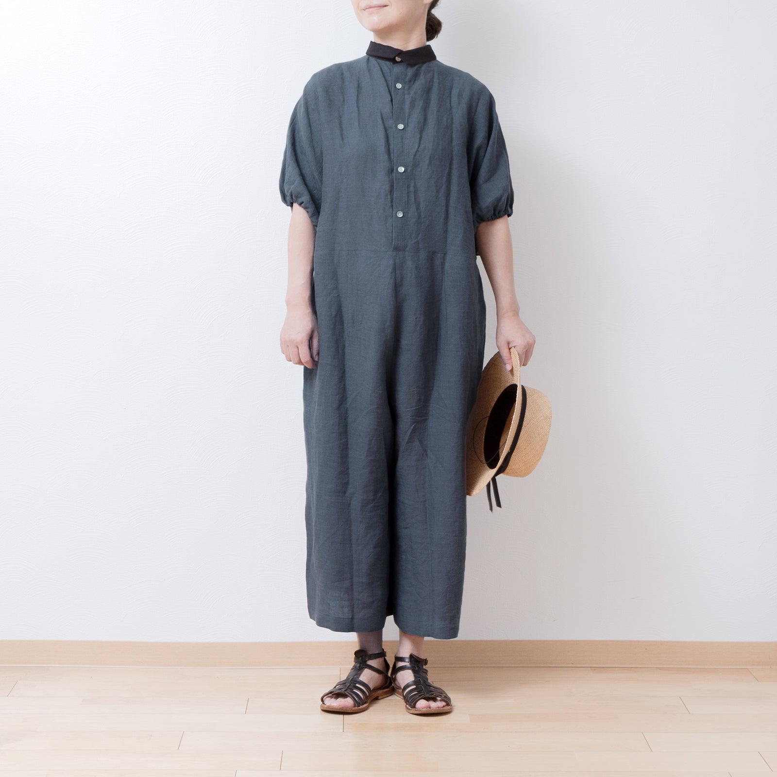 牧師領蝙蝠袖亞麻半袖連身衣/灰色