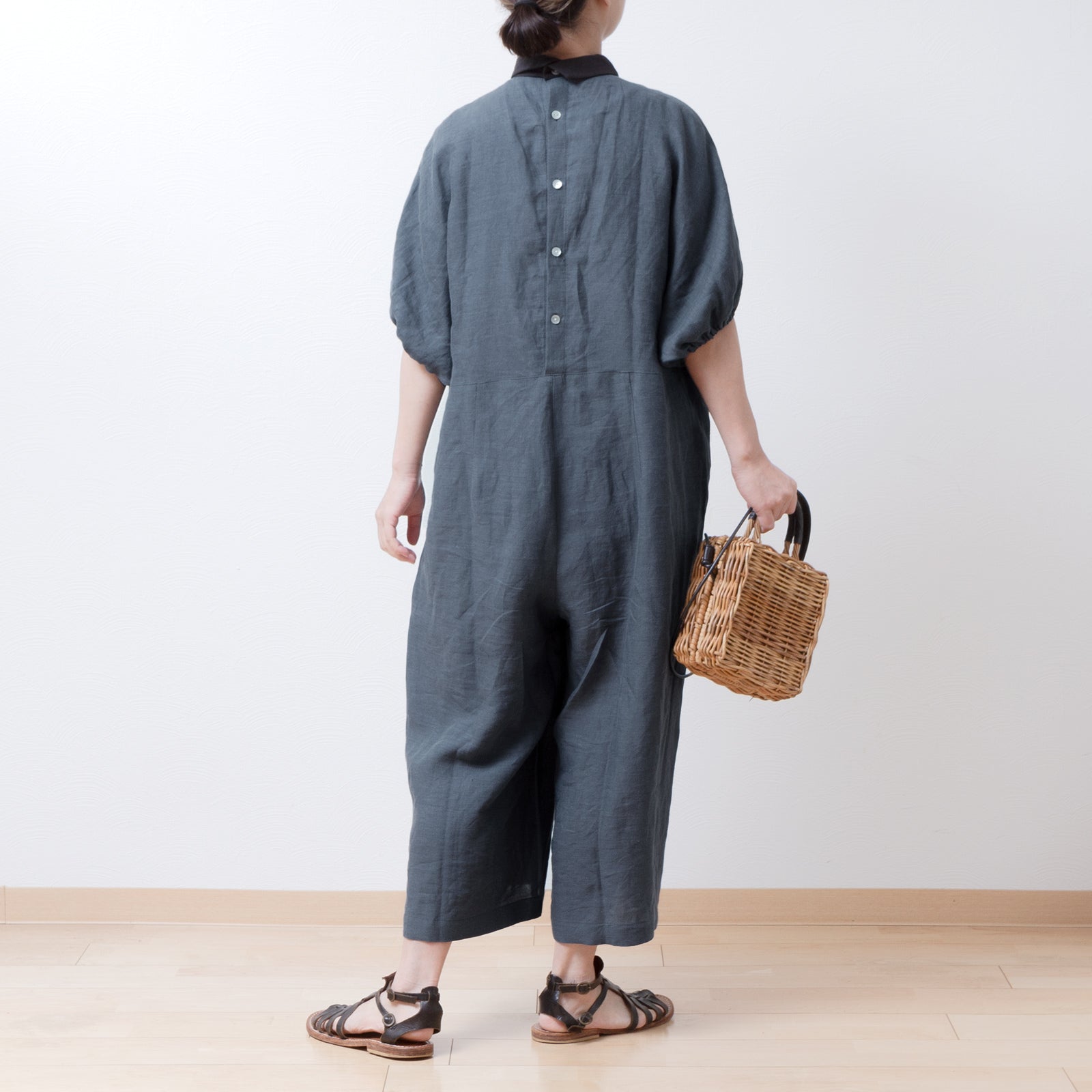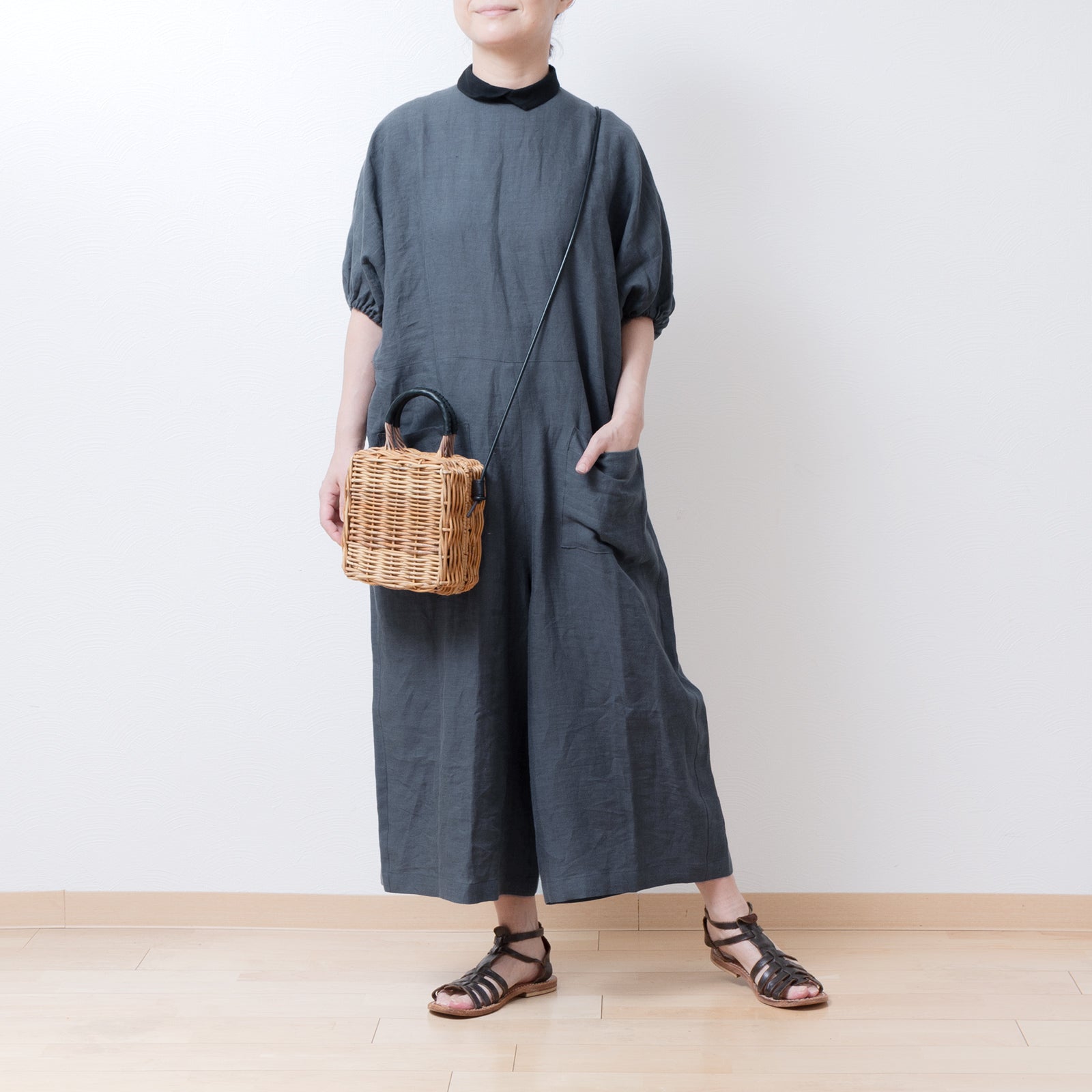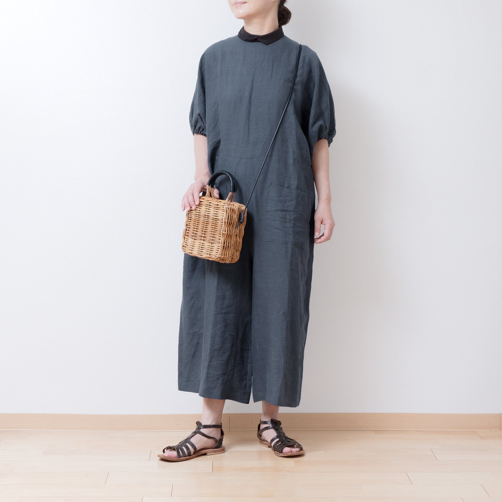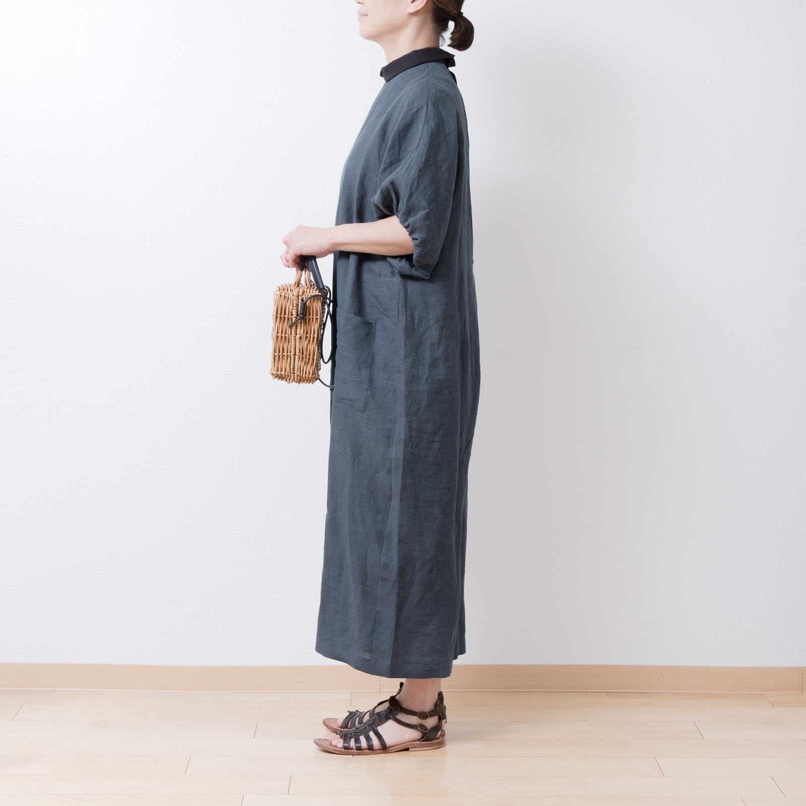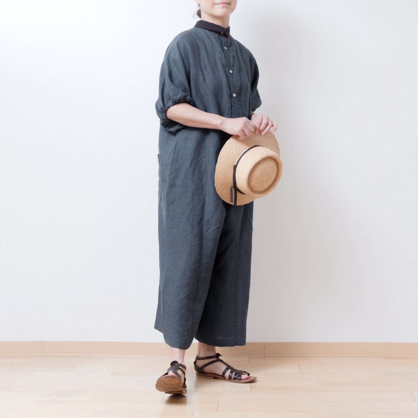 牧師領蝙蝠袖亞麻半袖連身衣/灰色
