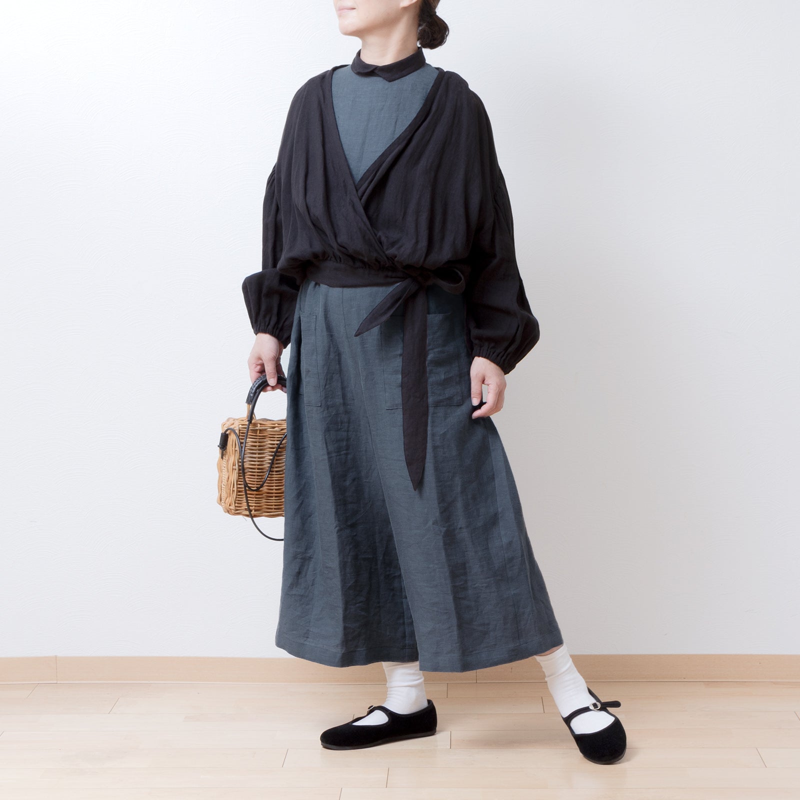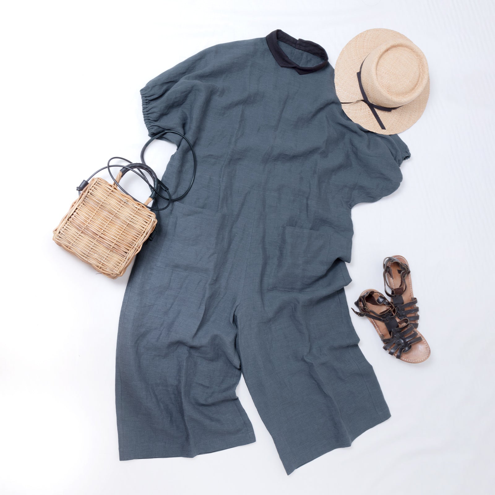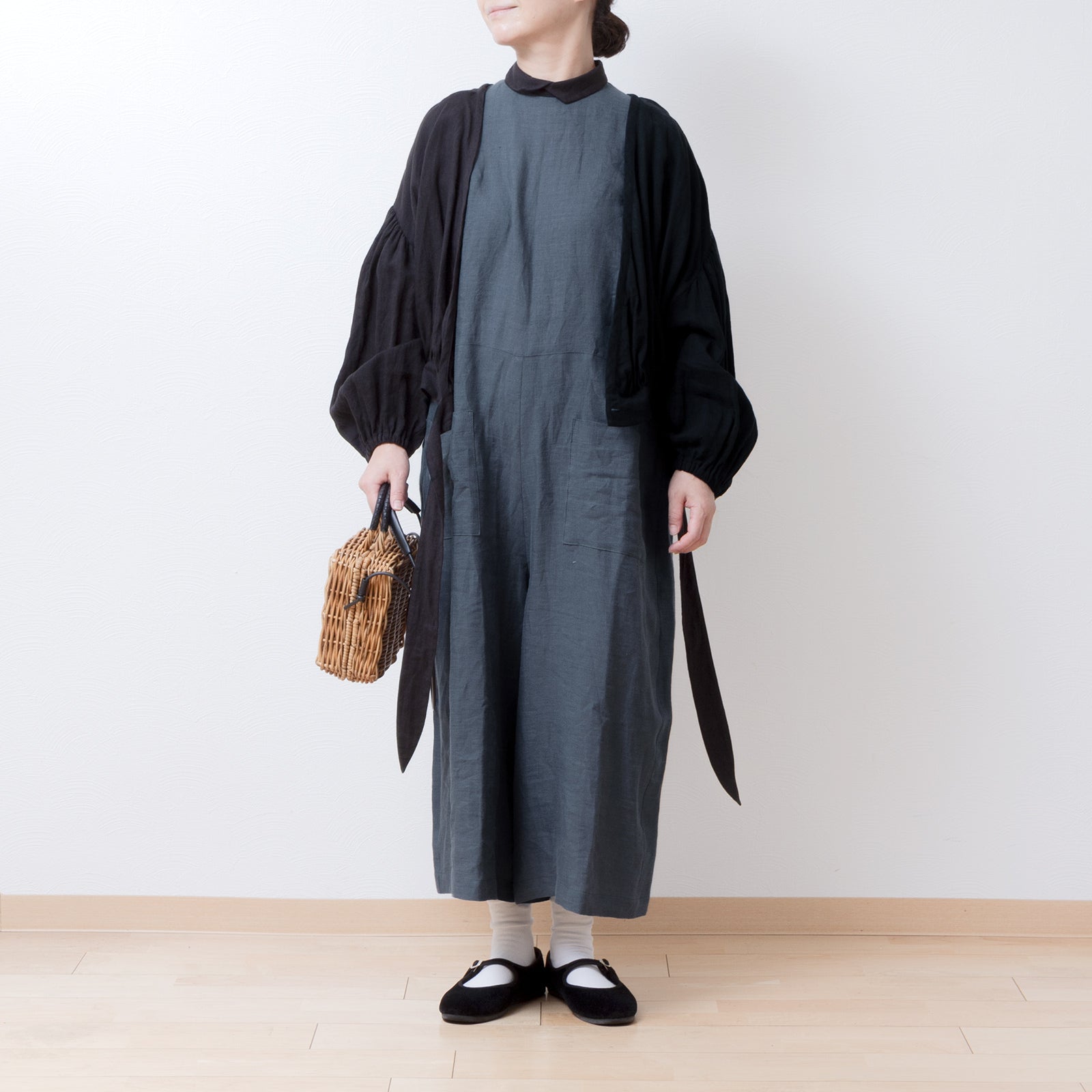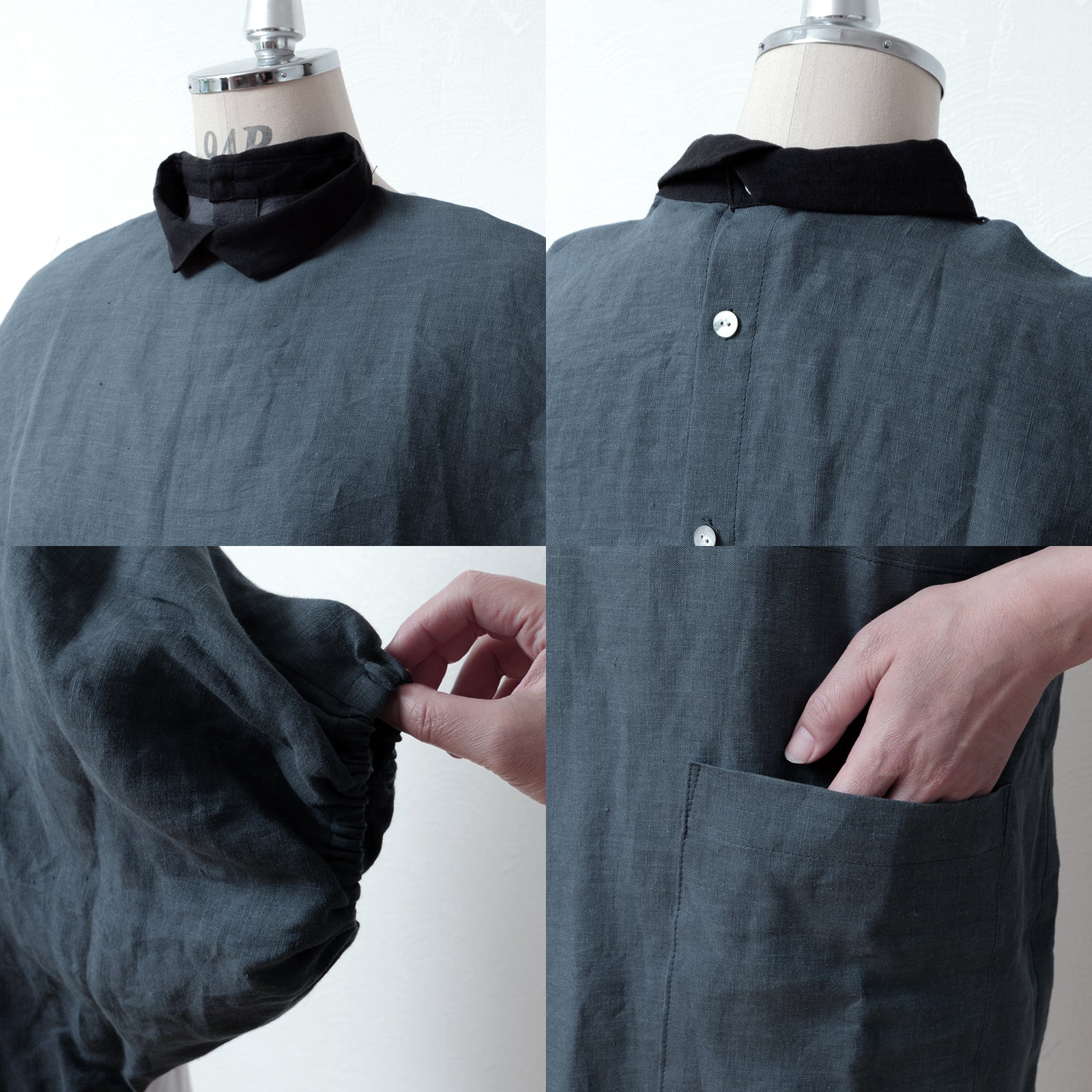 牧師領蝙蝠袖亞麻半袖連身衣/灰色