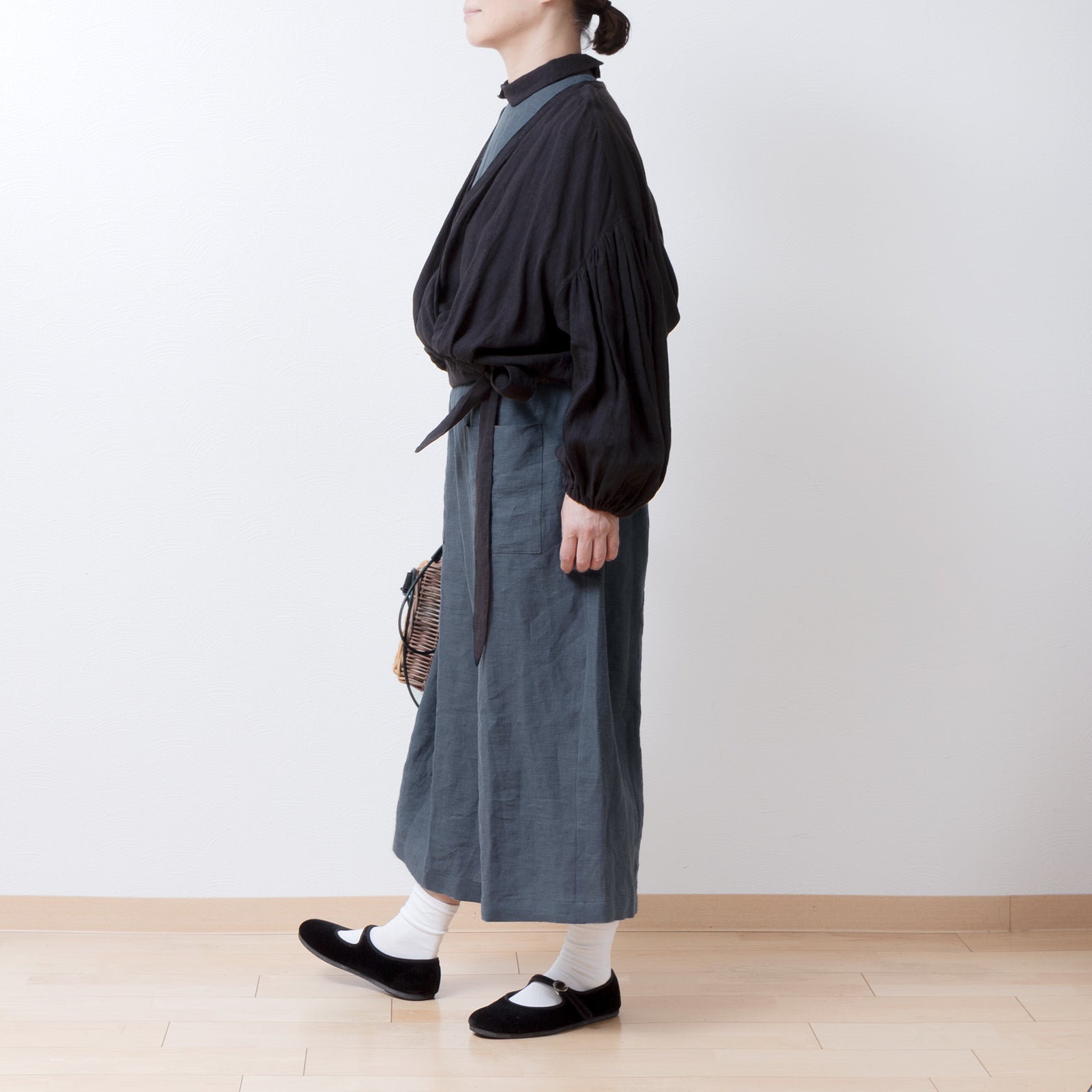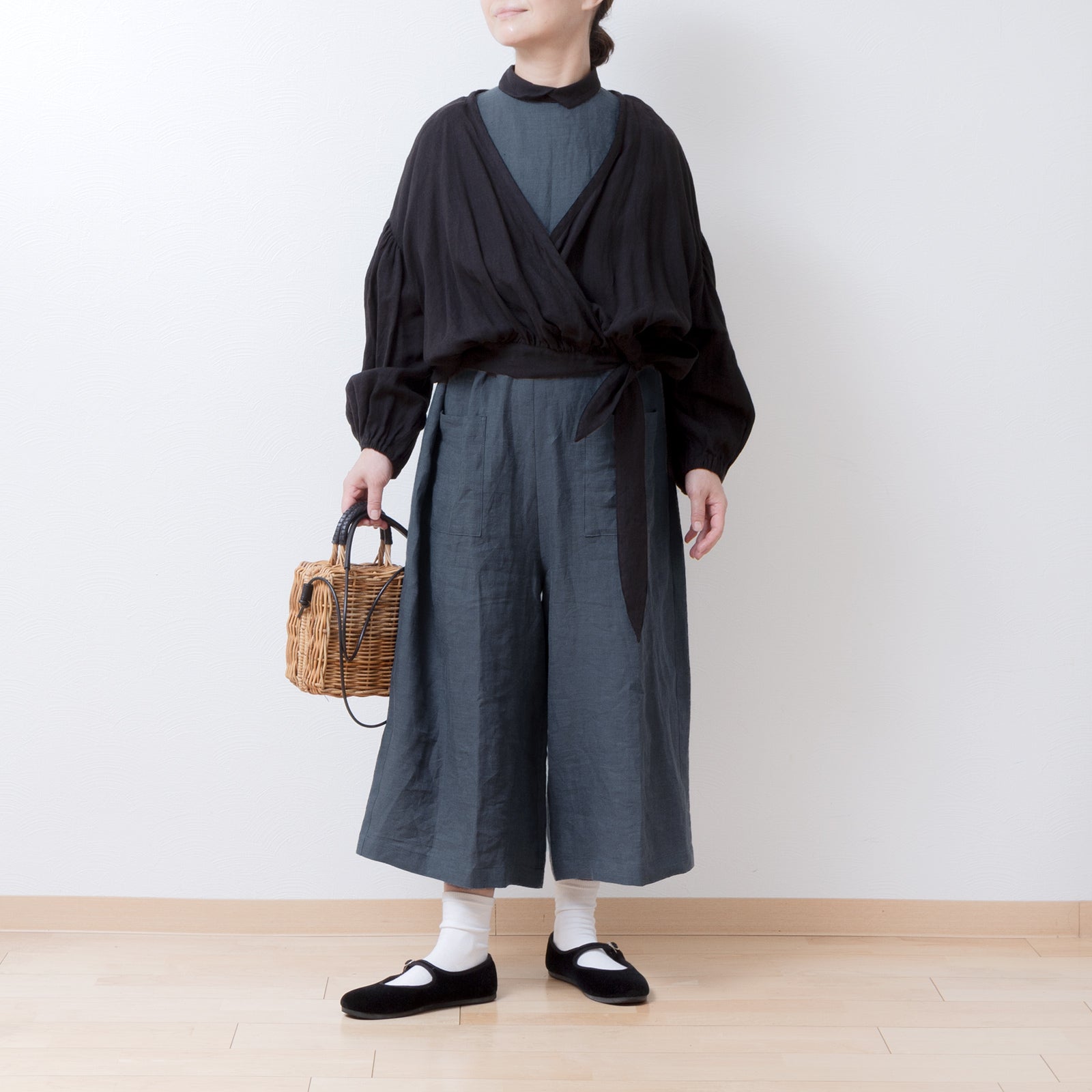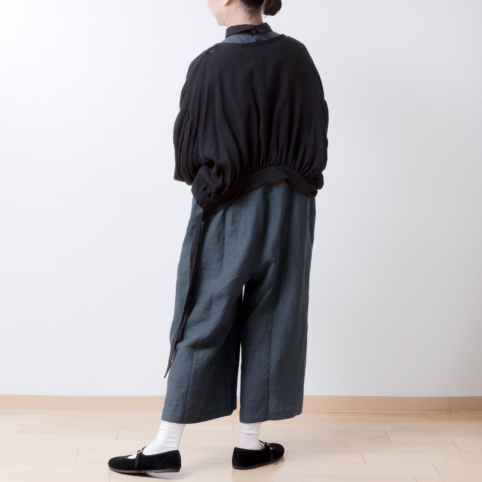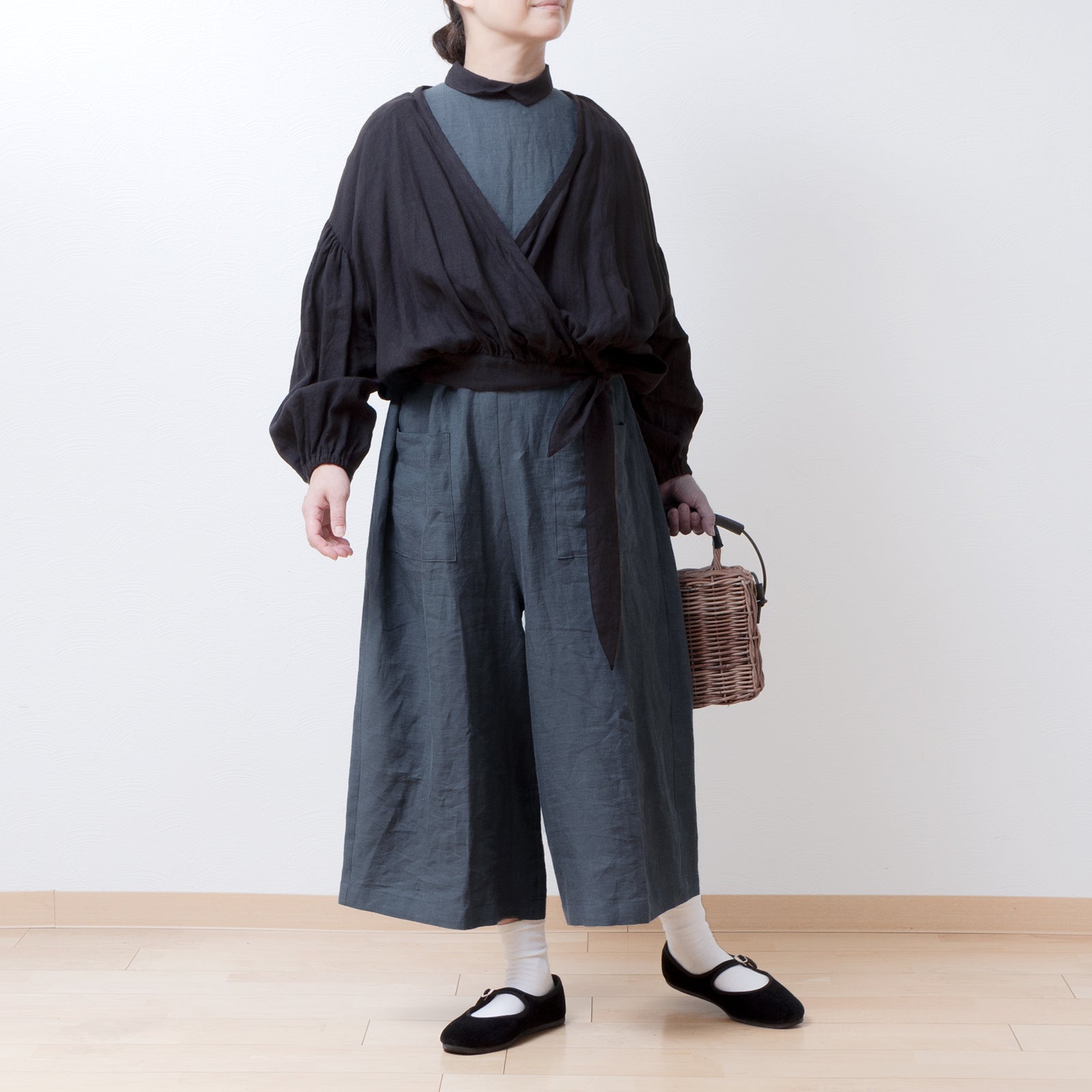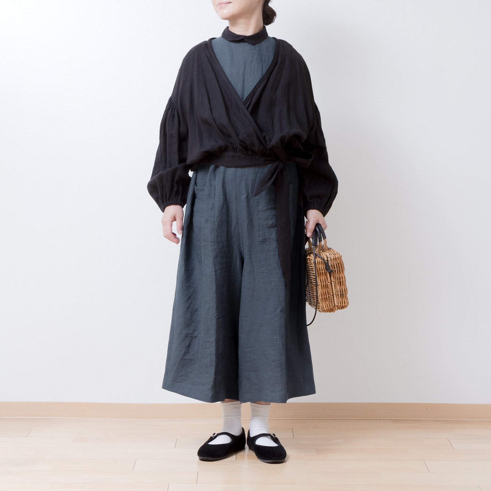 牧師領蝙蝠袖亞麻半袖連身衣/灰色