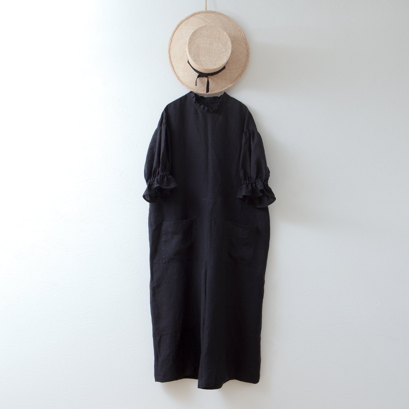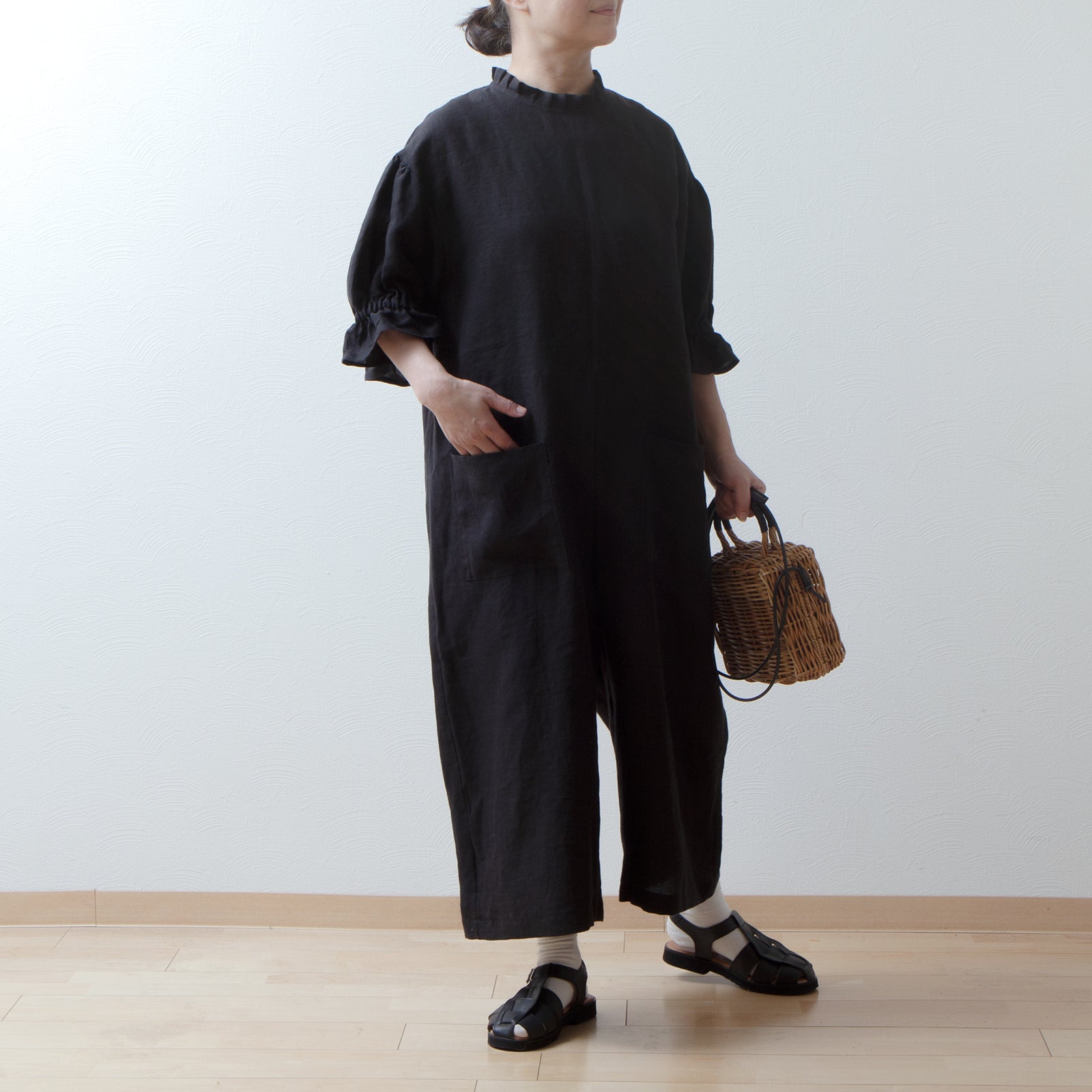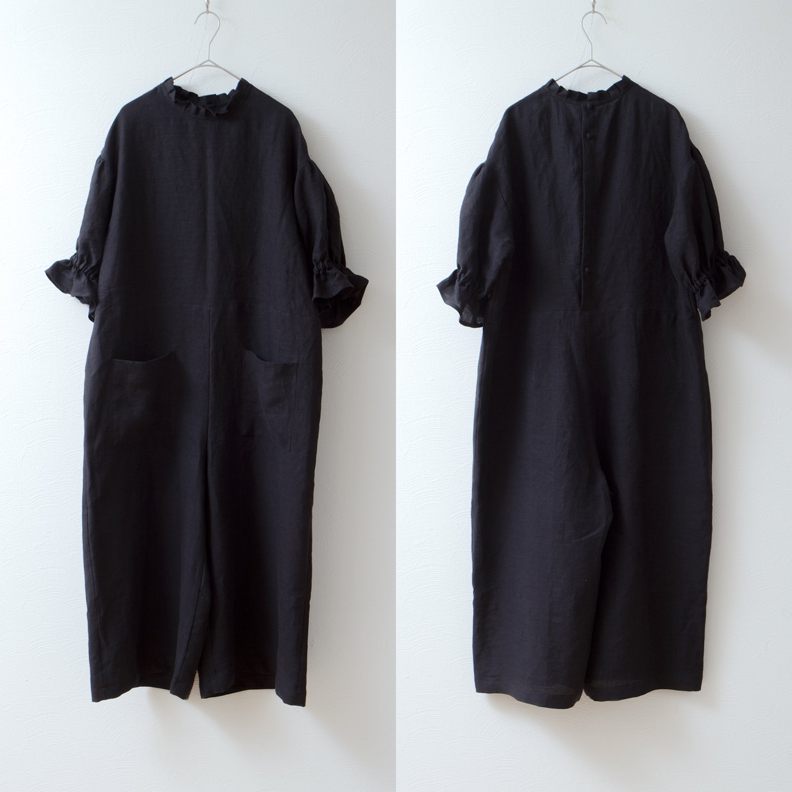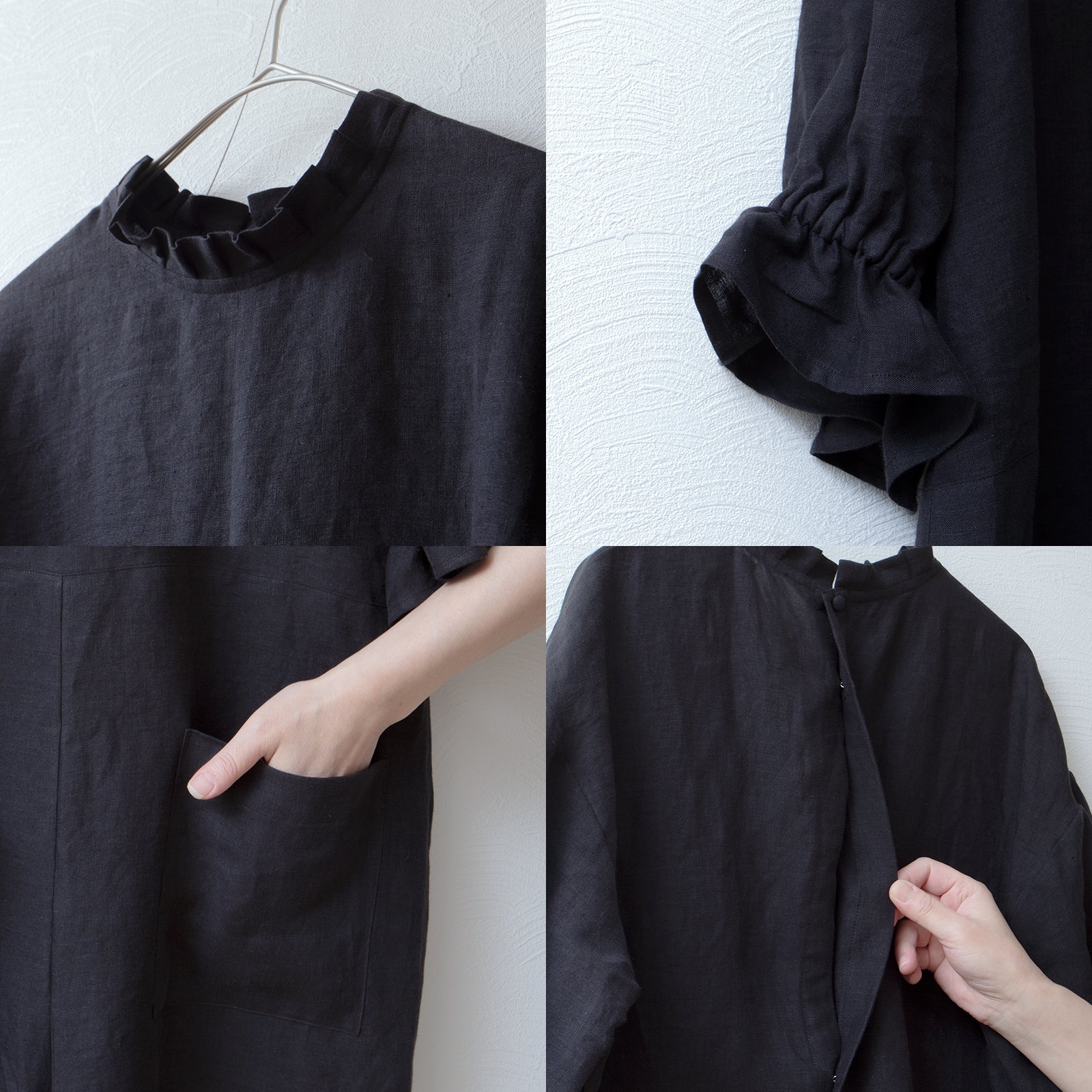 褶邊領褶皺半袖亞麻連身衣/黑色