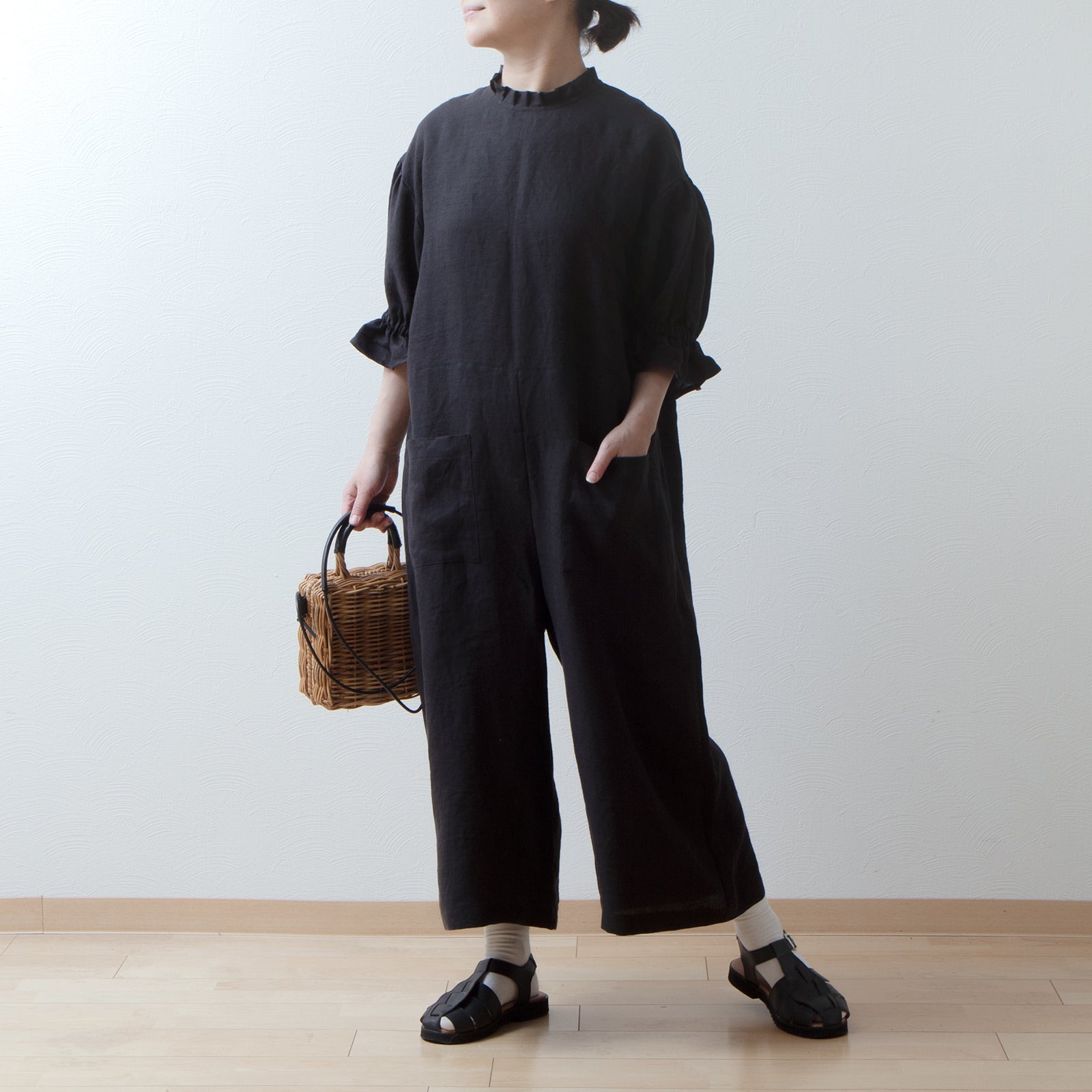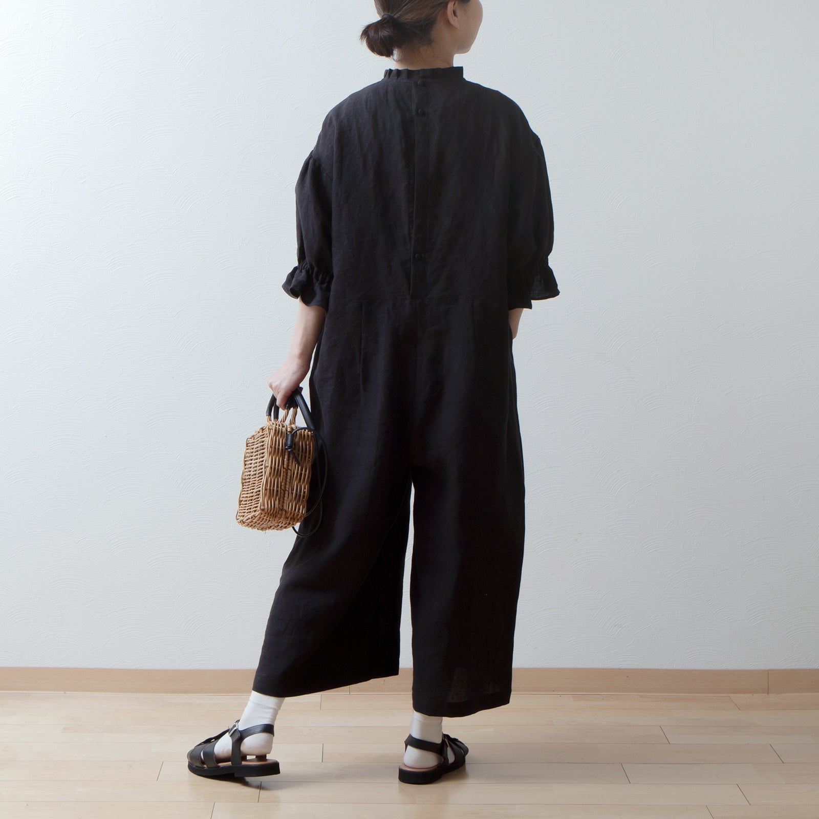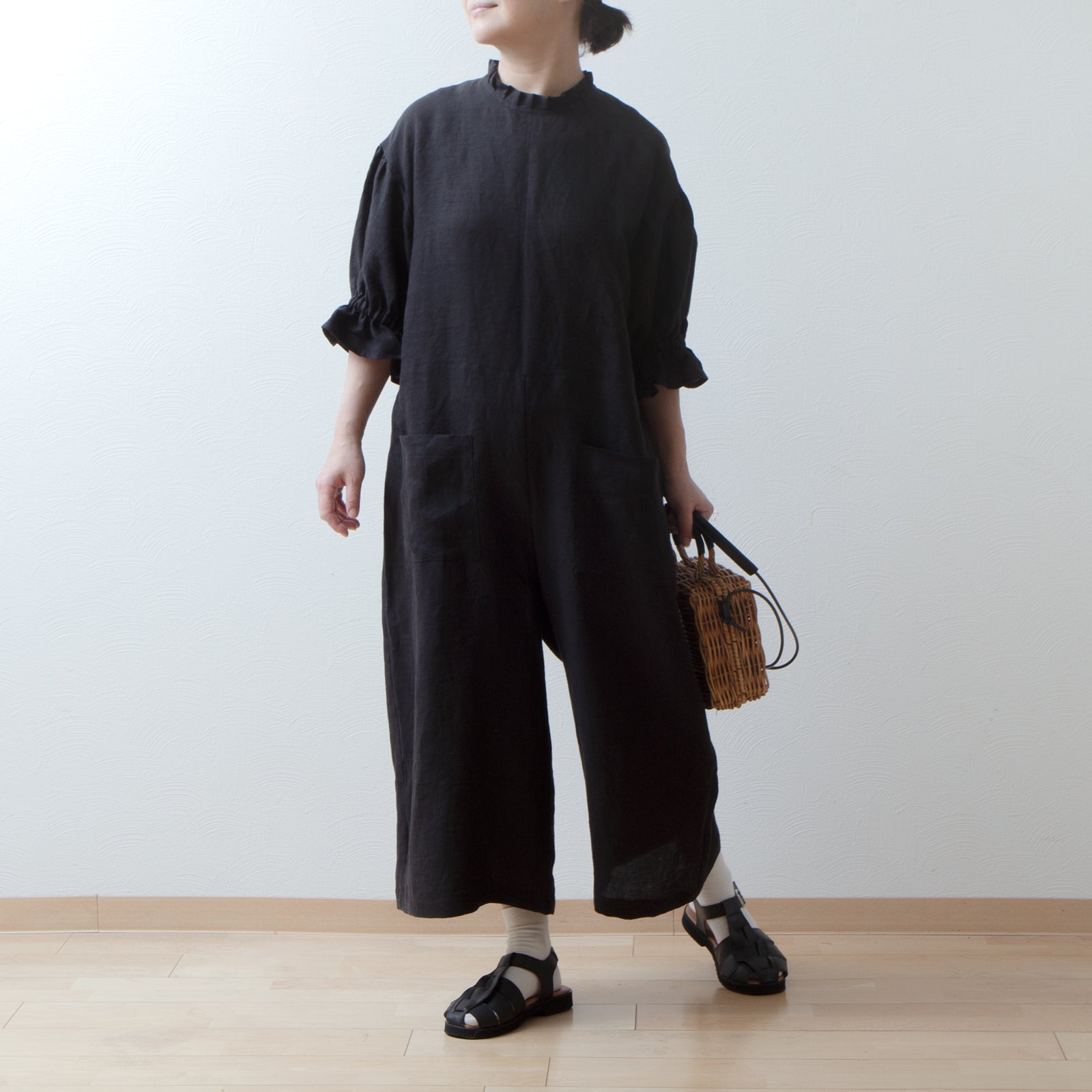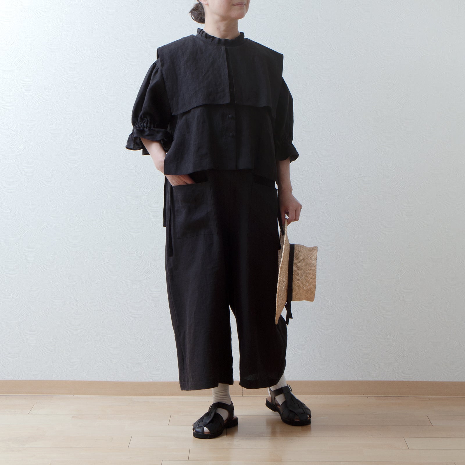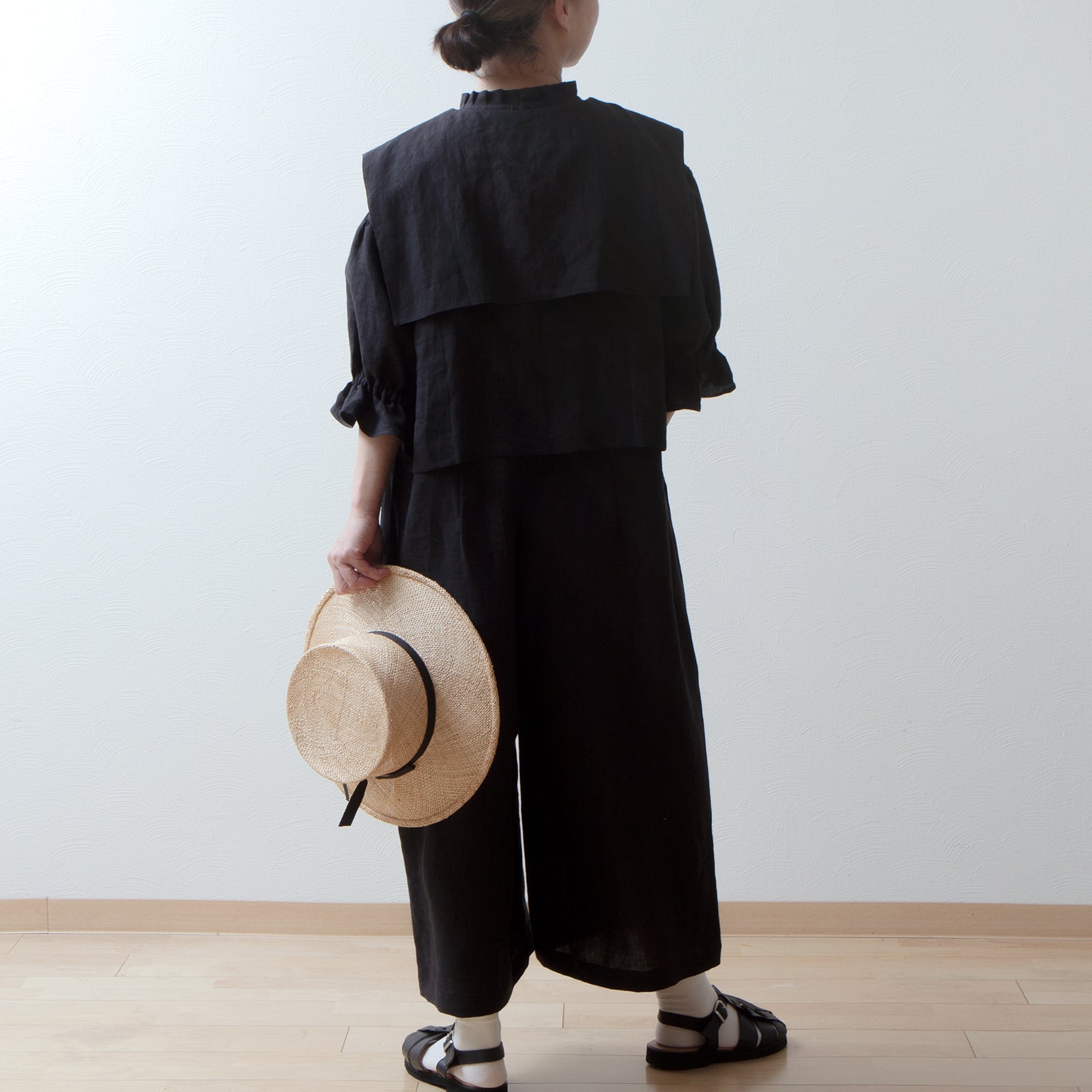 褶邊領褶皺半袖亞麻連身衣/黑色