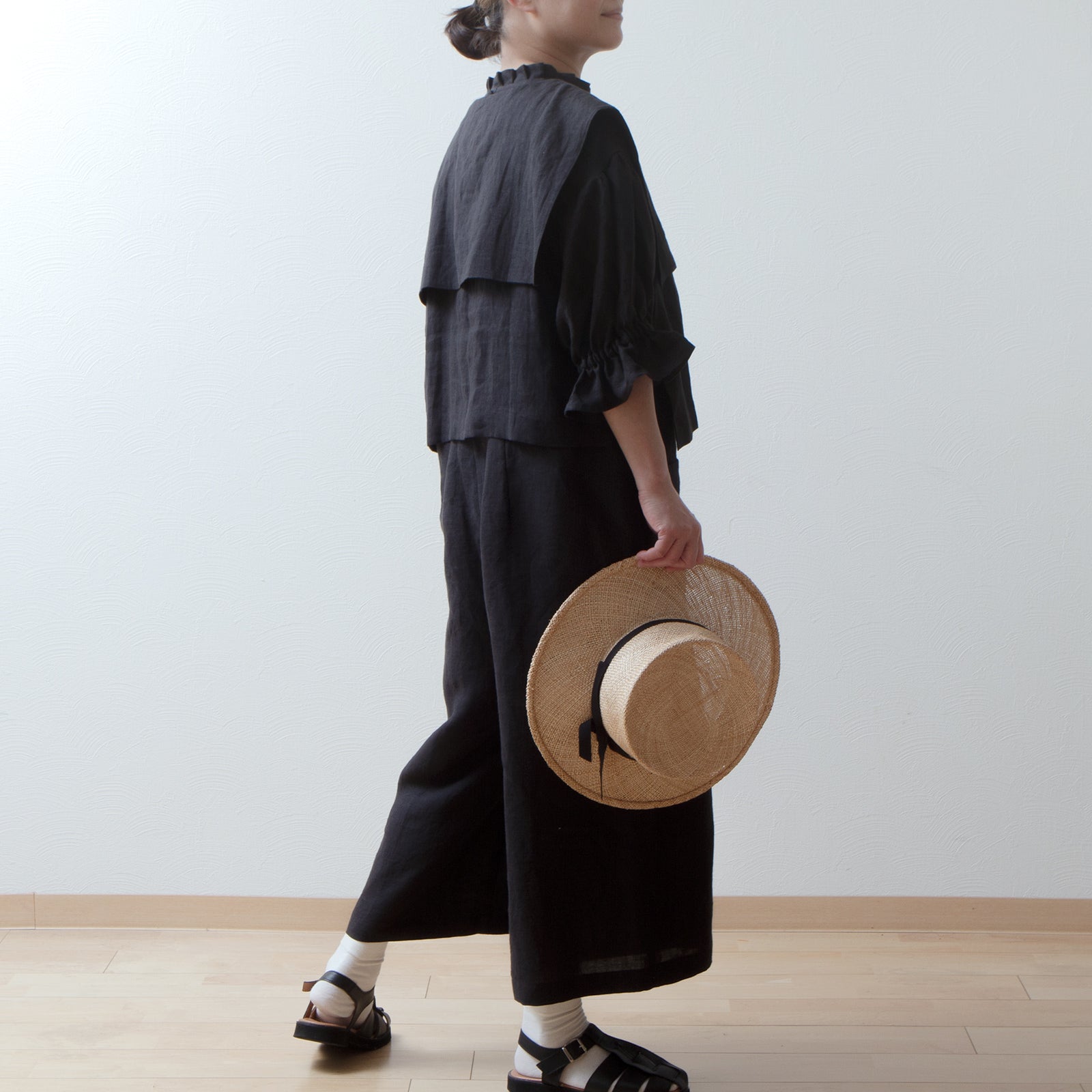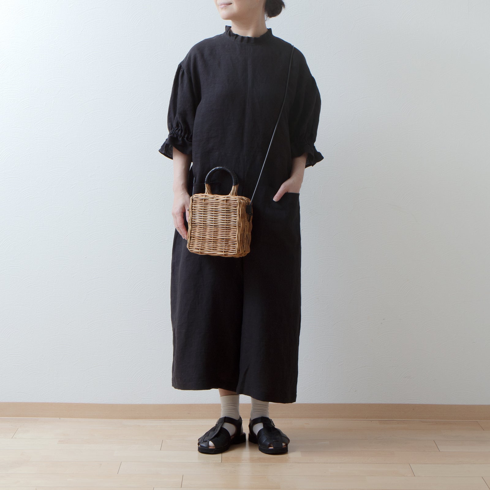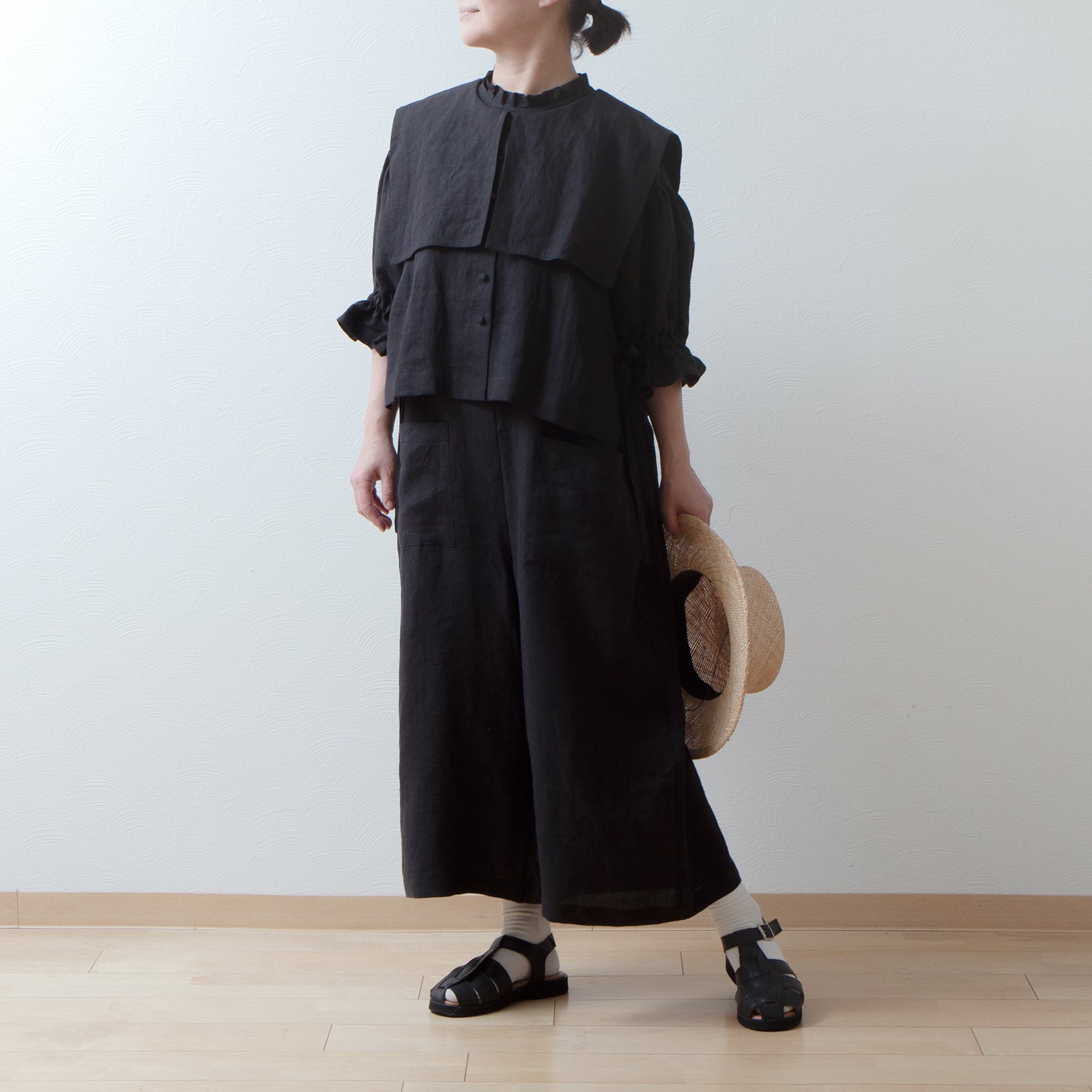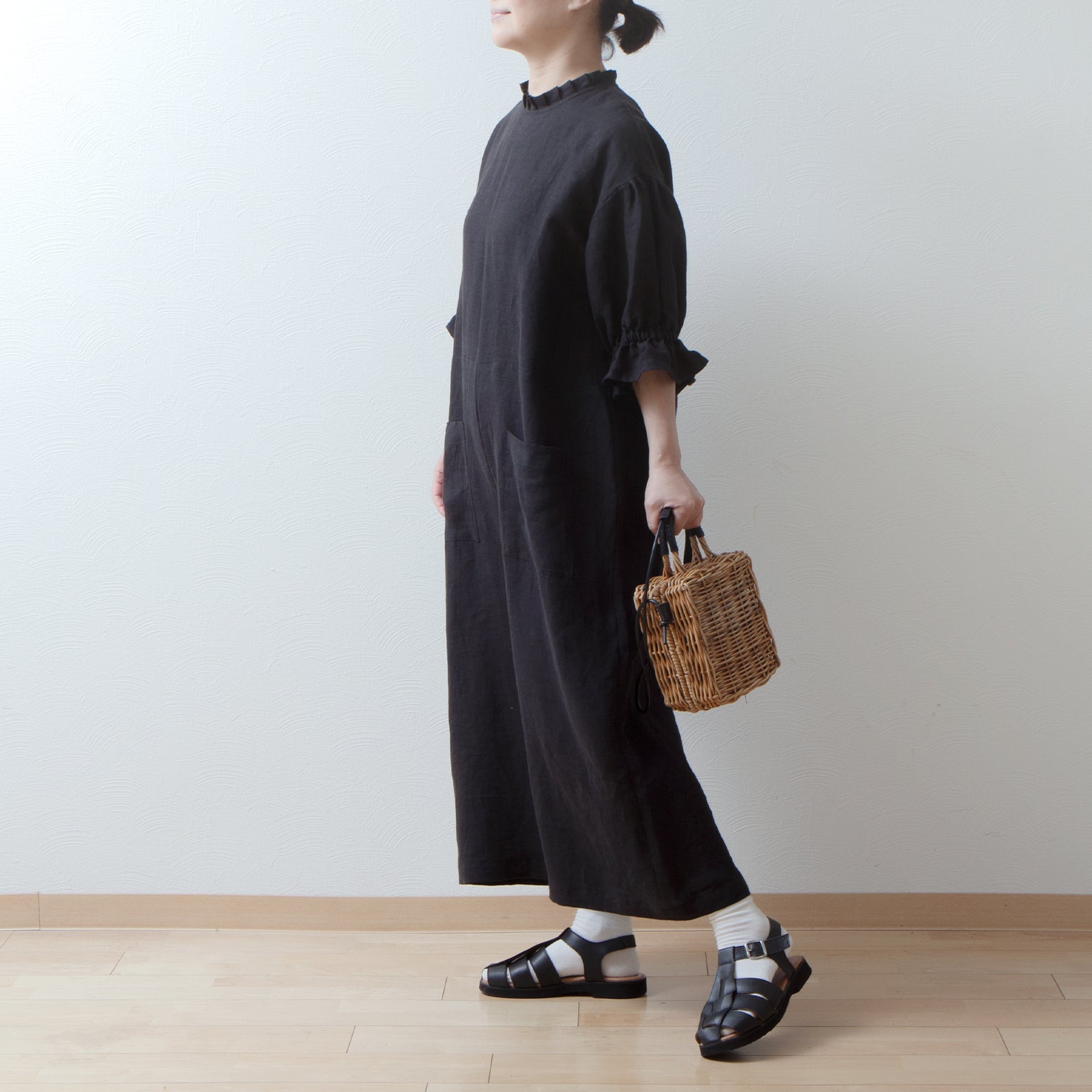 褶邊領褶皺半袖亞麻連身衣/黑色