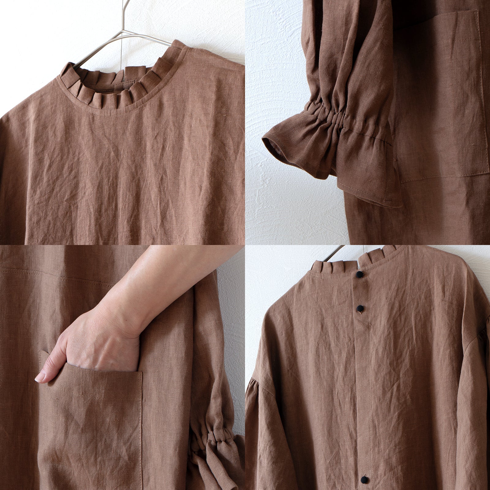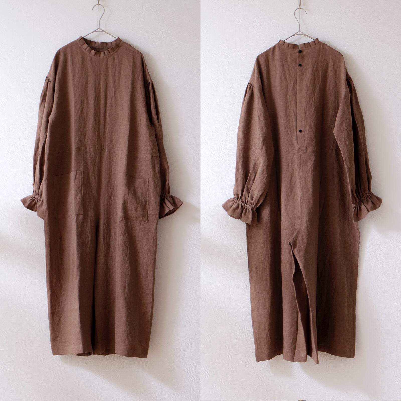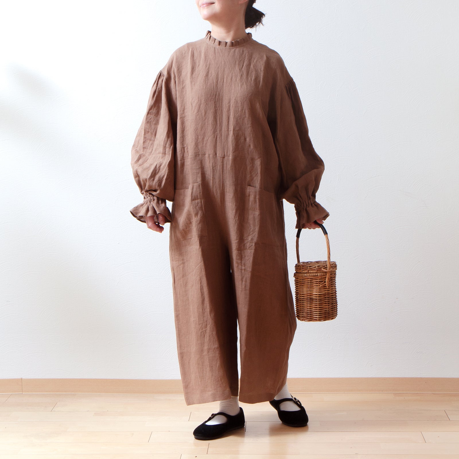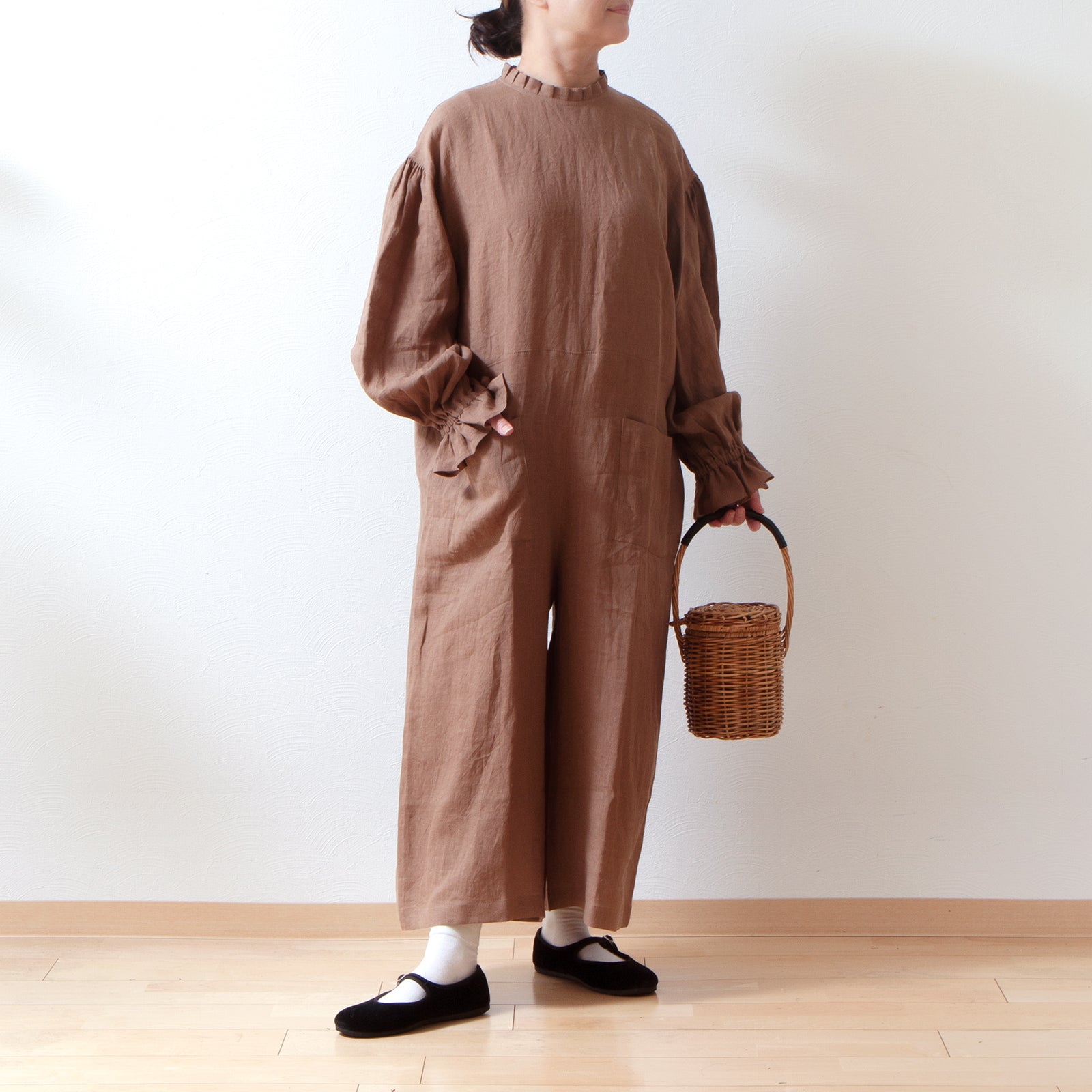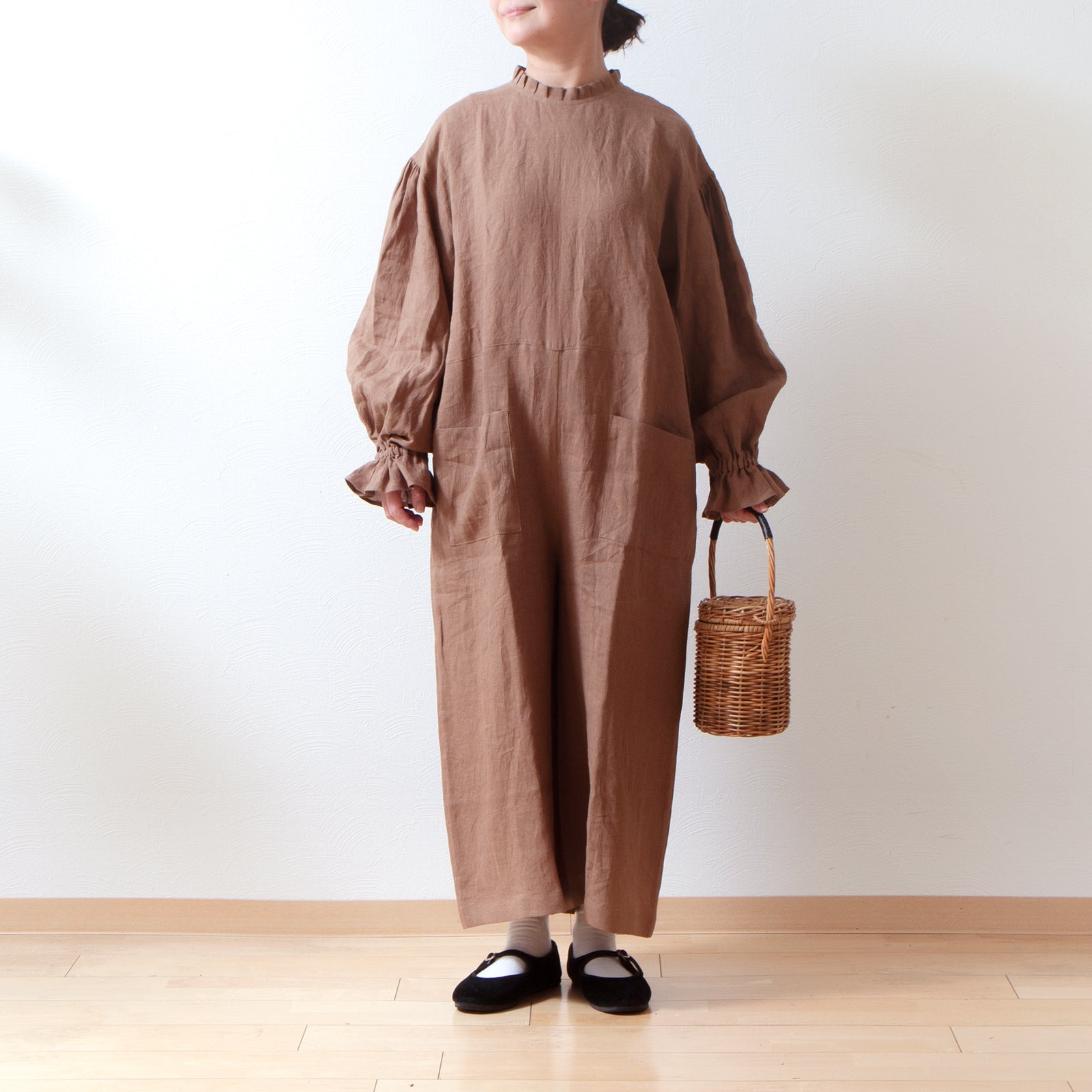 褶邊領褶皺長袖亞麻連身衣/駝色
