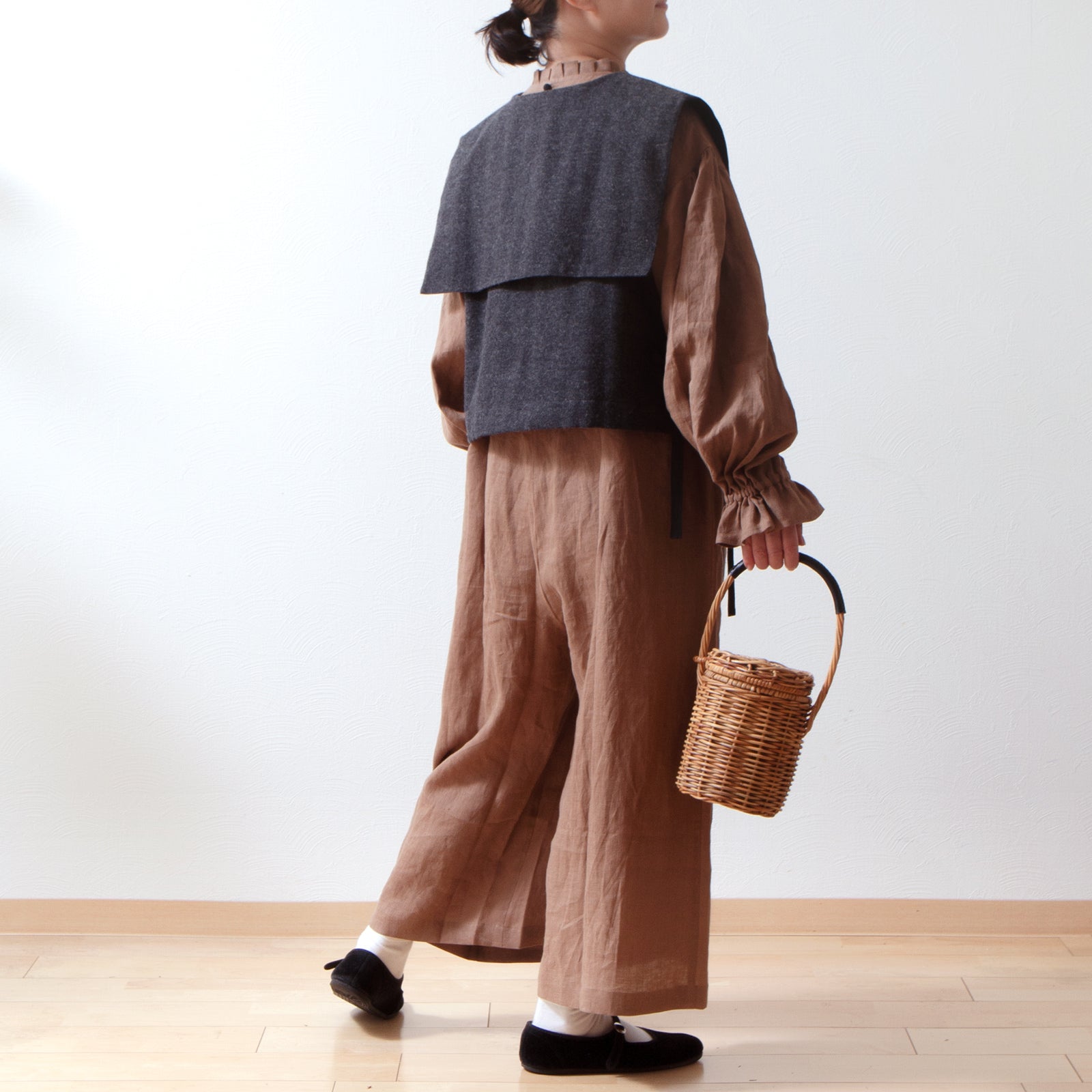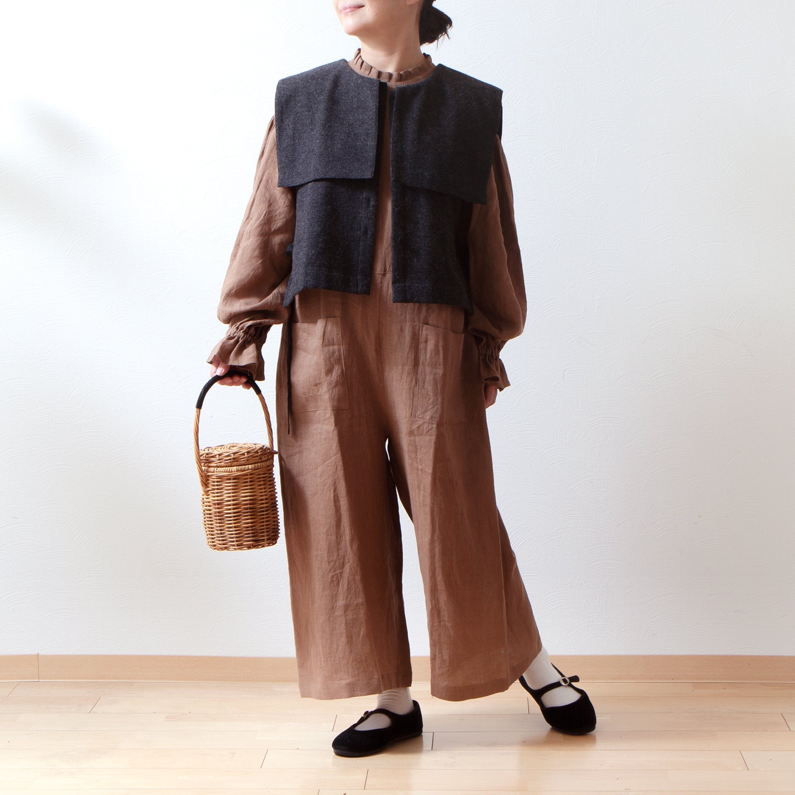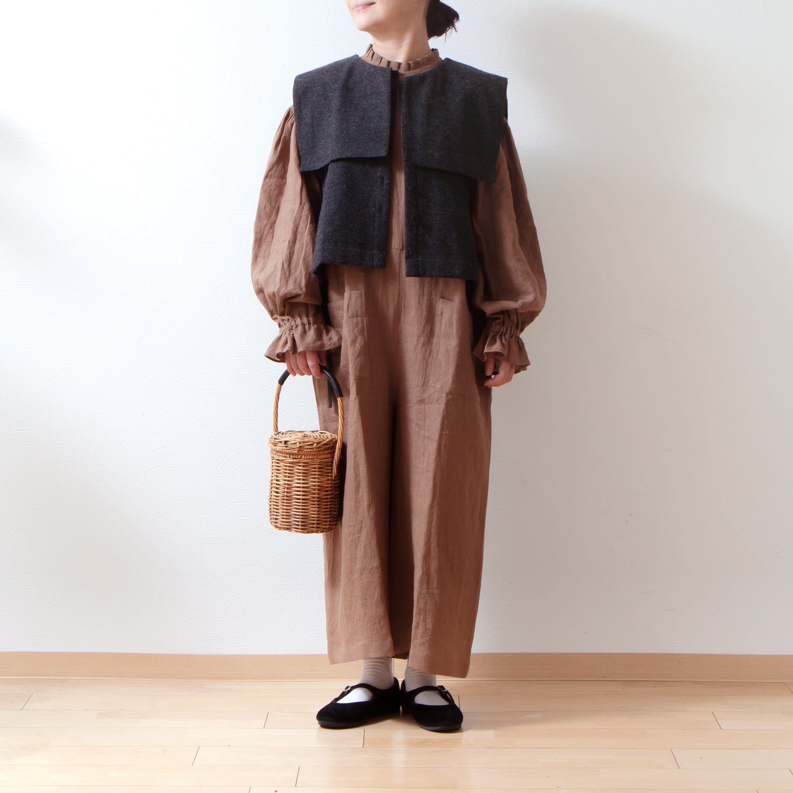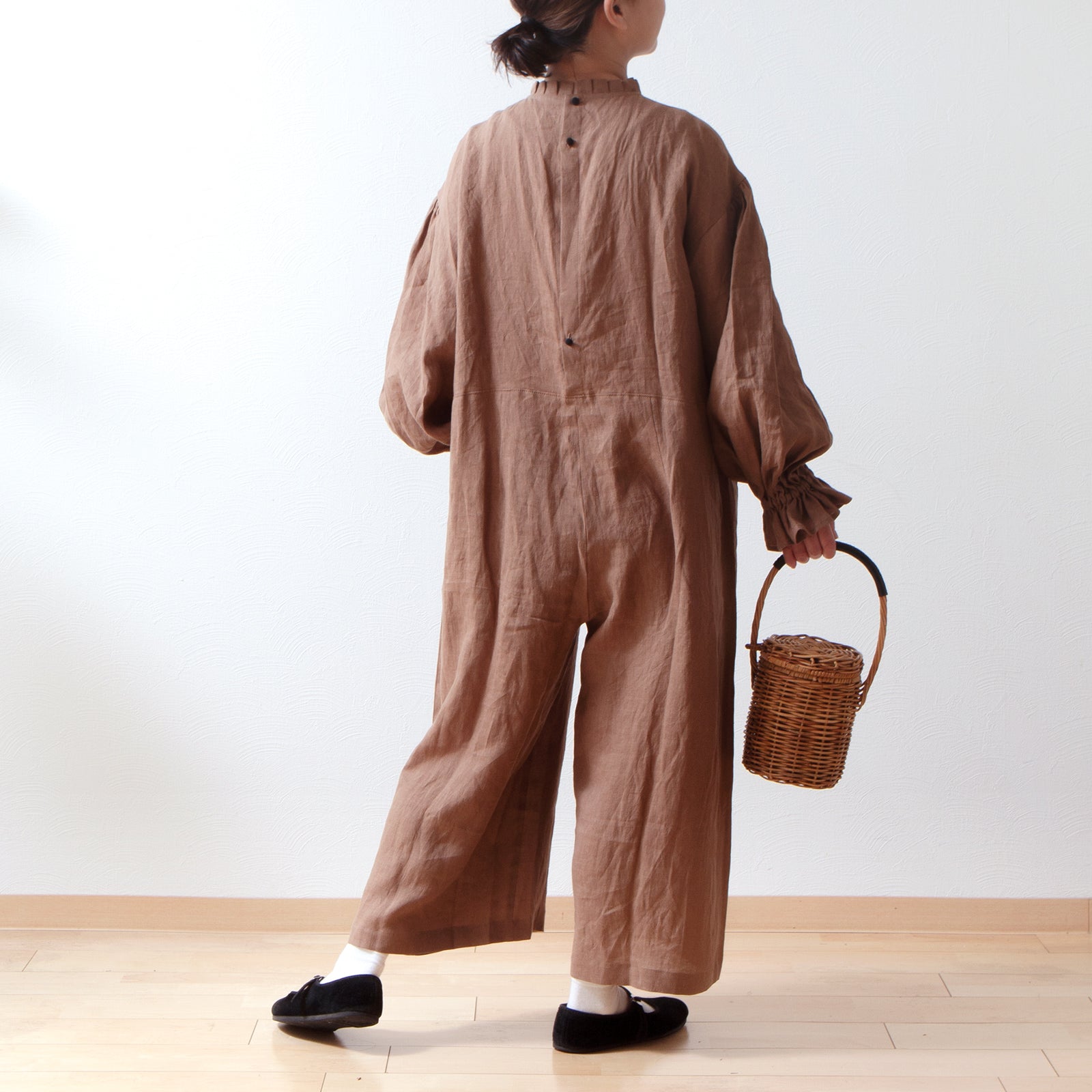 褶邊領褶皺長袖亞麻連身衣/駝色