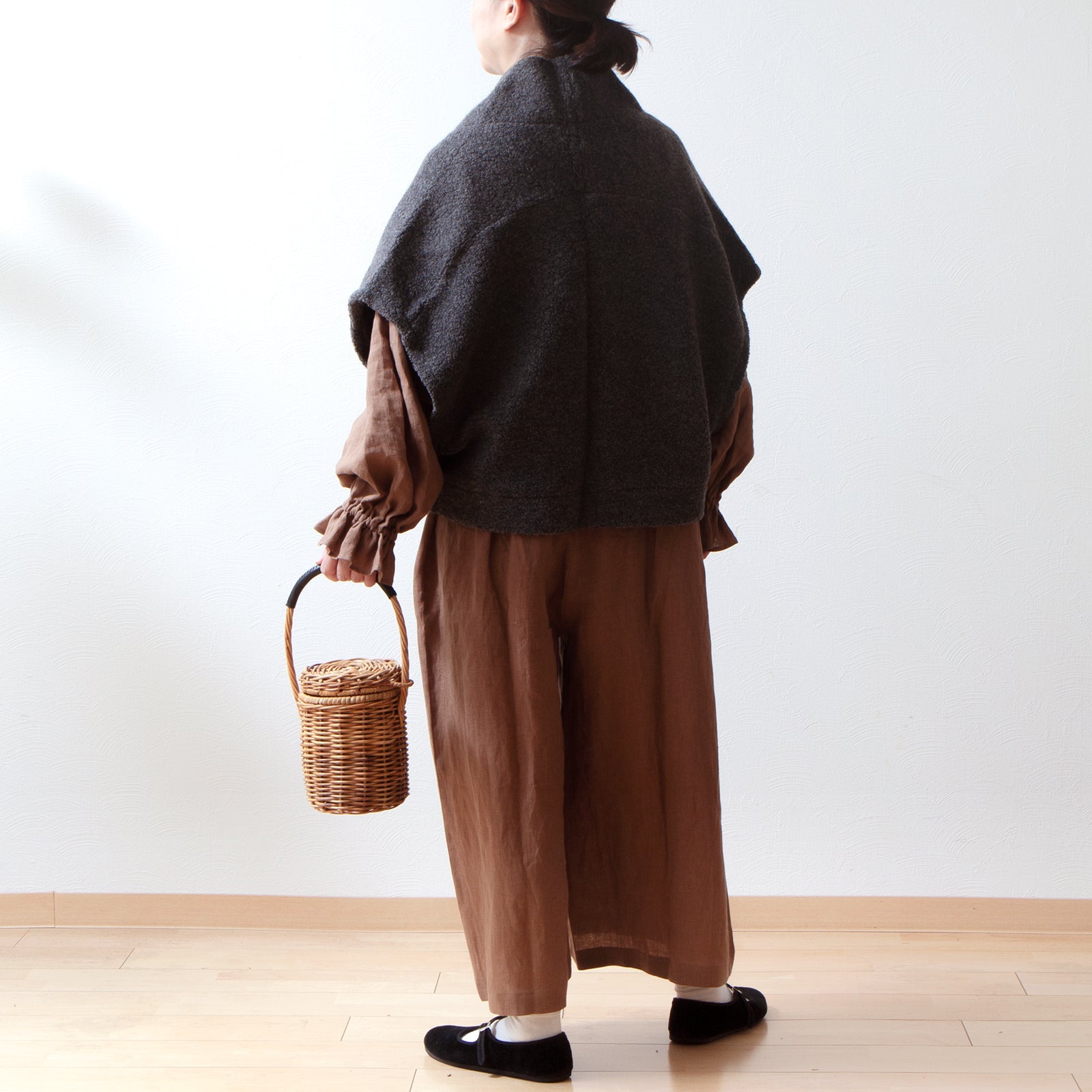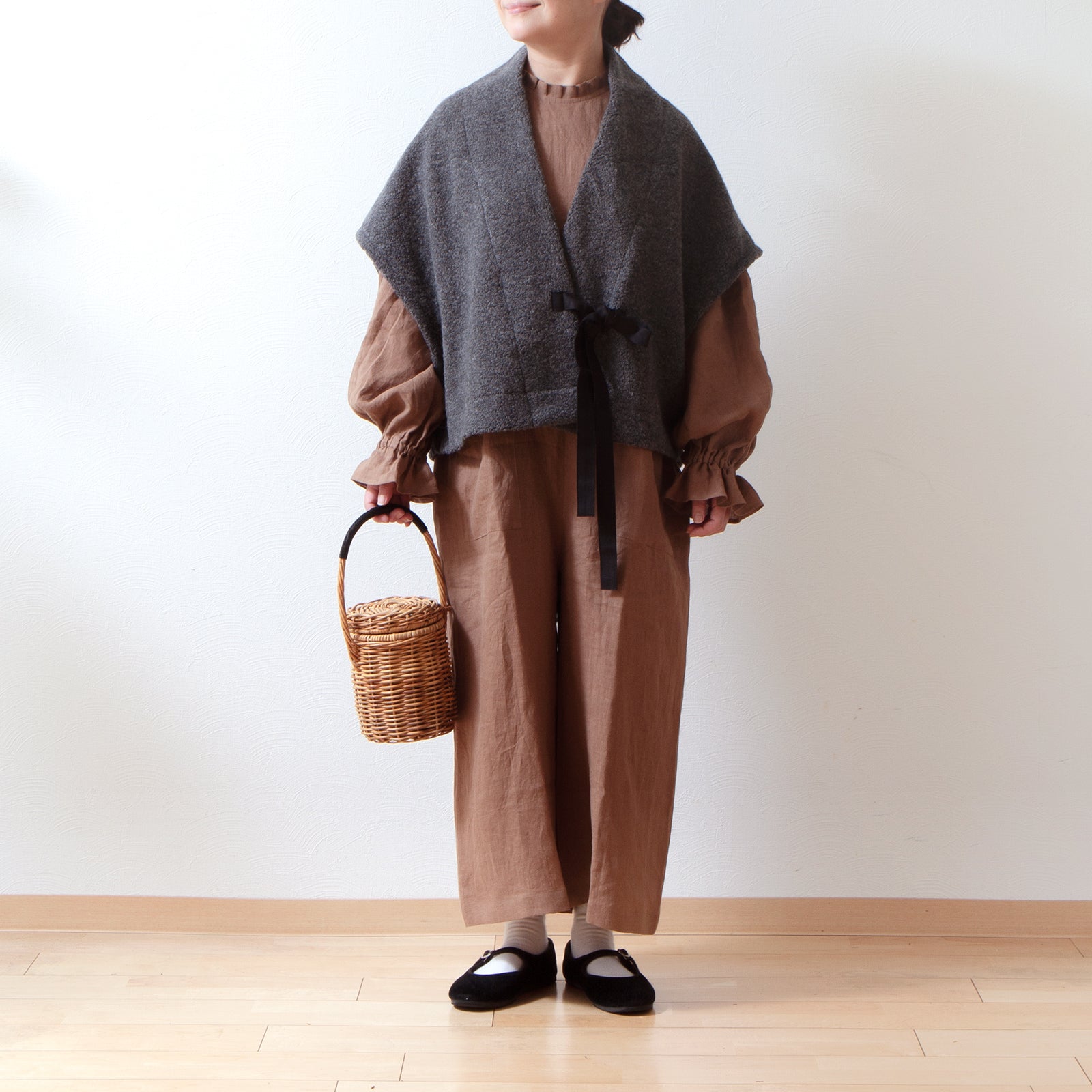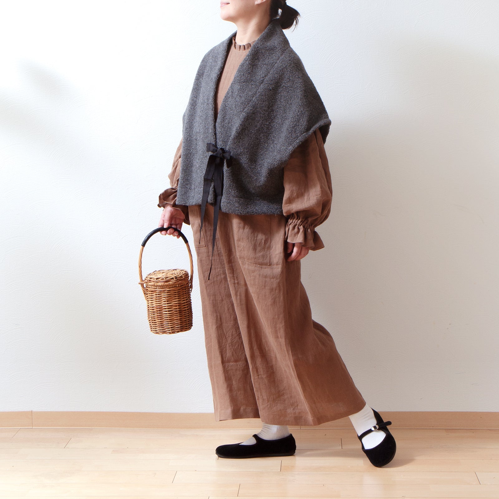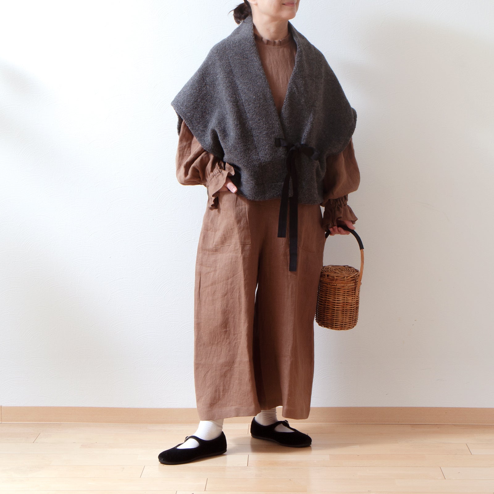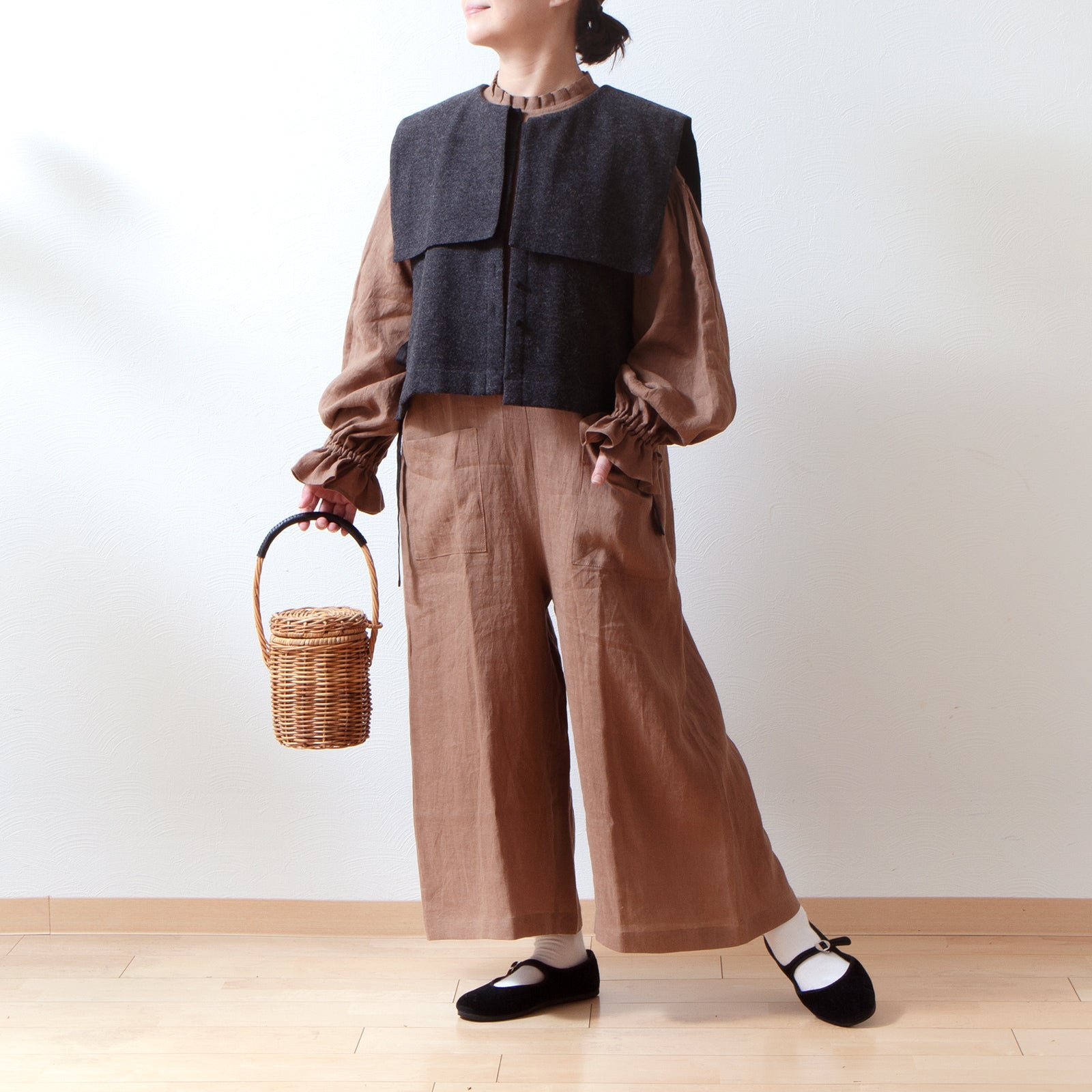 褶邊領褶皺長袖亞麻連身衣/駝色