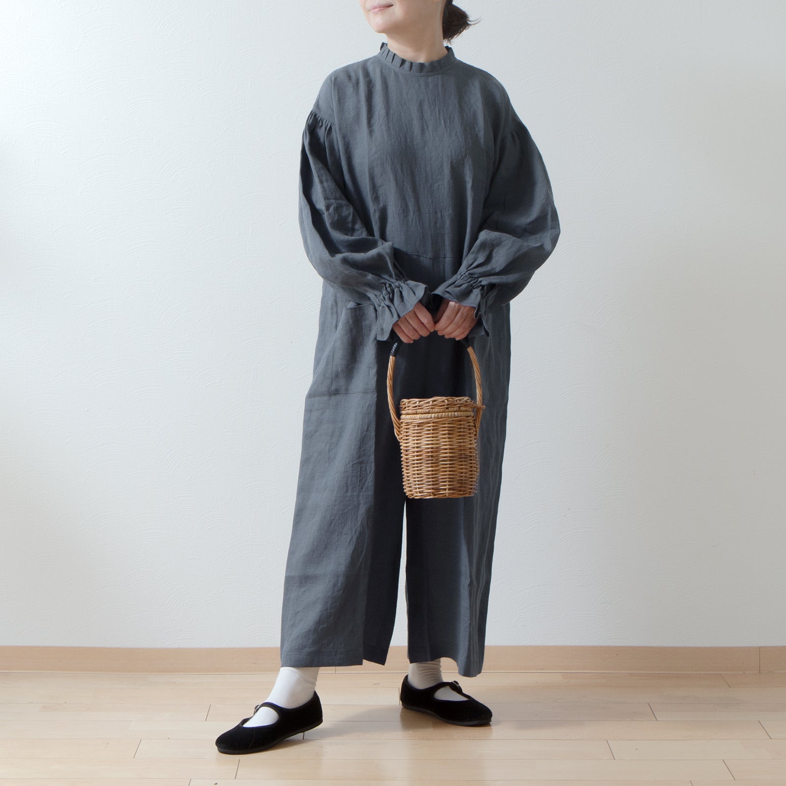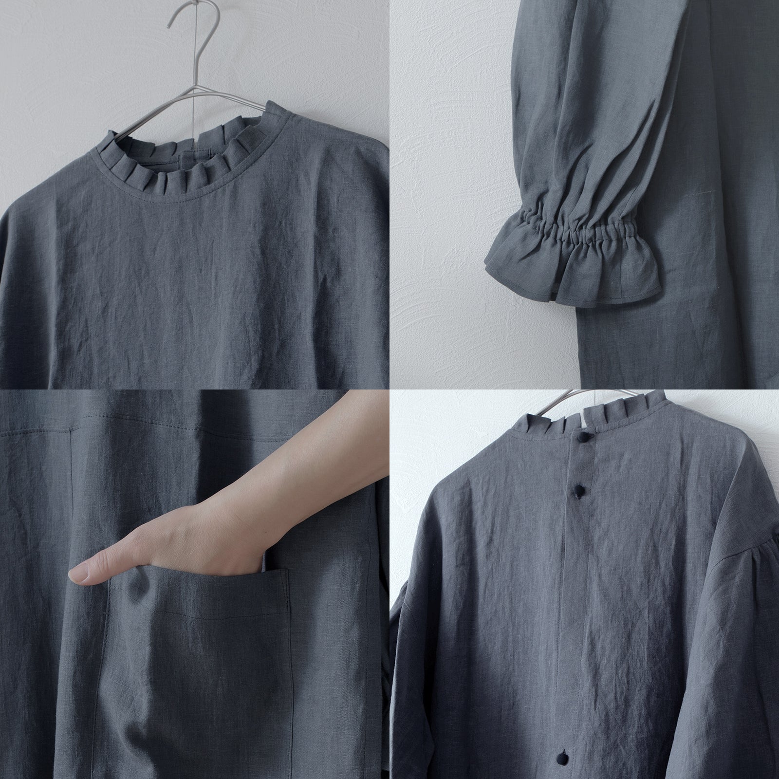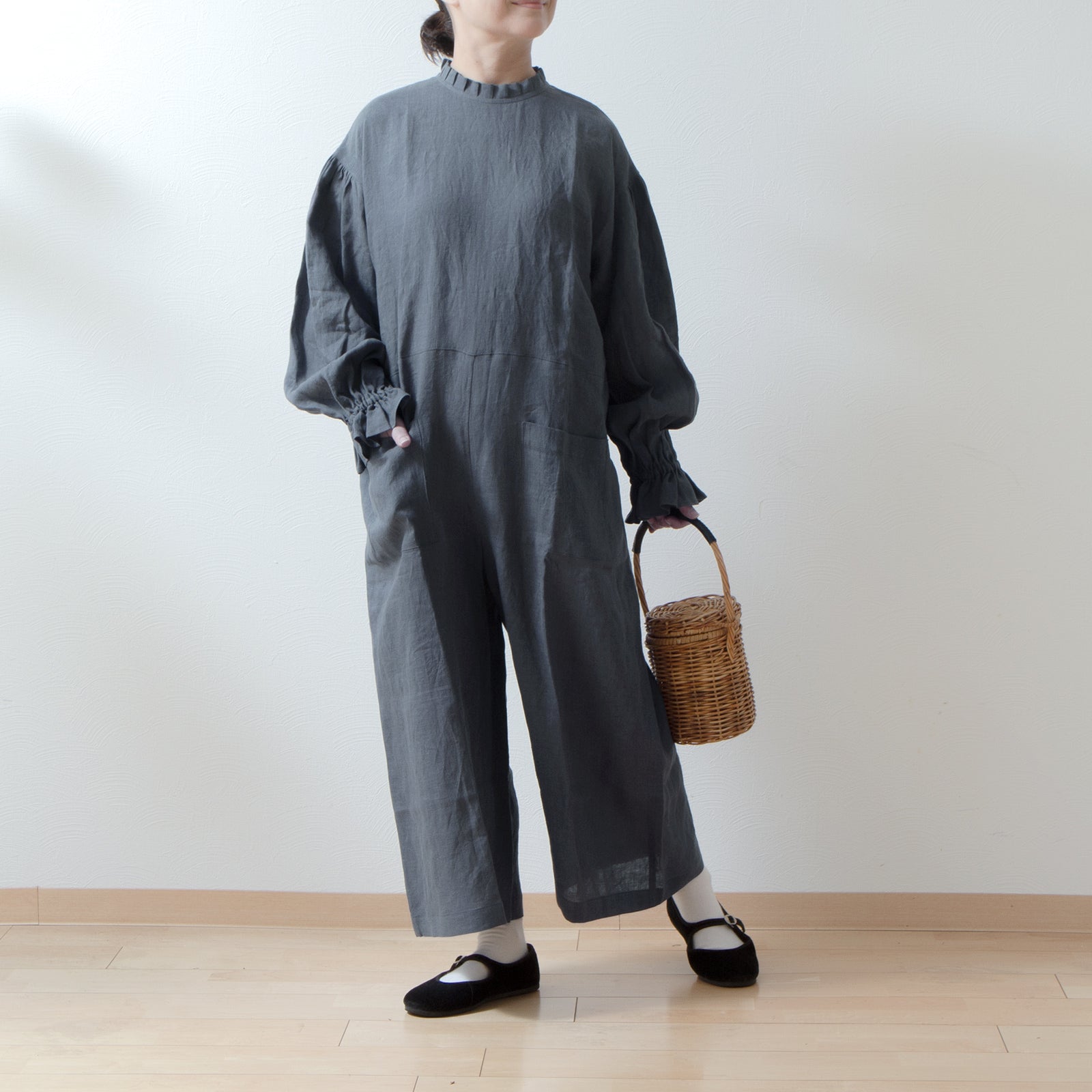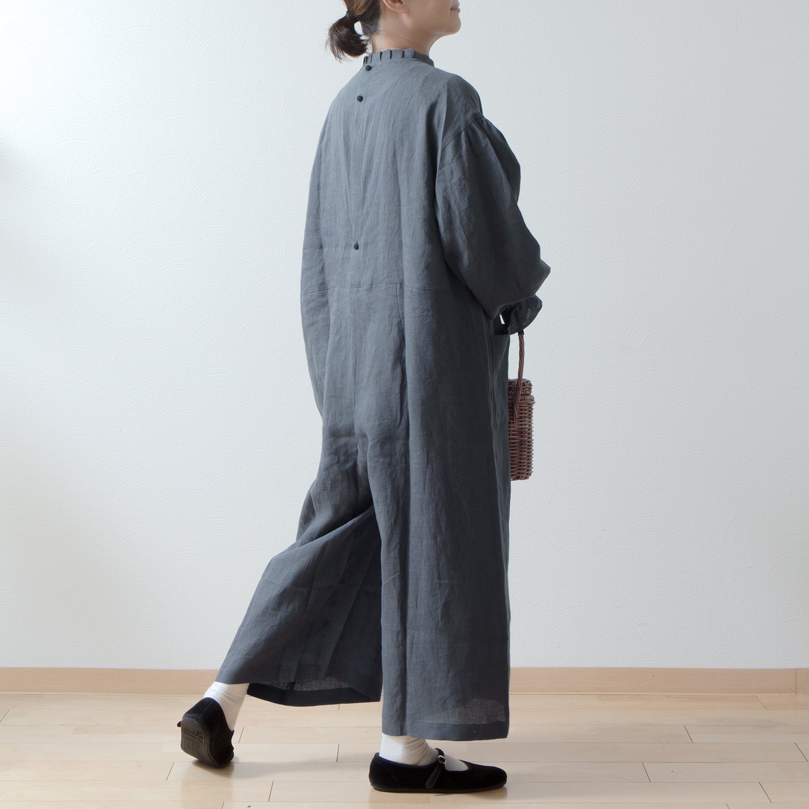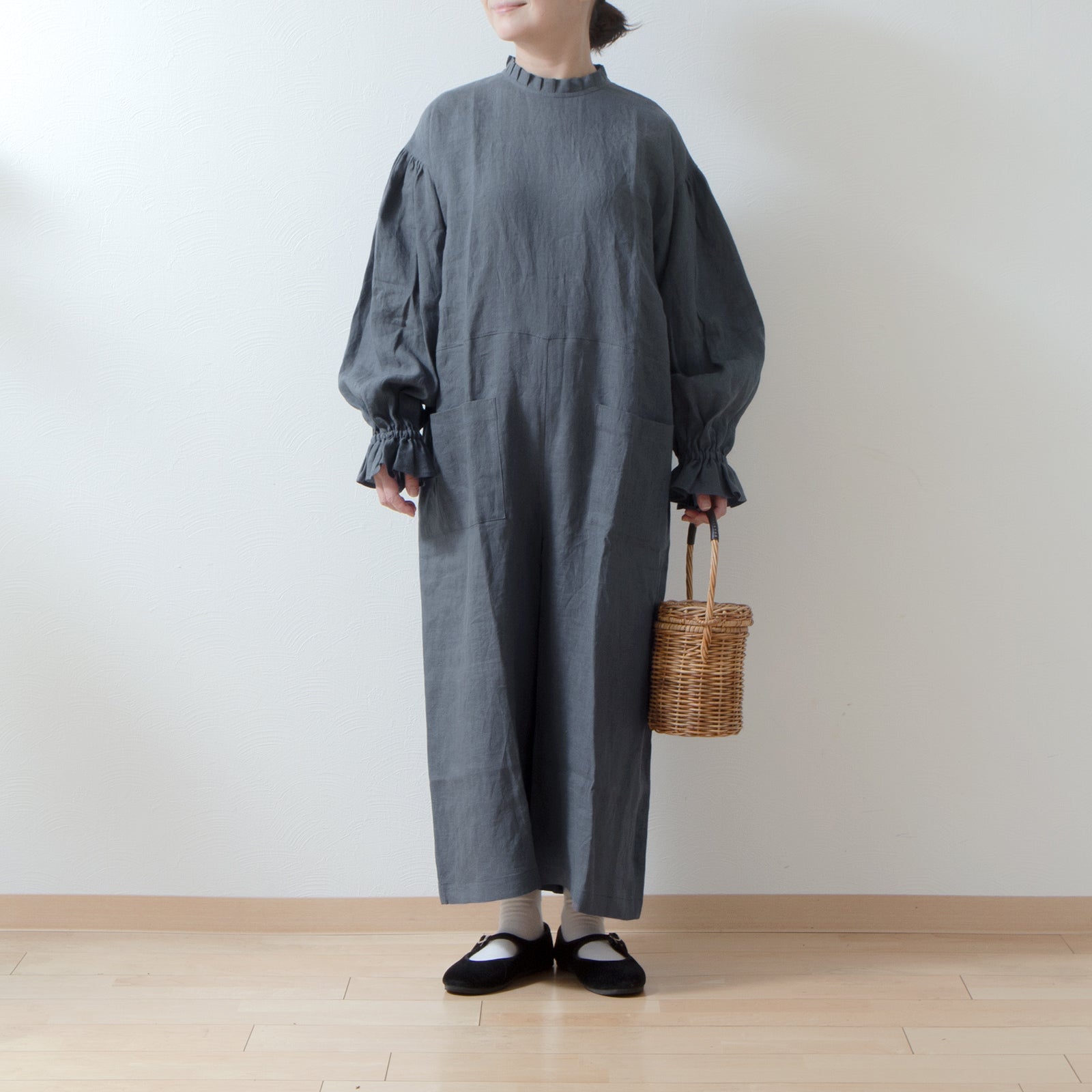 褶邊領褶皺長袖亞麻連身衣/灰色