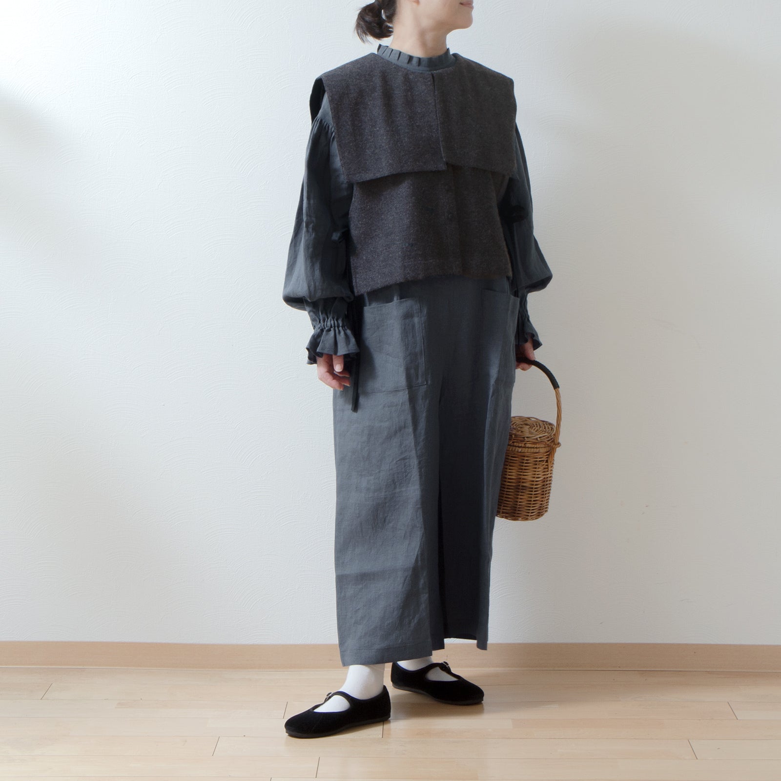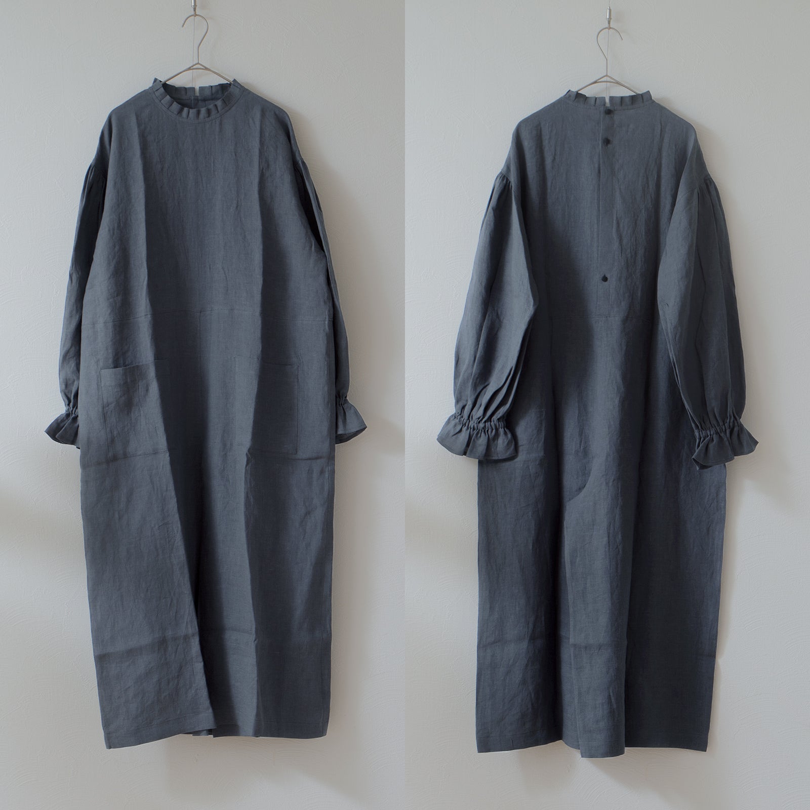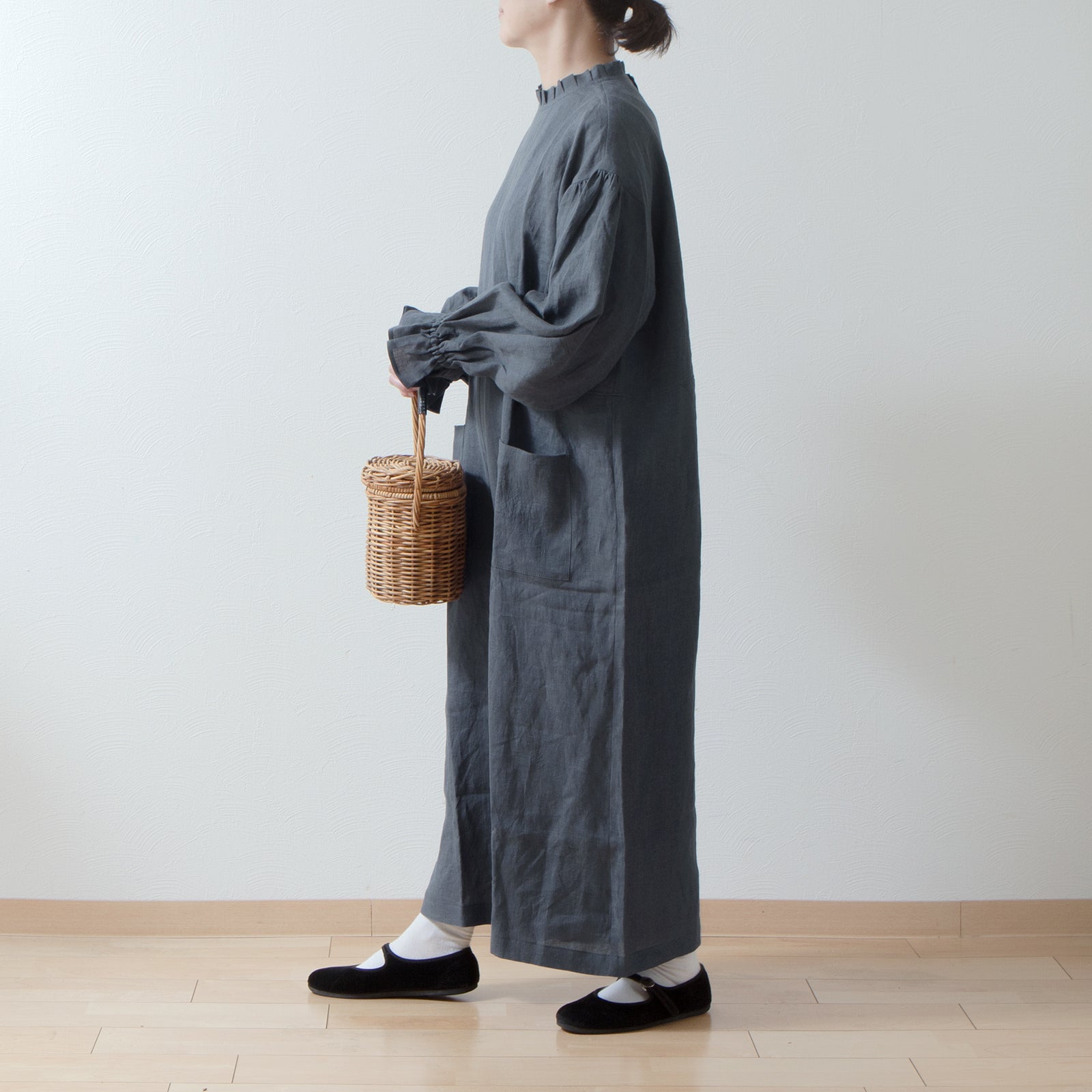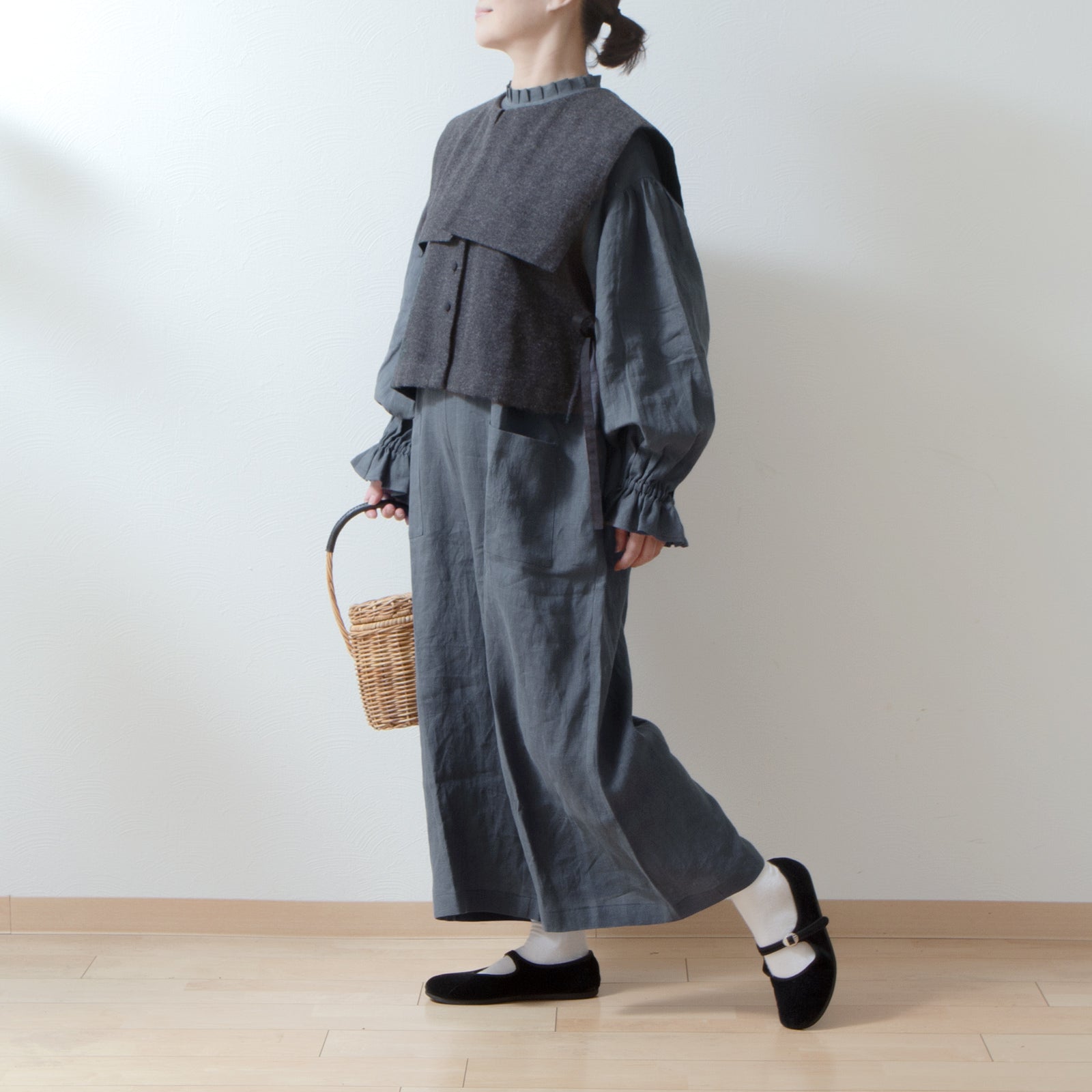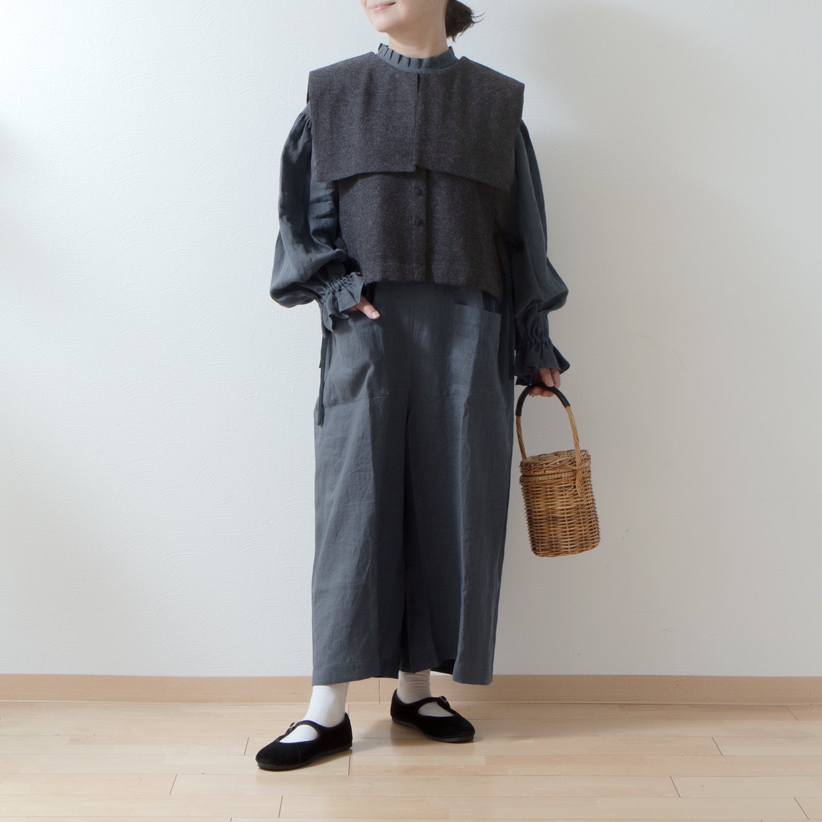 褶邊領褶皺長袖亞麻連身衣/灰色
