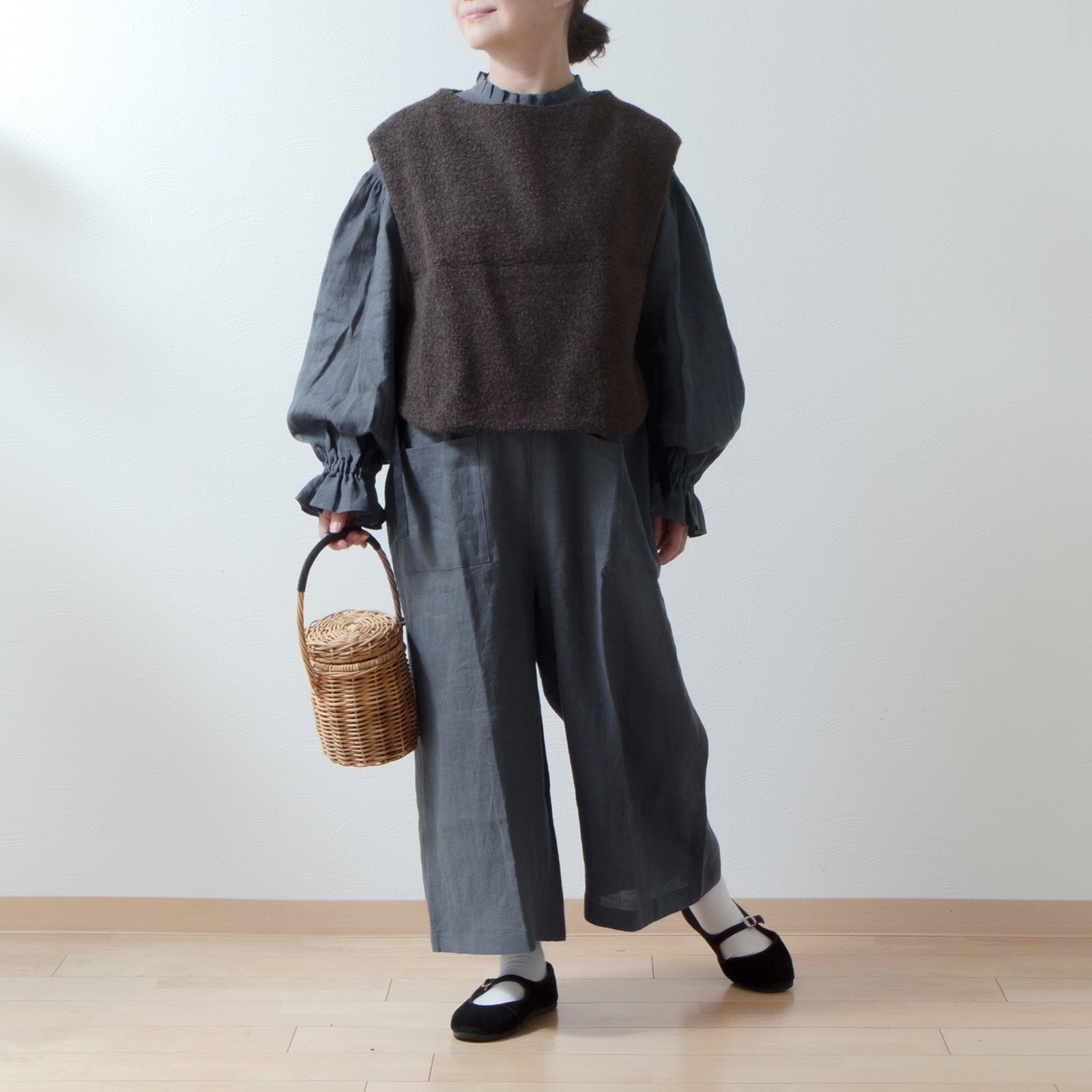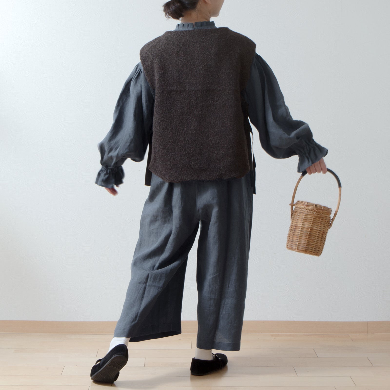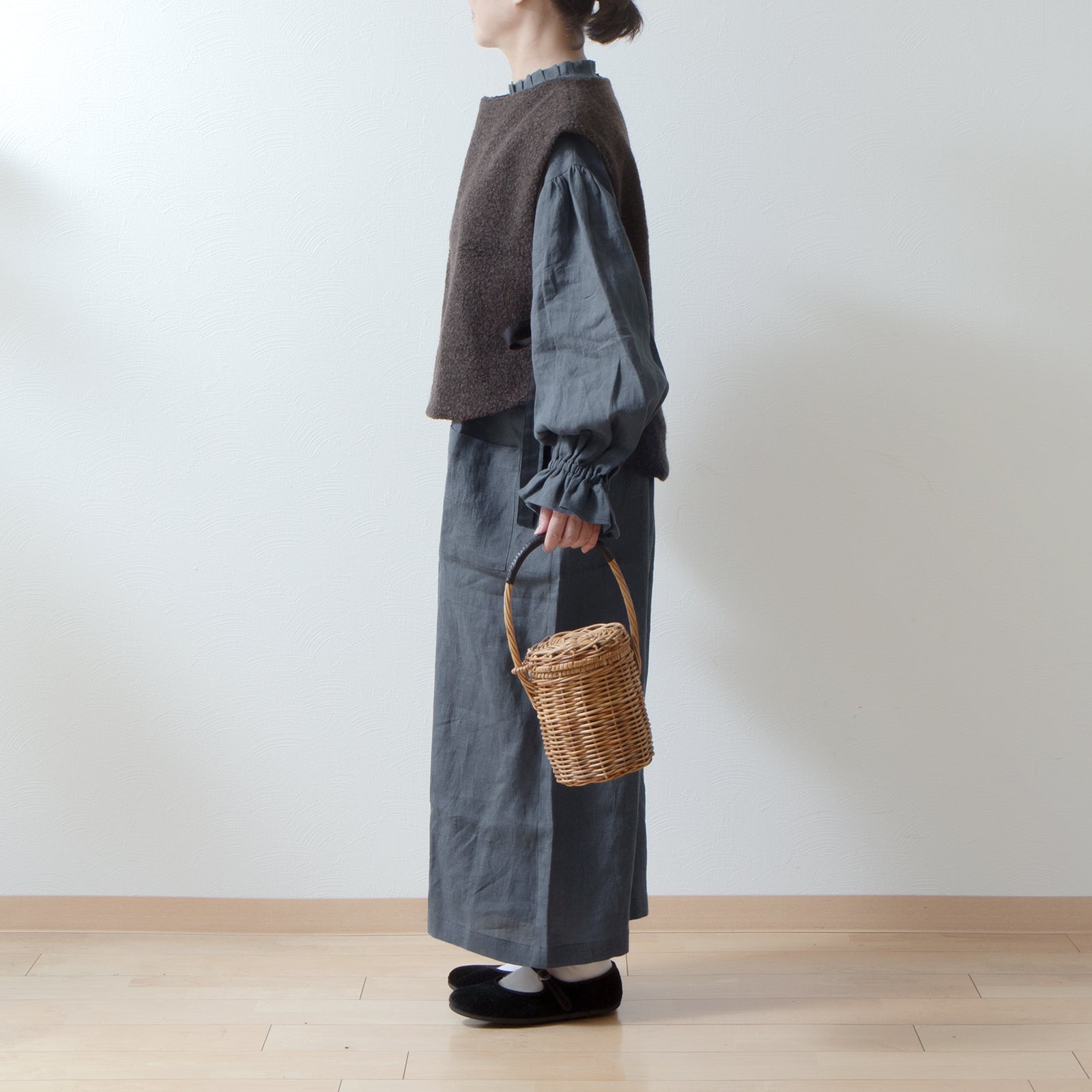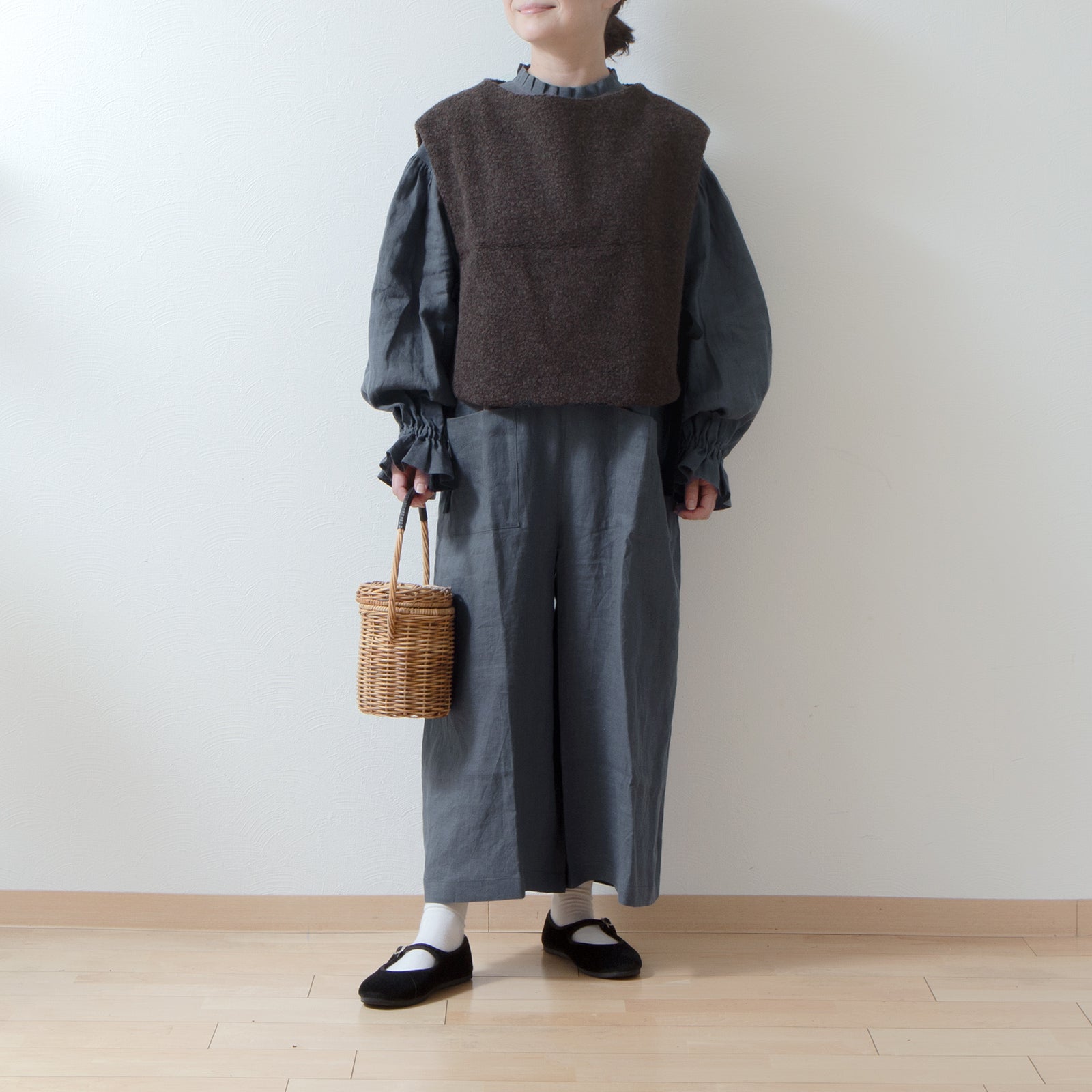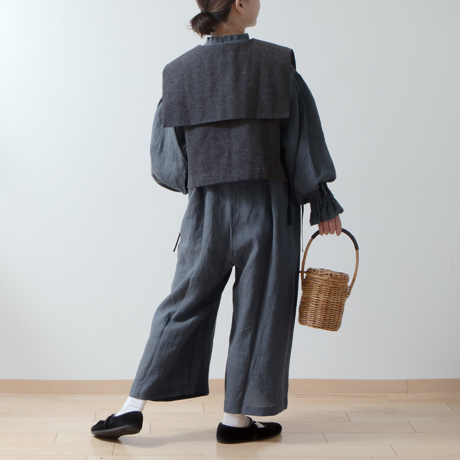 褶邊領褶皺長袖亞麻連身衣/灰色